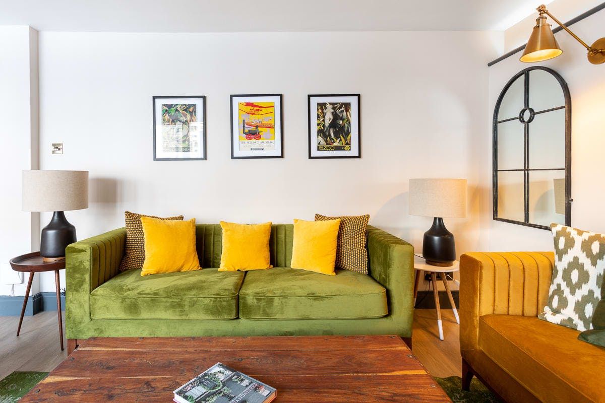 The mustard and green furnishings in the living room are instantly uplifting and go nicely with the weathered wood of the coffee table. The addition of two arched window mirrors helps accentuate the plentiful amount of natural light that comes in through the large windows. Elsewhere, the kitchen in a deep shade of green has plenty of sleek surface space for preparing home-cooked dinners, while the bathrooms play it comparatively safer with the dazzlingly white tiles.
