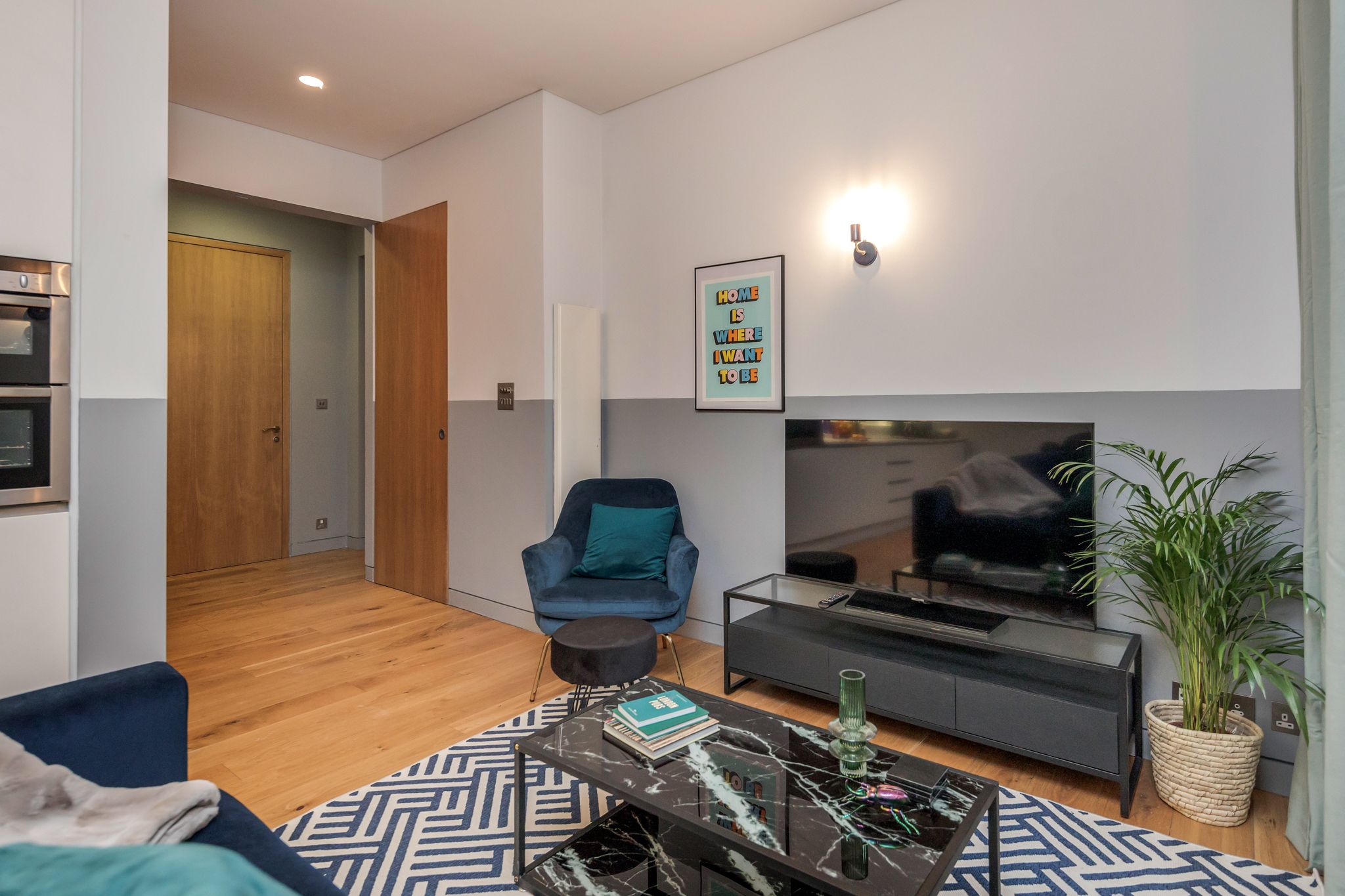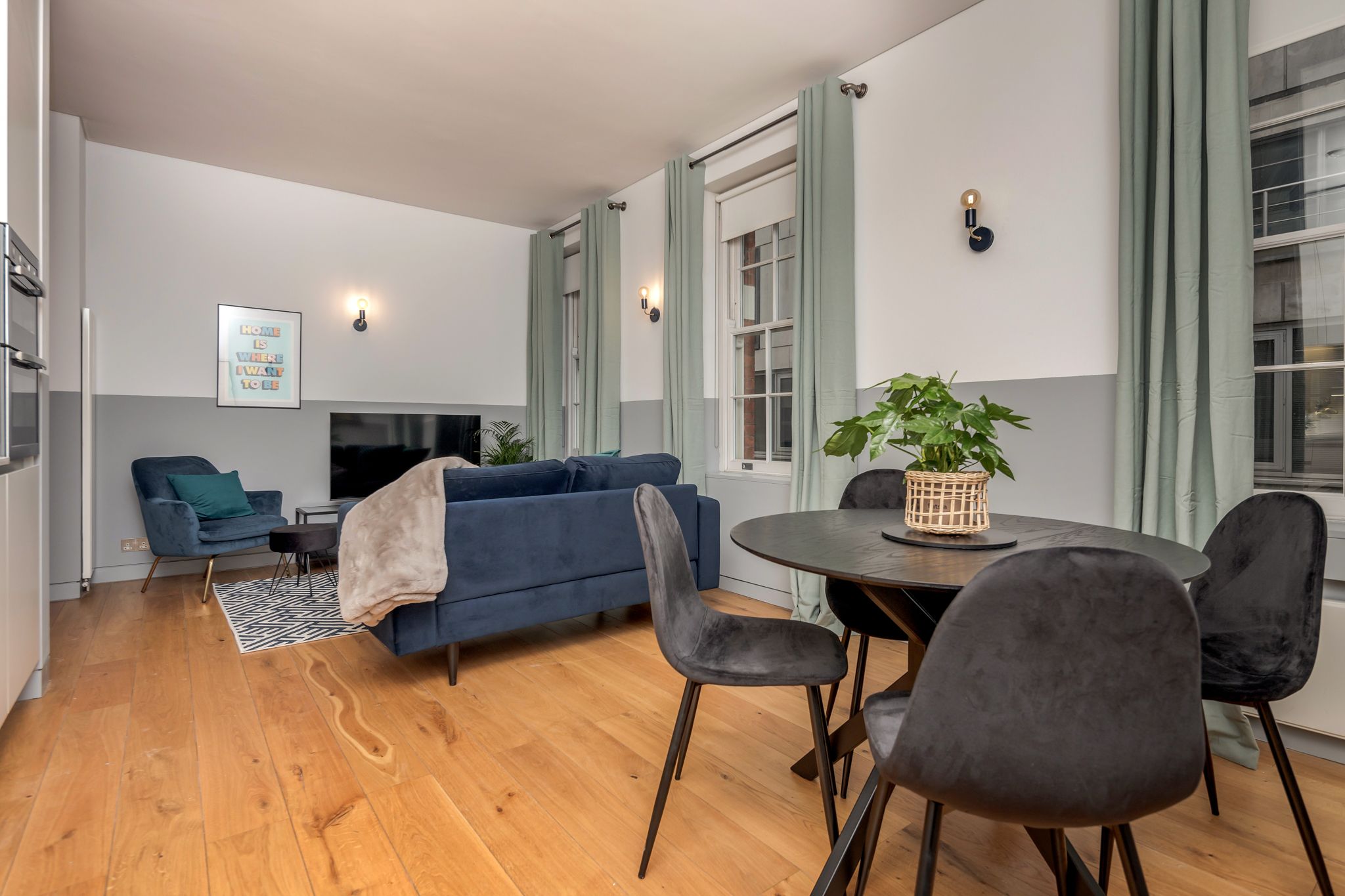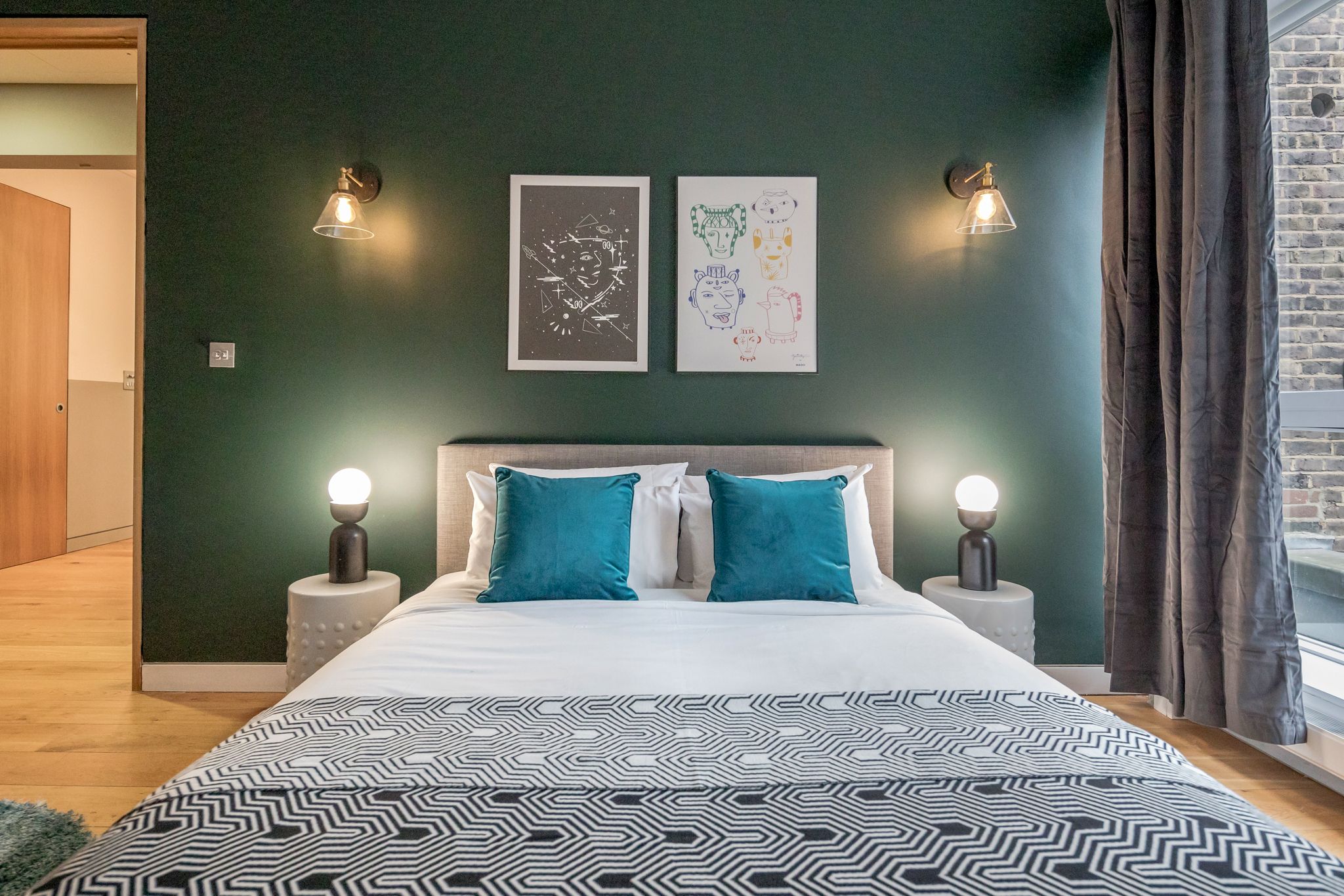 Whether you’re visiting for business or pleasure, this chic space has got you covered. From its jewel-toned decor to its vibrant wall art and sociable open-plan living space, you’ll have no trouble making yourself at home. Kick back on the sapphire-coloured sofa with a glass of bubbly after a day of exploring, before gathering around the table for a celebratory meal. The desk space is ideal for those needing to fire off some emails, while the bedrooms invite you to rest easy at night with the promise of an exciting day ahead in the Big Smoke.