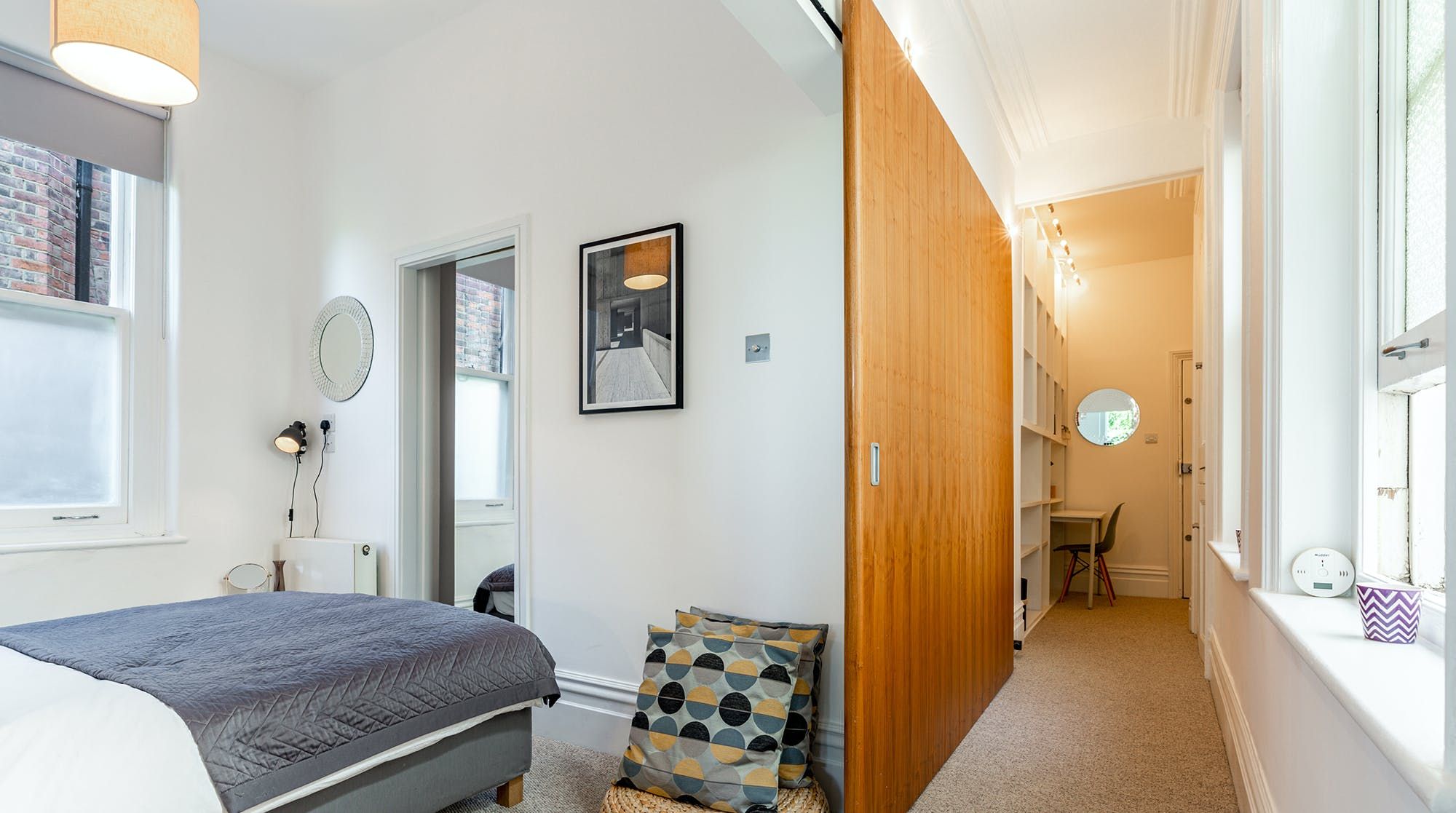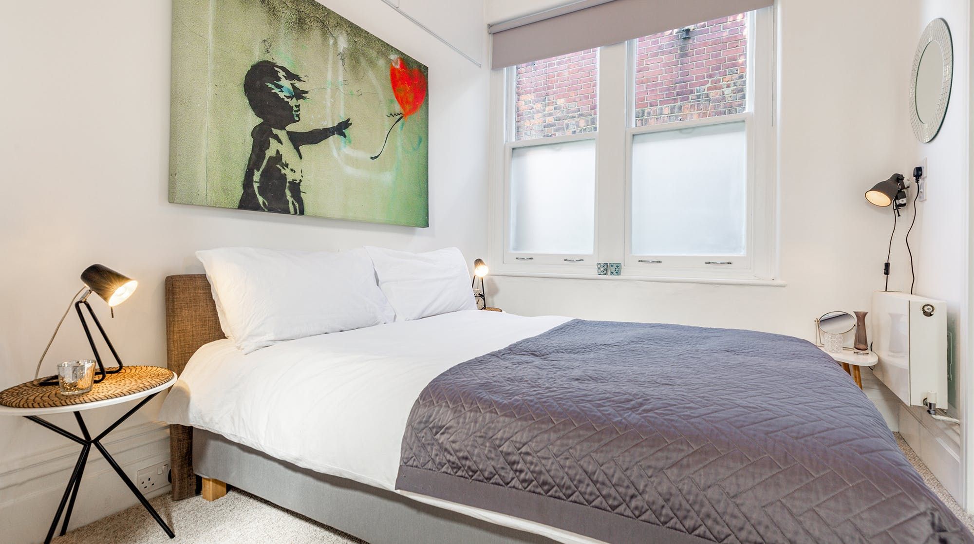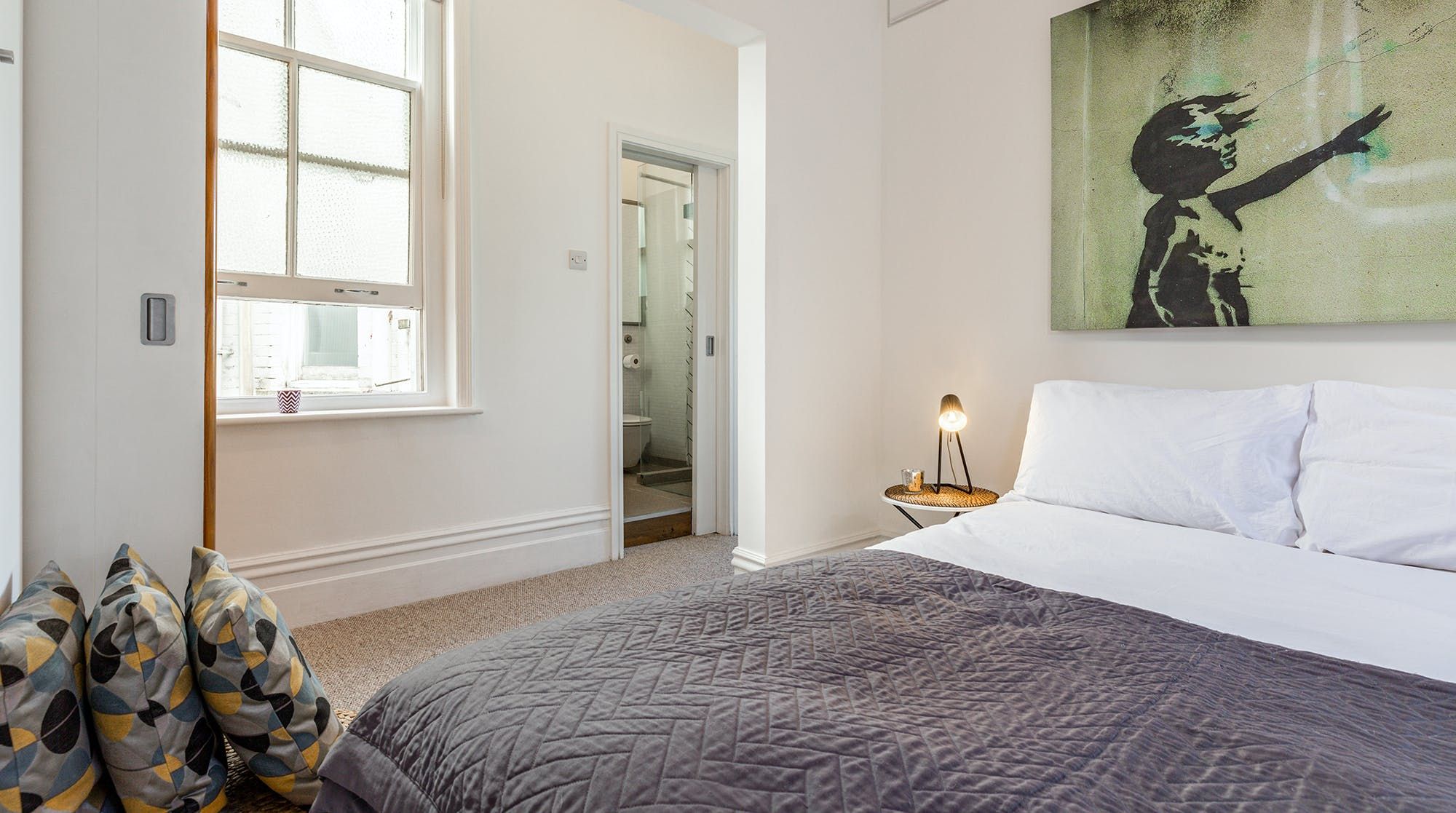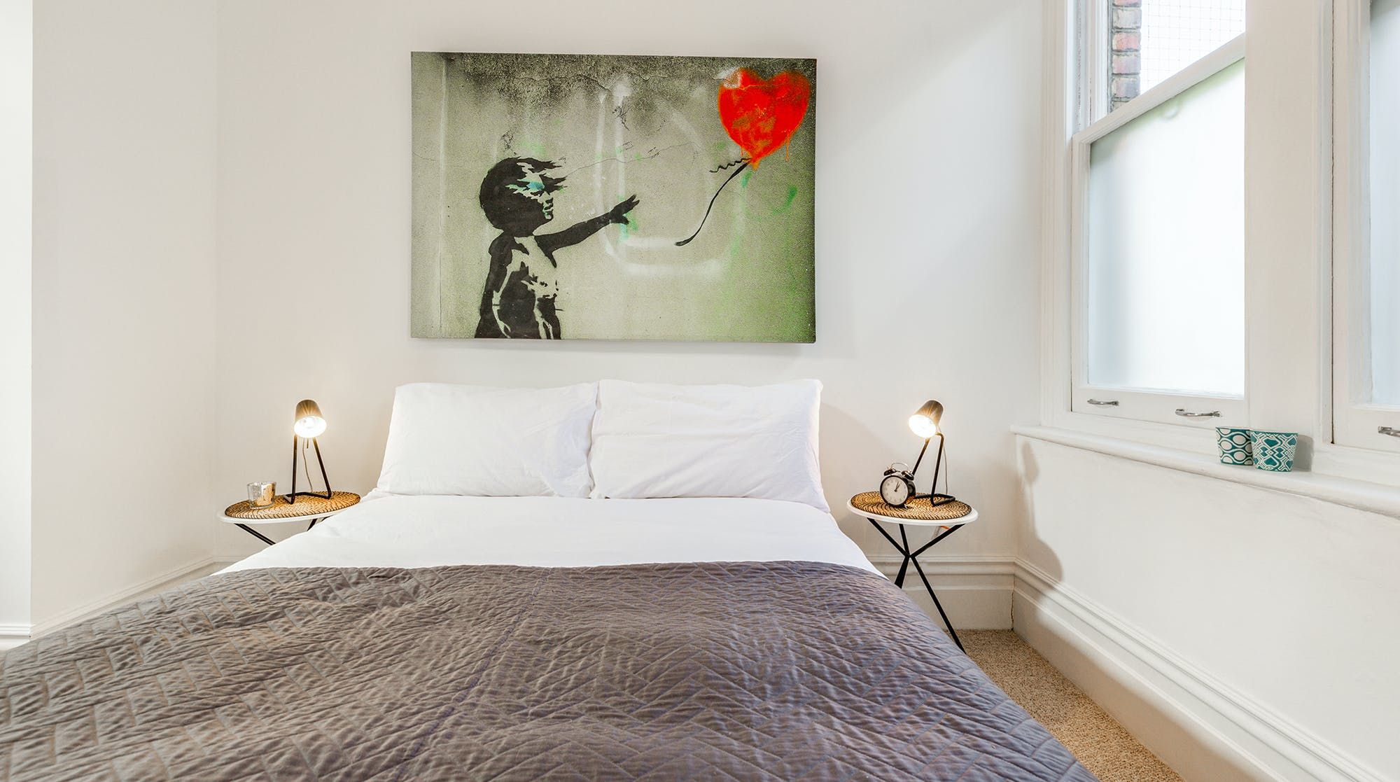 Inside, wooden floors and stark white walls lend the feel of a contemporary art gallery, and indeed, you'll find several Banksy prints hanging up about the place. In addition, guests are also treated to a sleek monochrome kitchen, plus a study area that can be curtained off from the rest of the space in case you're working from home. When the weather's on your side, there's also a communal garden in which to sit out and soak up the sunshine.