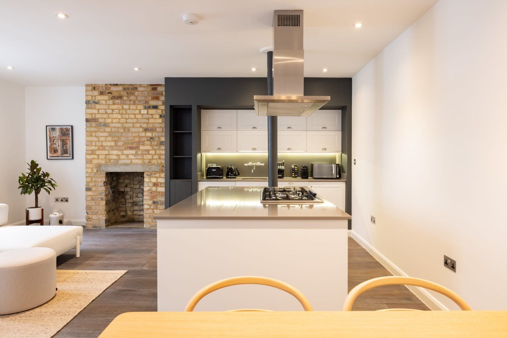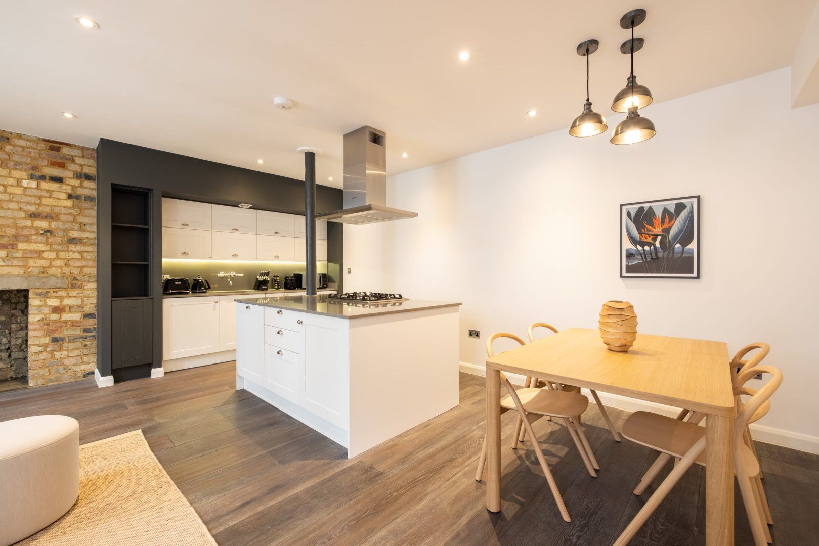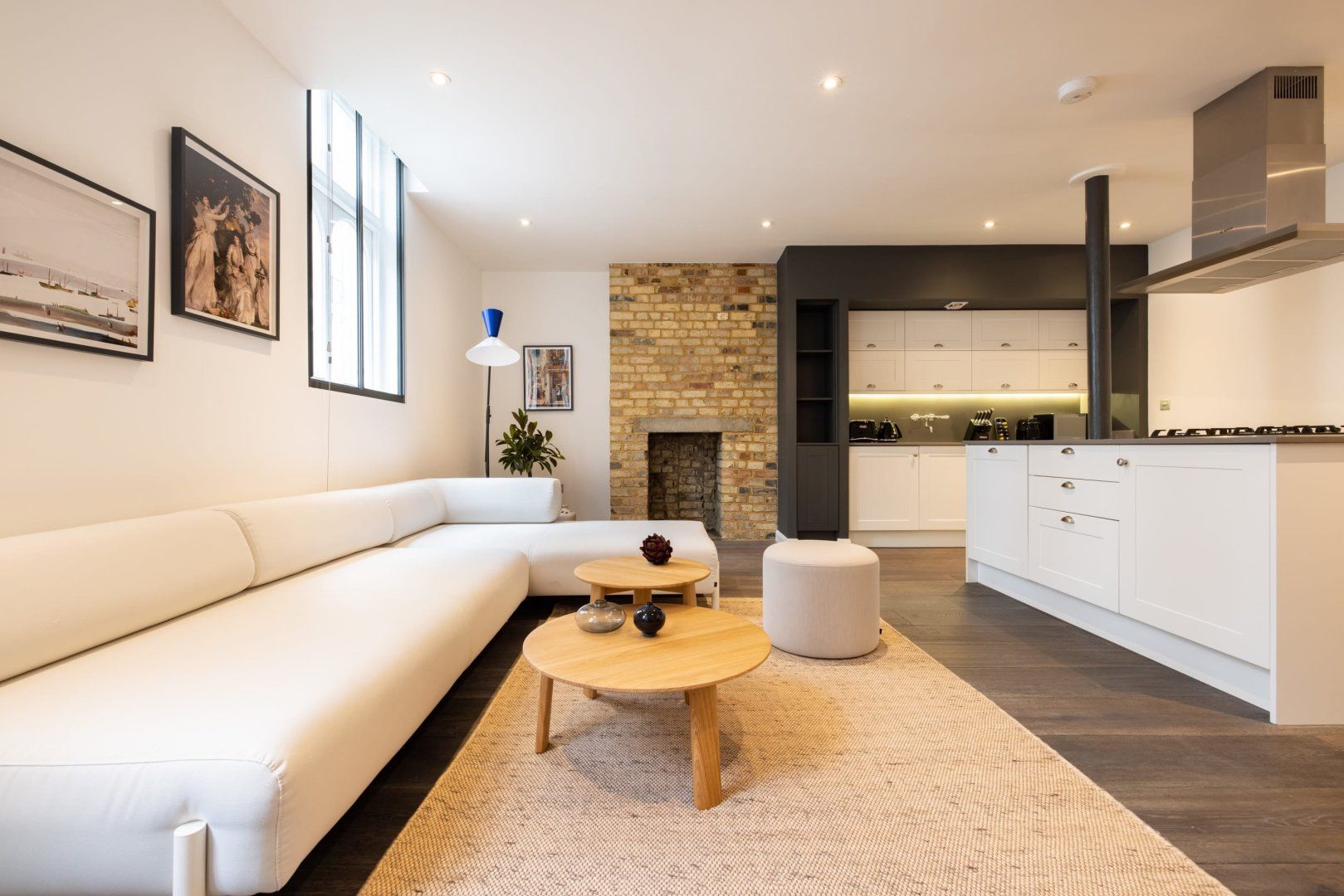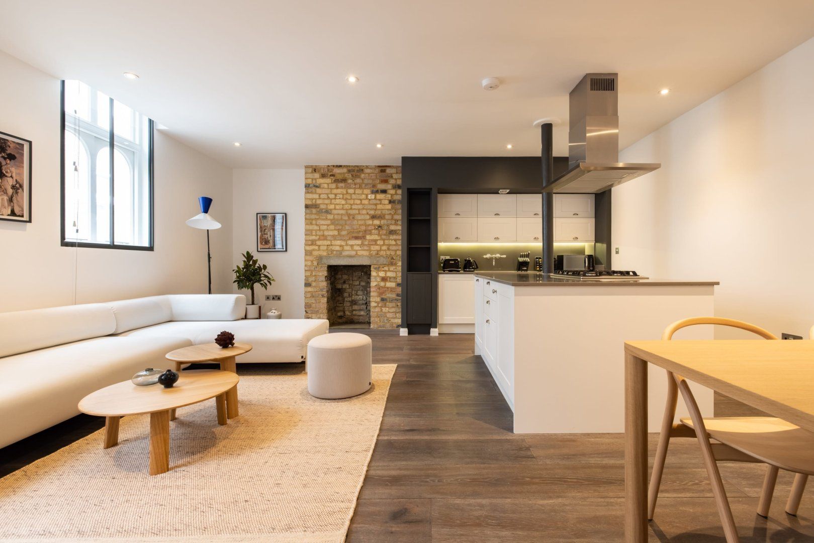 Experience the colourful lights of London’s Soho with a stay in this effortlessly cool apartment, ideally located in Chinatown. Though centrally located, this home is set away from the street, providing a relaxing and peaceful stay while enjoying all the benefits of being in the capital’s bustling centre. Inside, wood floors and chic Japandi furnishings create an instantly inviting welcome in the open-plan living space with a huge, low sectional sofa inviting you to kick back and relax with a glass of wine. We love the industrial loft vibe here with the decorative exposed brick fireplace and the metal wall lamps. The bedroom, meanwhile, is pared-back yet sophisticated, with a calming monochrome colour scheme, while the bathroom is a vision of relaxation with its metro-tiled rainfall shower. When you’re not hanging out in your hip city pad, go out and explore the sights – you’re spoilt for choice when it comes to culture and entertainment. You’ve got countless restaurant and bar options right on your front door, as well as some of London’s most celebrated bars, cinemas and theatres. Leicester Square is a five-minute walk away, Oxford Street is reachable in ten minutes on foot and the National Gallery’s priceless artworks are a six-minute stroll from your home.