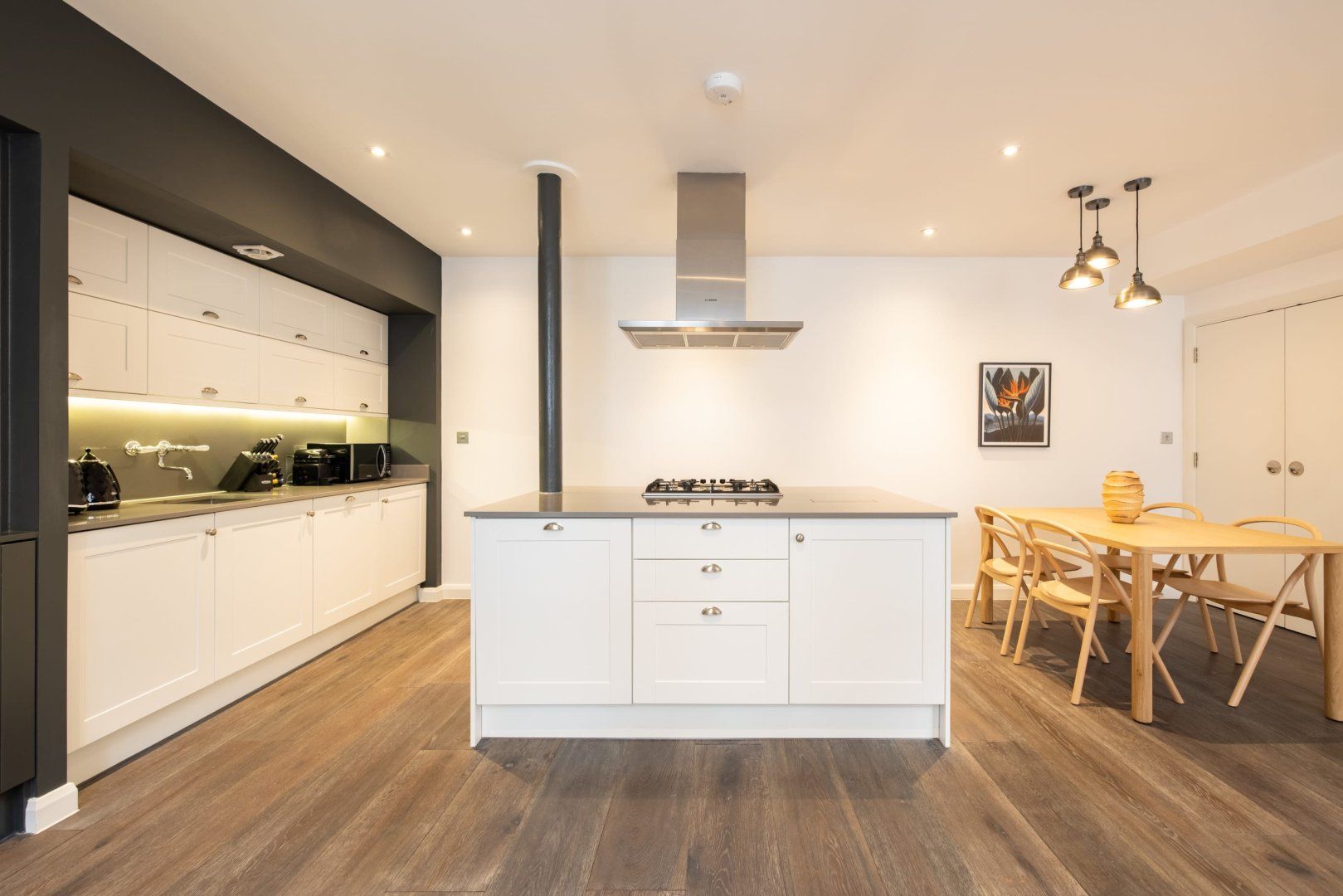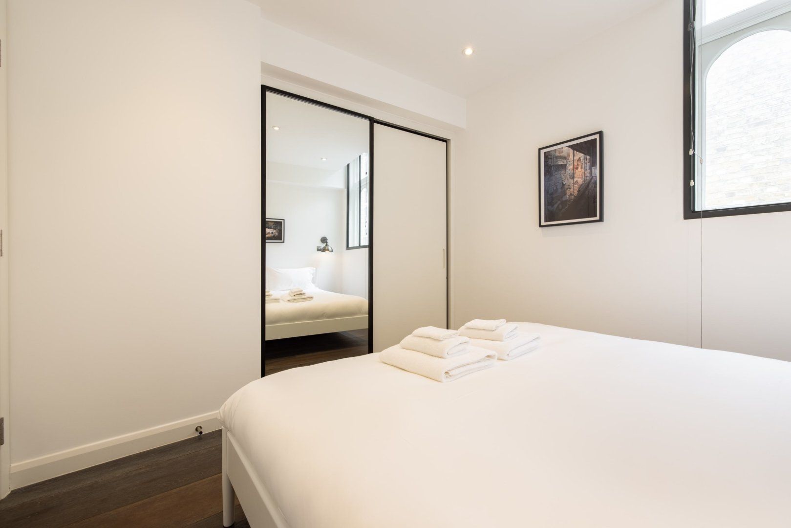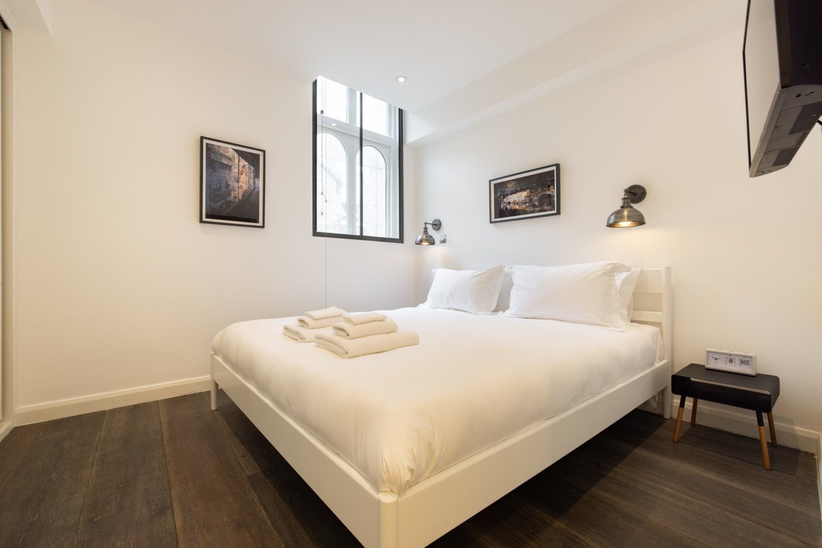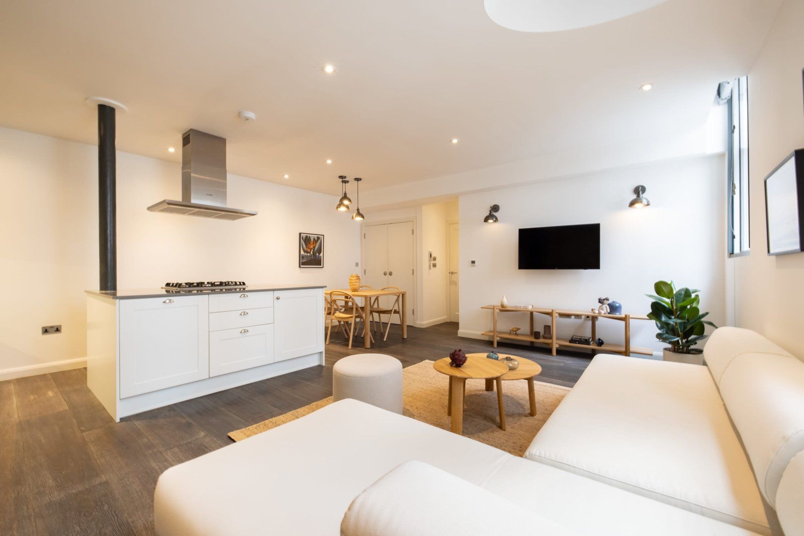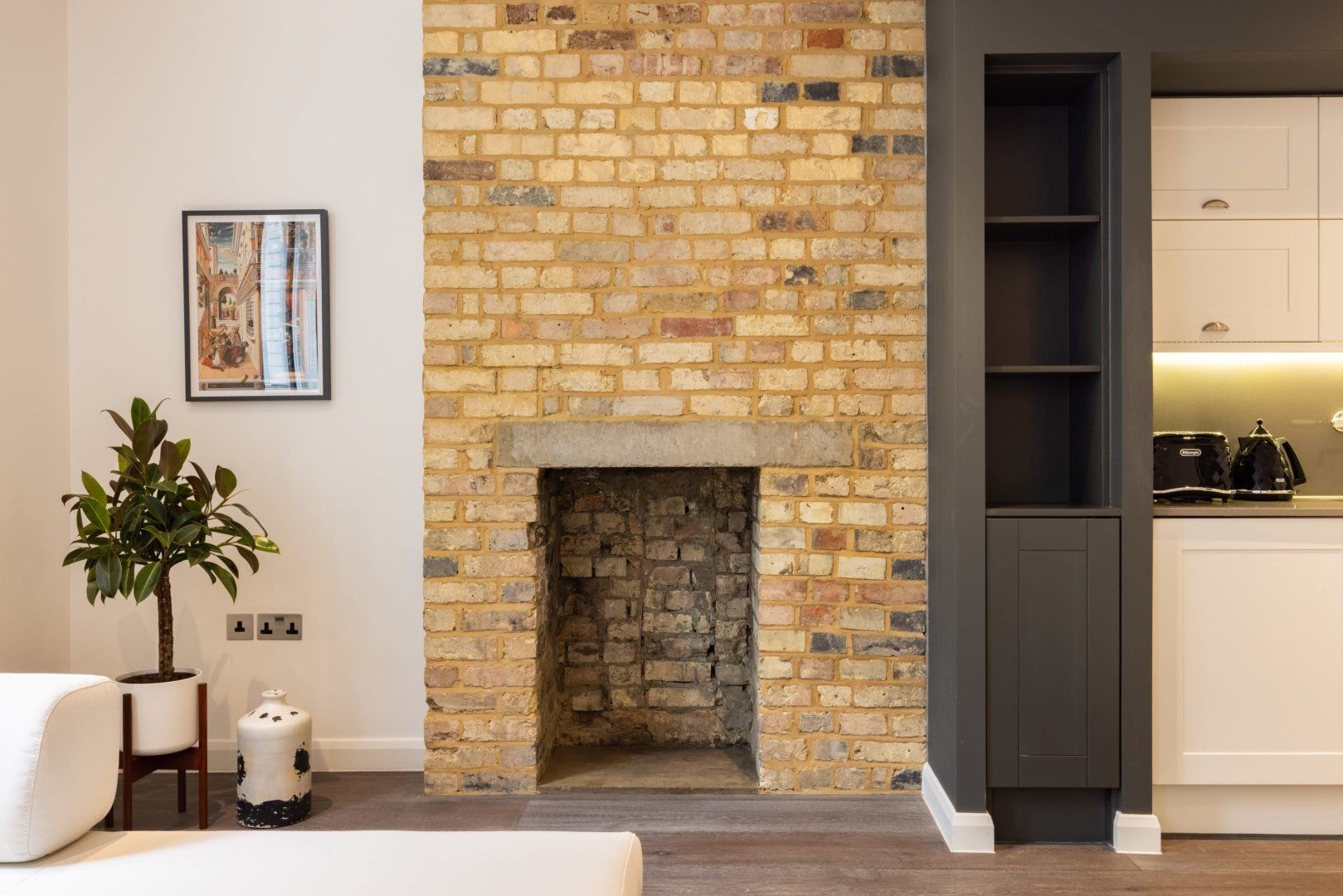 Experience the colourful lights of London’s Soho with a stay in this effortlessly cool apartment, ideally located in Chinatown. Though centrally located, this home is set away from the street, providing a relaxing and peaceful stay while enjoying all the benefits of being in the capital’s bustling centre. Inside, wood floors and chic Japandi furnishings create an instantly inviting welcome in the open-plan living space with a huge, low sectional sofa inviting you to kick back and relax with a glass of wine. We love the industrial loft vibe here with the decorative exposed brick fireplace and the metal wall lamps. The bedroom, meanwhile, is pared-back yet sophisticated, with a calming monochrome colour scheme, while the bathroom is a vision of relaxation with its metro-tiled rainfall shower. When you’re not hanging out in your hip city pad, go out and explore the sights – you’re spoilt for choice when it comes to culture and entertainment. You’ve got countless restaurant and bar options right on your front door, as well as some of London’s most celebrated bars, cinemas and theatres. Leicester Square is a five-minute walk away, Oxford Street is reachable in ten minutes on foot and the National Gallery’s priceless artworks are a six-minute stroll from your home.