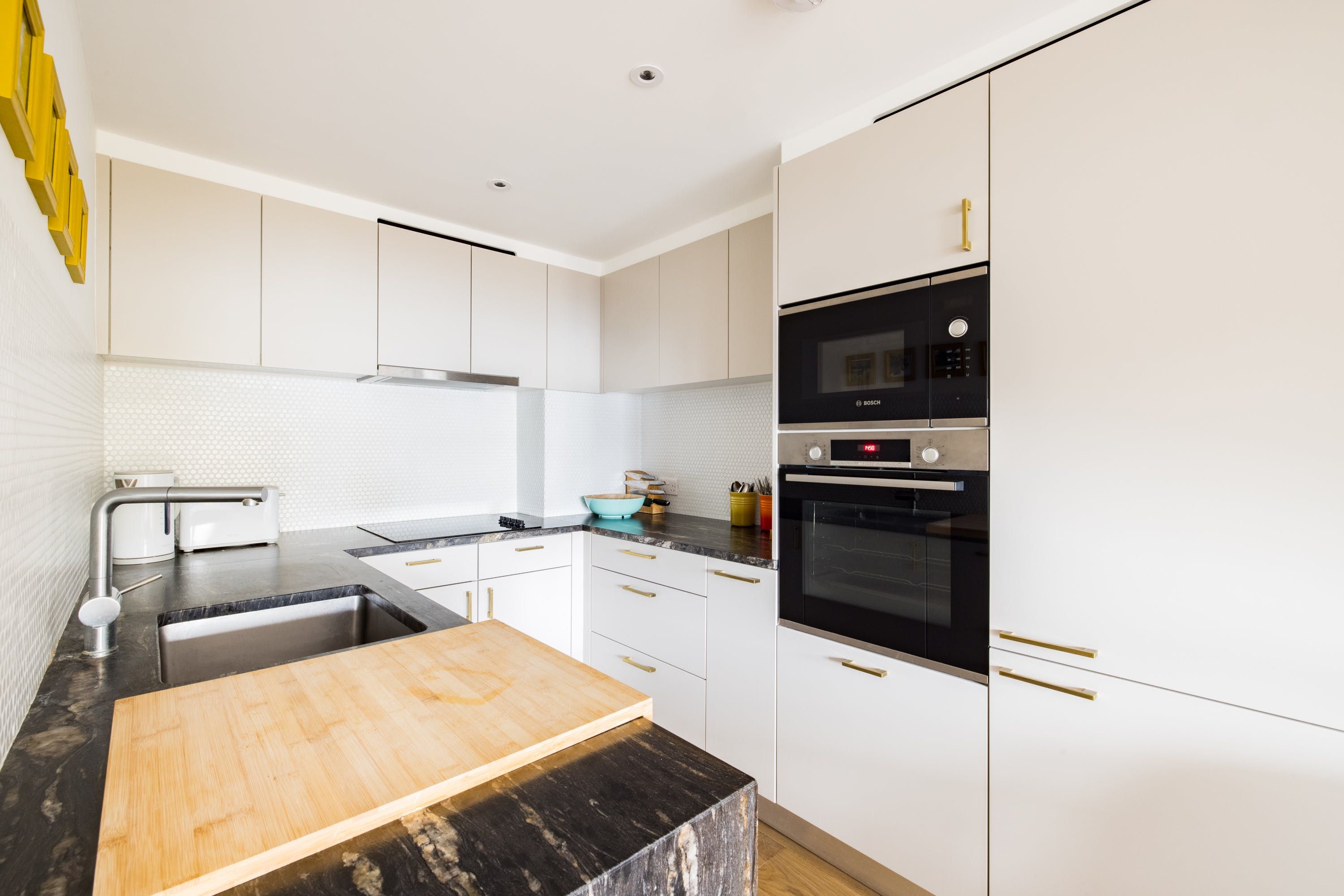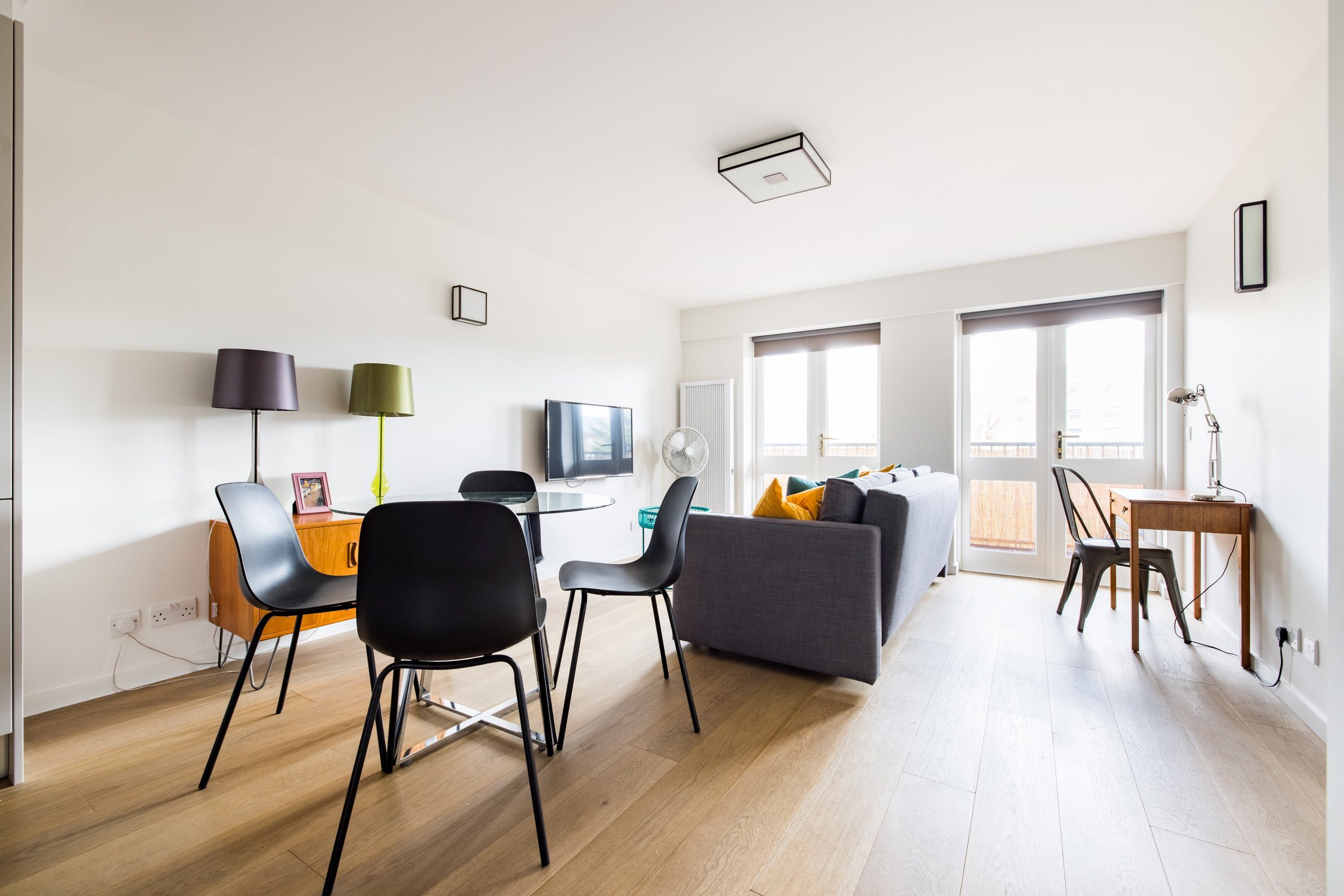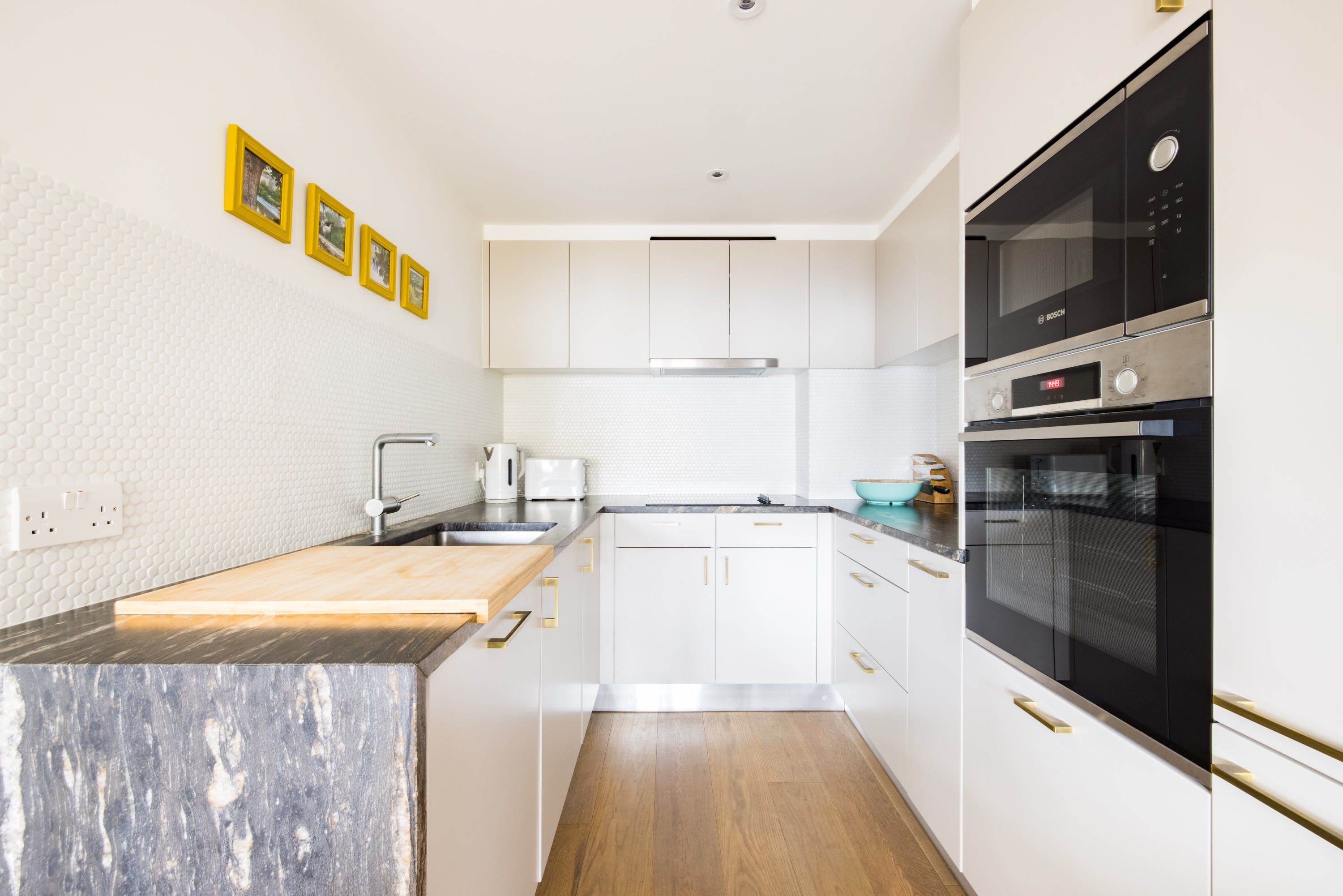 Light, bright and equipped with everything you need for a comfortable stay, this Whitechapel apartment is superbly located for work and play. Inside, the open living and kitchen area is well lit, thanks to the French doors at the end that lead directly out onto a private balcony with views of the city skyscrapers to the north-west. The engineered oak floor, imposing granite worktops, and high-end Bosch appliances lend a high-class air to the place, while the comfortable bed is a great place to cocoon yourself away at the end of a long day. You're well connected when it comes to public transport. Twenty minutes on the DLR and you're in Canary Wharf, while twenty minutes tube ride in the opposite direction will take you to the heart of the City of London. There's plenty within walking distance too. You'll find a Sainsbury's and a Waitrose nearby for stocking up on essentials, while the Tower of London and Tower Bridge are a little over ten minutes' walk. Away from the tourist masses, discover great international restaurants and bars dotted throughout Shoreditch and Brick Lane, around a twenty-minute stroll north of your Whitechapel base.