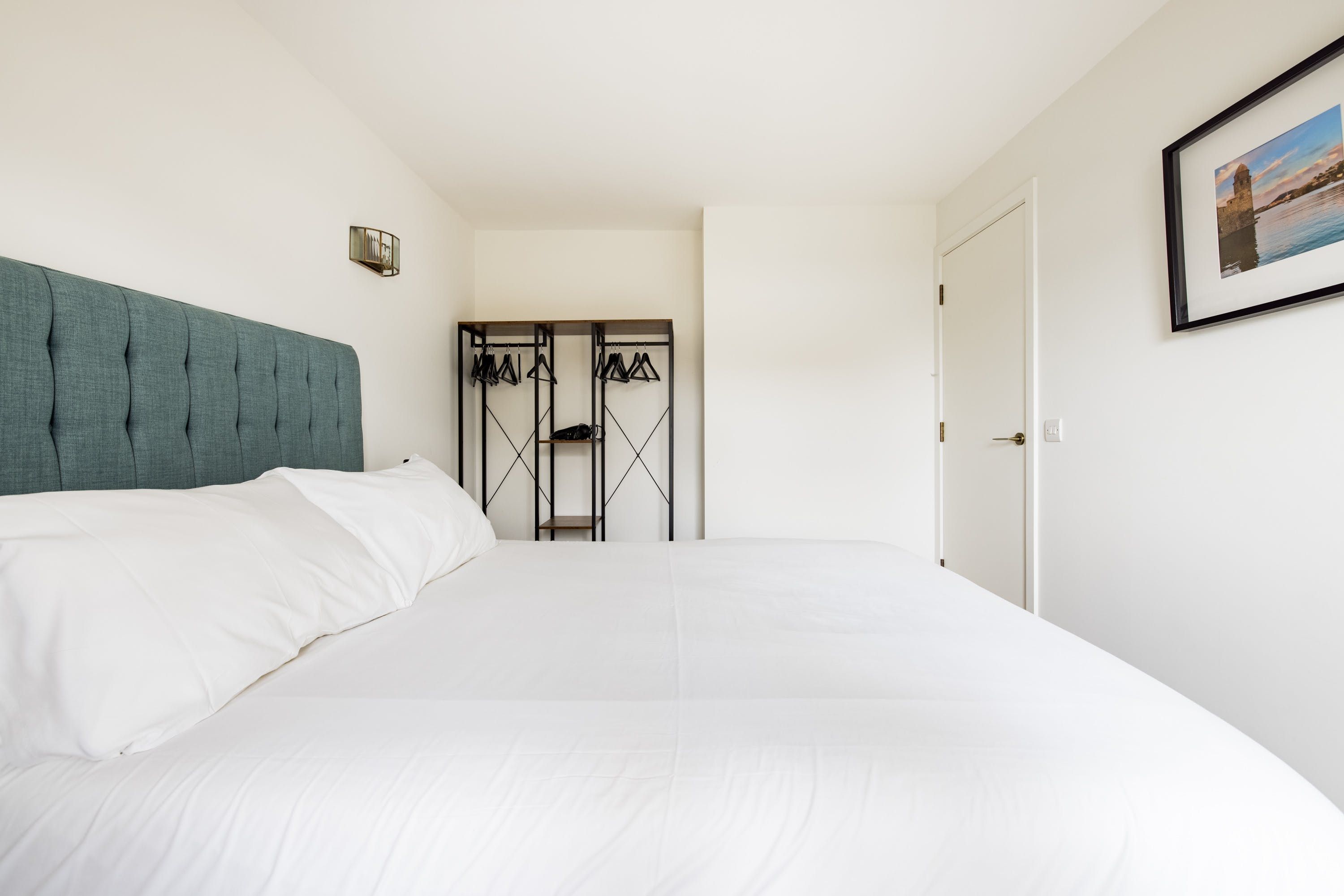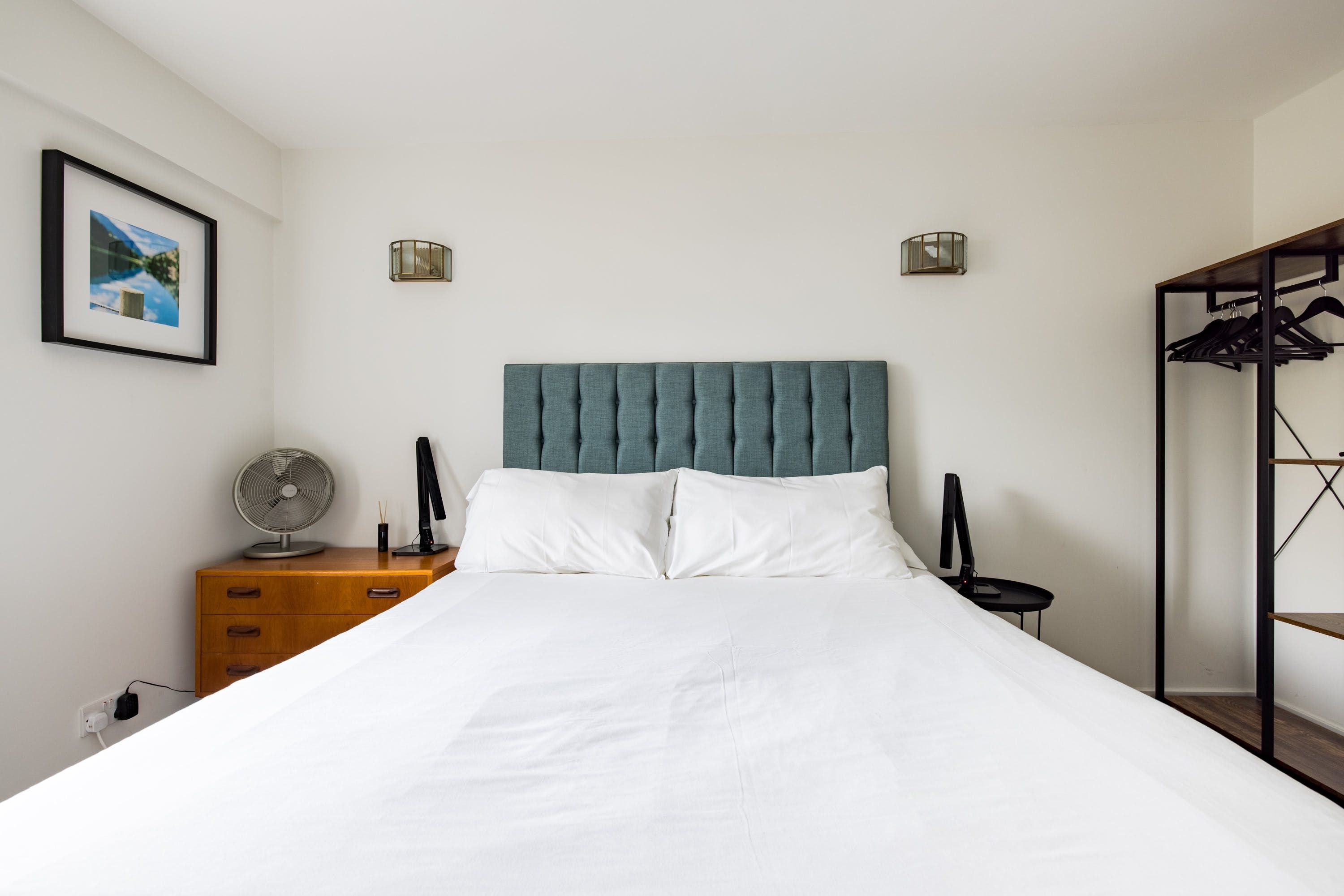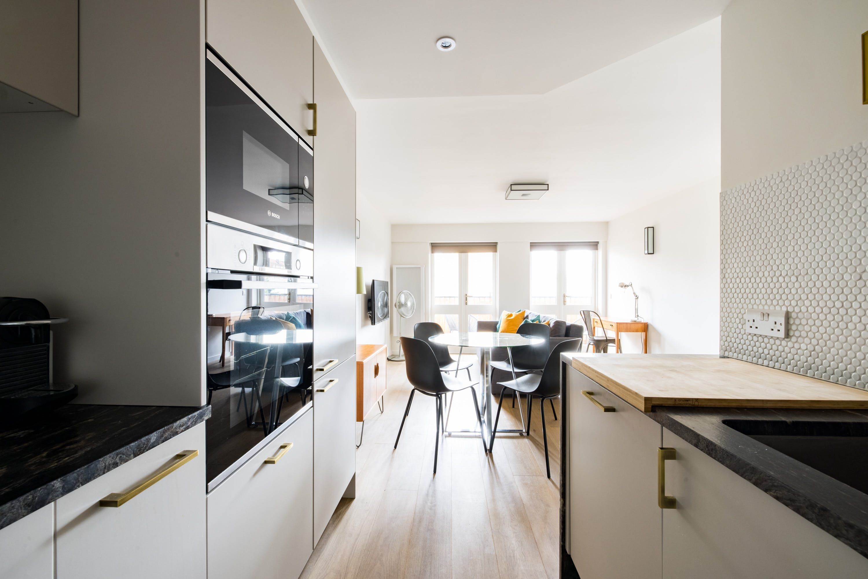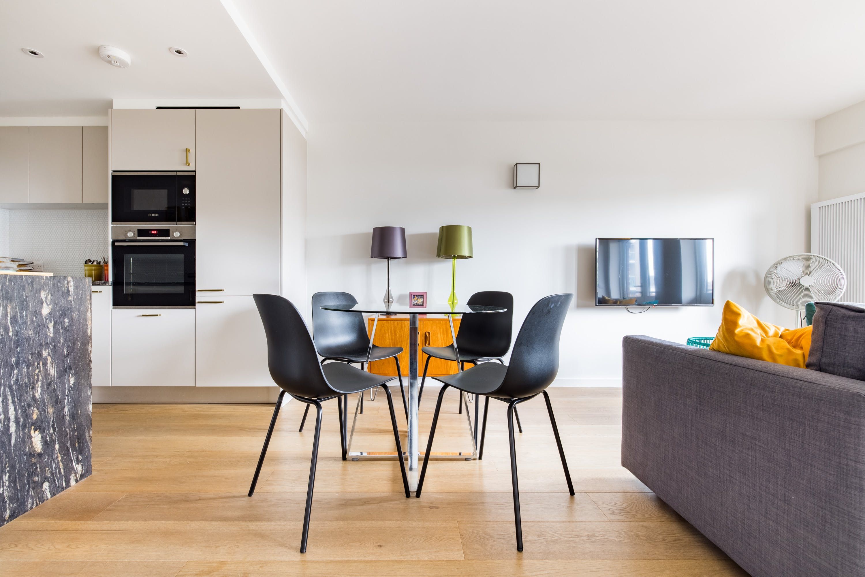 Light, bright and equipped with everything you need for a comfortable stay, this Whitechapel apartment is superbly located for work and play. Inside, the open living and kitchen area is well lit, thanks to the French doors at the end that lead directly out onto a private balcony with views of the city skyscrapers to the north-west. The engineered oak floor, imposing granite worktops, and high-end Bosch appliances lend a high-class air to the place, while the comfortable bed is a great place to cocoon yourself away at the end of a long day. You're well connected when it comes to public transport. Twenty minutes on the DLR and you're in Canary Wharf, while twenty minutes tube ride in the opposite direction will take you to the heart of the City of London. There's plenty within walking distance too. You'll find a Sainsbury's and a Waitrose nearby for stocking up on essentials, while the Tower of London and Tower Bridge are a little over ten minutes' walk. Away from the tourist masses, discover great international restaurants and bars dotted throughout Shoreditch and Brick Lane, around a twenty-minute stroll north of your Whitechapel base.