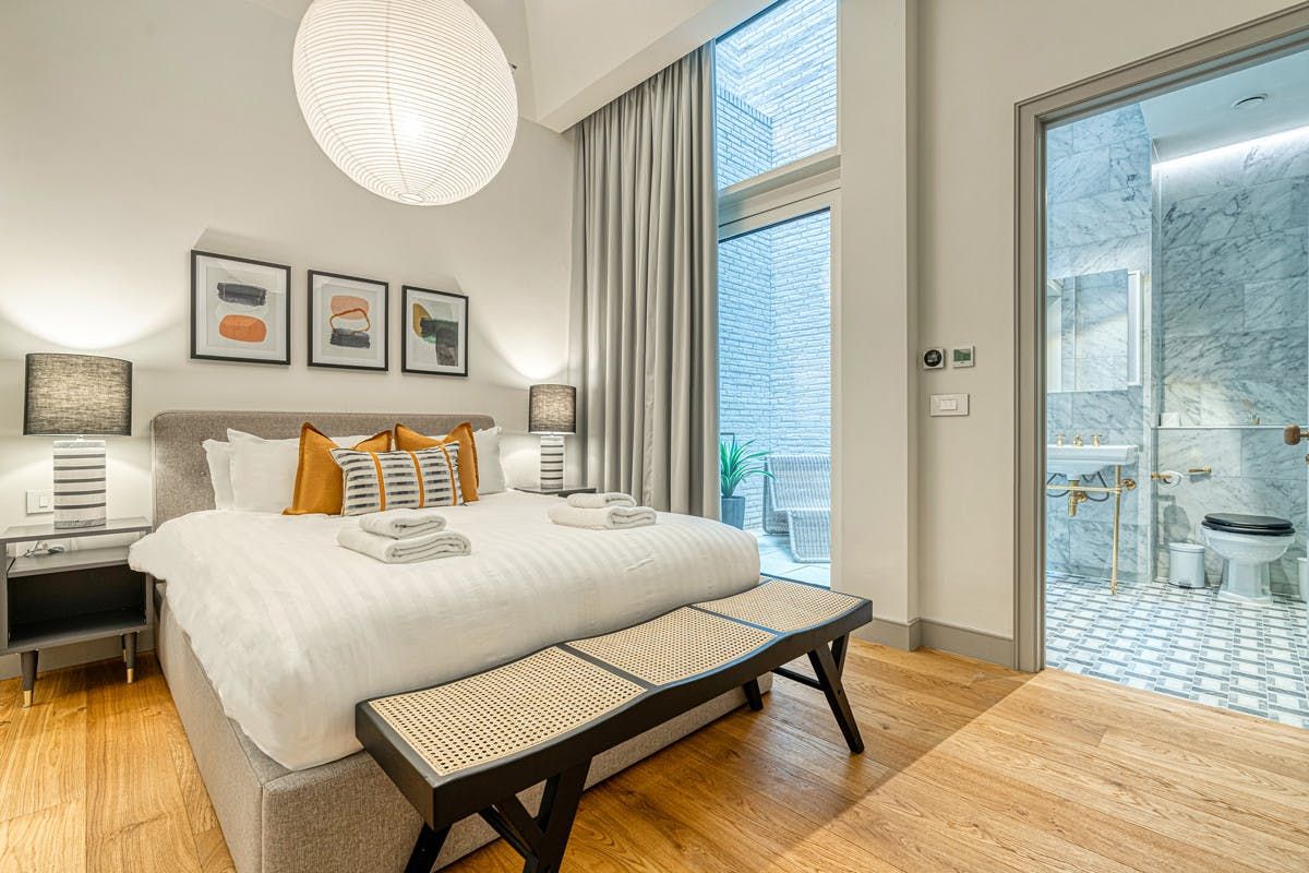 Unfolding across two floors with two private terraces, this Victoria apartment has been designed to bring ease and relaxation to city living. From the open-plan living room to the cosy bedrooms, you’ll find everything you could need to settle in and make it your own. There is also a concierge service available from Monday to Friday, and your host can help organise extras like housekeeping and child-friendly amenities. It’s worth noting there is no private parking here, but it’s just a short walk to St James’s Park station – ensuring smooth connections with the rest of London.