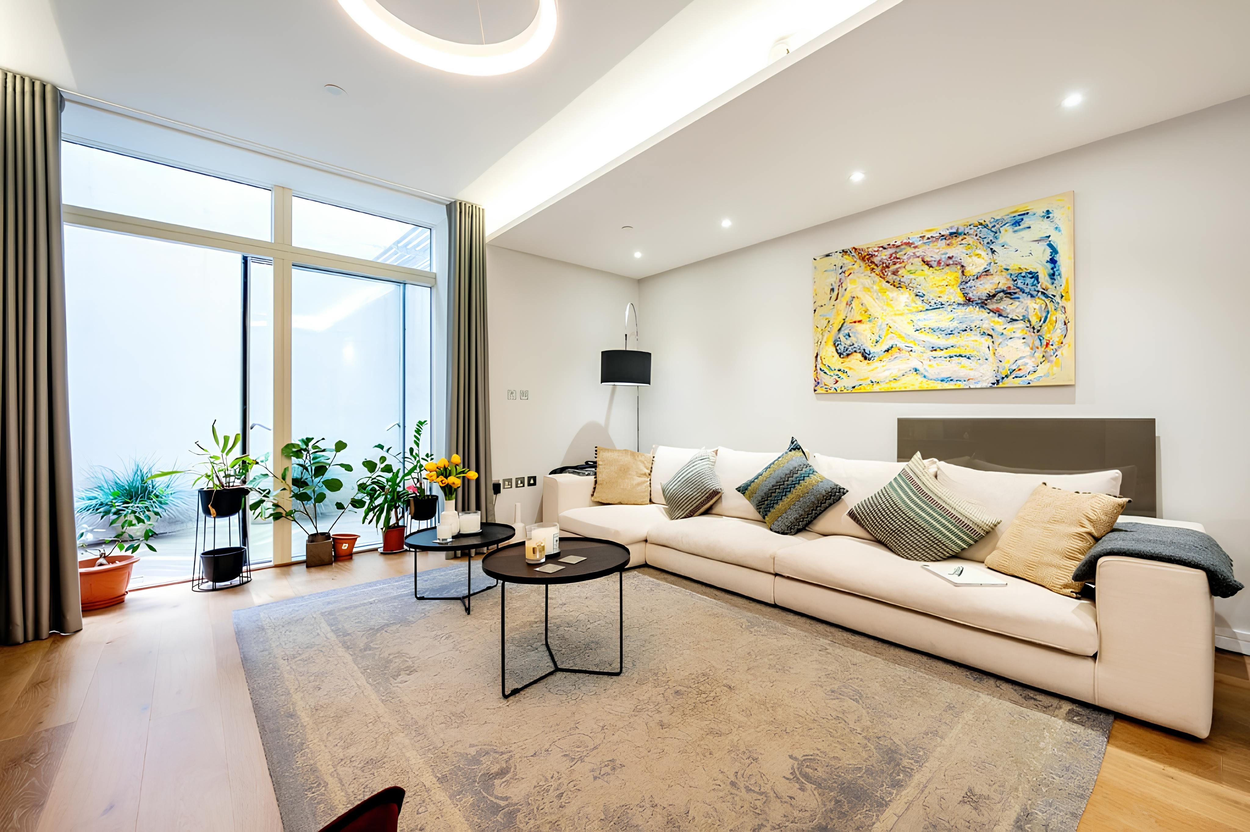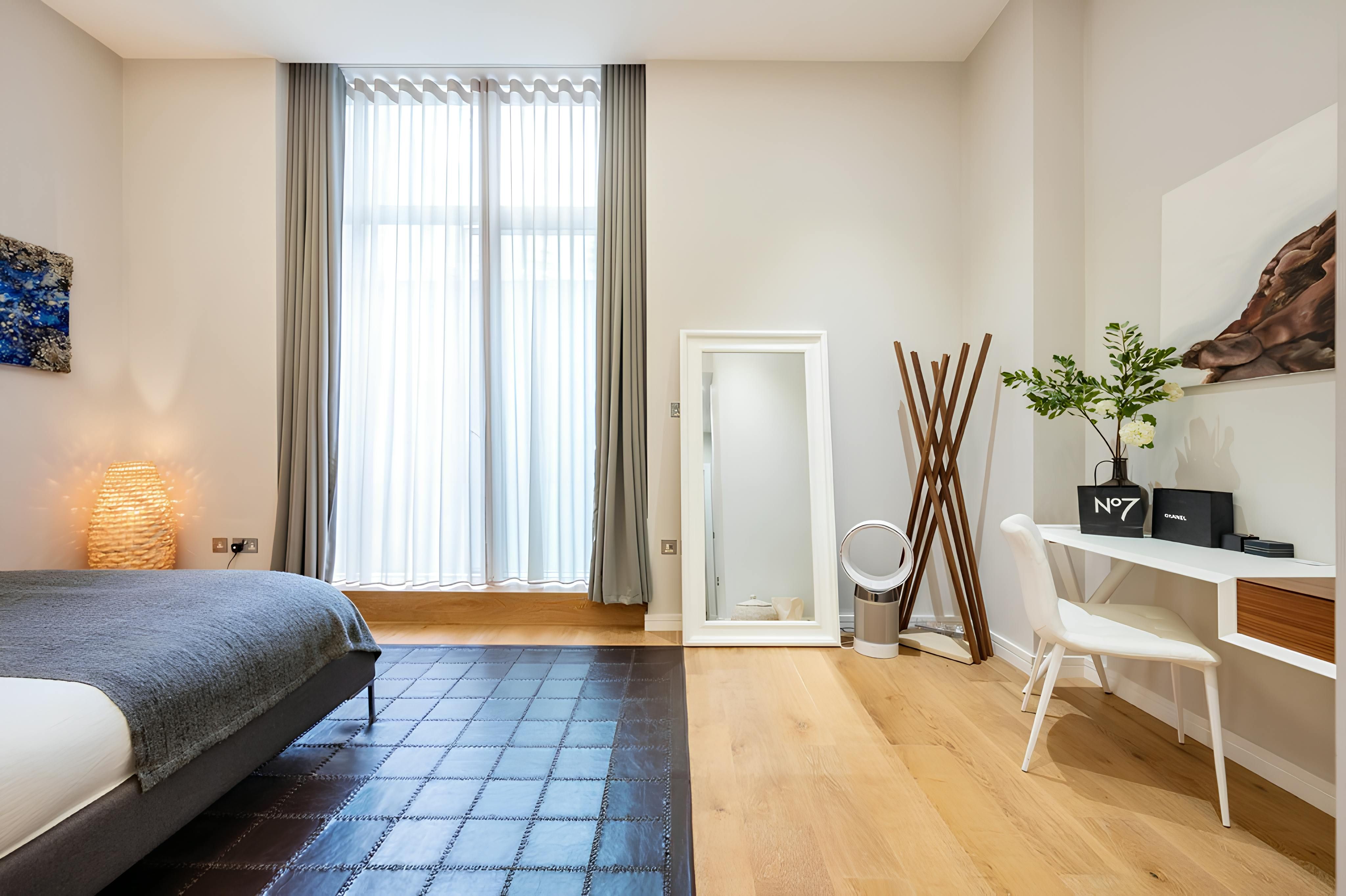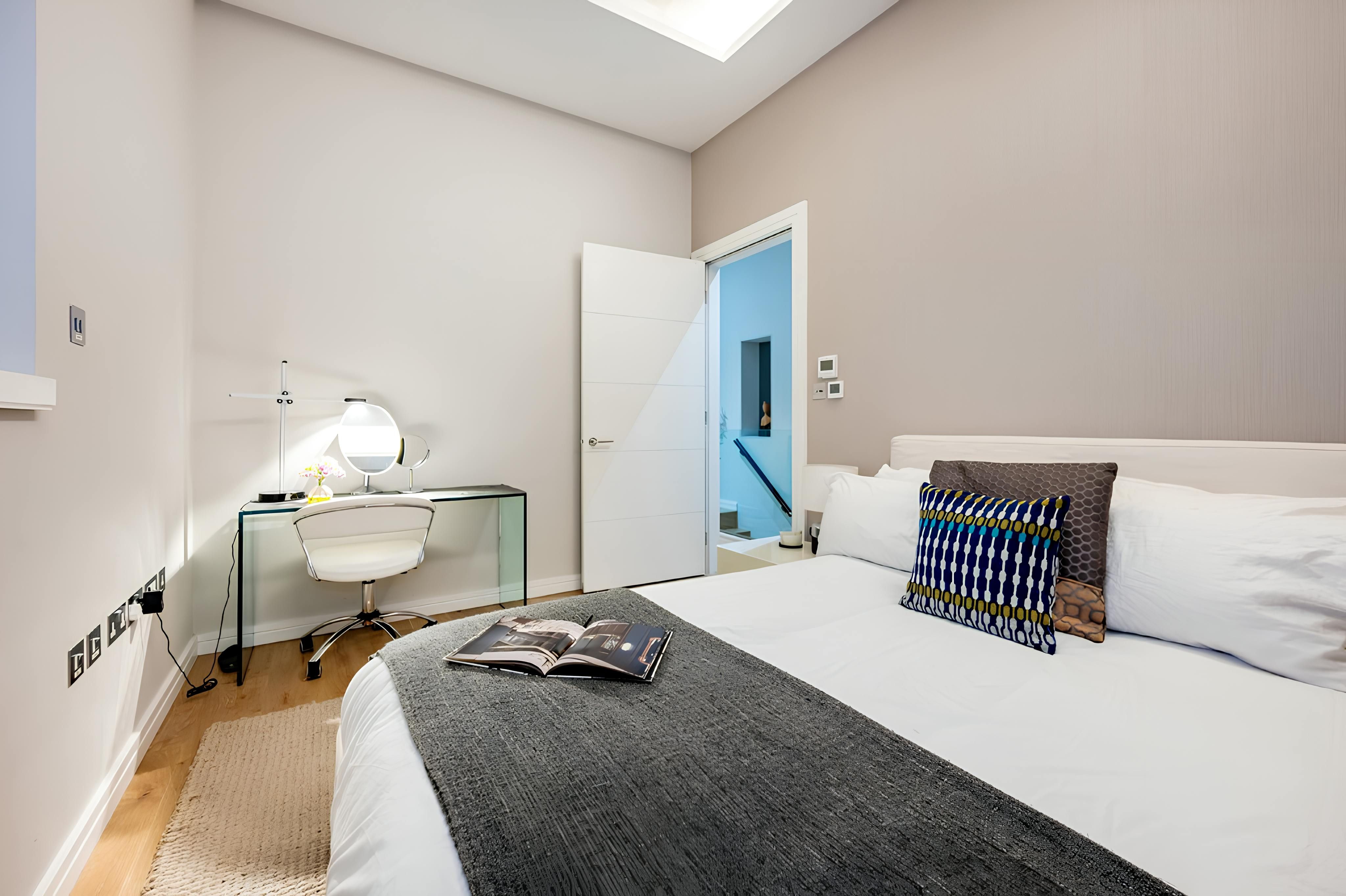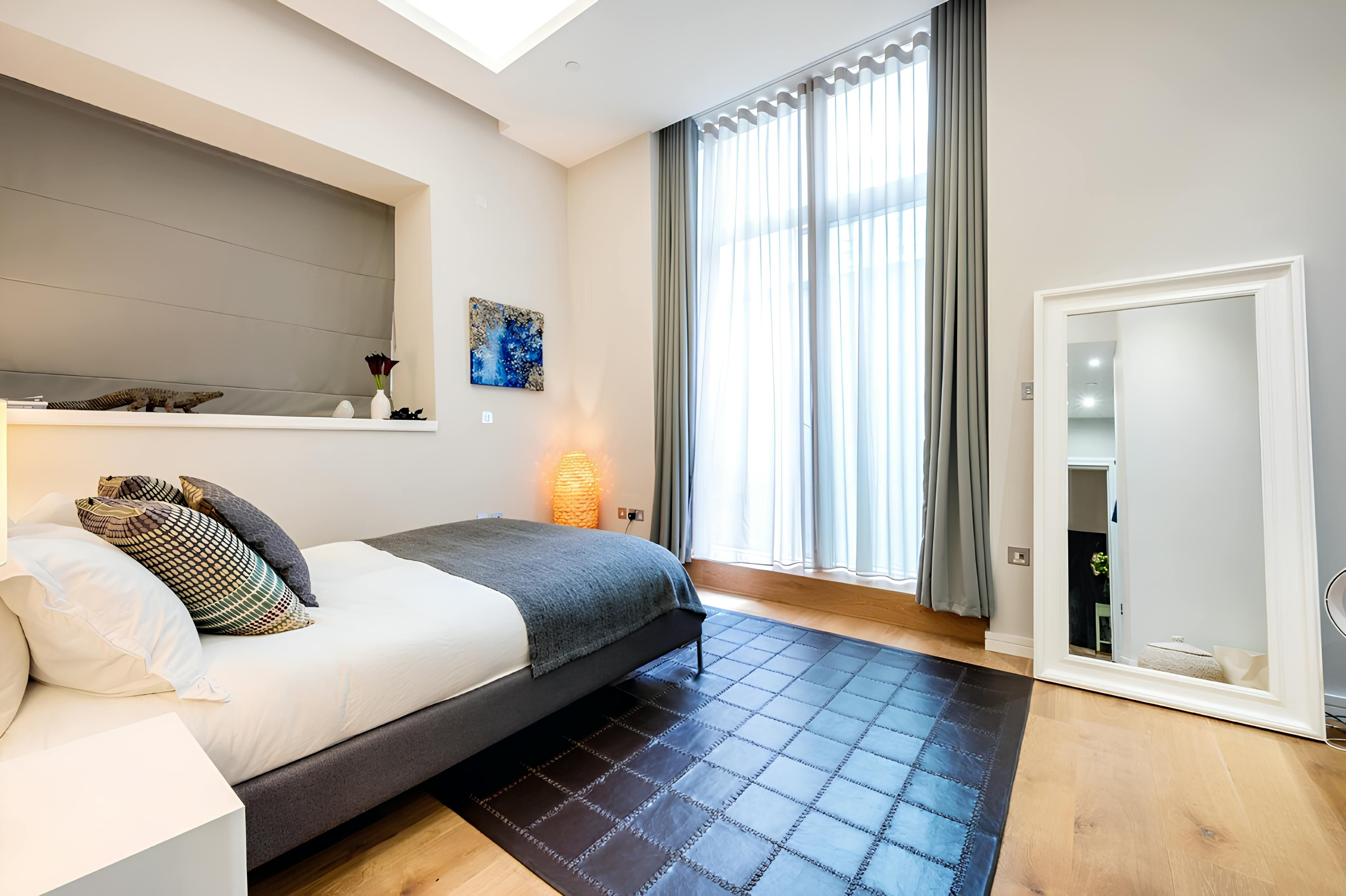 This stylish duplex apartment couldn’t be closer to Leicester Square – it's less than a thirty-second walk away. From there, you can effortlessly access Chinatown, Soho, and Covent Garden. Despite its central location, this is a peaceful London home. It faces an internal courtyard – it's a charming spot for a morning cuppa. The third bedroom has a small double bed that’s suitable for two children to share, and the room doubles as an exercise space. Convenient and comfortable, this apartment is a great choice for long stays in London.