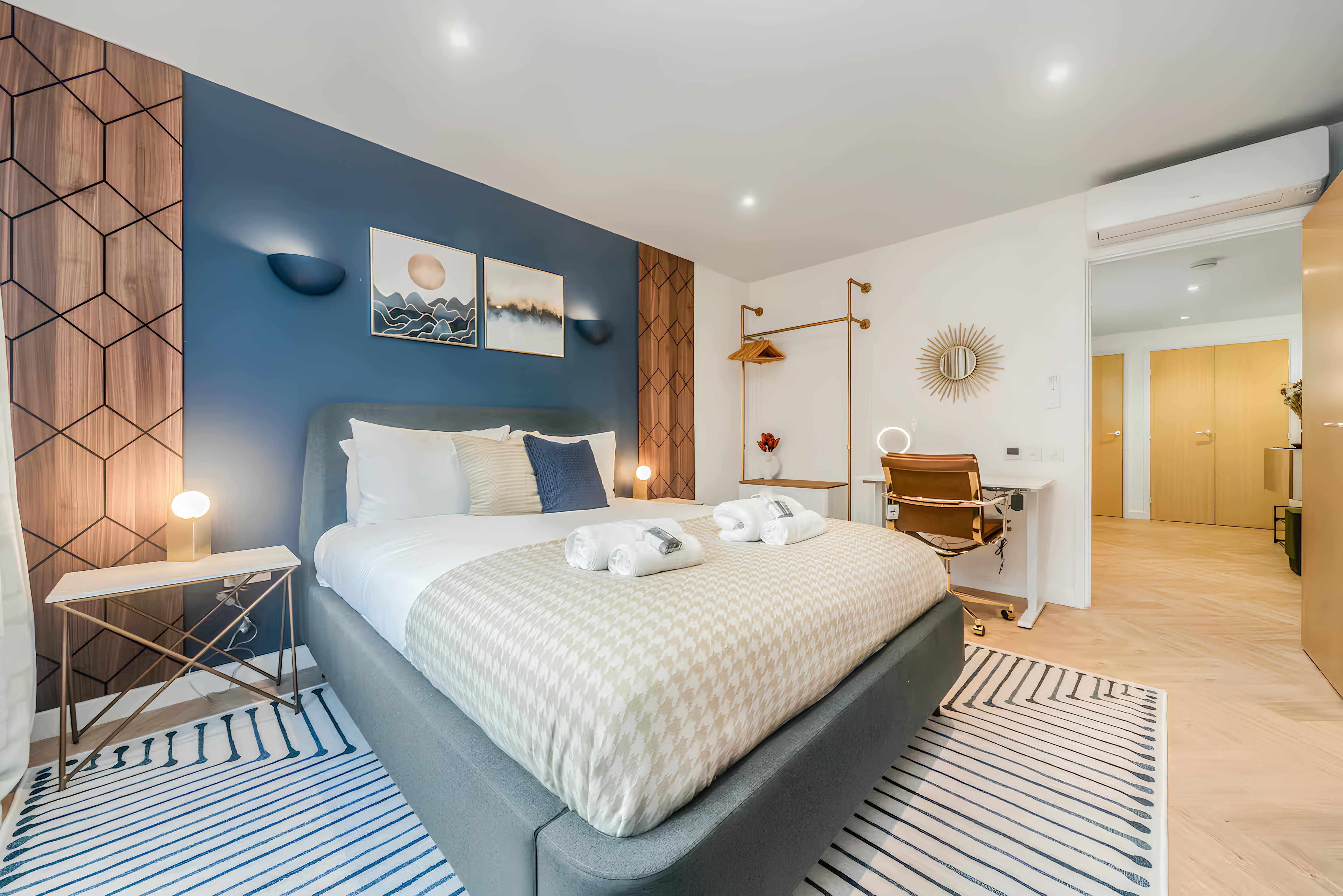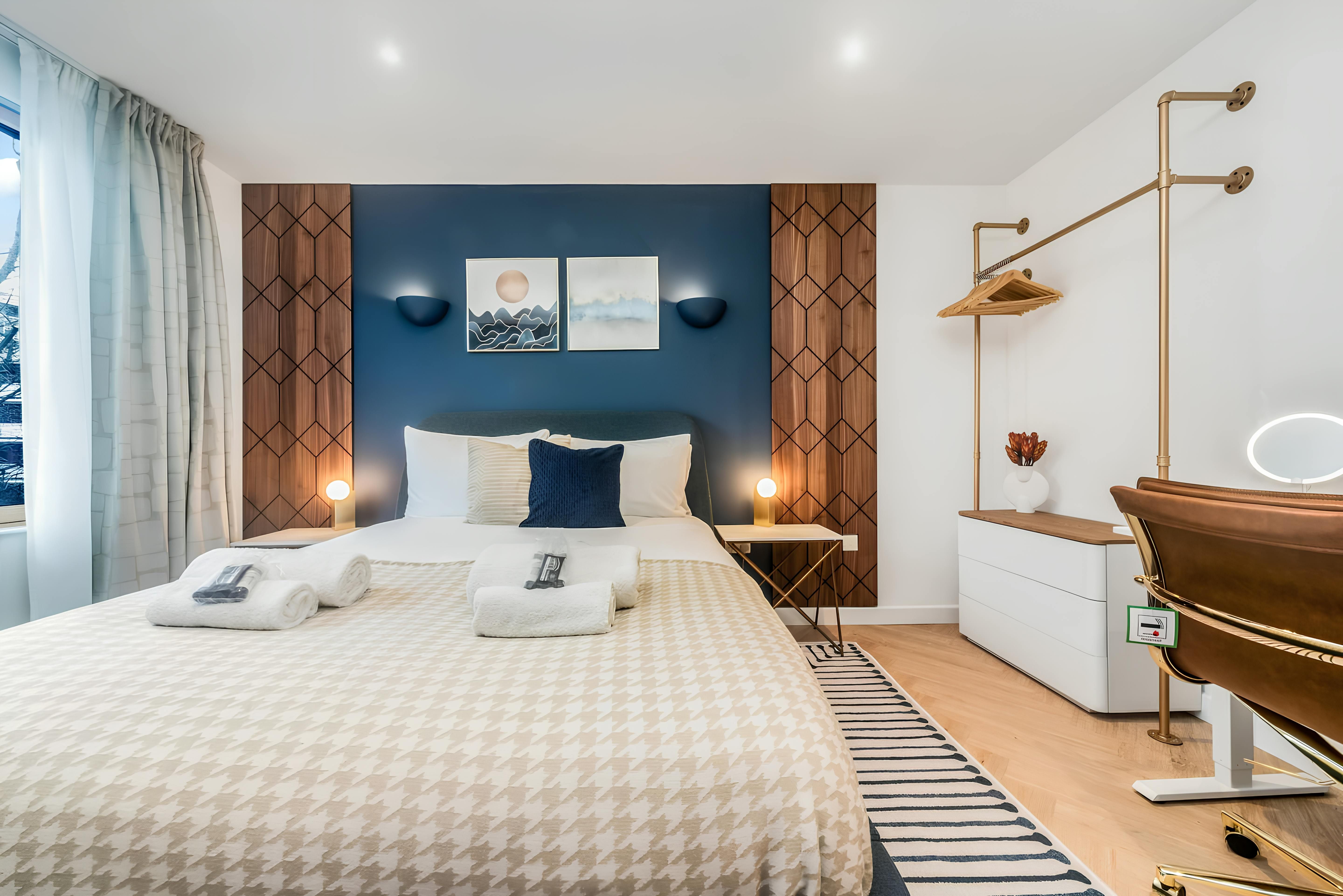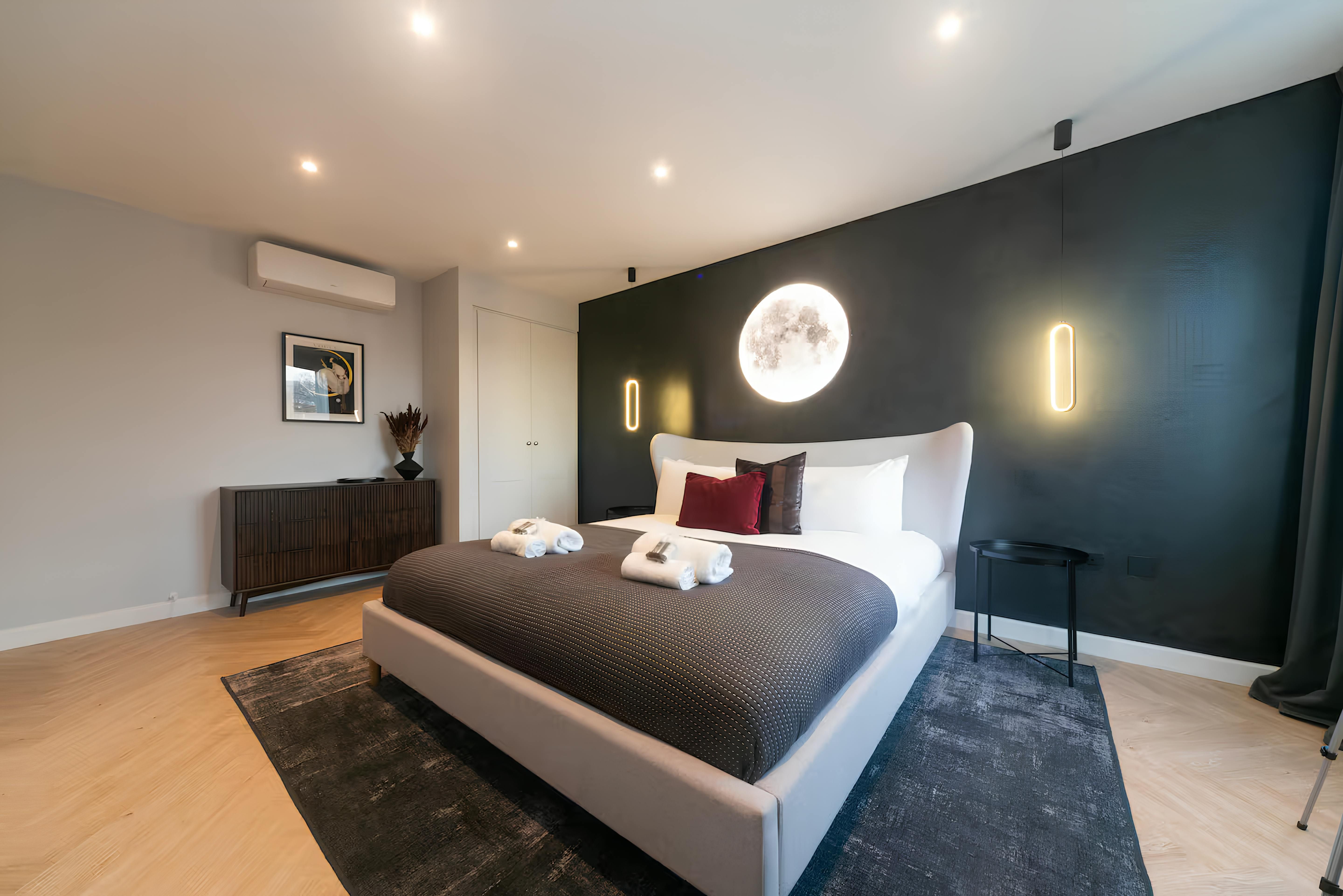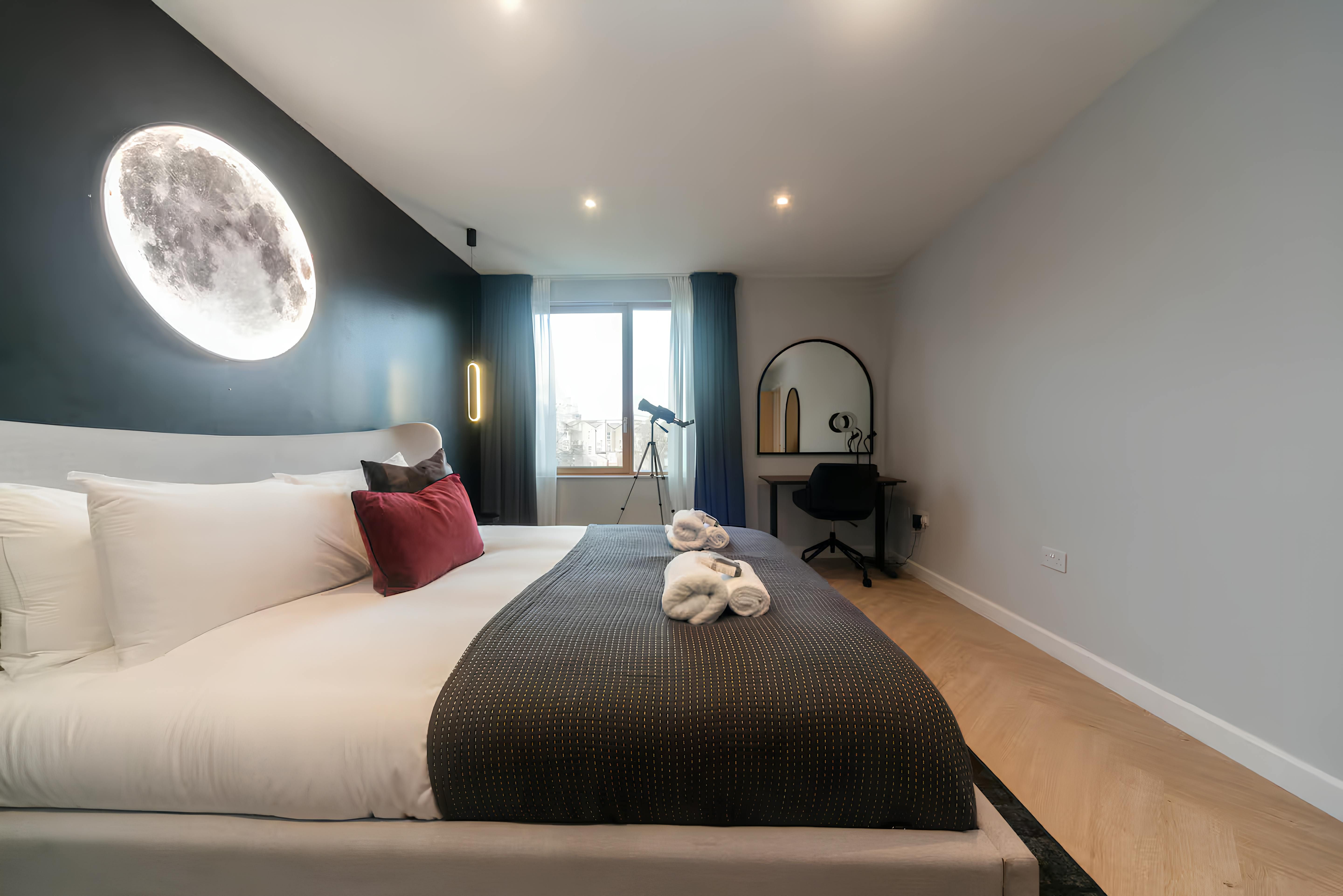 Just ten minutes from King’s Cross, this apartment is a convenient base for exploring London. Coal Drops Yard is nearby, as is Sadler’s Wells Theatre. The attractive apartment blends luxury and comfort, offering a modern kitchen, desks for remote working, and a relaxing open-plan living space. This is where two guests will sleep on a sofa bed. The living and dining space opens to a balcony, a great spot for a morning cuppa. We love the moon-themed bedroom with a telescope, and the sun theme in the second bedroom.