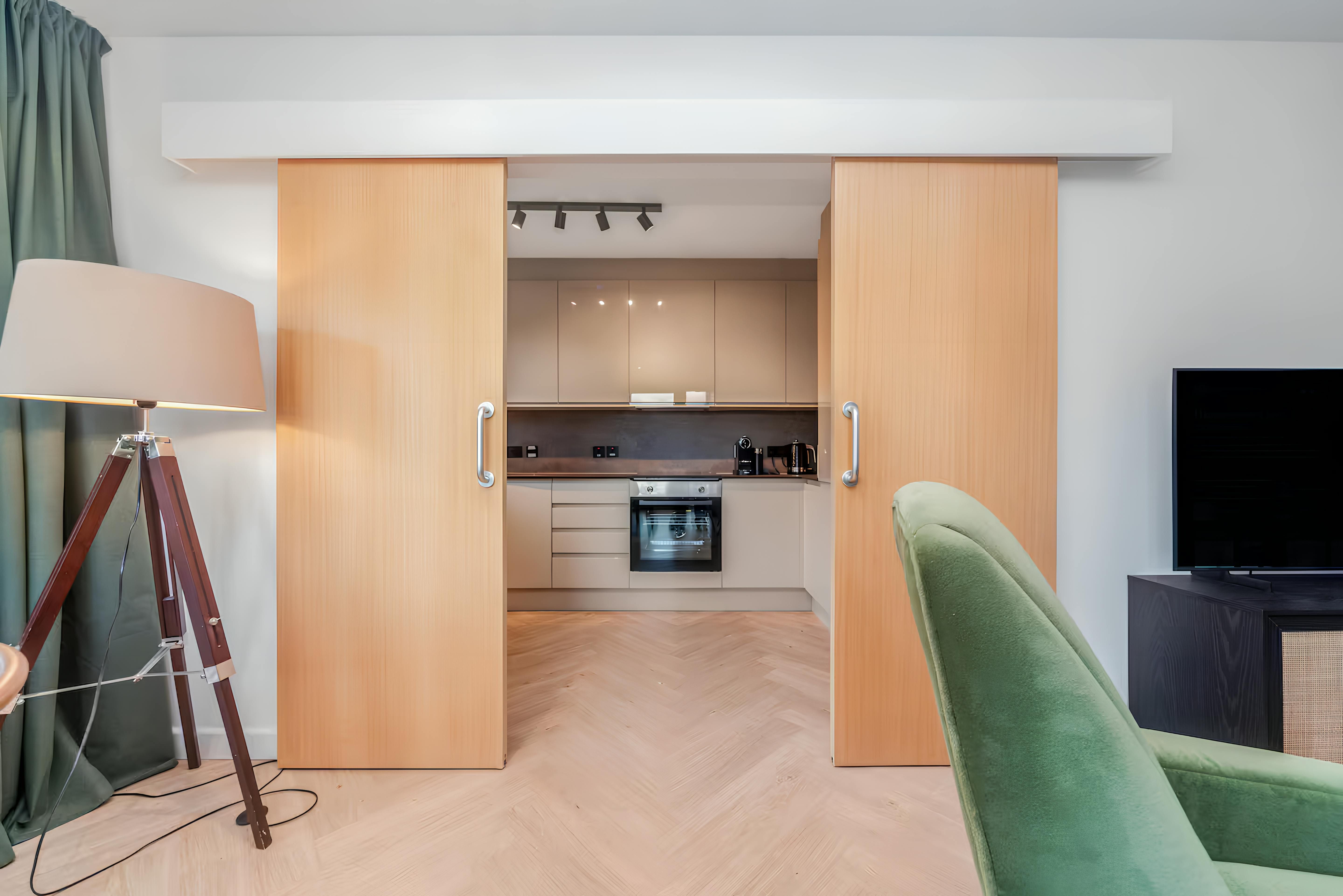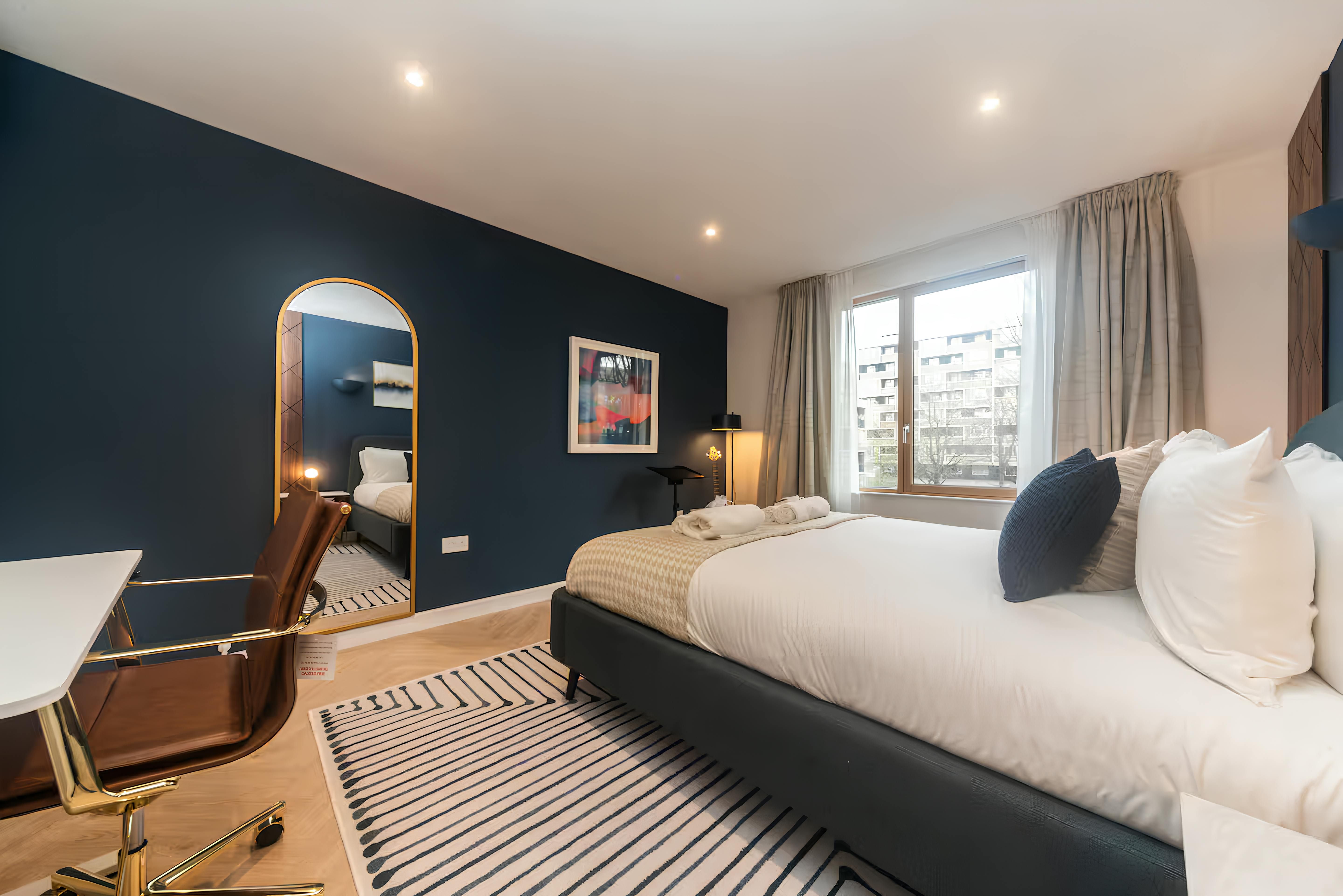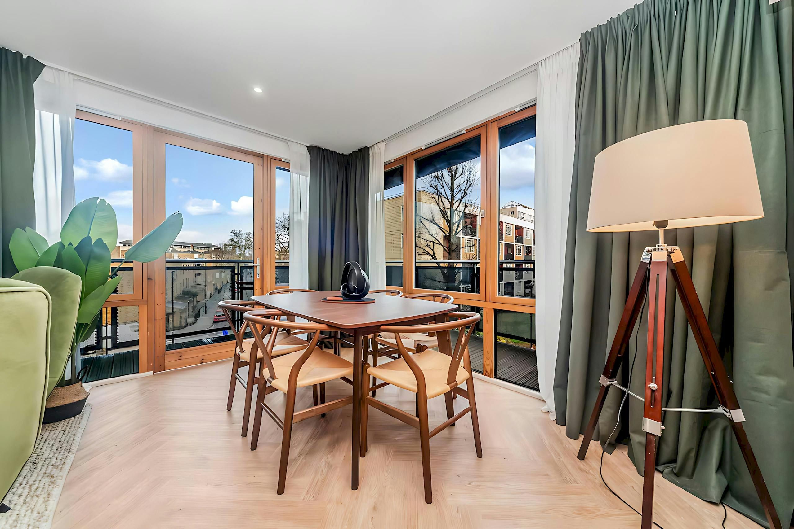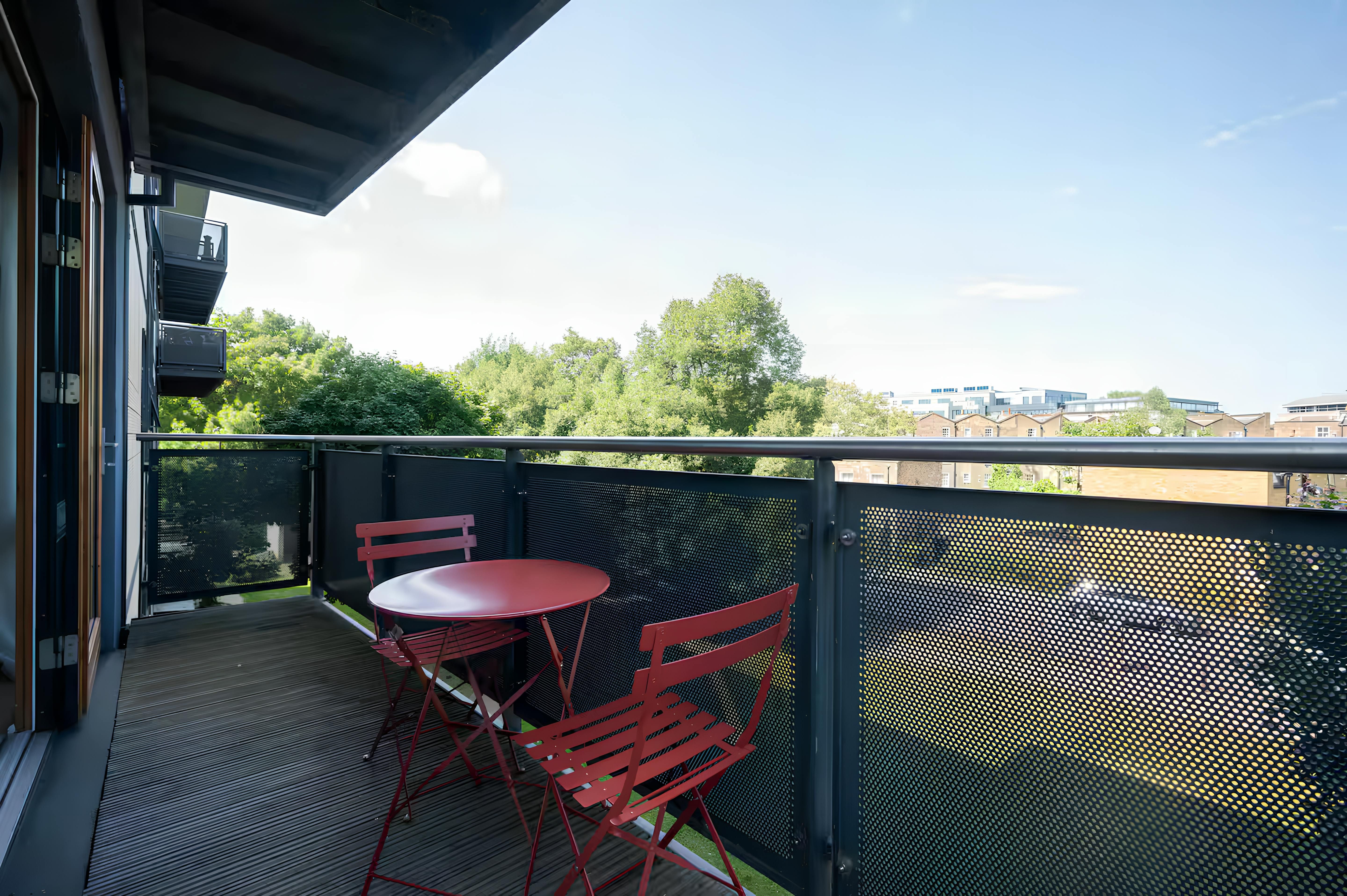 Just ten minutes from King’s Cross, this apartment is a convenient base for exploring London. Coal Drops Yard is nearby, as is Sadler’s Wells Theatre. The attractive apartment blends luxury and comfort, offering a modern kitchen, desks for remote working, and a relaxing open-plan living space. This is where two guests will sleep on a sofa bed. The living and dining space opens to a balcony, a great spot for a morning cuppa. We love the moon-themed bedroom with a telescope, and the sun theme in the second bedroom.
