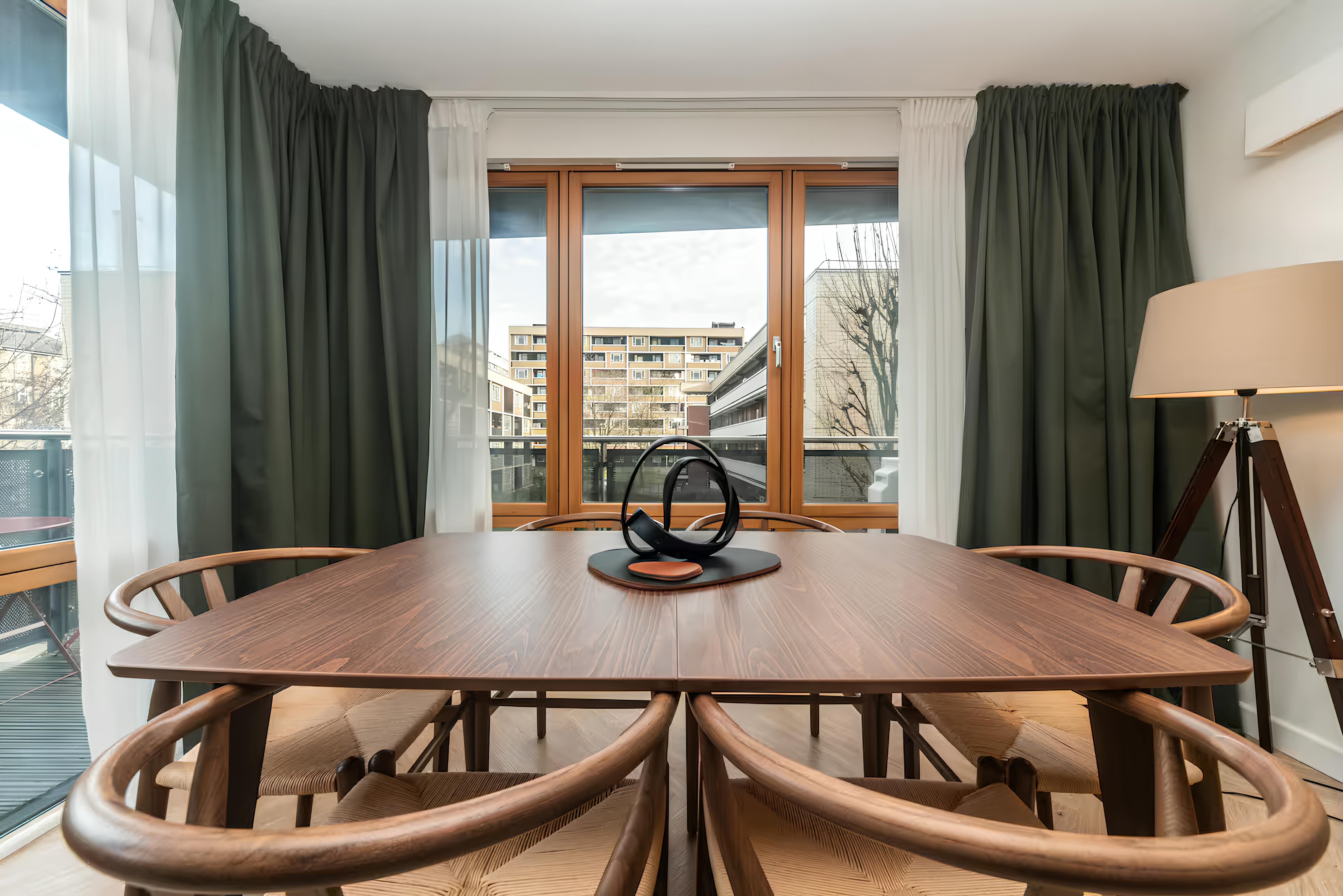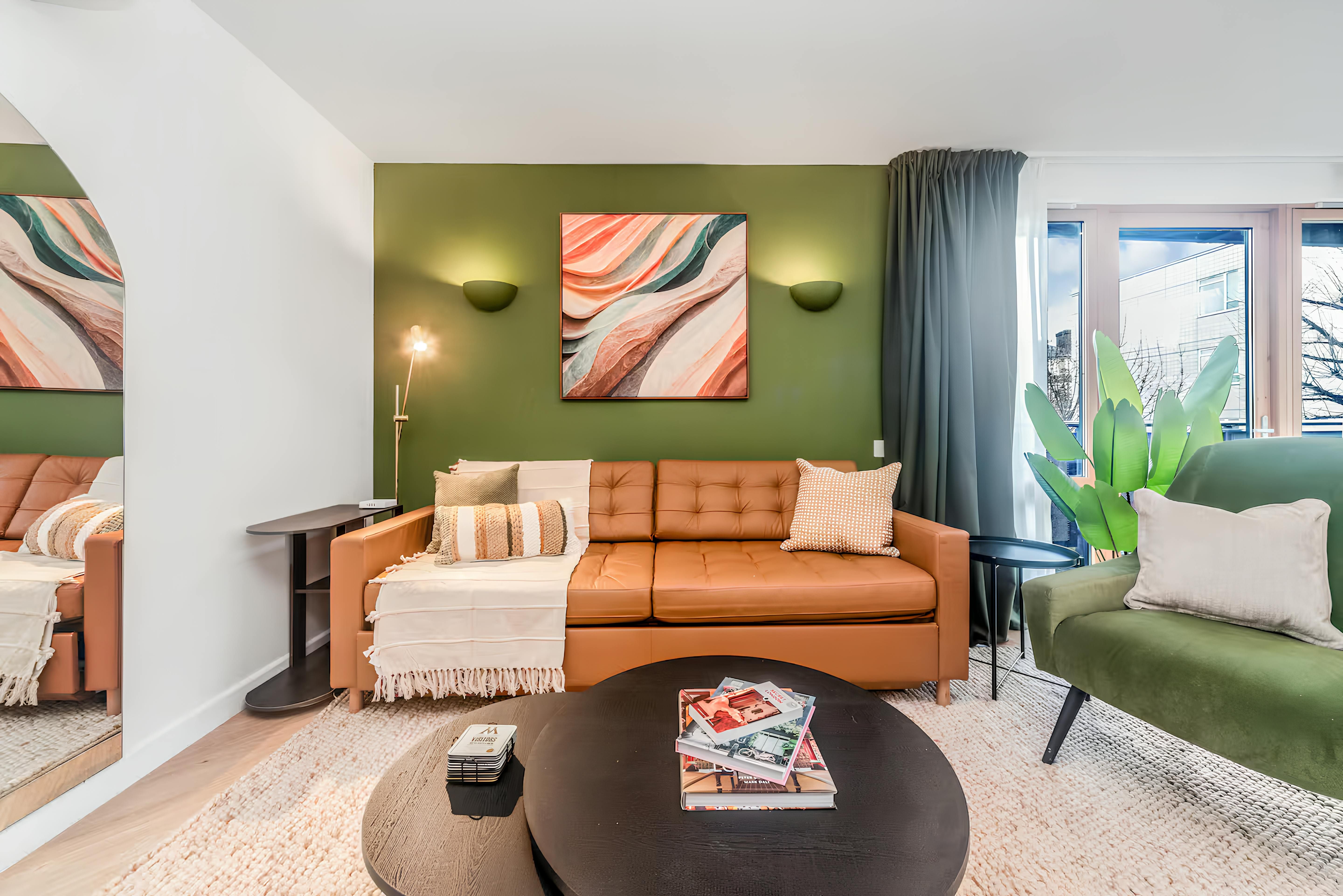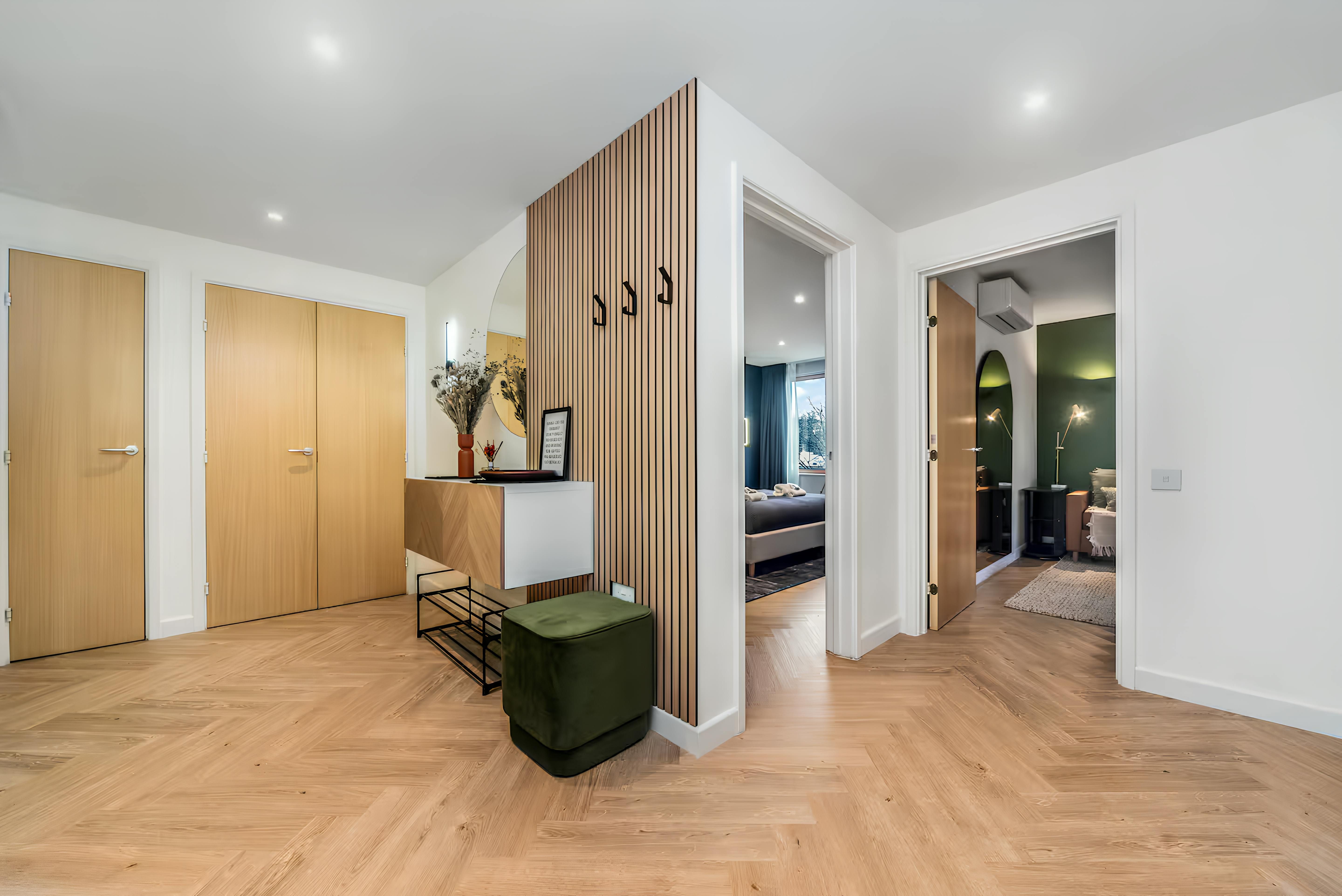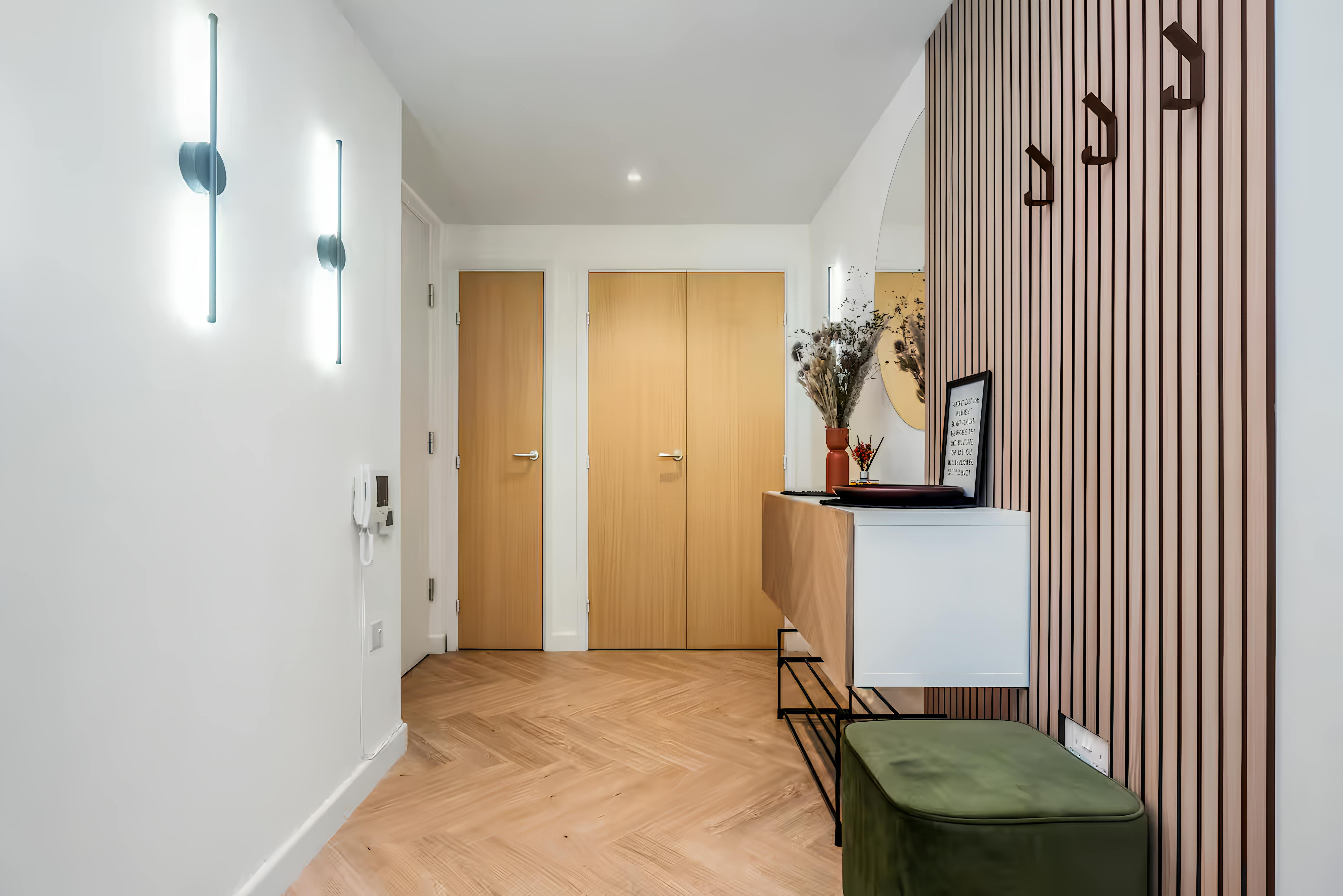 Just ten minutes from King’s Cross, this apartment is a convenient base for exploring London. Coal Drops Yard is nearby, as is Sadler’s Wells Theatre. The attractive apartment blends luxury and comfort, offering a modern kitchen, desks for remote working, and a relaxing open-plan living space. This is where two guests will sleep on a sofa bed. The living and dining space opens to a balcony, a great spot for a morning cuppa. We love the moon-themed bedroom with a telescope, and the sun theme in the second bedroom.