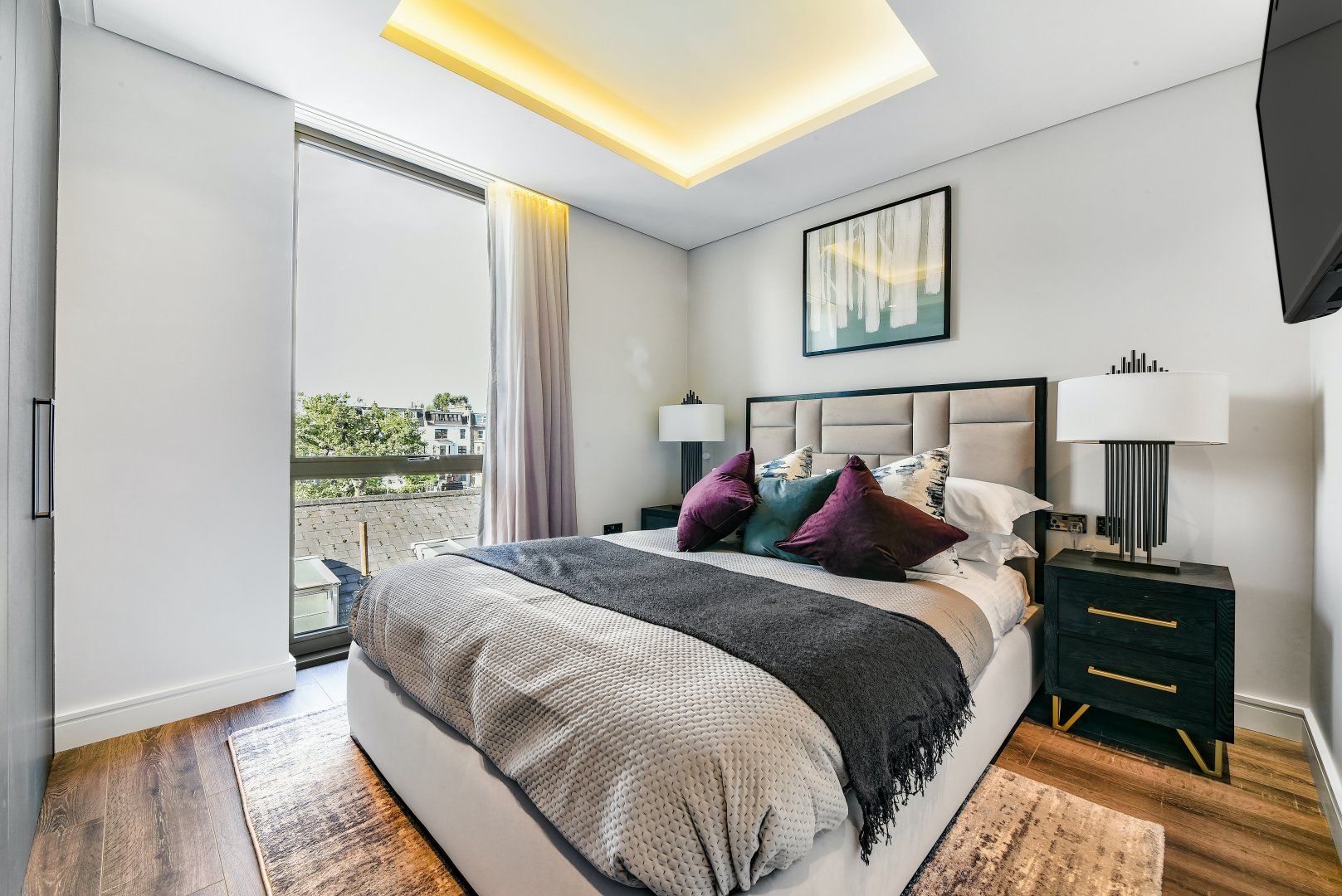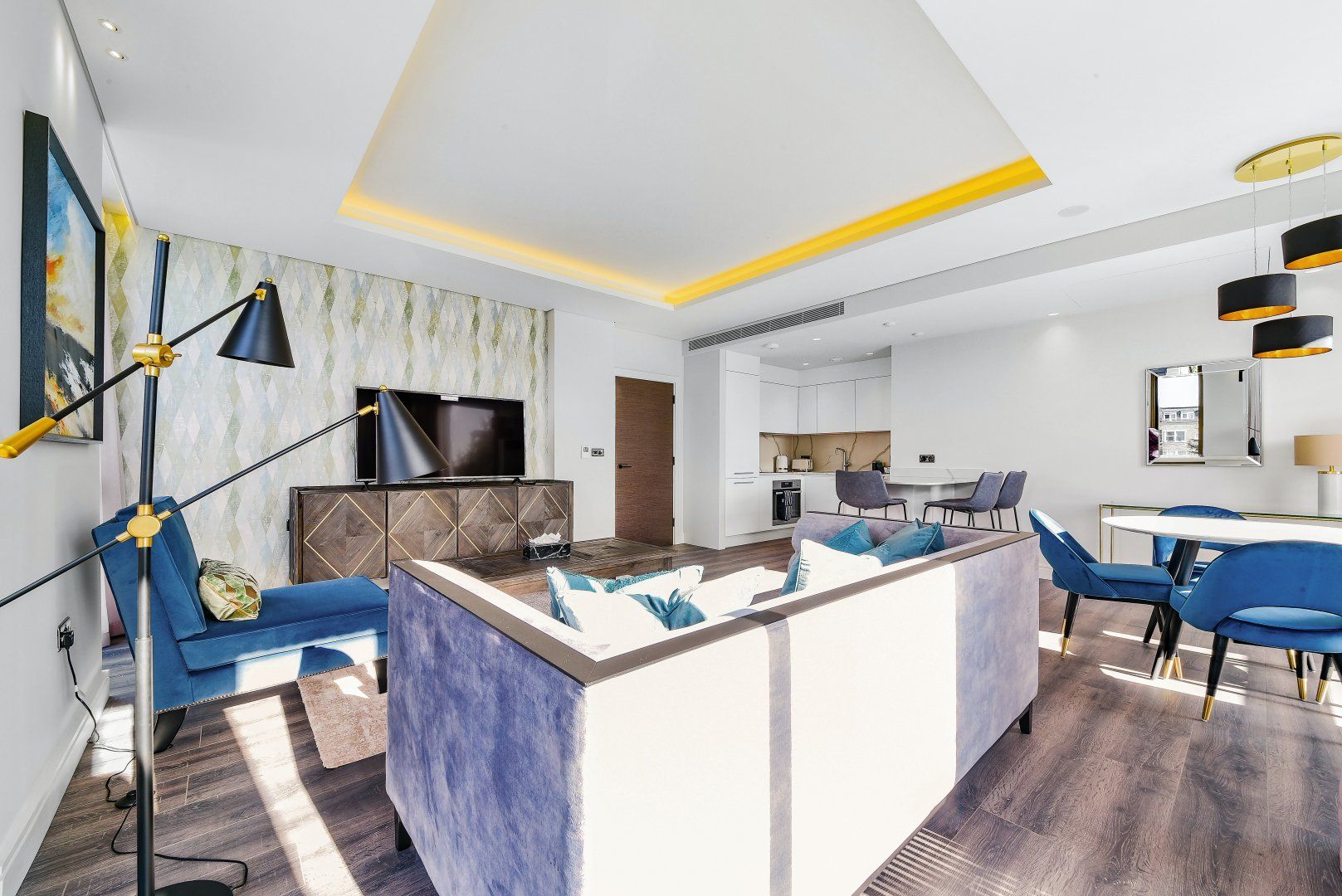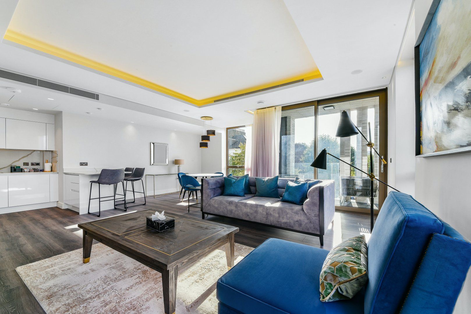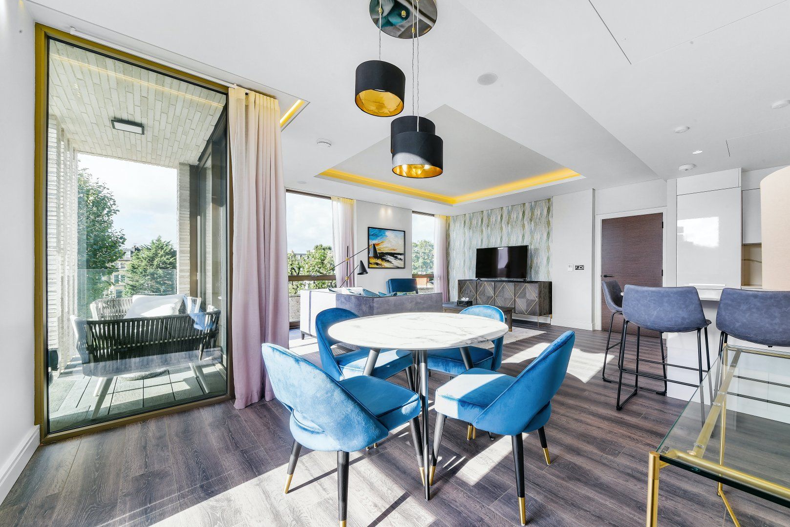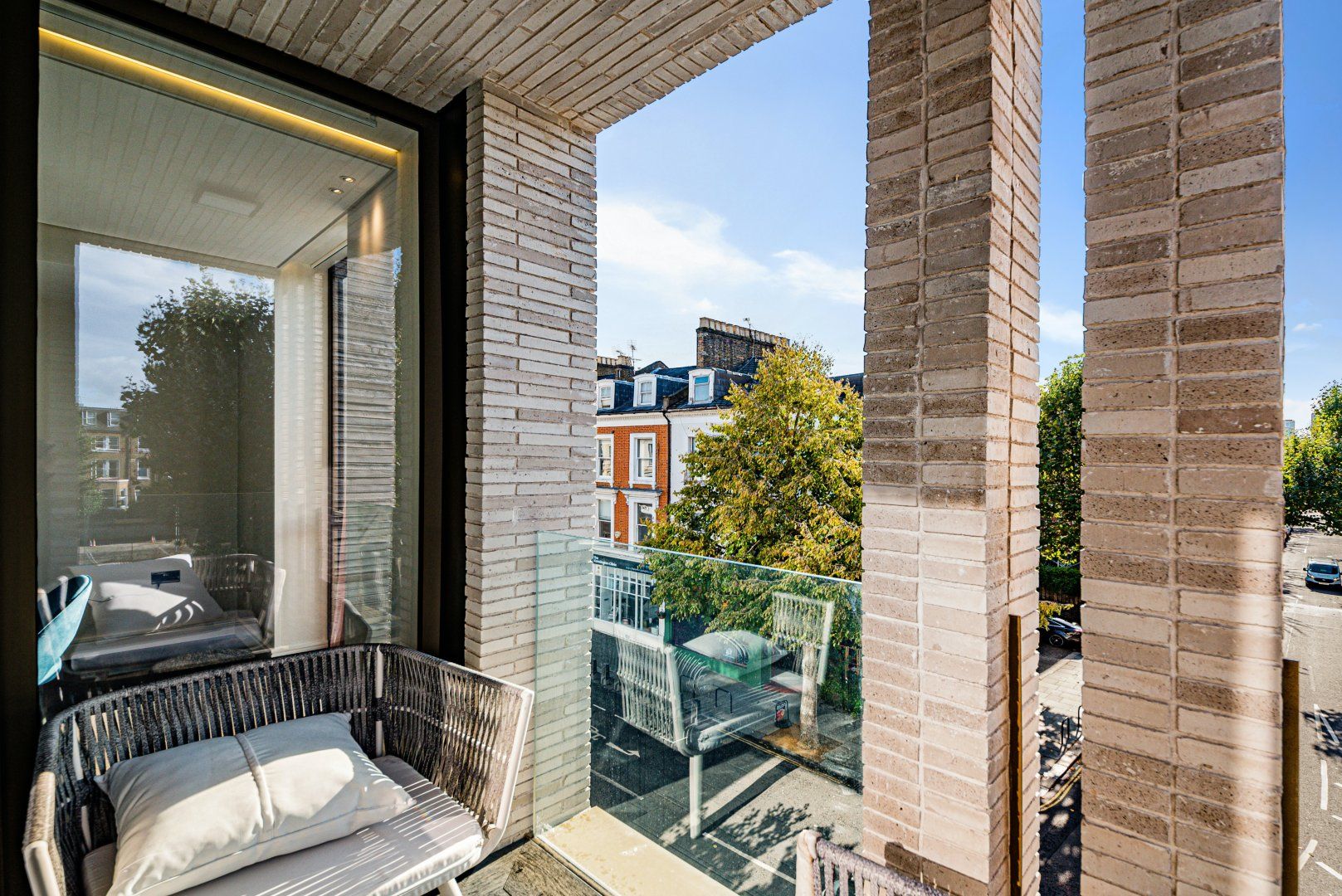 You'll find this sumptuous apartment nestled between Shepherd's Bush and Kensington, on a quiet street in the heart of West London. In one direction, there's the coffee shops and eateries on Kensington High Street, and in the other lies the extensive Westfield Shopping Centre, so you're not far from great shopping and excellent dining. Also close by is Holland Park – a ten-minute walk – which is the perfect spot for morning jogs and evening strolls in the fresh air. When you're not out exploring this pocket of the city, you'll probably be unwinding in the roomy living area, curled up on the plush sofa or rustling up dinner in the modern kitchen. This pad feels luxurious with marble backsplash, bright windows, and gold accents, yet it's still a comfortable place to rest your legs. The quaint balcony is our favourite spot – start the day out there with a cup of tea and watch the world wake up with the sun. Plus, there's so much room to spread out, we think two people will be more than happy calling this home while they're in town.