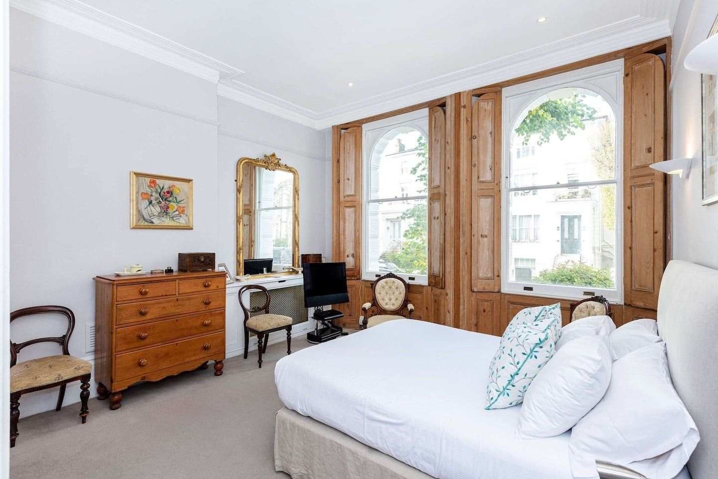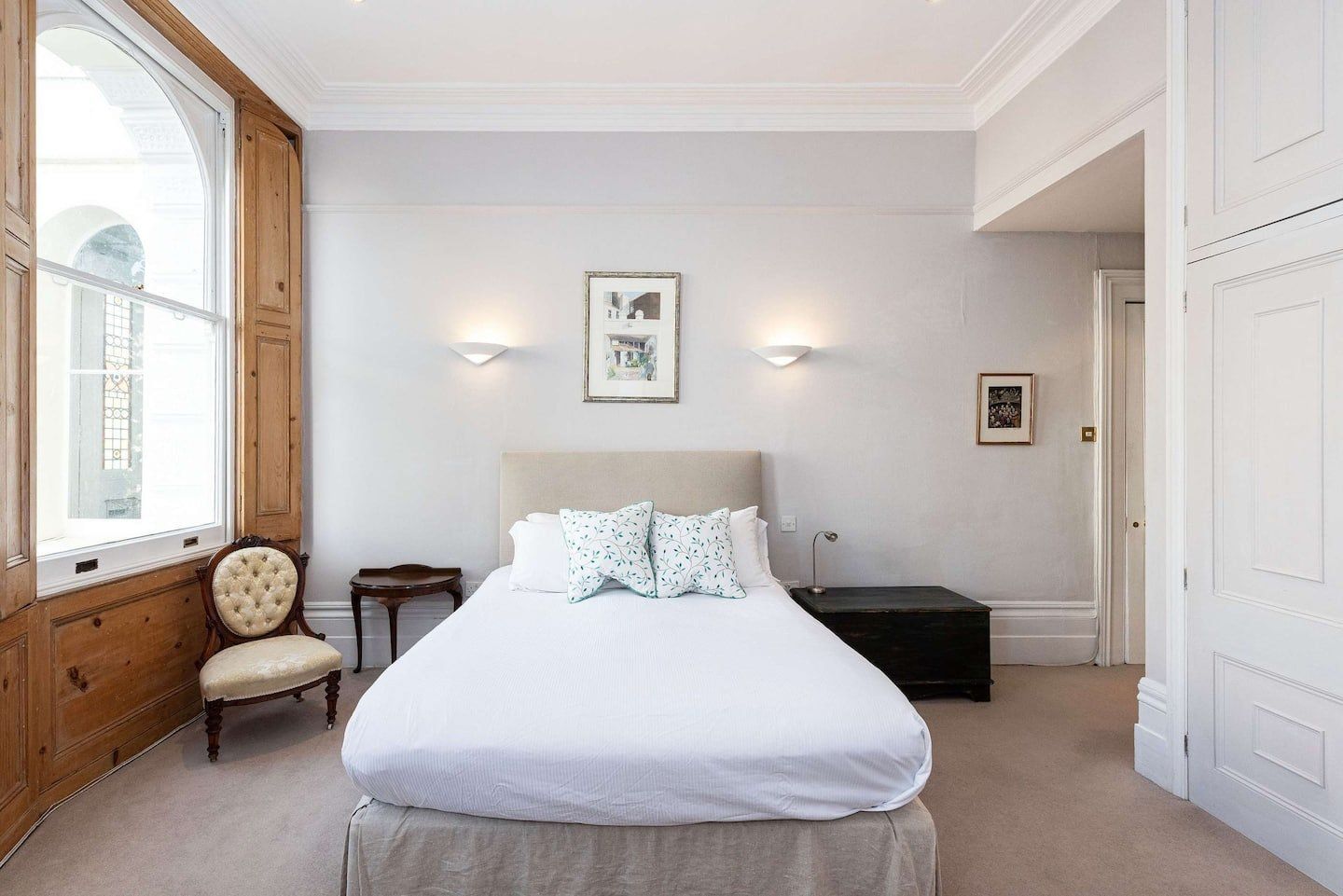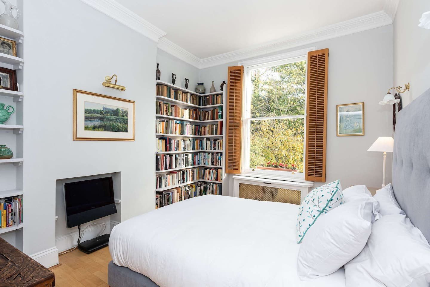 Filled with old-world charm, this bright apartment in Swiss Cottage dazzles with beautiful period features, like high ceilings, a decorative fireplace, original shutters and huge sash windows. Light pours in through the living room’s floor-to-ceiling panes, with peaceful views of the neighbours’ garden creating a tranquil setting for meals around the window-side table and evenings relaxing on the sofas with a glass of wine. Head out to your private balcony for morning coffees ahead of a day of sightseeing, or end nights on a high with an alfresco nightcap. The bedrooms are simple yet elegant, with more antiques and curios giving them plenty of character, as well as a library of books in one to make unwinding before bedtime blissful. When you’re not hanging out in your chic home, go out and explore your surroundings. You’re just a twenty-minute walk from both Hampstead Heath and Regent’s Park, while a thirty-minute stroll will take you to bustling Camden. We recommend packing an evening picnic and climbing to the top of Primrose Hill (twenty minutes away on foot) to watch a spectacular sunset over the city.