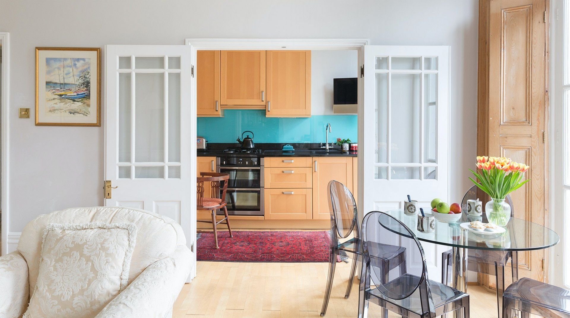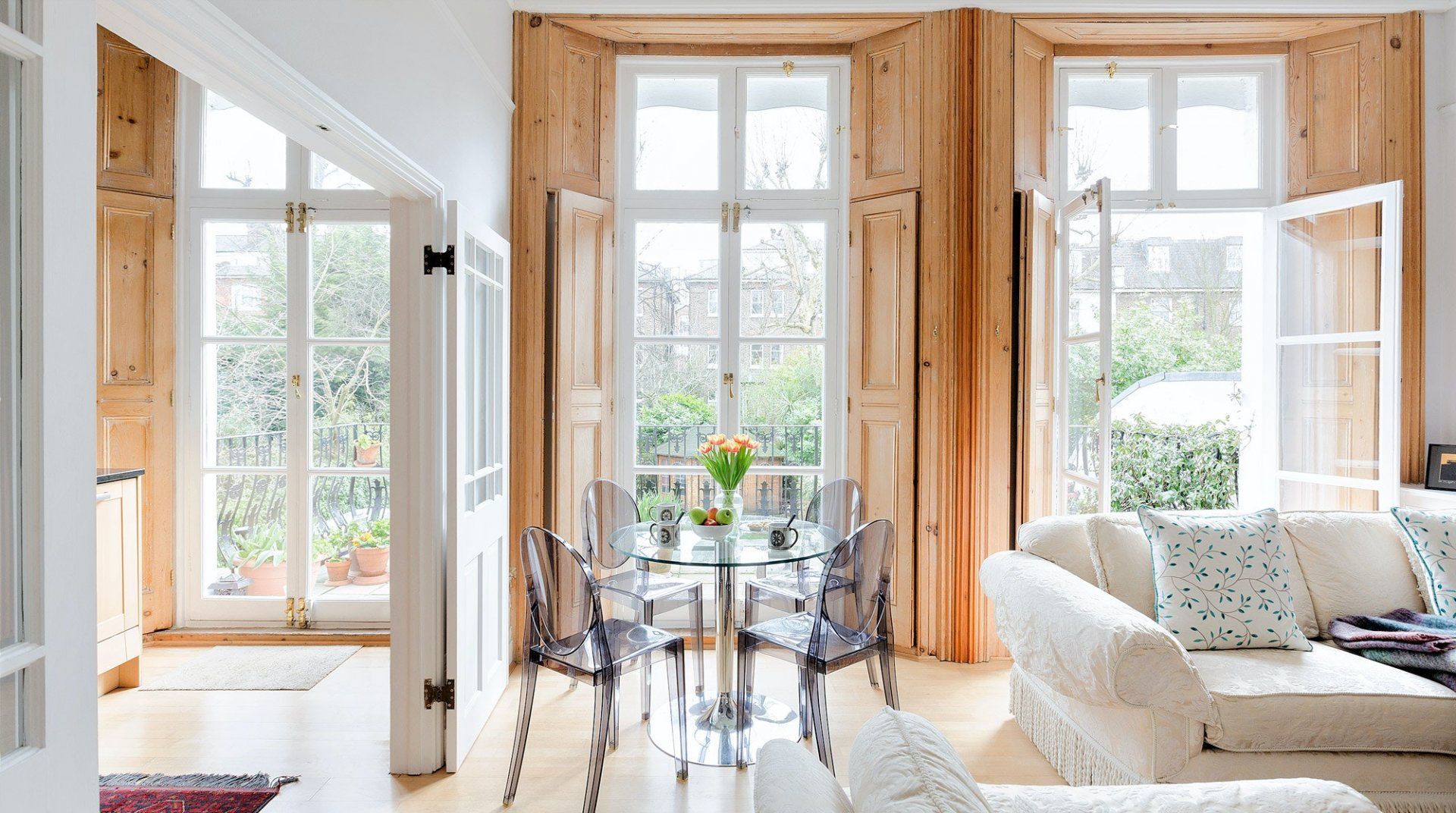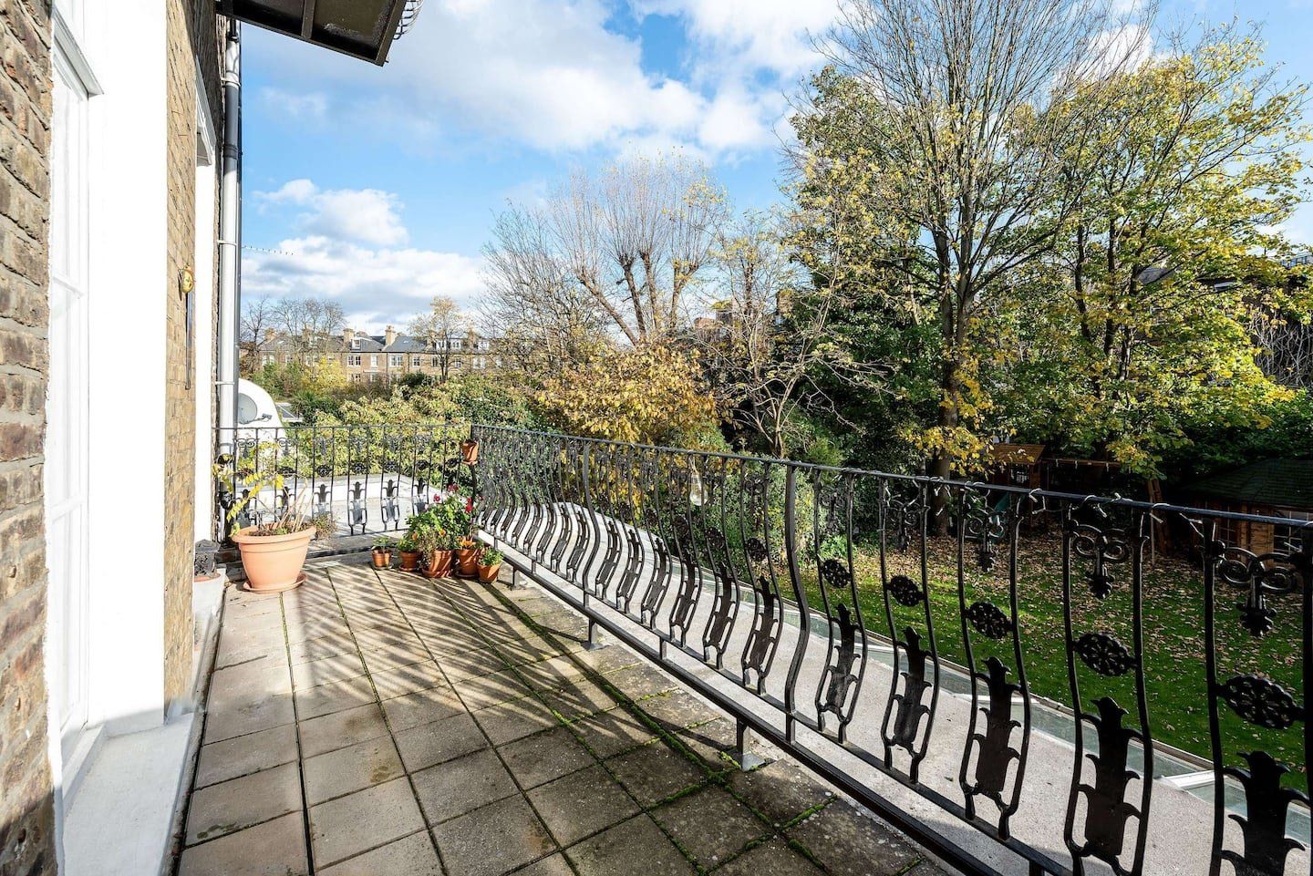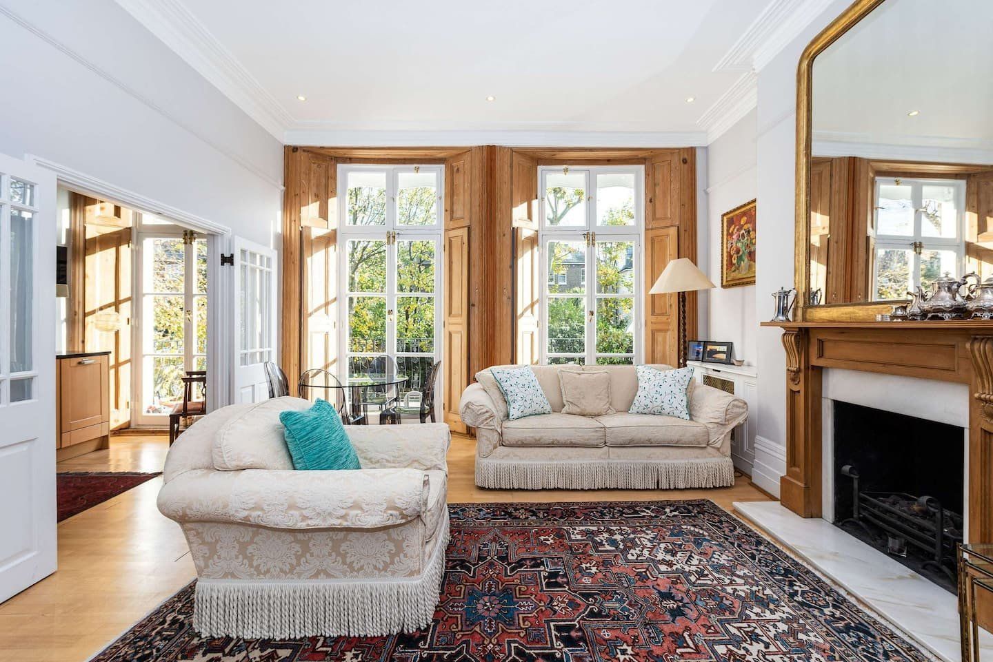 Filled with old-world charm, this bright apartment in Swiss Cottage dazzles with beautiful period features, like high ceilings, a decorative fireplace, original shutters and huge sash windows. Light pours in through the living room’s floor-to-ceiling panes, with peaceful views of the neighbours’ garden creating a tranquil setting for meals around the window-side table and evenings relaxing on the sofas with a glass of wine. Head out to your private balcony for morning coffees ahead of a day of sightseeing, or end nights on a high with an alfresco nightcap. The bedrooms are simple yet elegant, with more antiques and curios giving them plenty of character, as well as a library of books in one to make unwinding before bedtime blissful. When you’re not hanging out in your chic home, go out and explore your surroundings. You’re just a twenty-minute walk from both Hampstead Heath and Regent’s Park, while a thirty-minute stroll will take you to bustling Camden. We recommend packing an evening picnic and climbing to the top of Primrose Hill (twenty minutes away on foot) to watch a spectacular sunset over the city.