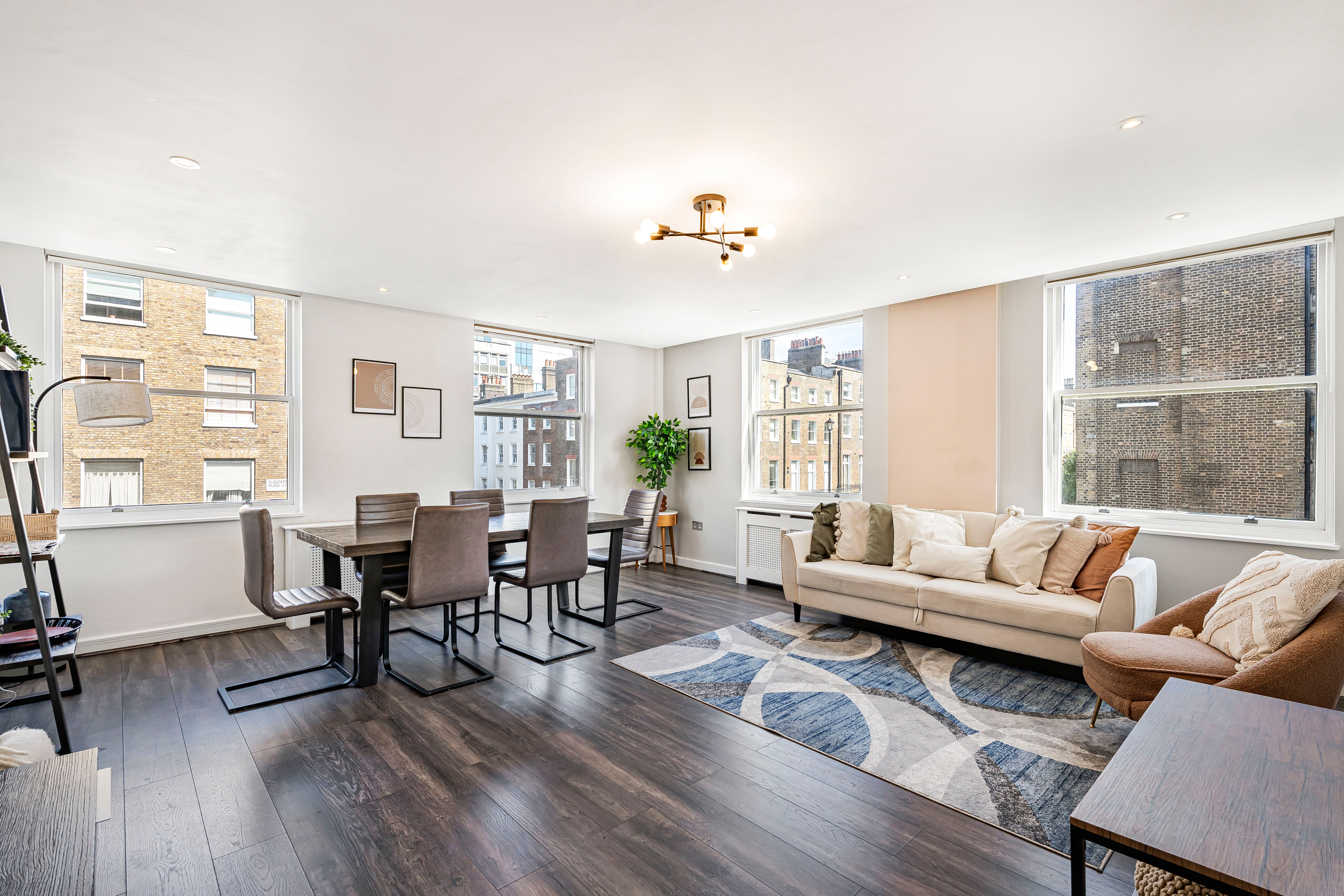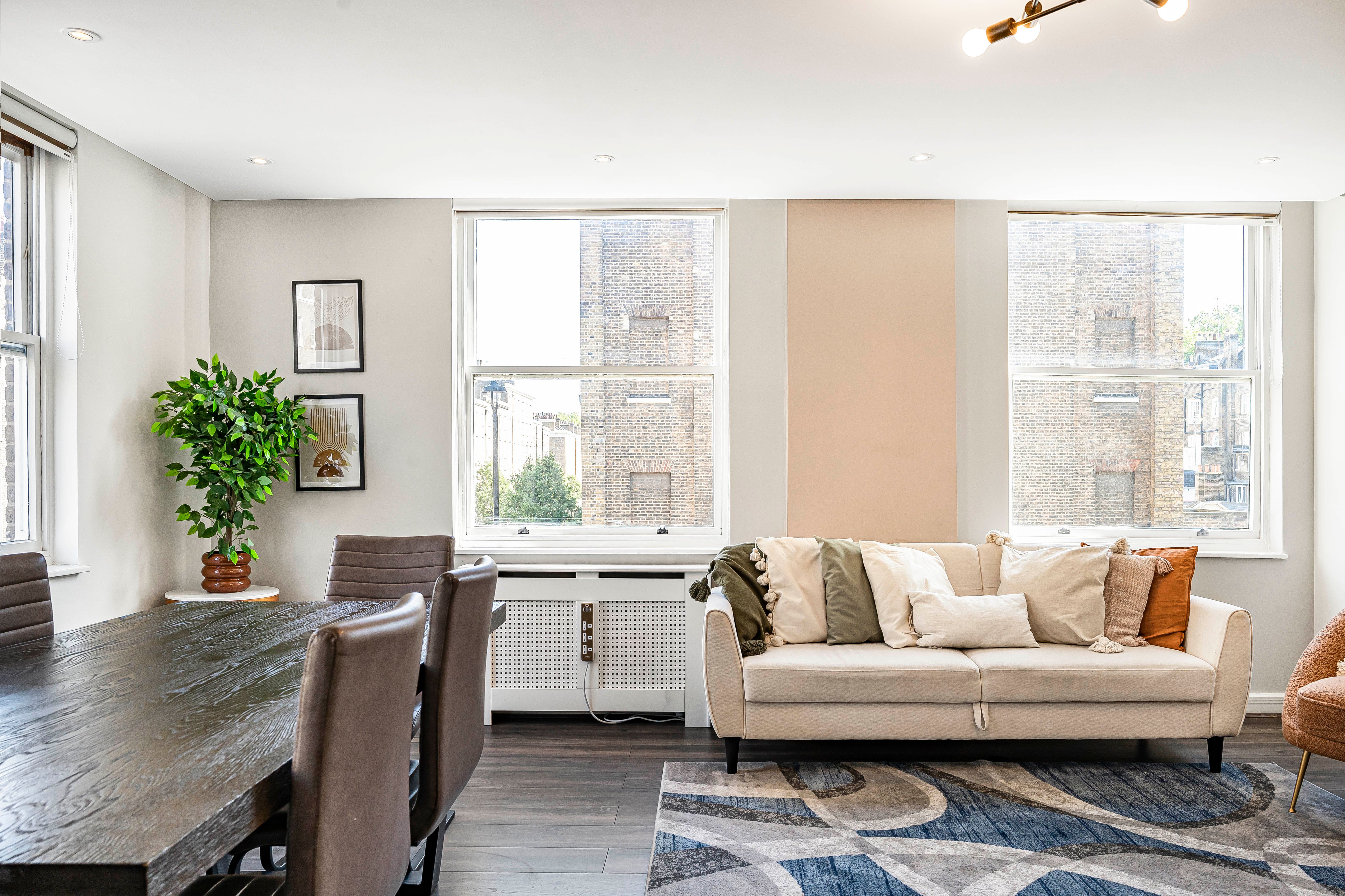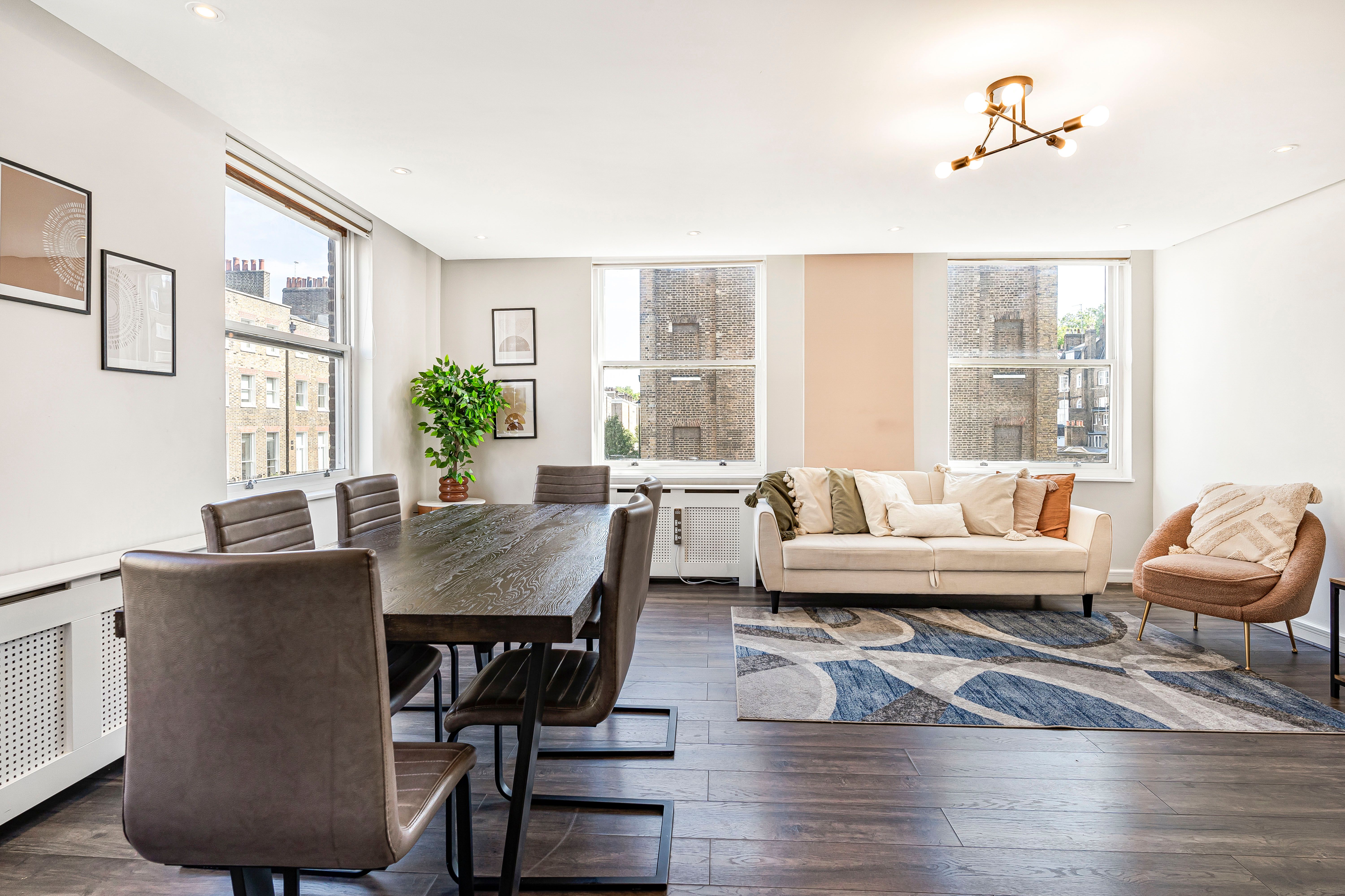 Location is everything in London. This apartment is based in Marylebone, mere moments from the best dining and shopping in the city – Selfridges, Oxford Street, and Bond Street are all within walking distance. You’ll also be close to Regent’s Park, ideal when you want a break from London’s hustle and bustle. On your arrival, you’ll stroll along a street lined with Georgian buildings, hinting at the elegance within. We love how bright this home is, with its tall windows and open-plan living and dining layout. At full occupancy, two guests will sleep on a sofa bed here. Everyone else will benefit from the calm, attractive bedrooms, one of which leads to a private balcony and has a desk for remote working.