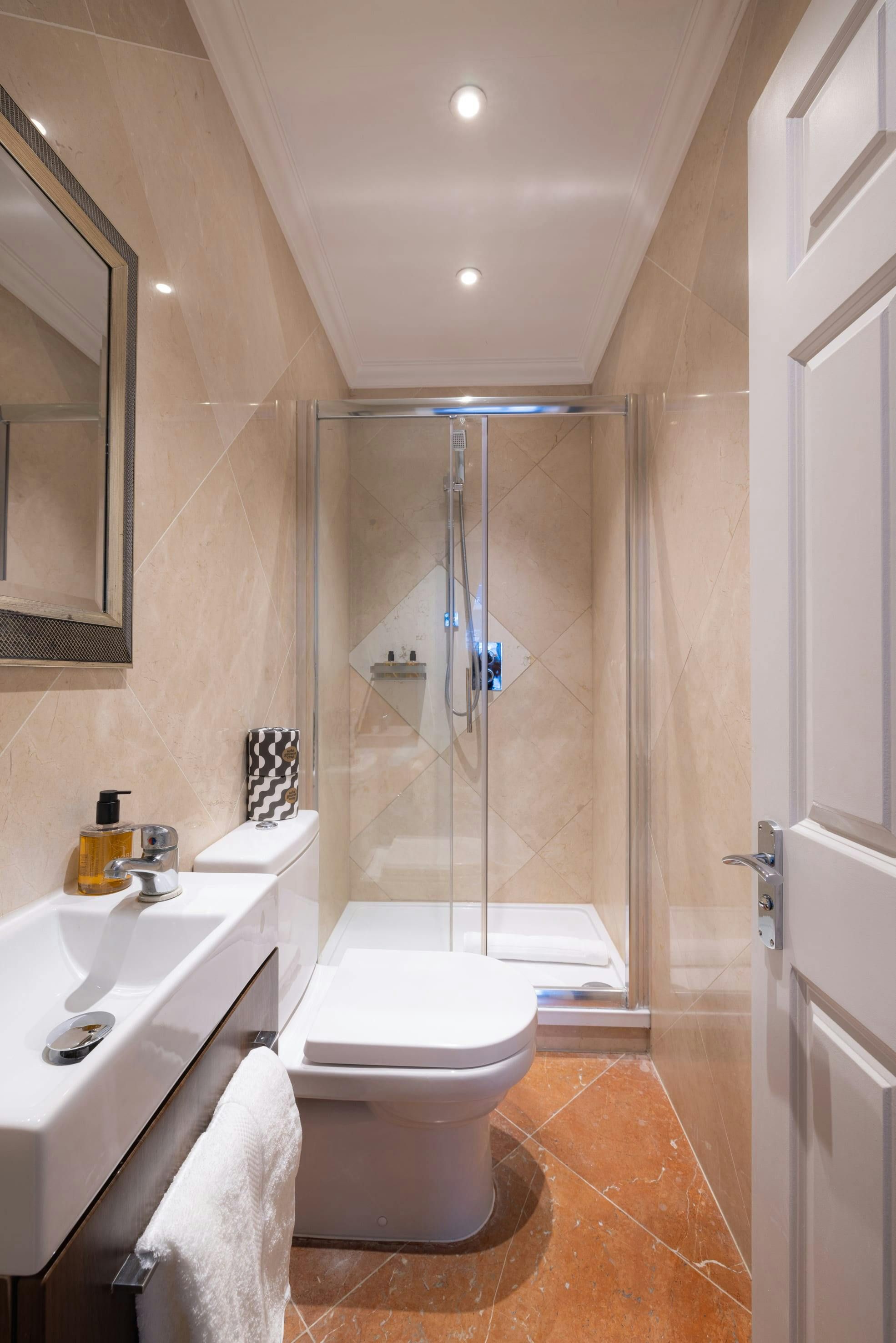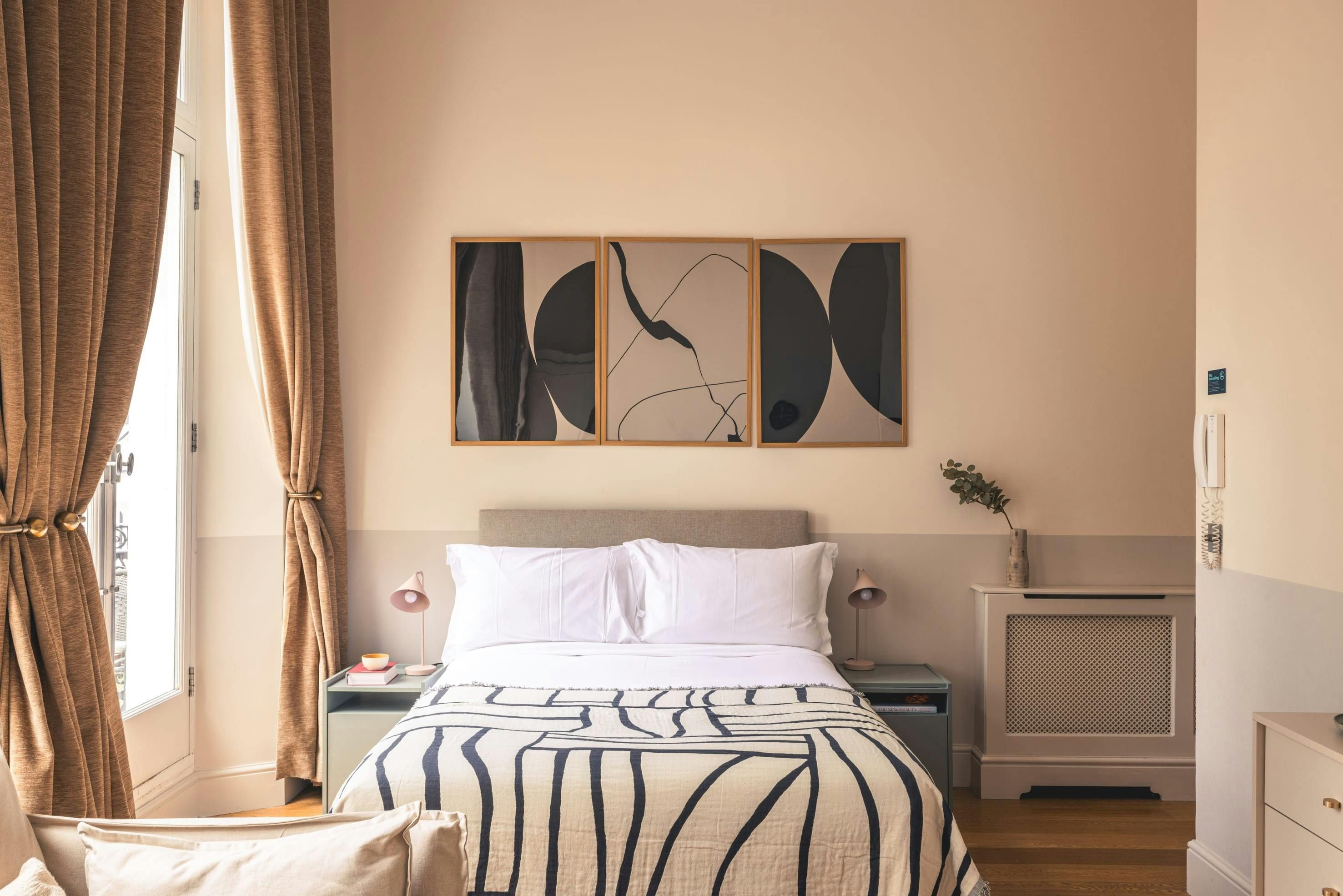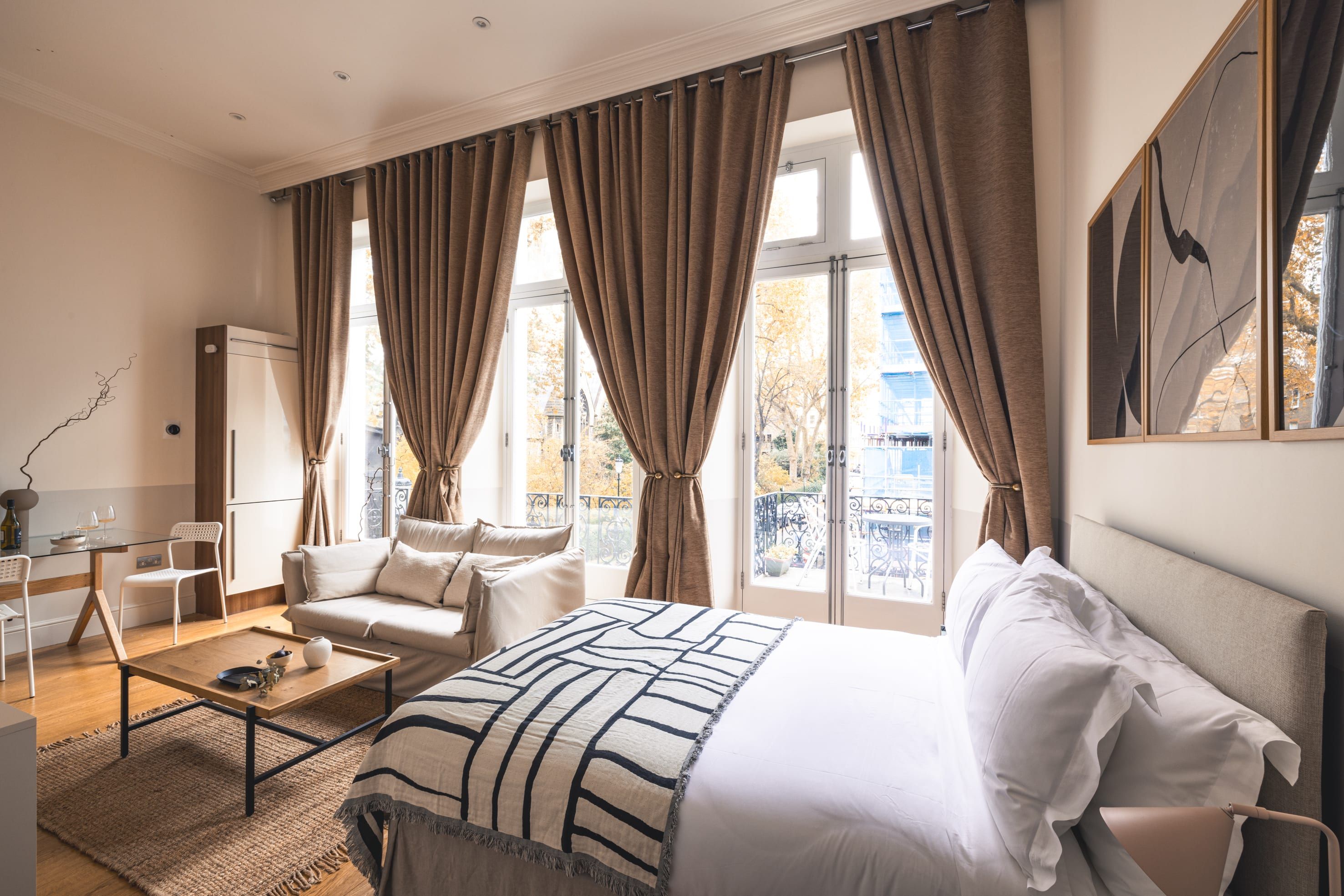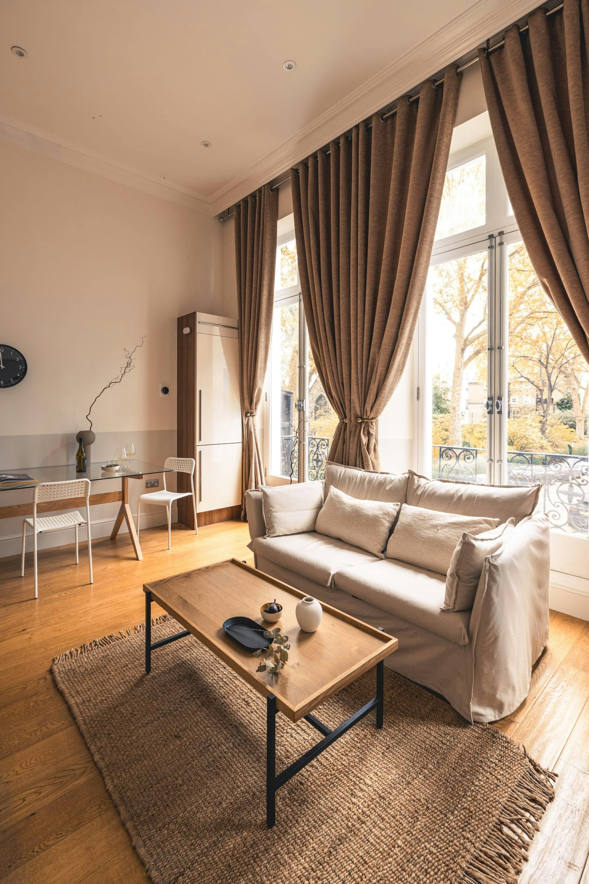 Located in Kensington, one of the most exclusive enclaves in London, this stylish studio is sure to please. Shops, eateries, and cafes are all close at hand, while must-visits like The V&A and Hyde Park are about a twenty-minute stroll away. All things considered, we think this apartment is pretty roomy for a studio. Though the living area and bedroom are in the same space, the kitchenette is well-appointed and the dining table doubles up as a desk if remote working is on the cards. Besides, with so much to see on your doorstep, you'll likely spend most of your time out and about.