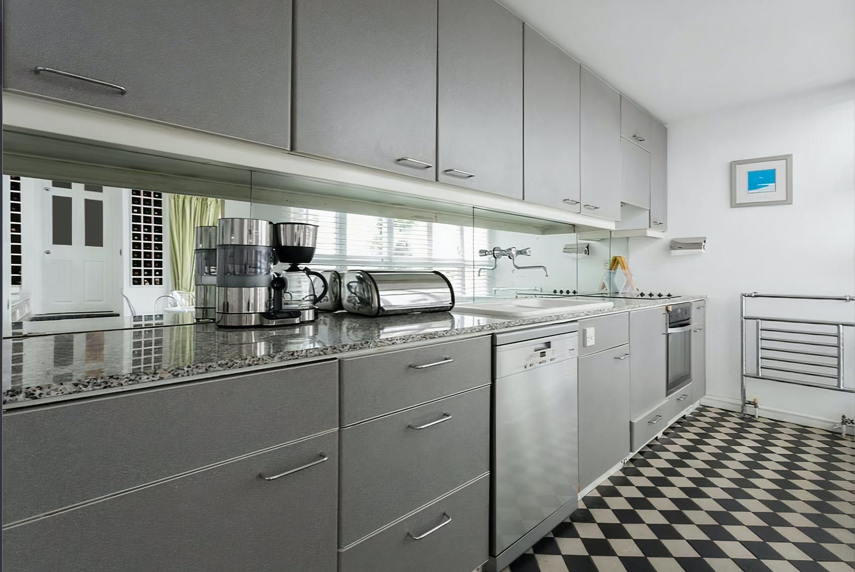 This apartment is one of them. We'll start with the terrace, which, while on the smaller side, has been styled as a peaceful enclave complete with vegetation and a stone fountain. The chequerboard tiling underfoot is striking, especially the way in which it continues in through the curved glass door and snaked into the modern grey kitchen.