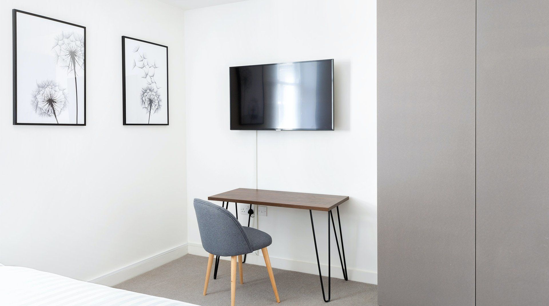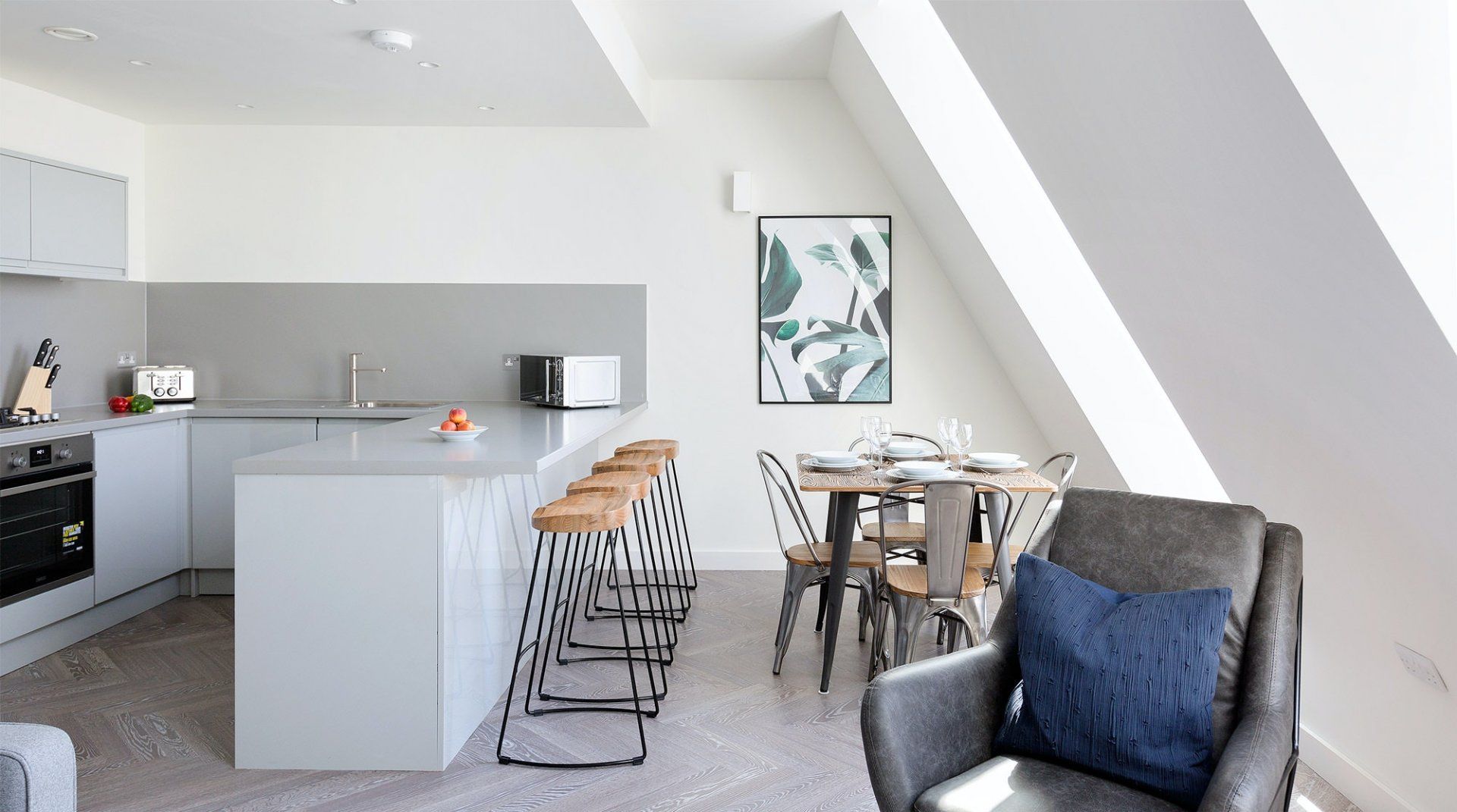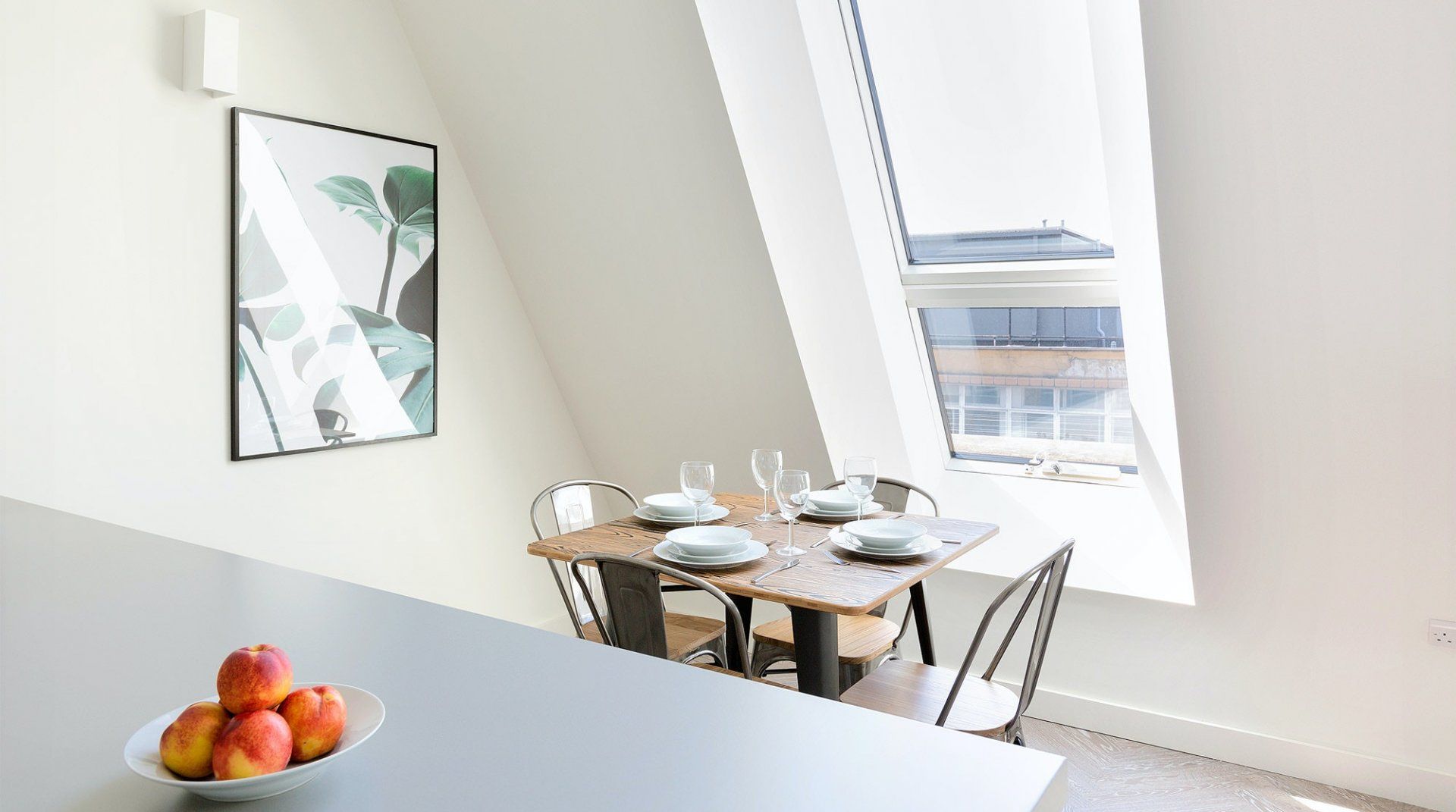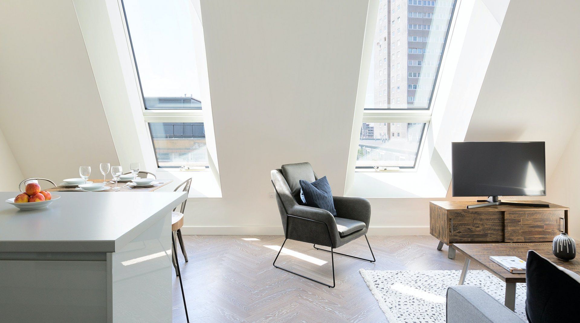Situated in vibrant Shoreditch just a stone's throw from Old Street Station, this modern apartment has a lot going for it. The location is spot-on if you like to be surrounded by lively bars, local coffee shops and some of the best restaurants in London. It's also home to tech start-ups, media offices and a pretty exciting art scene – just wander down the graffiti-covered streets and you'll see what we mean. Everything is a short stroll or tube ride away – including the City, which is a twenty-five-minute walk – so you couldn't ask for a better spot to base yourself. Back at home, this contemporary flat was once a tea warehouse, and that industrial-chic vibe is reflected in the cool, trendy design. The sleek kitchen is fully-stocked for home cooking, while the bathrooms sport lavish rainfall showers and luxury toiletries. When you need to hop on a Zoom call, both bedrooms have desks where you can work from home, and after a long day, there's nothing better than sinking into the comfortable sofa with a glass of wine and your favourite show on the smart TV. We adore the metre-long windows – not only do they flood the room with natural light, but the views aren't too bad, either.