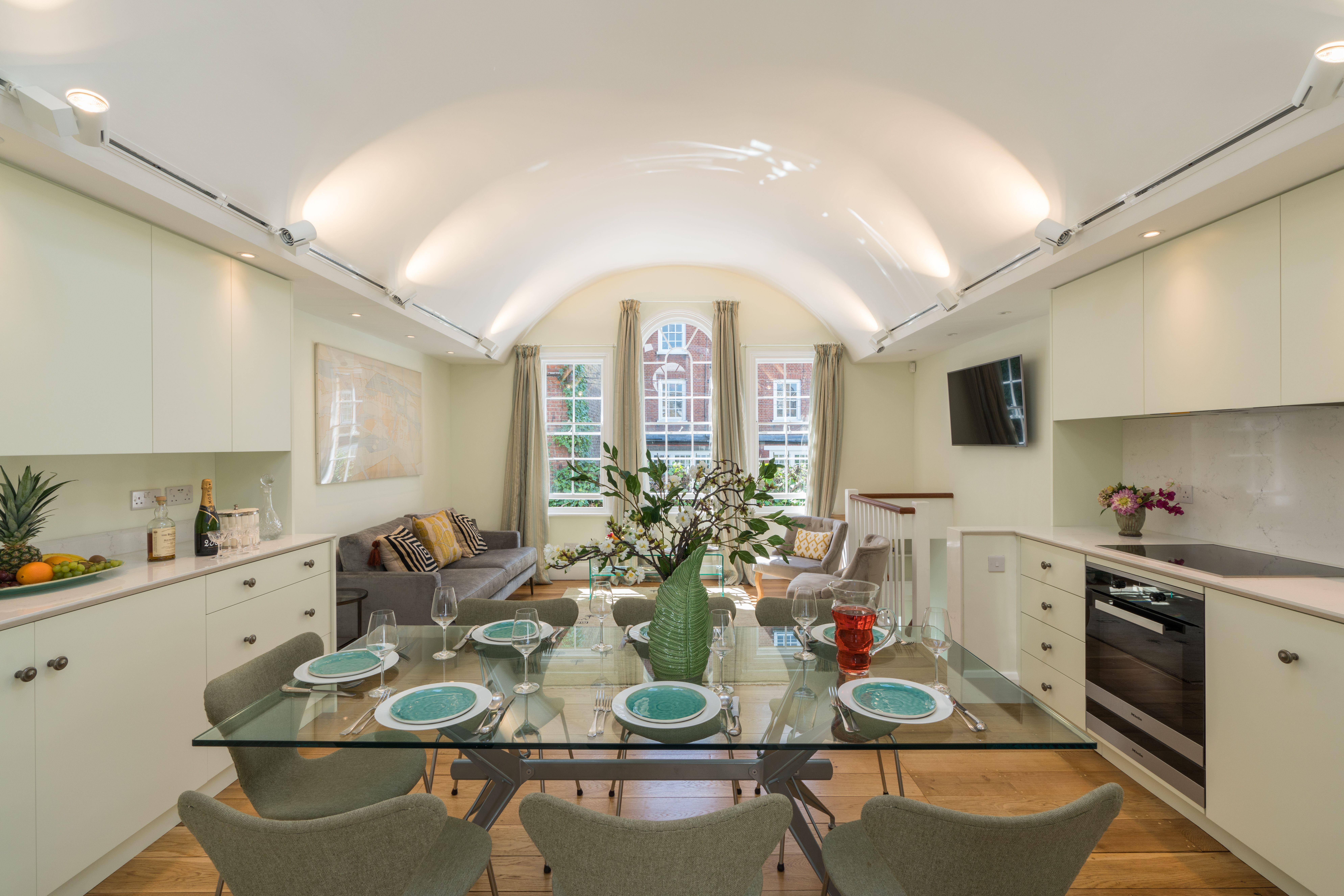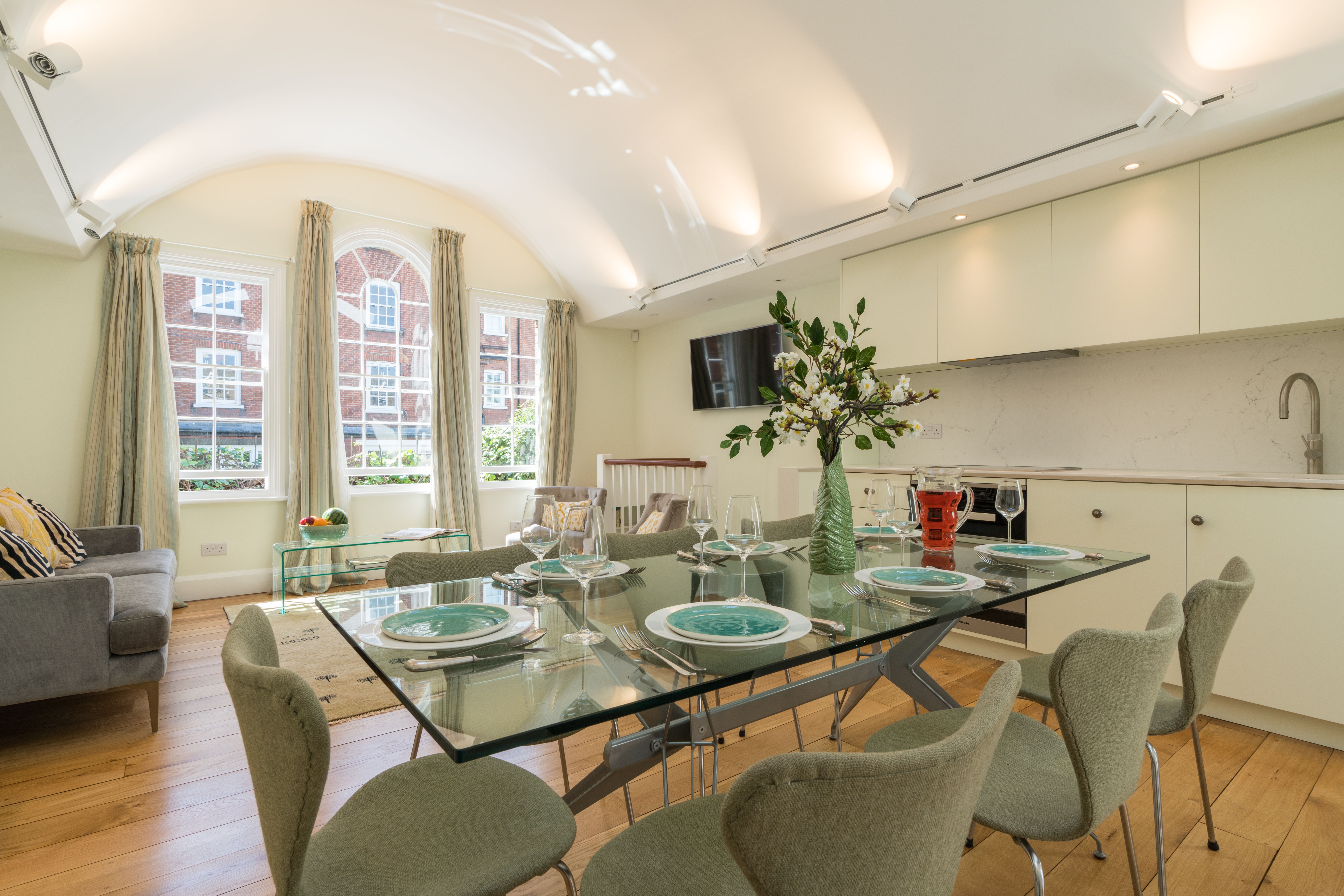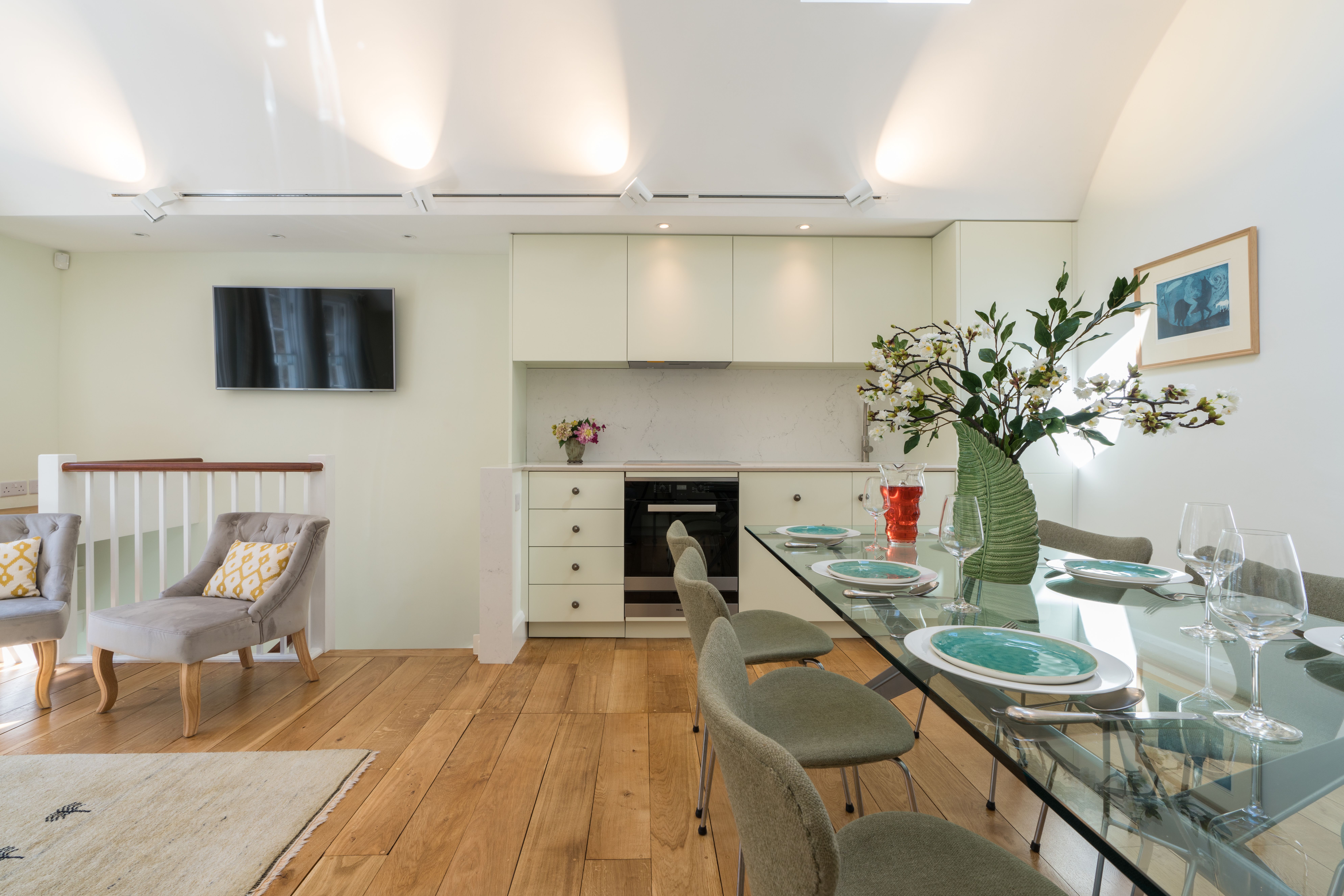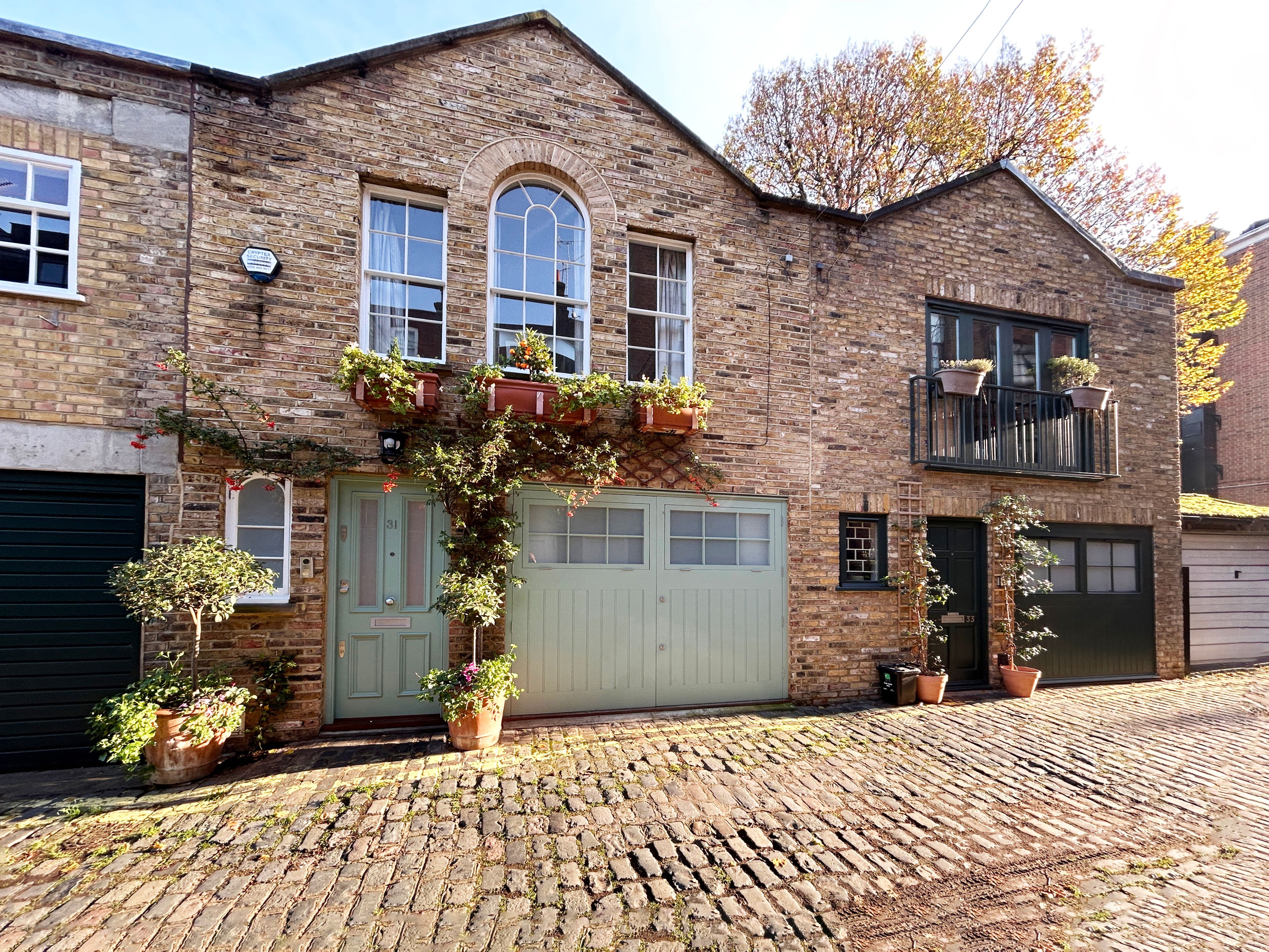 You'll find this home in a quiet residential mews on the border of Notting Hill and Bayswater. It’s wonderfully located in a peaceful spot close to the designer shops of Westbourne Grove and the Portobello Road antiques market. Kensington Gardens and Hyde Park are just at the end of the road. The house is bright and comfortable, with an open-plan living and dining space with vaulted ceilings and tall windows. Bedroom one opens to a petite patio, and bedroom two has a small desk for those working remotely during their stay.