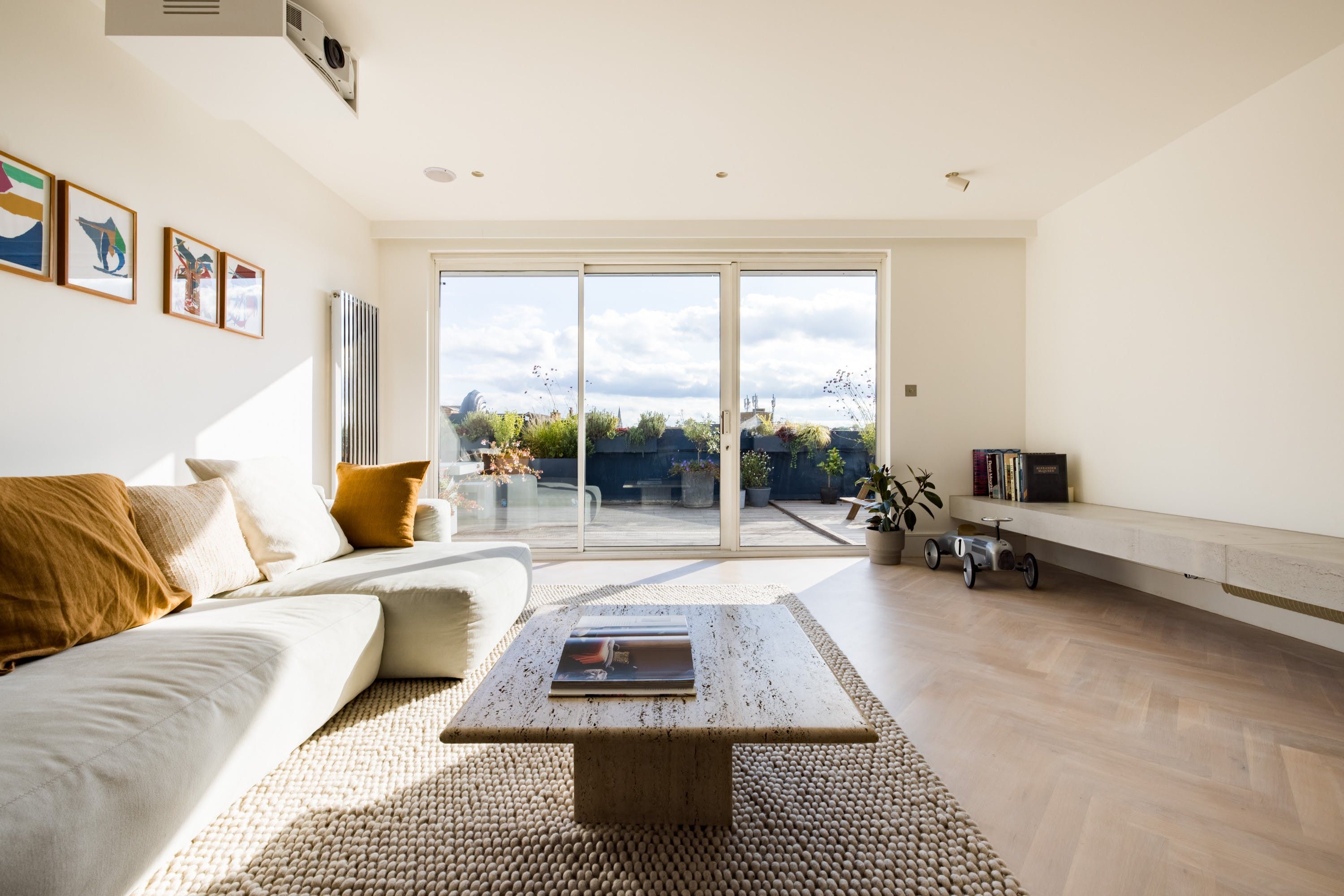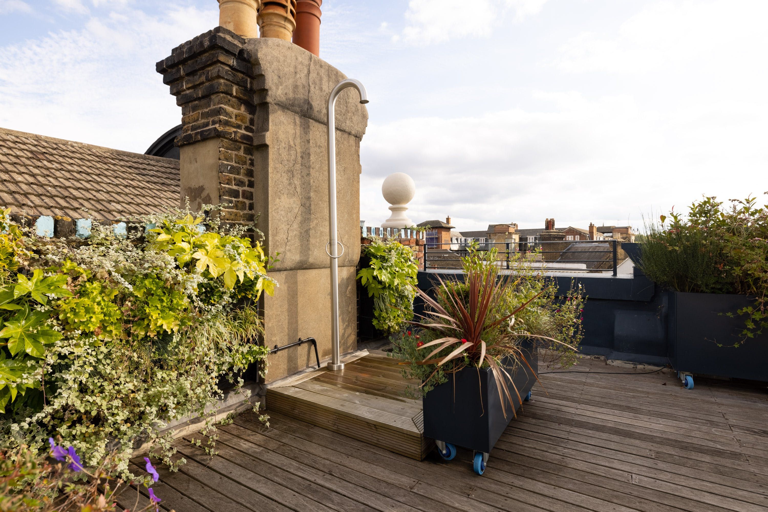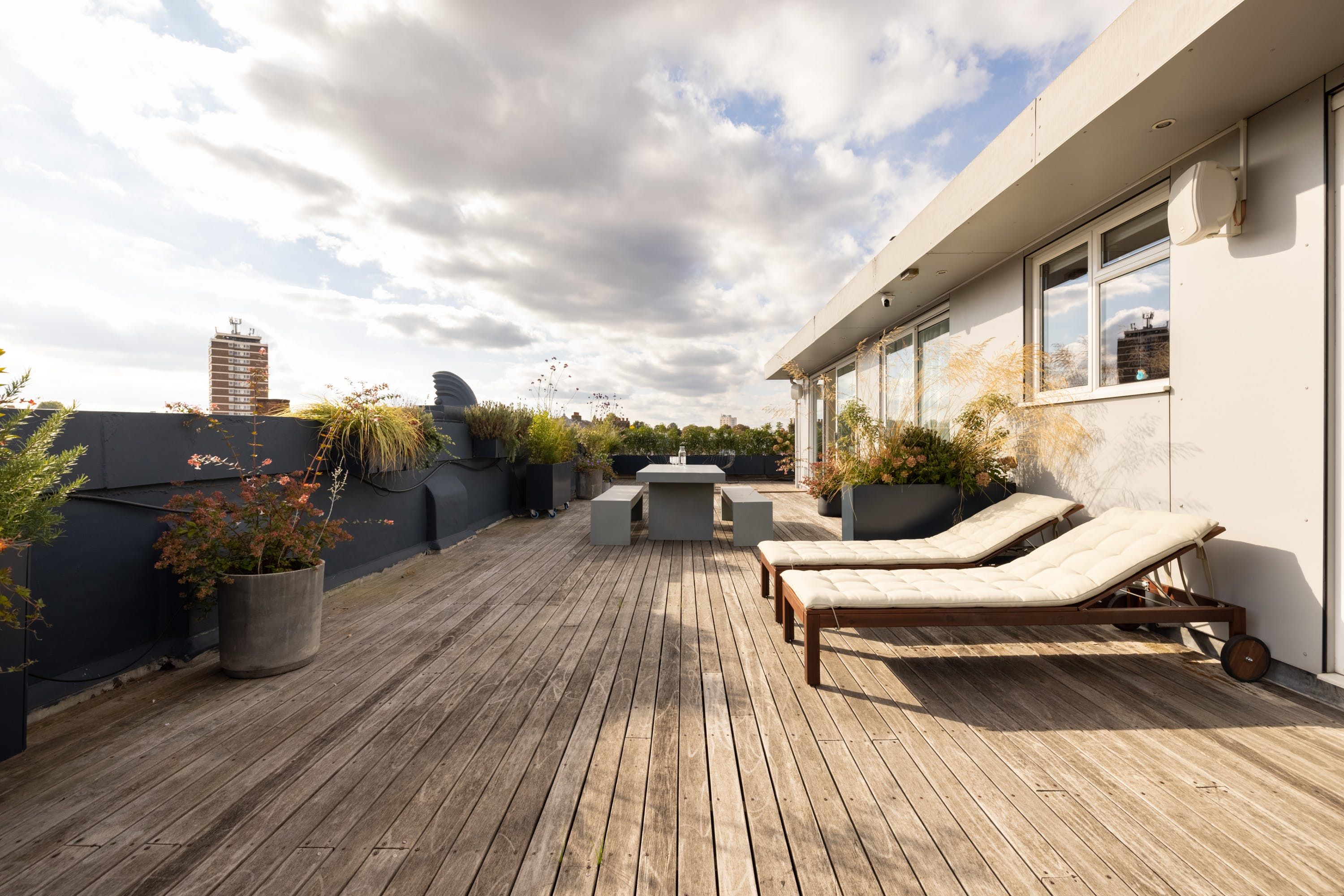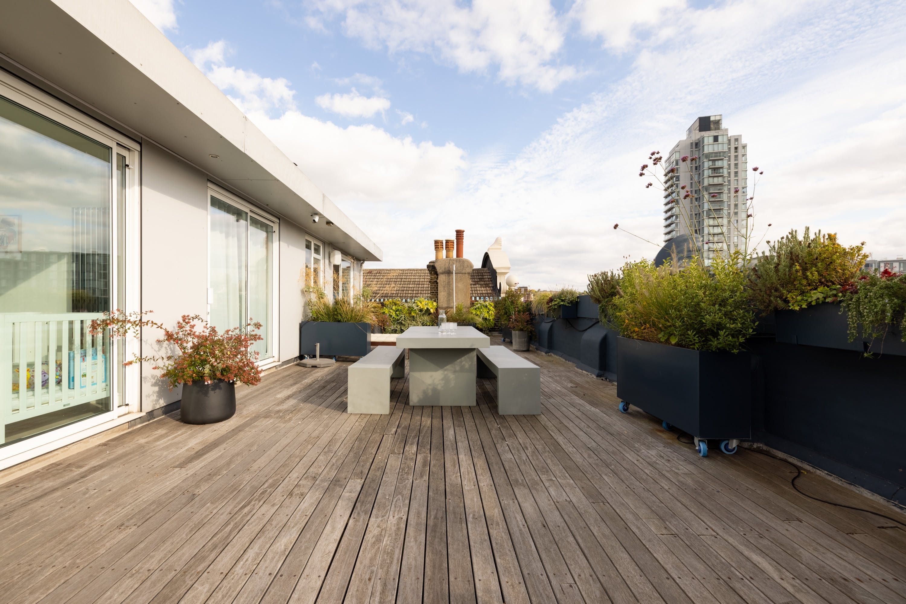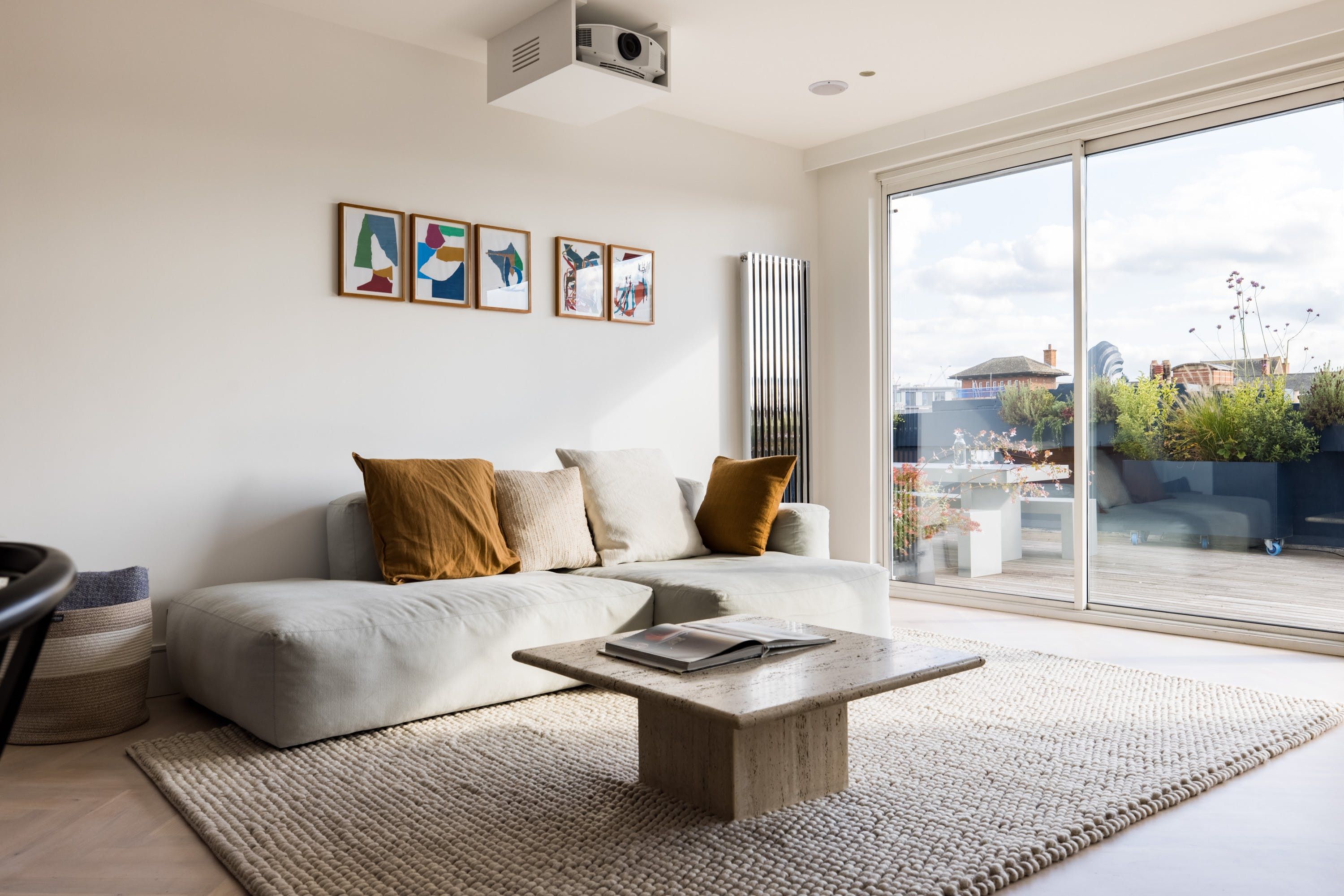 A chic home in a tucked-away London location, this stylish Deptford pad boasts a spacious decked terrace and a modern interior with lots of soothing beige and brown tones. Light pours in through the sliding glass doors that extends the living space out to the beautiful rooftop deck, for added luxury and comfort. Whether you're inside or outside, it's clear that the owners have an eye for design and detail. On chillier evenings, line up the projector overhead, knock up a few light bites in the modern black kitchen and enjoy a cosy movie night snuggled up on the cream sofa. From the pale parquet floors to the sleek nude surfaces, this home is a real cool customer. And while we love the aesthetic here, it's also a homely spot too, with a bedroom set up especially for kids. In fact, for a young family after a city-based bolthole that's near to the big sights, but removed from the intense crowds and clamouring tourists, this trendy apartment is perfectly suited. You're an eight minute train ride from New Cross to London Bridge, fifteen minutes to Shoreditch, and twenty-two minutes to the South Bank, full of hip bars and restaurants along the waterfront, and one stop on the DLR to the Cutty Sark, National Maritime Museum, and Greenwich Park where you can catch a boat into central London.