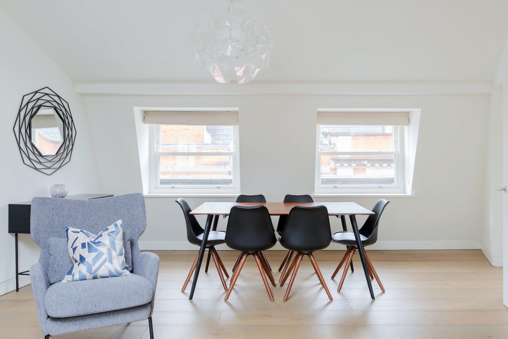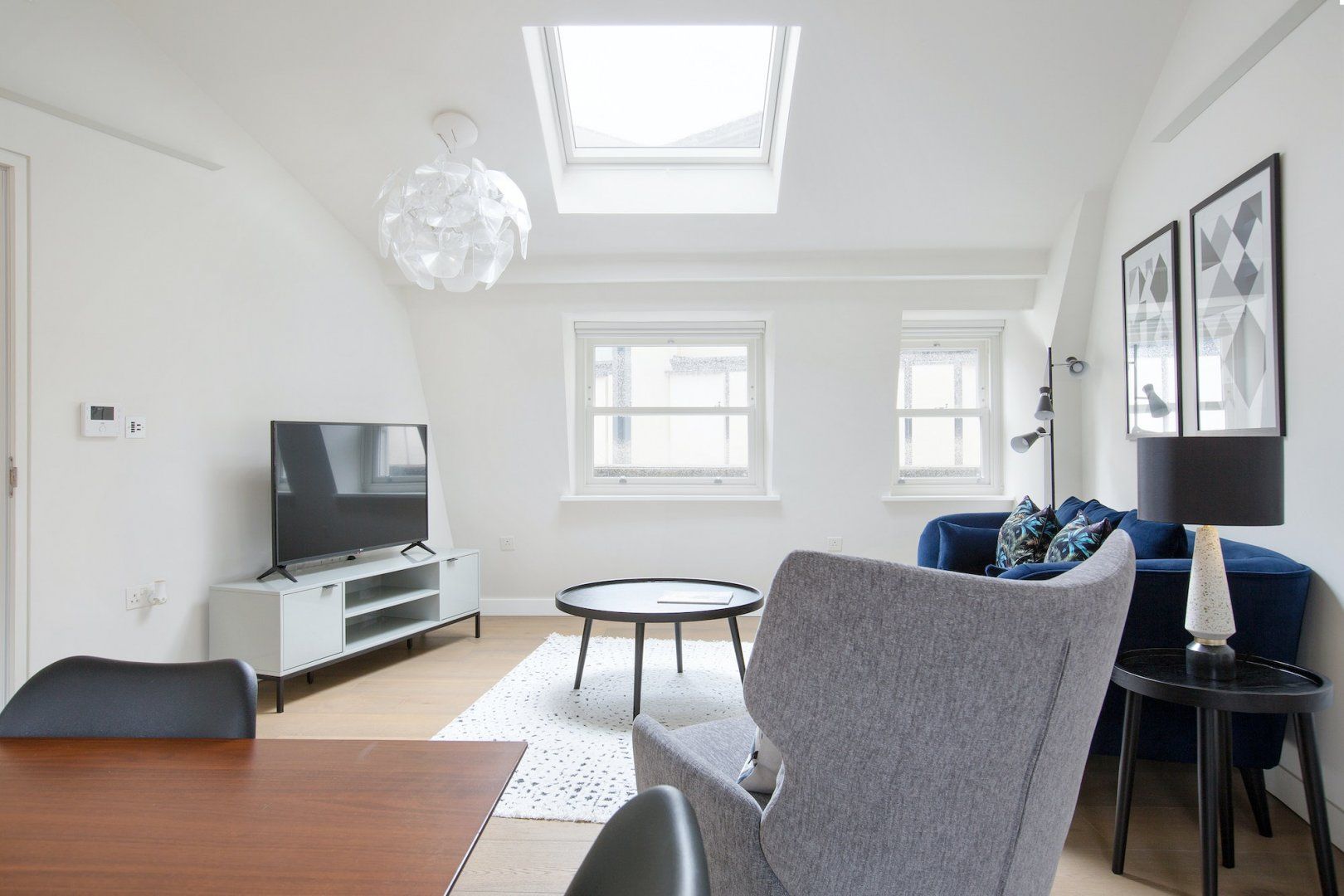 Located in affluent Marylebone Lane, this stylish London pad is perfectly placed for upscale shoppers and business travellers after a hotel-style stay in the thick of the action. Just a quick ten-minute stroll from Oxford Street, a sixteen-minute walk to trendy Soho and near to Selfridges and Bond Street, you're surrounded by boutiques, restaurants and cocktail bars. Back home, the design of this swanky digs is a minimalistic dream, full of sleek furnishings and deep blue tones. Sink into the plush velvet sofa with a fashion magazine or show off your new purchases under the skylight overhead. Come together for convivial meals in the Scandi styled dining area with Eames-inspired chairs – the modern kitchen will make cooking a delight too. Although, we think you'll spend most of your time eating out with central London's excellent international cuisine right on your doorstep.
