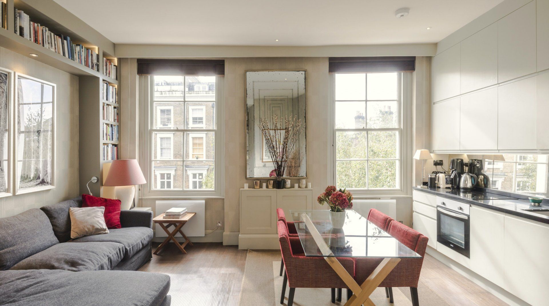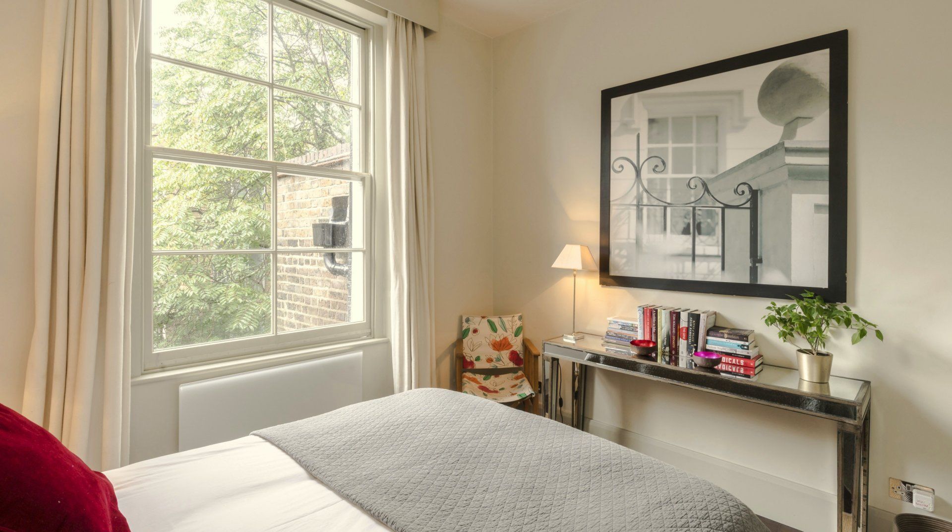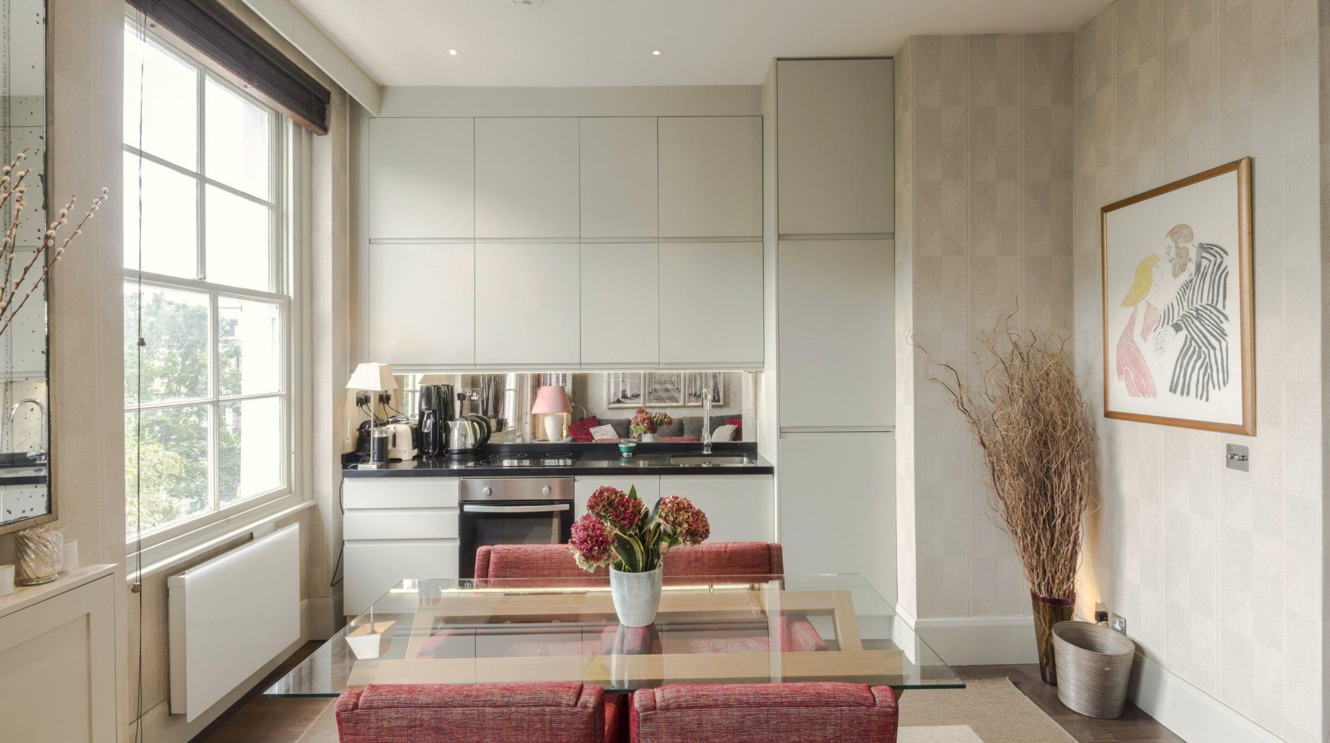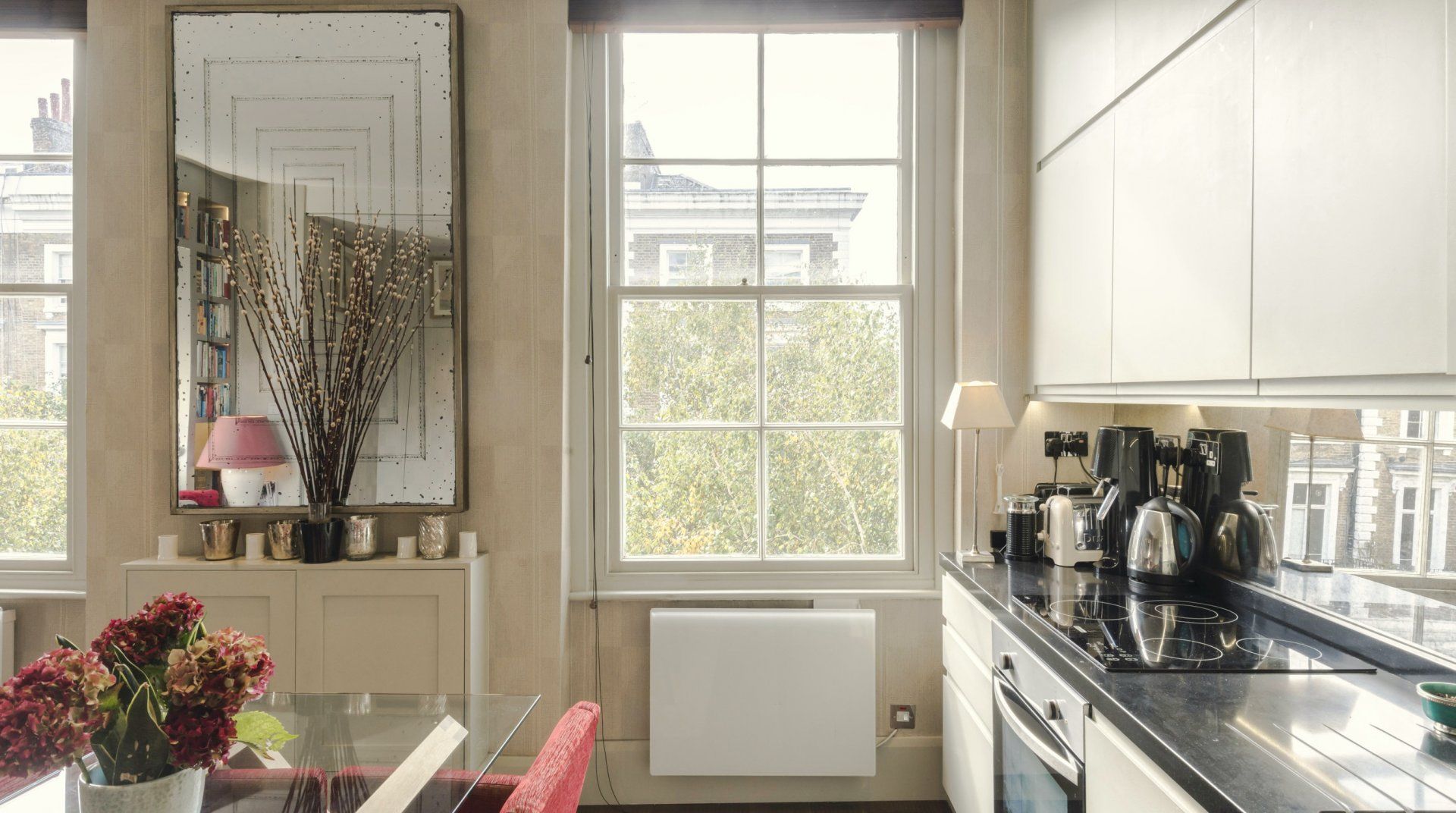 Immersed in the Notting Hill vibe, this apartment is within minutes of Portobello Market and the brunch paradise along Westbourne Grove. The facade is typical of West London on a tree-lined street, and inside it’s a romantic retreat perfect for a couple or solo traveller. Book-filled shelves surround the sofa in the living room, where the sash windows throw beams of sunlight across this cosy reading nook. The home has been decorated to perfection, with magenta and rose-red, velvety accents against a deep grey backdrop in the bedroom. The kitchen is compact, and comes stocked with basic groceries, but since the restaurants, brunch spots and cafés of Notting Hill are mere footsteps away you may not need to fire up the cooker. Though the fresh produce markets might tempt you into cooking.