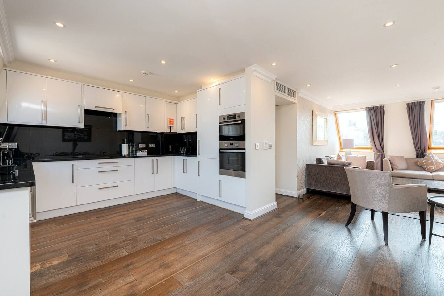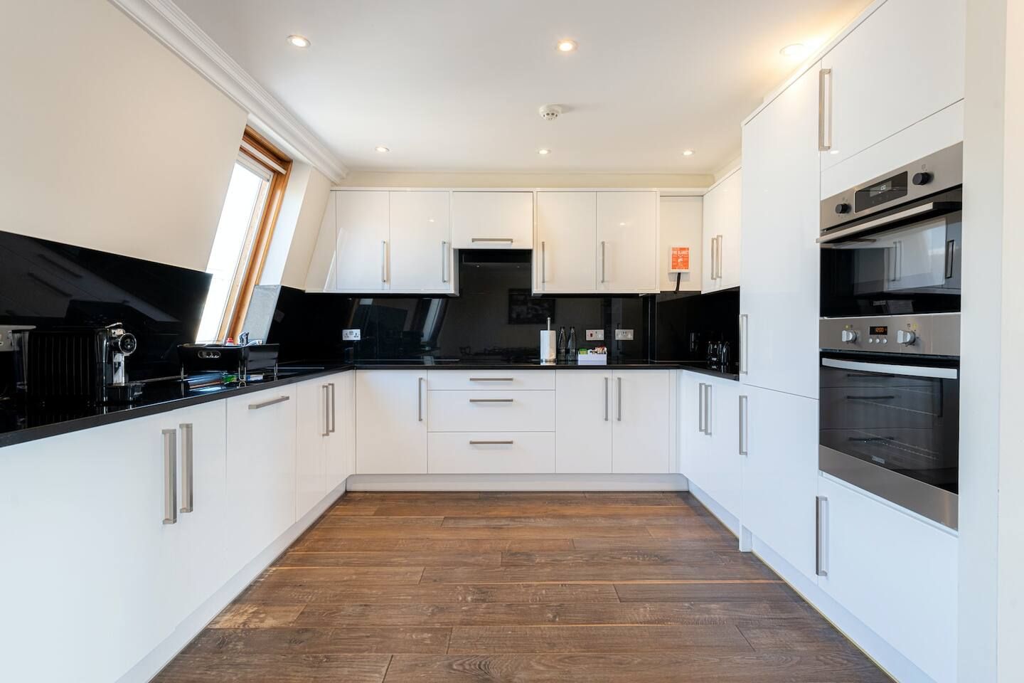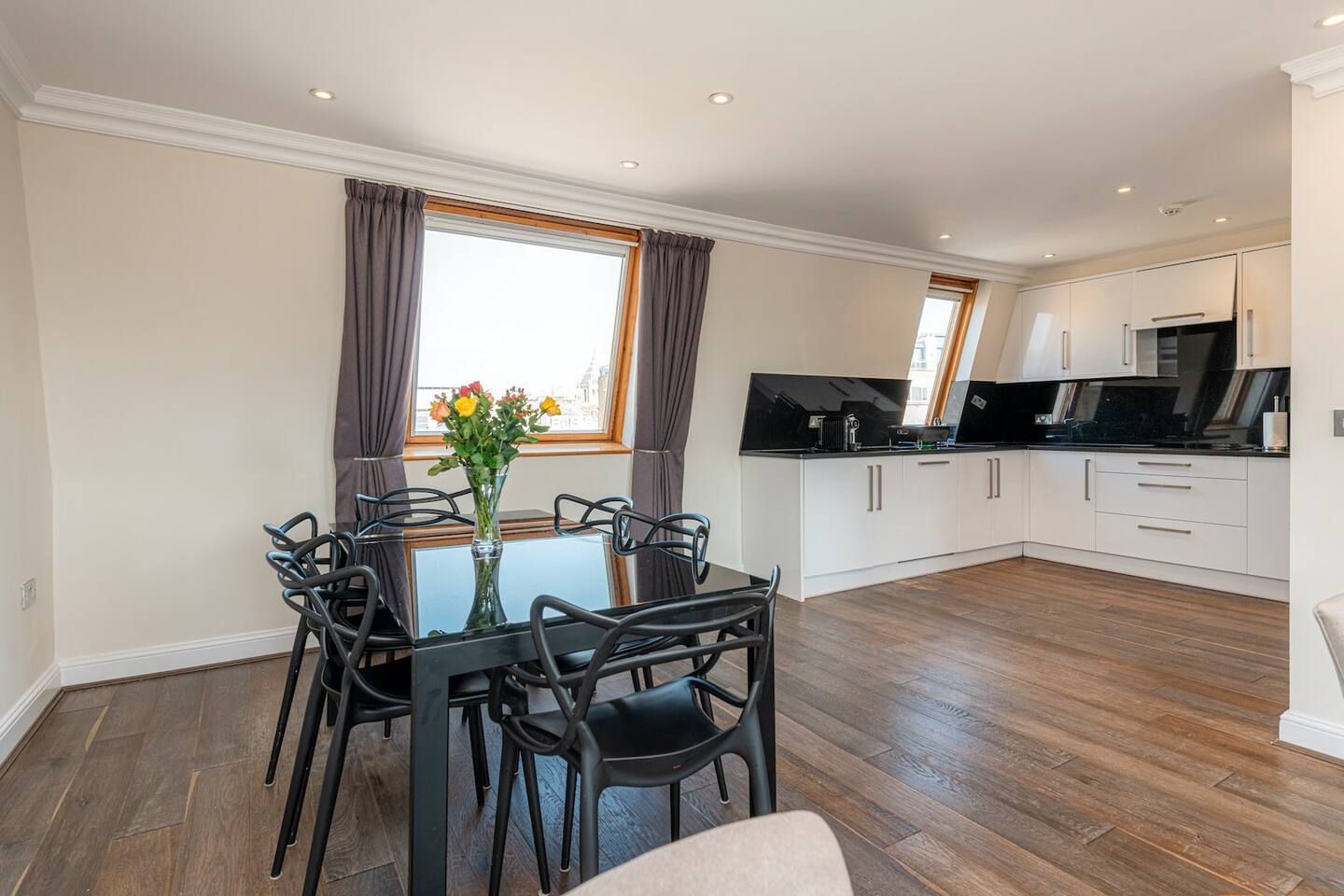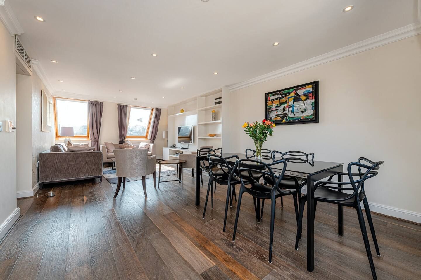 Nestled on a quiet street in South Kensington, this penthouse apartment, housed in a stunning neo-classical style London townhouse, has a fantastic location. It's around a ten-minute stroll from London's world-famous trio of museums – the Natural History Museum, the Victoria and Albert and the Science Museum. Or, if you fancy some green space, then beautiful Kensington Gardens are a fifteen-minute saunter. Back at this luxurious home, there’s a private lift to whisk you to the top floor. Once there, relax in the bright and classy living space with its elegant furnishings or enjoy a meal at the stylish dining table. The concierge here can arrange for a private chef to create a truly memorable feast for you and your guests if you prefer. Afterwards, take in the views over the rooftops of South Kensington, or unwind in the bath with a glass of Champagne.