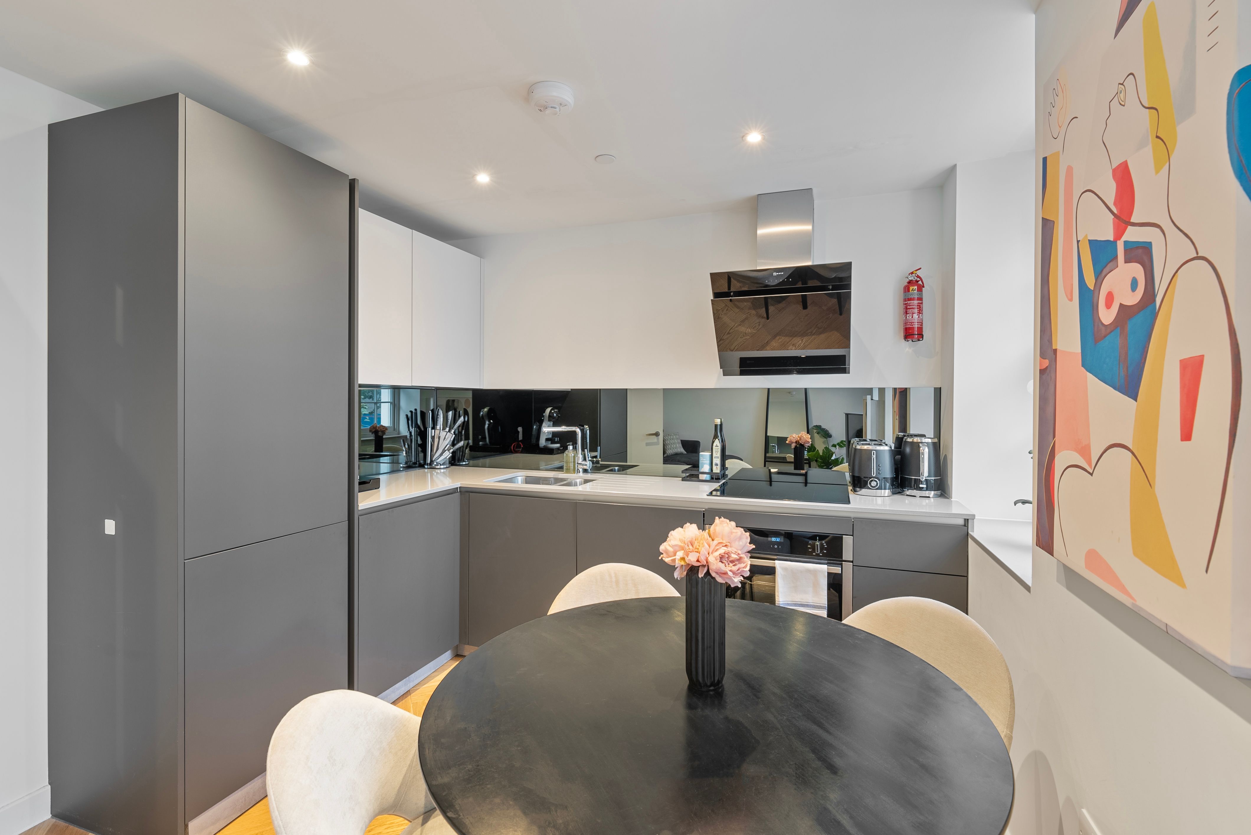 Comfort and convenience await at this modern apartment in Fitzrovia. With Tube stations nearby, eateries on your doorstep, and Oxford Street and Soho within walking distance, the location is perfect for shopping, sightseeing, and everything in between. Back home, a desk in the living area makes remote working a breeze. Also included are a sleek kitchen, a comfortable double bedroom, and a sofa bed in the living room for extra sleeping space. Just note it's on the second floor and lacks a lift.