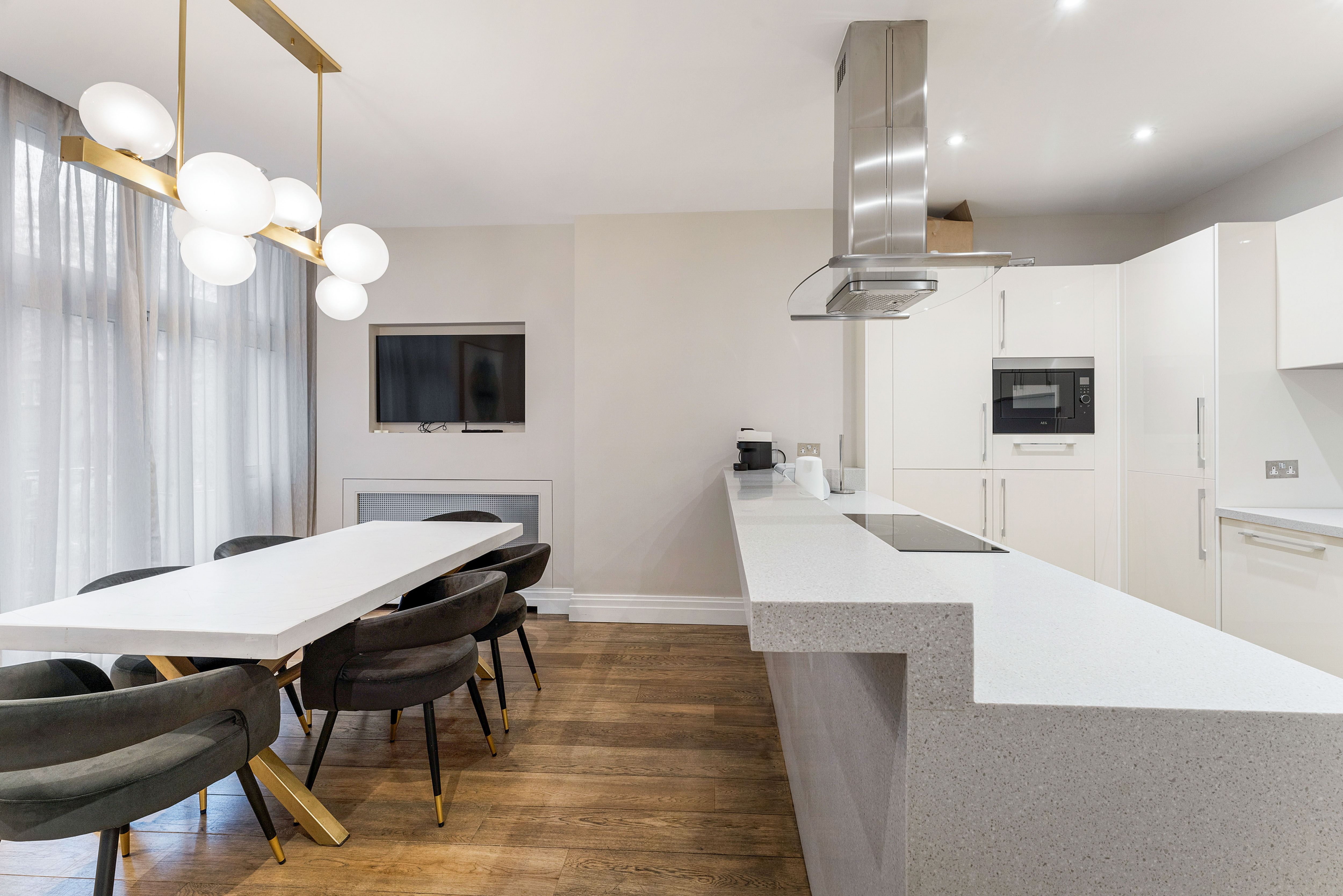 Just around the corner from Hyde Park and Oxford Street, this modern apartment is the perfect London hideaway. You're spoilt with the living spaces here – there's more than enough room for dinner parties at home, if you don't fancy an evening at a refined Mayfair restaurant, and the lounge beckons for drinks and games. Considering the proximity to high-end fashion boutiques, the walk-in wardrobe is ideal, and an evening soak in the bathtub will be far too tempting.