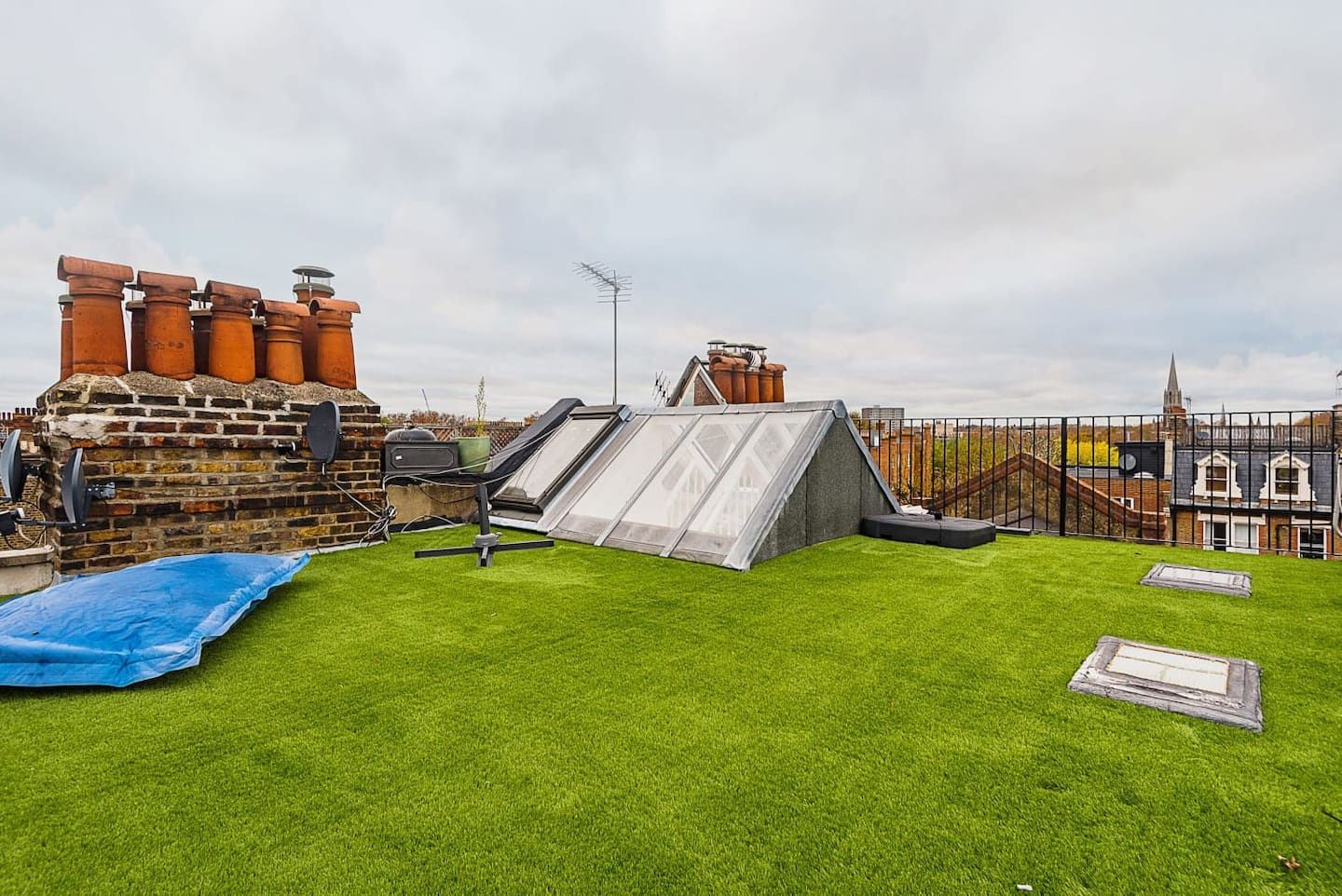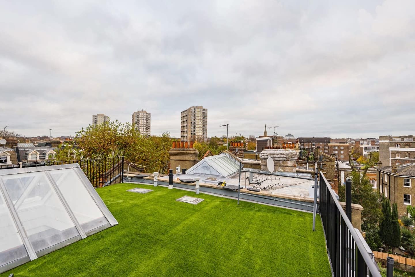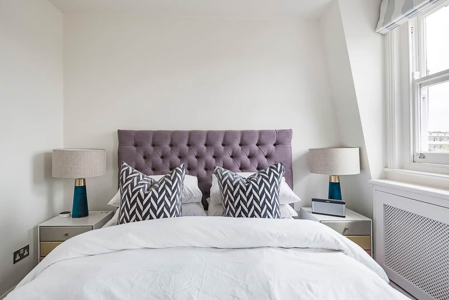 Maida Vale’s affluent and sophisticated vibe makes it the perfect neighbourhood for a classy stay in West London. With parks and leafy, tree-lined streets as well as plenty of restaurants and cafés, you can enjoy a bit of nature and also the spoils of the city. Less than a one-minute walk from Maida Value tube station, this superbly modern loft apartment sets the tone for urban escapism. With high, sloped ceilings, white walls, and grey wooden floors, the living and dining space looks like a minimalist dream. But the host’s striking collection of art, trinkets, and a funky colour palette bring the home to life. We love the green, mid-century velvet armchairs by the huge windows. And the bright, patterned rug which brings the corner sofa into its own distinct, cosy space in this vast room. Even with these fabulous interiors, you’re going to want to head to the outdoor space – an entire roof terrace with views over West London. Spot the iconic red roofs and chimneys as you relax on the oversized bean bag, sipping gin and tonics until the sun goes down.