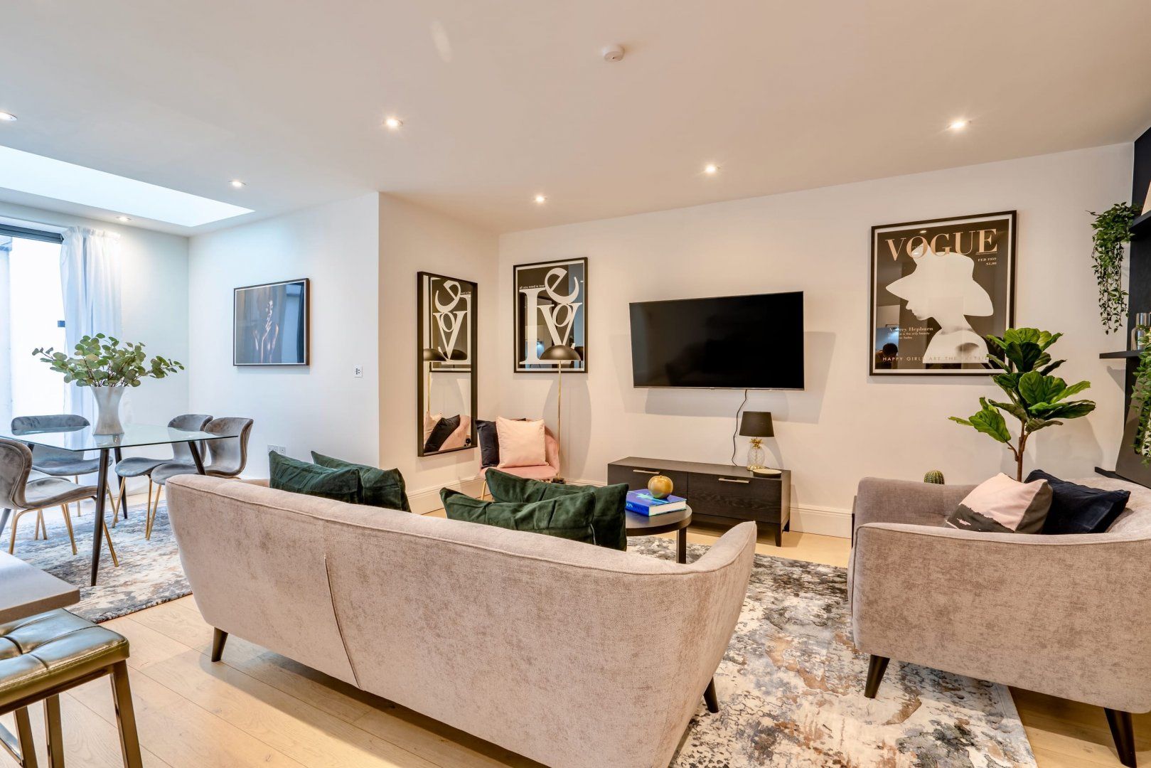Housed in a striking period building overlooking the historic Lincoln’s Inn fields square, this home is steeped in a rich history, although you wouldn't know it from the fresh interiors and chic design. It's a modern apartment with all the luxury mod-cons needed for a comfortable stay – there's plenty of space for groups of four adults with spacious bedrooms, two swanky en-suite bathrooms and an additional guest bathroom. We fell head over heels for the stylish living space with its plush sofas, fashion prints and timeless colour scheme. Located just off Chancery Lane and less than a five-minute walk from Holborn tube station, you are right in the thick of things here. Come evening, fix up a round of drinks in the sociable island kitchen to enjoy out on your private patio area, fitted with garden furniture and billowing plants, pre-dinner drinks go down a treat here. When you're feeling peckish, head to Covent Garden for a delicious gourmet meal at one of the many dazzling international restaurants, less than a twelve-minute walk from home.