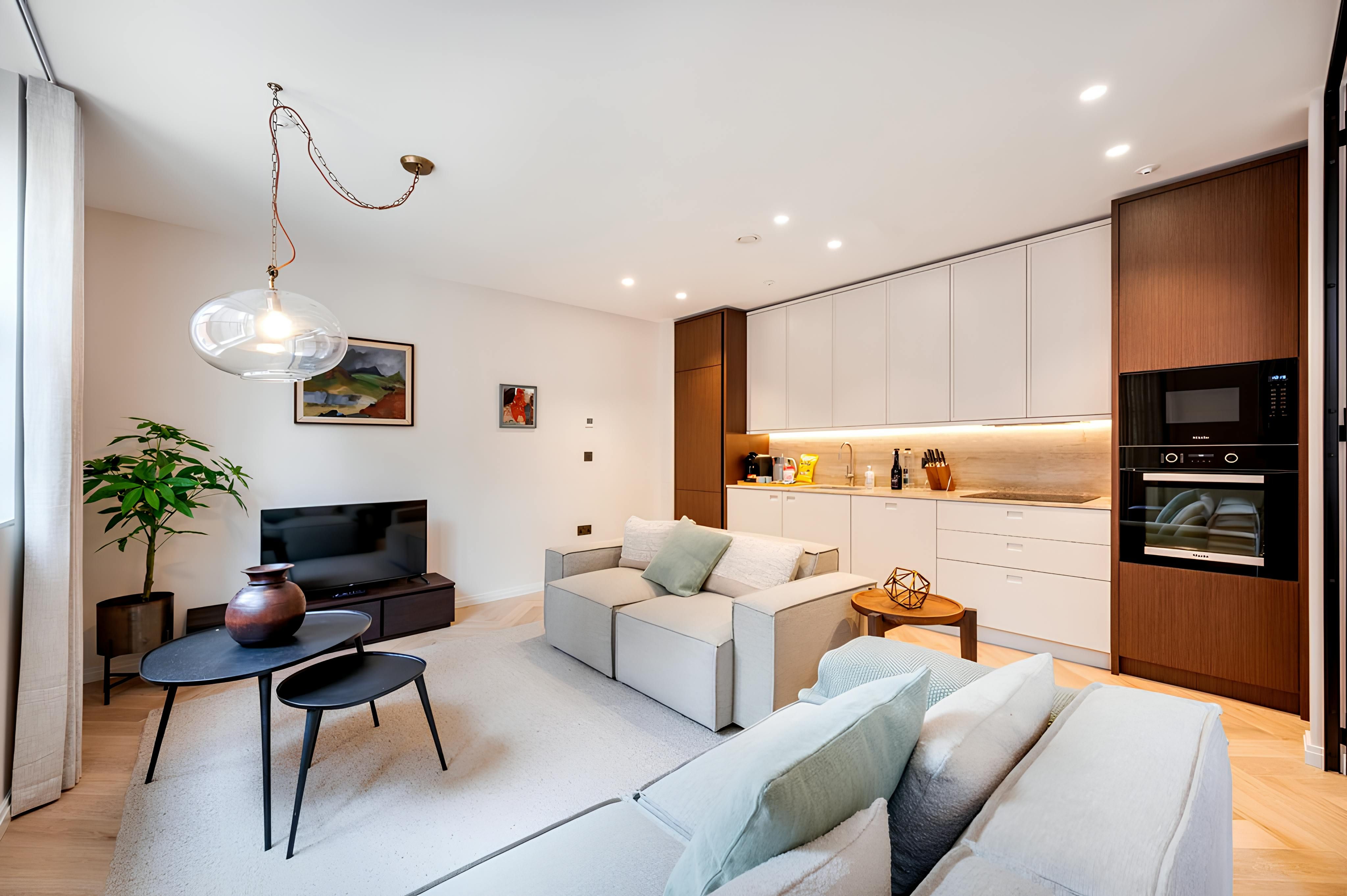 Just a five-minute walk from Covent Garden and close to Holborn, this duplex apartment boasts an enviably central location. The British Museum is a ten-minute walk away, and you can reach the Royal Opera House in seven minutes. Suitable for long-term stays, this apartment is a charming home-from-home. The open-plan living, dining, and kitchen space is bright and welcoming, with a contemporary minimalist style. Factor in air-conditioning and underfloor heating, and it's no surprise that this is a comfortable base in central London.