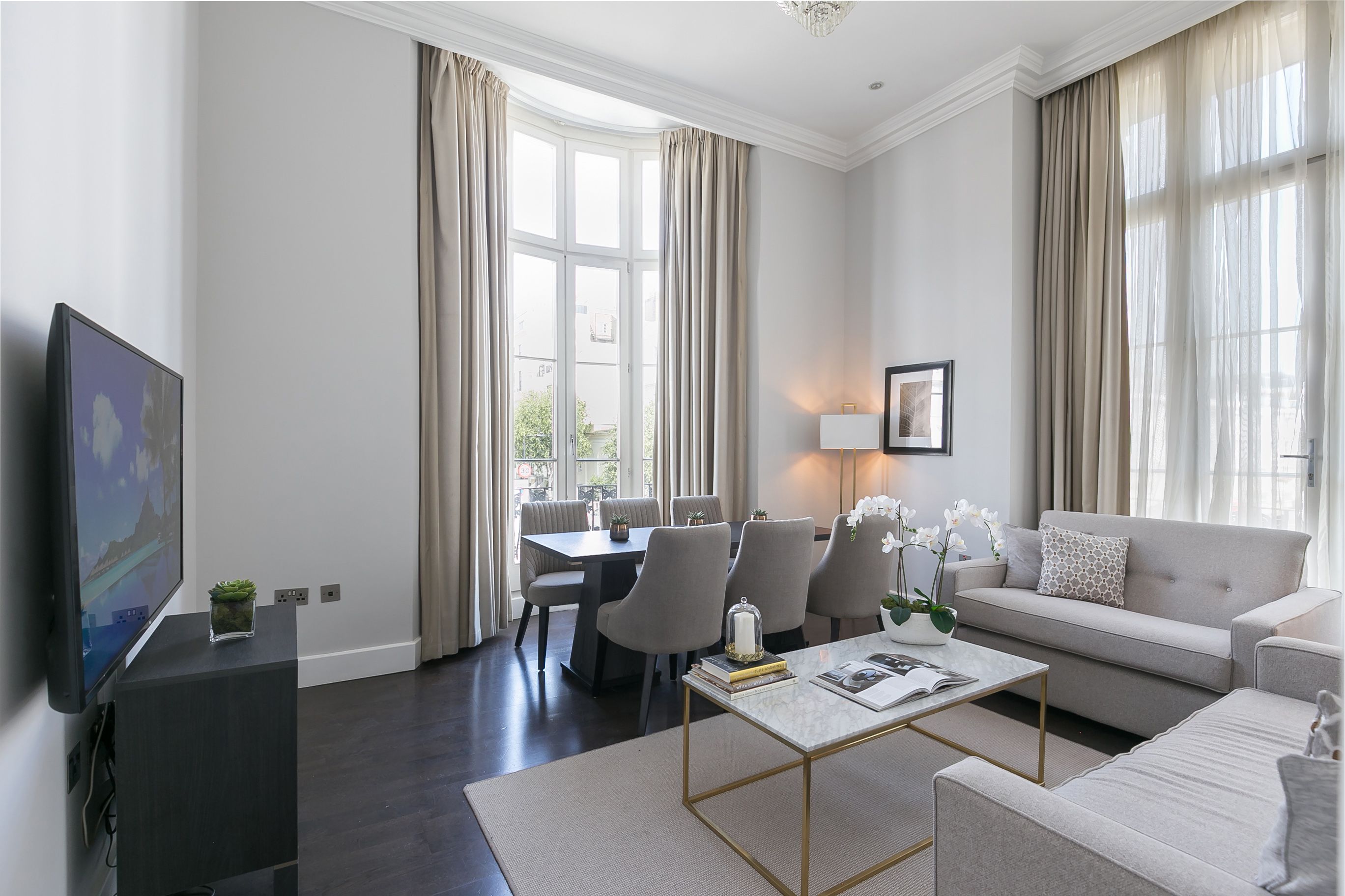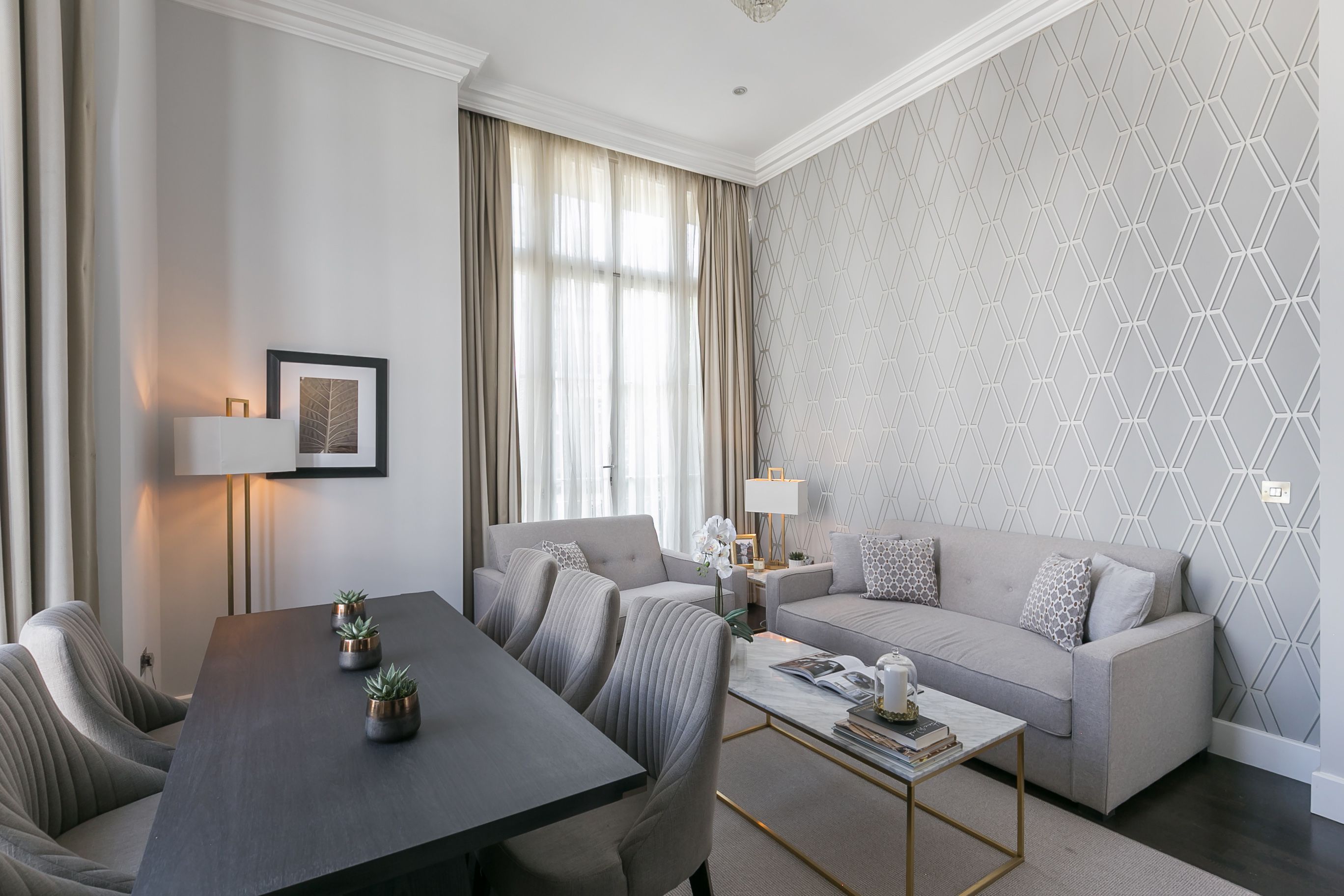 This luxury, serviced home, housed in a stucco Grade II listed building, is in a fantastic location. Hyde Park is just over a ten-minute stroll, while the peaceful canals of Little Venice and the chic boutiques of Westbourne Grove are both just over a fifteen-minute walk away. It's just a six-minute saunter from Paddington Station too, so it's straightforward to explore the rest of London from here. Back at this freshly decorated apartment – we love the stylish and calming neutral hues enlivened by geometric patterned furnishings. The generous living space is perfect for a family or friends to entertain. If you fancy some fresh air, head out to the balcony with its views over the neighbourhood. Or, fling open the French doors of the bedroom and take a breather after all that sightseeing.
