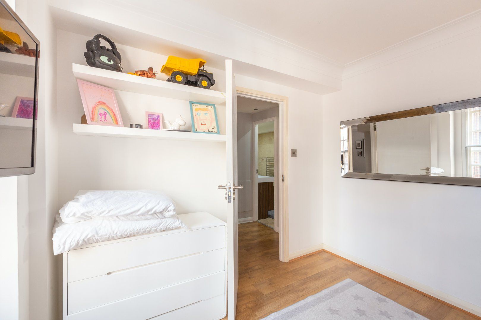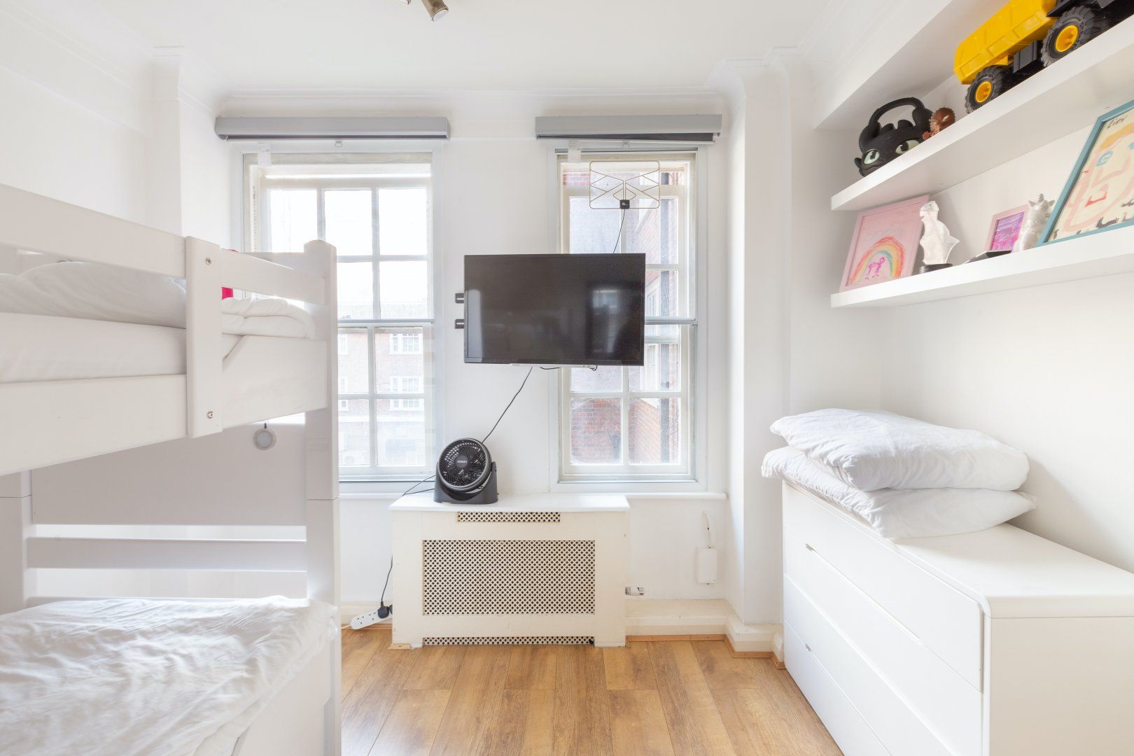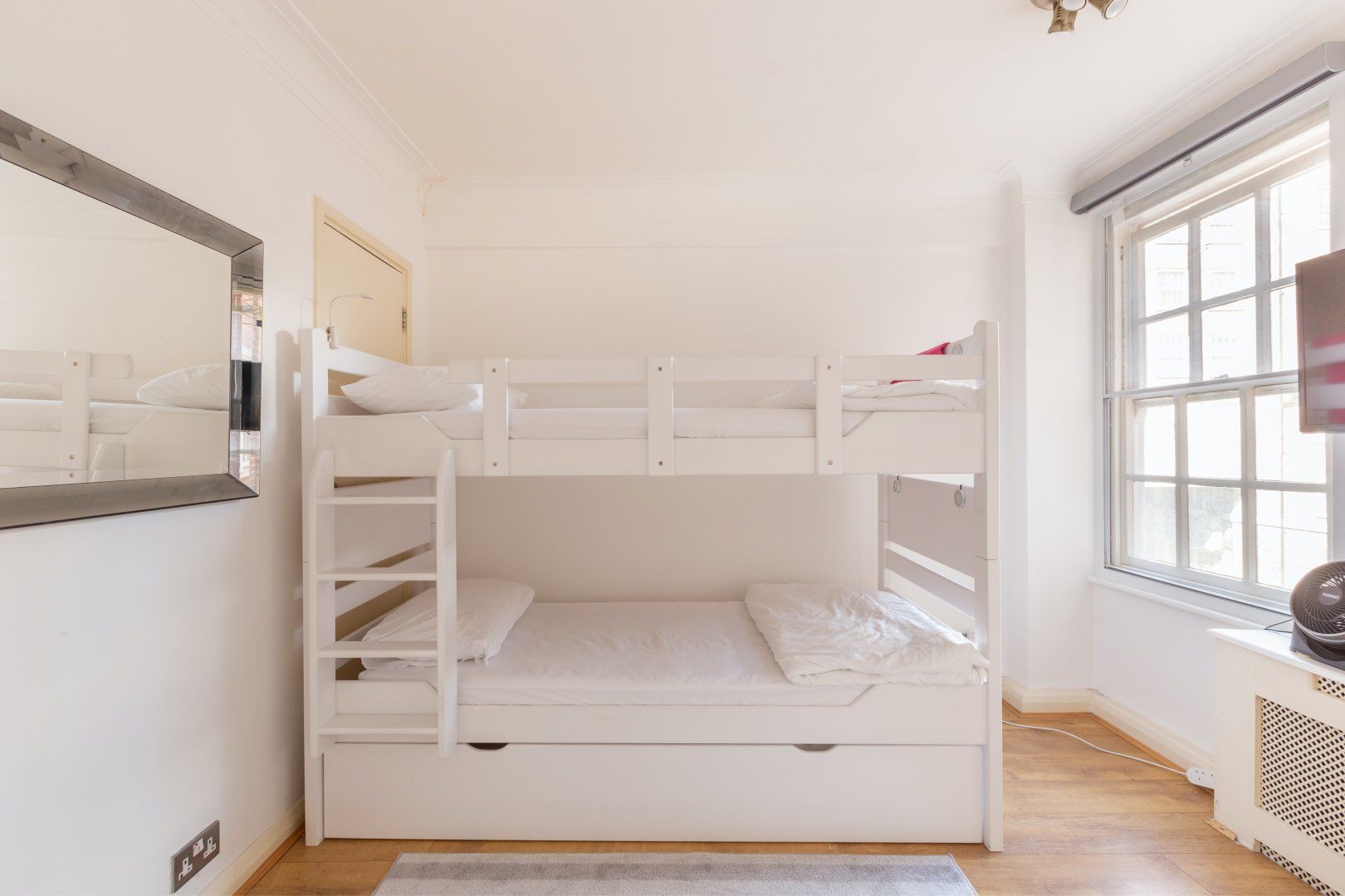 The main bedroom is pared-back yet elegant with its comfortable bed and equally large windows (there’s a desk space here too should you need to catch up on work), while the second bedroom is a sweet space with its pretty white bunk bed that’s sure to delight any child.