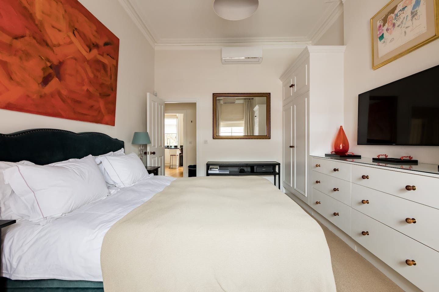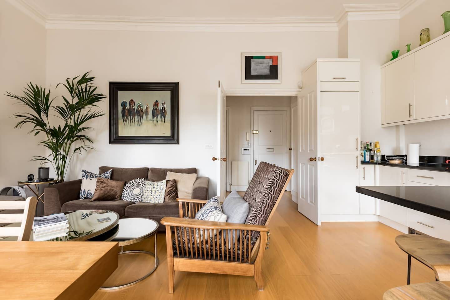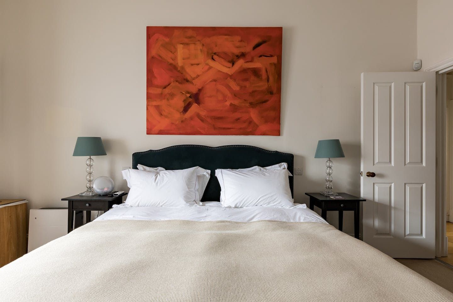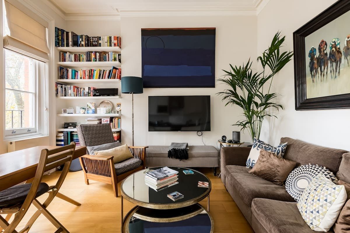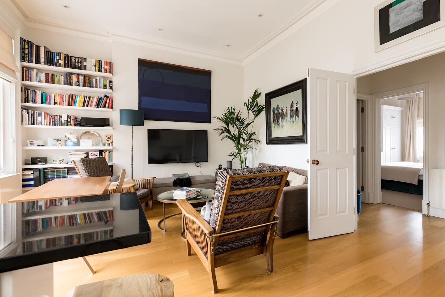 Locations don't get much better than this. Just a seven-minute walk from bustling King's Road, this flat is in the heart of upscale Kensington and Chelsea. Spend your days dining at the gourmet eateries nearby, browsing the museums in South Kensington (fifteen minutes on foot) and strolling through Hyde Park (a twenty-five-minute walk). It's the perfect spot to indulge in a bit of sightseeing, excellent shopping and luxury living – and with access to a private communal garden, you'll be doing quite a lot of the latter. We adore everything about this apartment, which is set in a traditional red-brick townhouse brimming with character. A bright living space is filled with books, cosy seating and beautiful artwork, while the kitchen has everything you need to whip up delicious homecooked meals. As an added bonus, a private balcony overlooks the communal gardens. In the evenings, sit out there with a glass of wine as the sun slowly sets, then come inside and snuggle up either on the sofa or in the bed for a Netflix movie night.