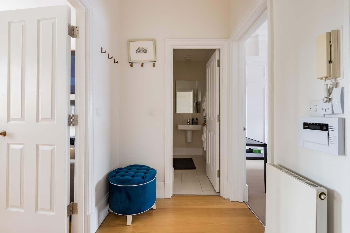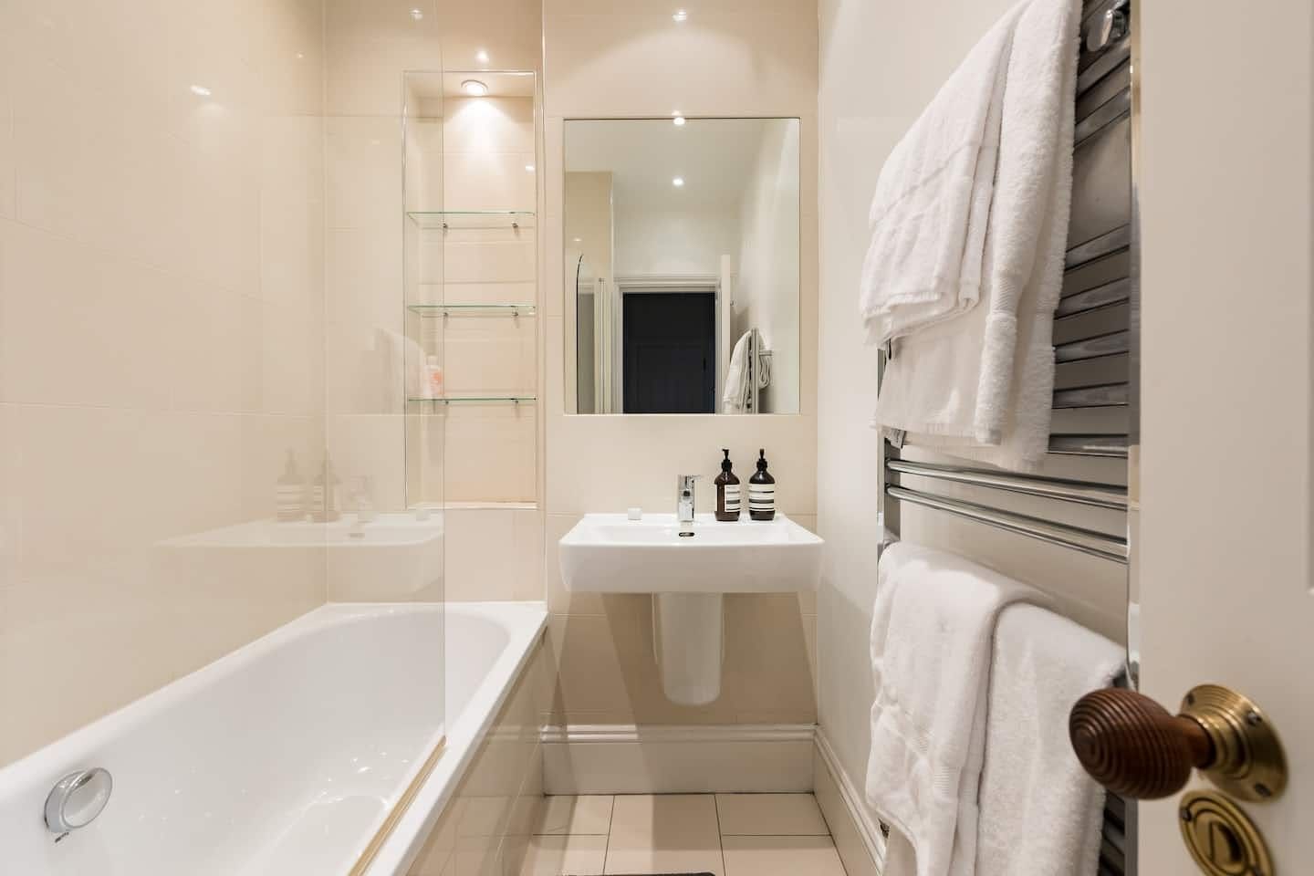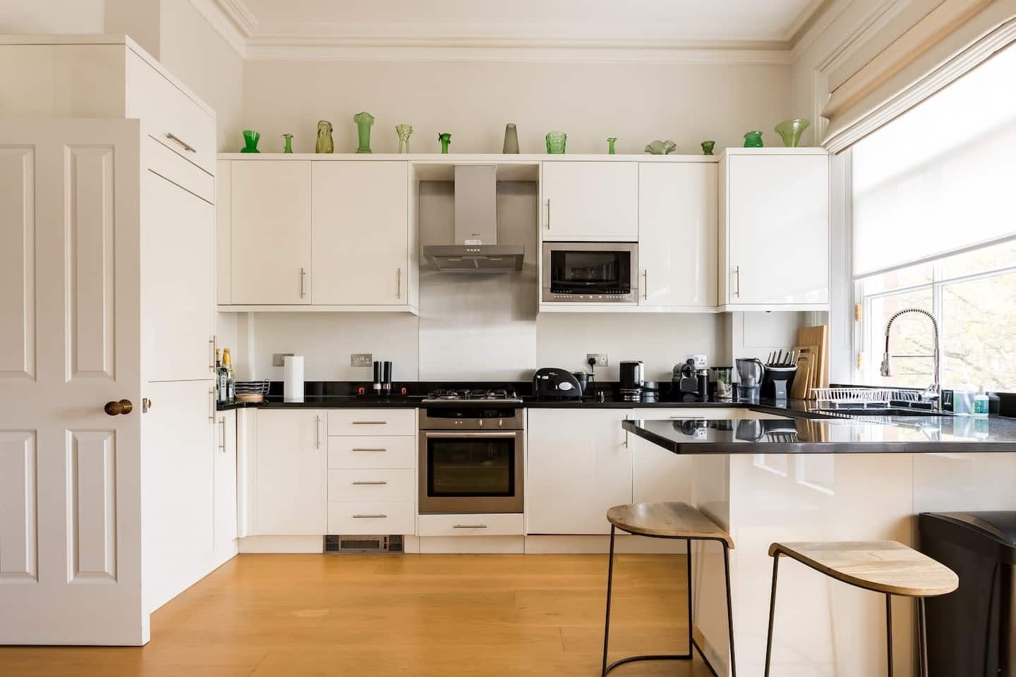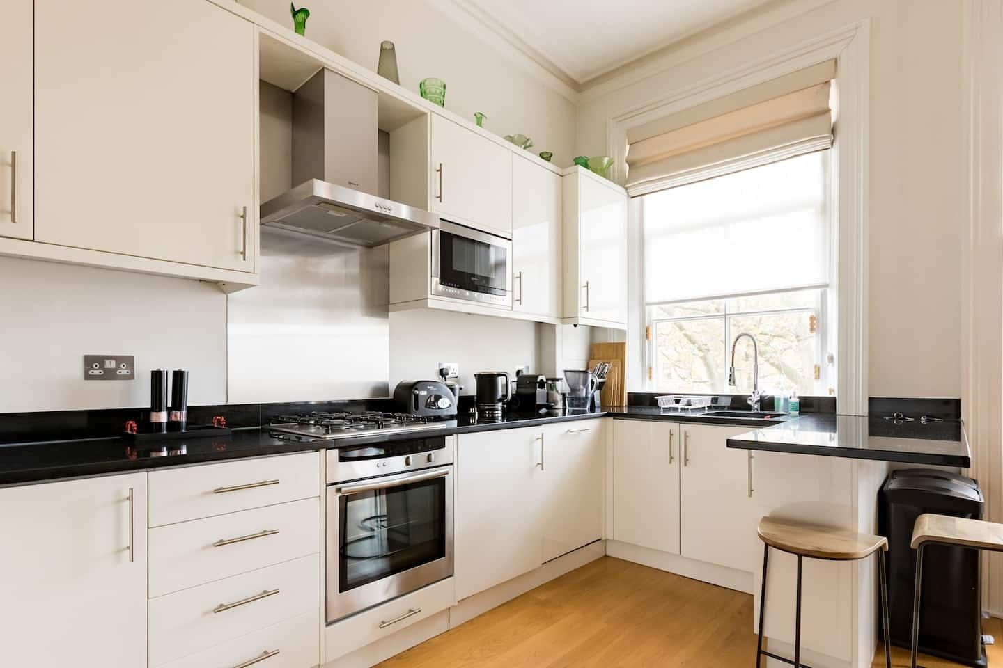Locations don't get much better than this. Just a seven-minute walk from bustling King's Road, this flat is in the heart of upscale Kensington and Chelsea. Spend your days dining at the gourmet eateries nearby, browsing the museums in South Kensington (fifteen minutes on foot) and strolling through Hyde Park (a twenty-five-minute walk). It's the perfect spot to indulge in a bit of sightseeing, excellent shopping and luxury living – and with access to a private communal garden, you'll be doing quite a lot of the latter. We adore everything about this apartment, which is set in a traditional red-brick townhouse brimming with character. A bright living space is filled with books, cosy seating and beautiful artwork, while the kitchen has everything you need to whip up delicious homecooked meals. As an added bonus, a private balcony overlooks the communal gardens. In the evenings, sit out there with a glass of wine as the sun slowly sets, then come inside and snuggle up either on the sofa or in the bed for a Netflix movie night.