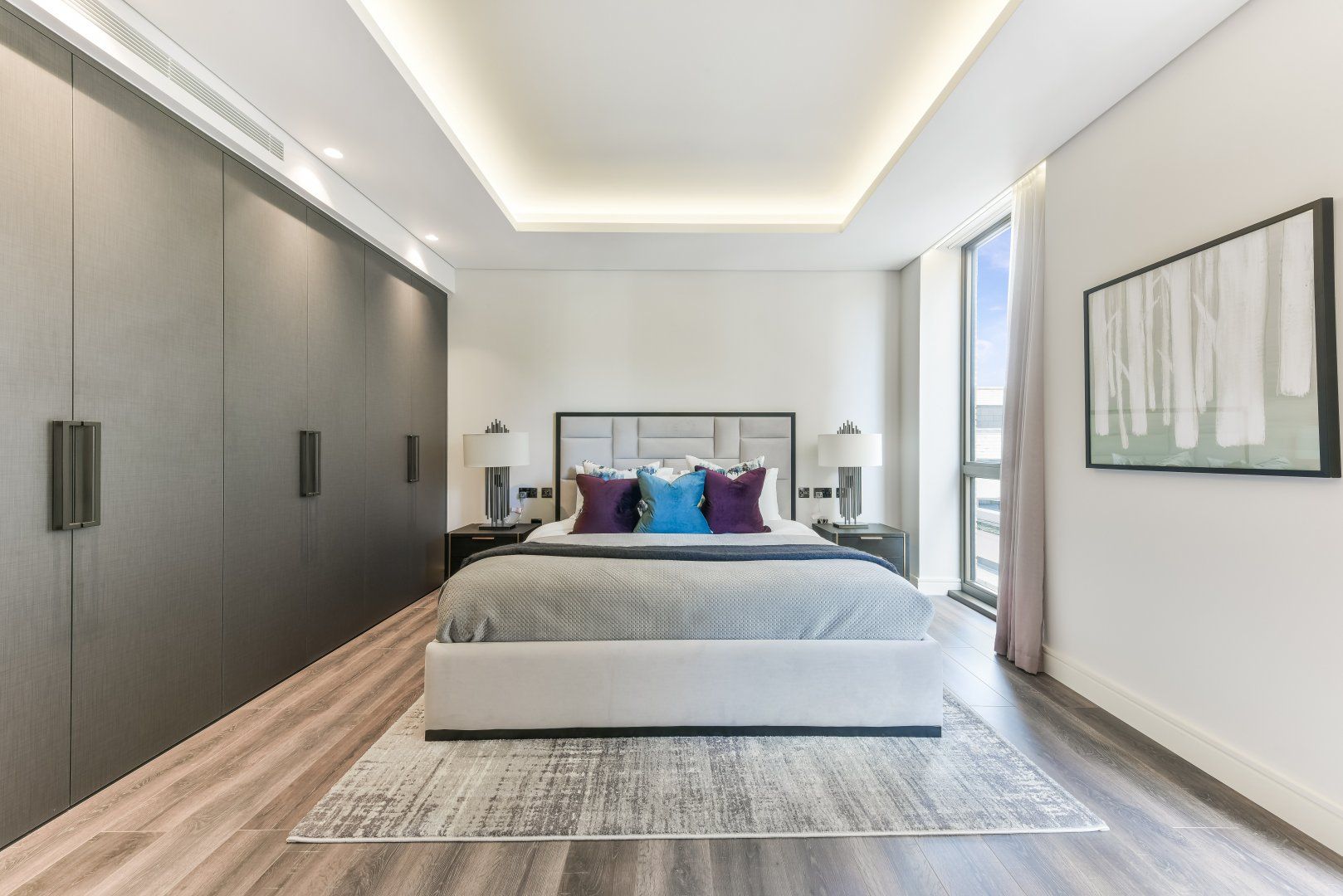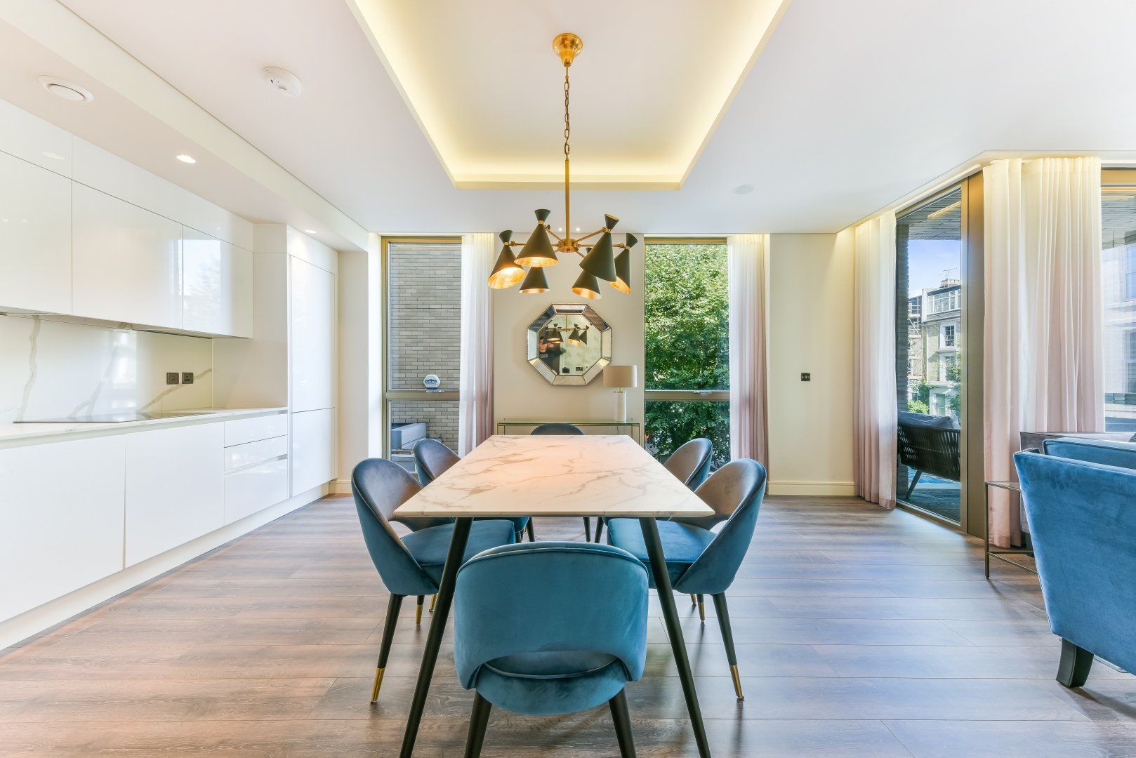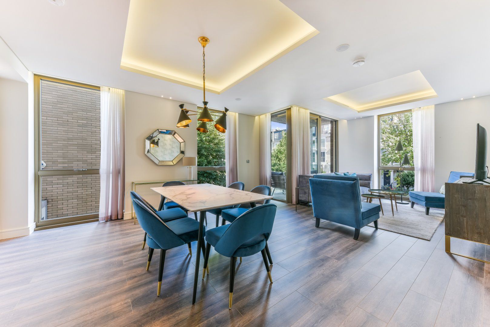 With blue velvet furniture, shiny marble accents and heaps of living space, this West Kensington apartment really is quite something. We love how fresh and inviting this home feels – it's swish, elegant and super bright, thanks to the huge windows that flood each room with natural light. There's also a small balcony off the living area, which is a sweet spot to savour morning coffees and enjoy evening cocktails. Begin the day with breakfast around the sleek dining table, then head out and explore all London has to offer. Situated in a quiet area on the cusp of West Kensington and Hammersmith, this neighbourhood is more residential, but the nearest tube station is only a ten-minute walk. Across the street are a few charming eateries, but head towards Kensington High Street and you'll find even more options. Also worth a visit is Holland Park, which is ten minutes on foot – the Japanese garden is the perfect place to enjoy a breath of fresh air.