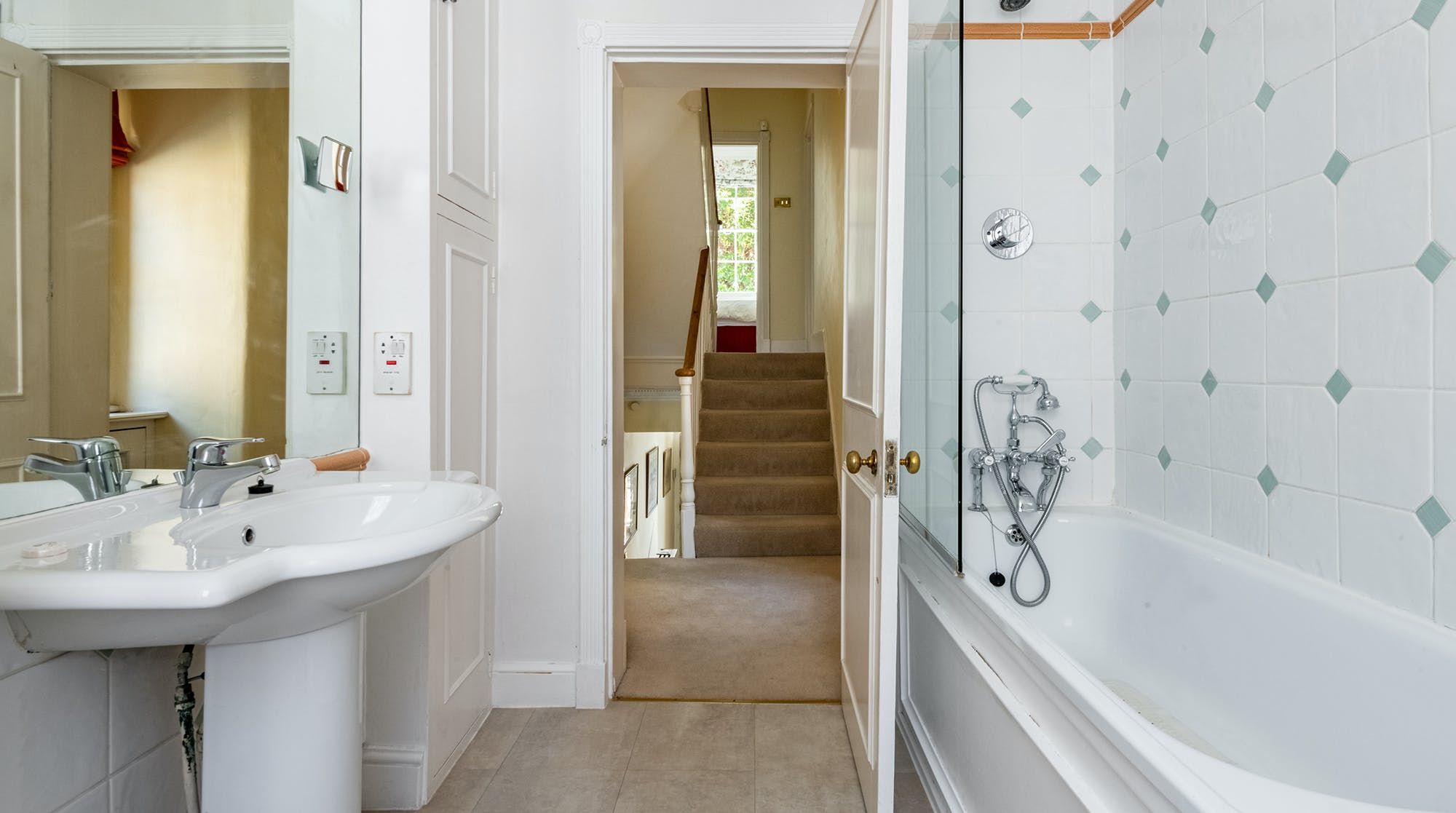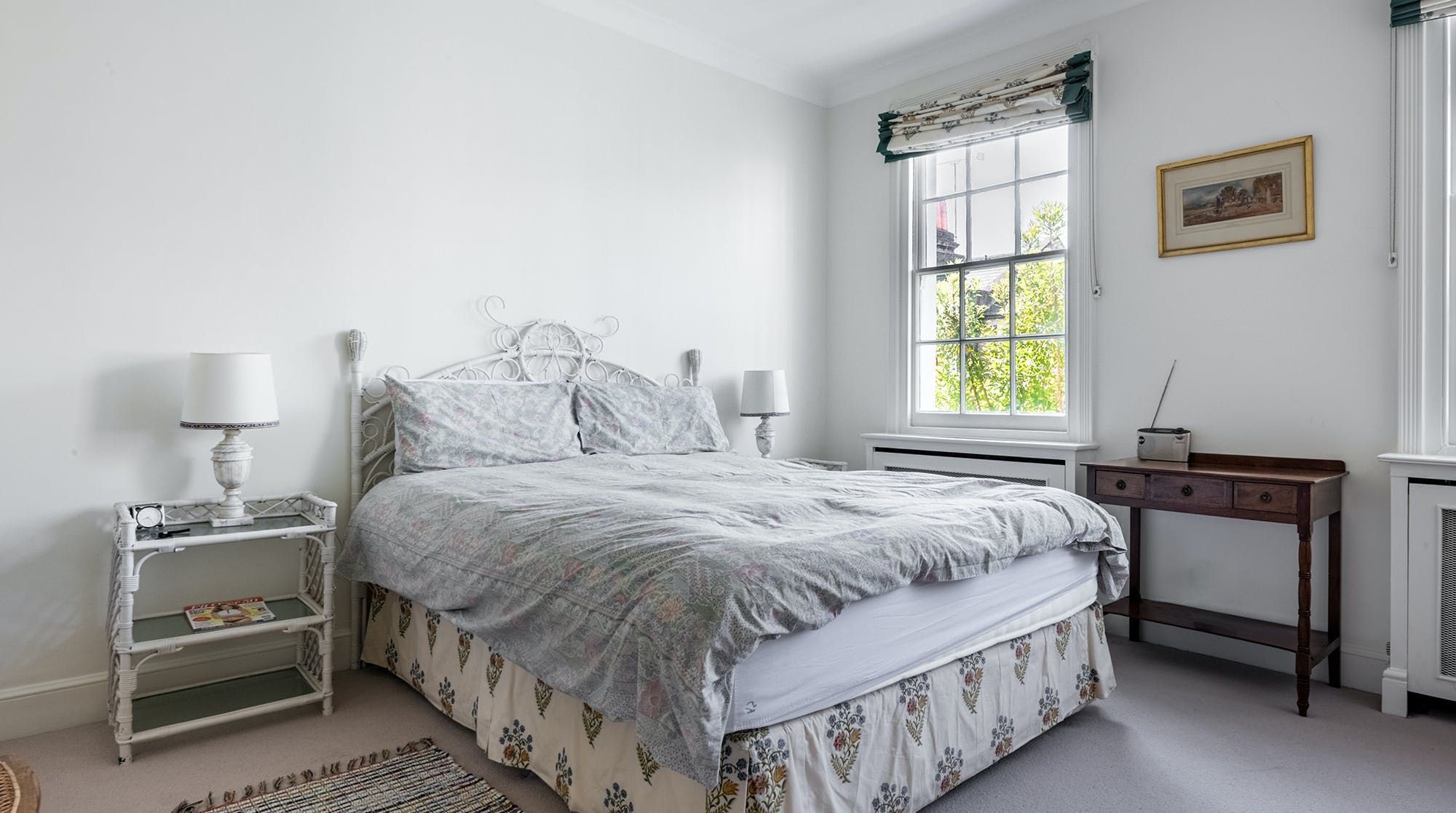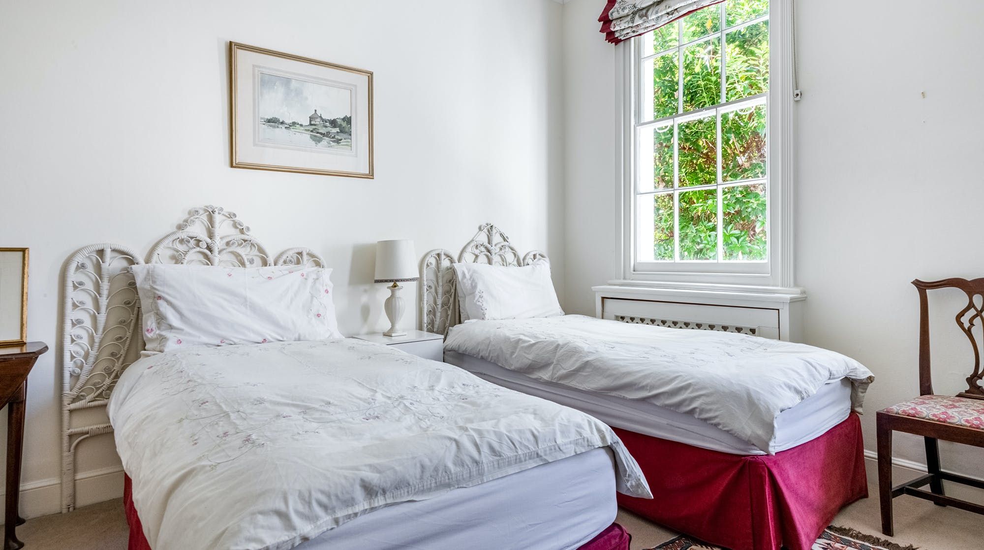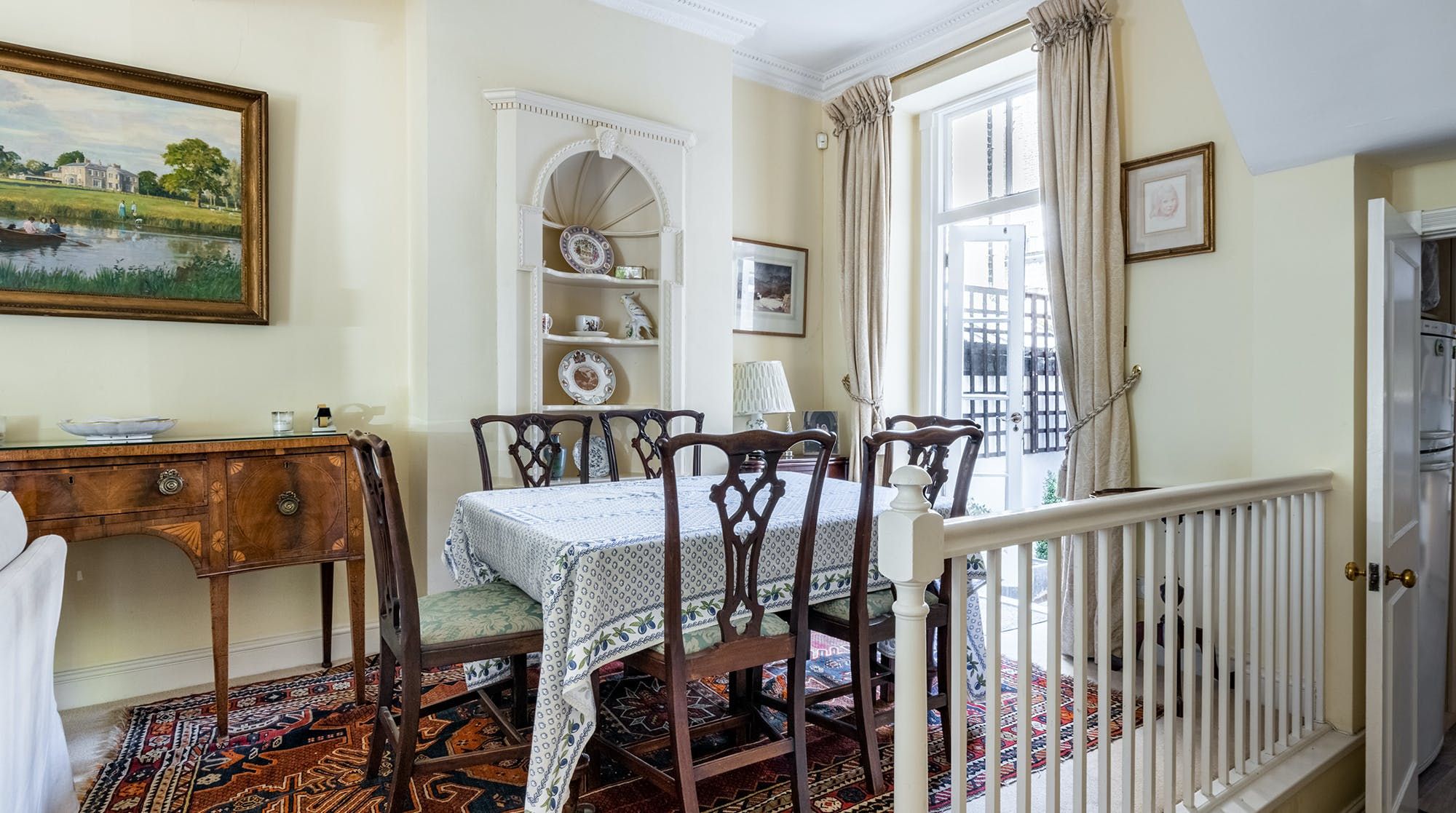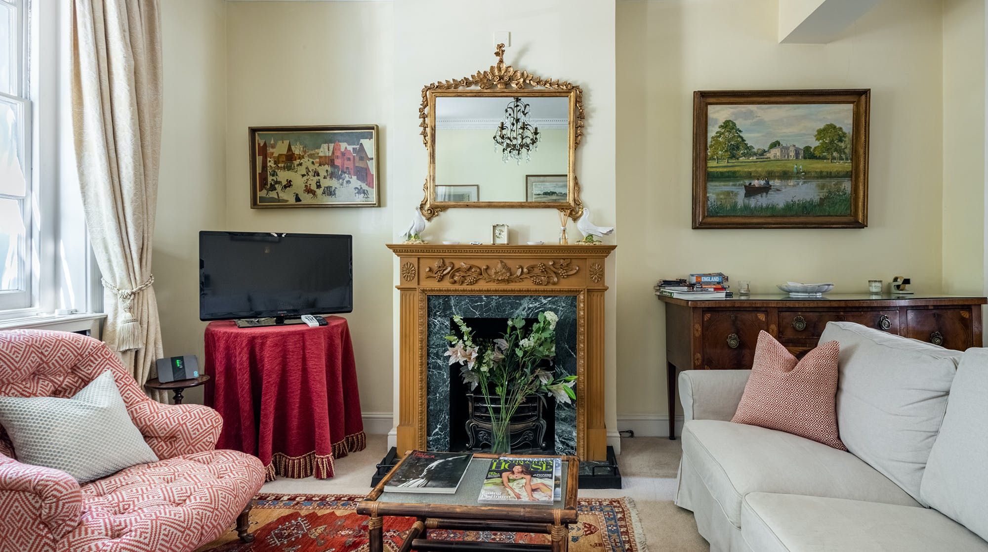Inside, the design leans on traditional, with period features and antique furnishings rubbing shoulders with quaint landscape artwork and homely rugs on the floor. Tall sash windows bring in plenty of natural light and look out to sleepy treetop views on the upper floor.