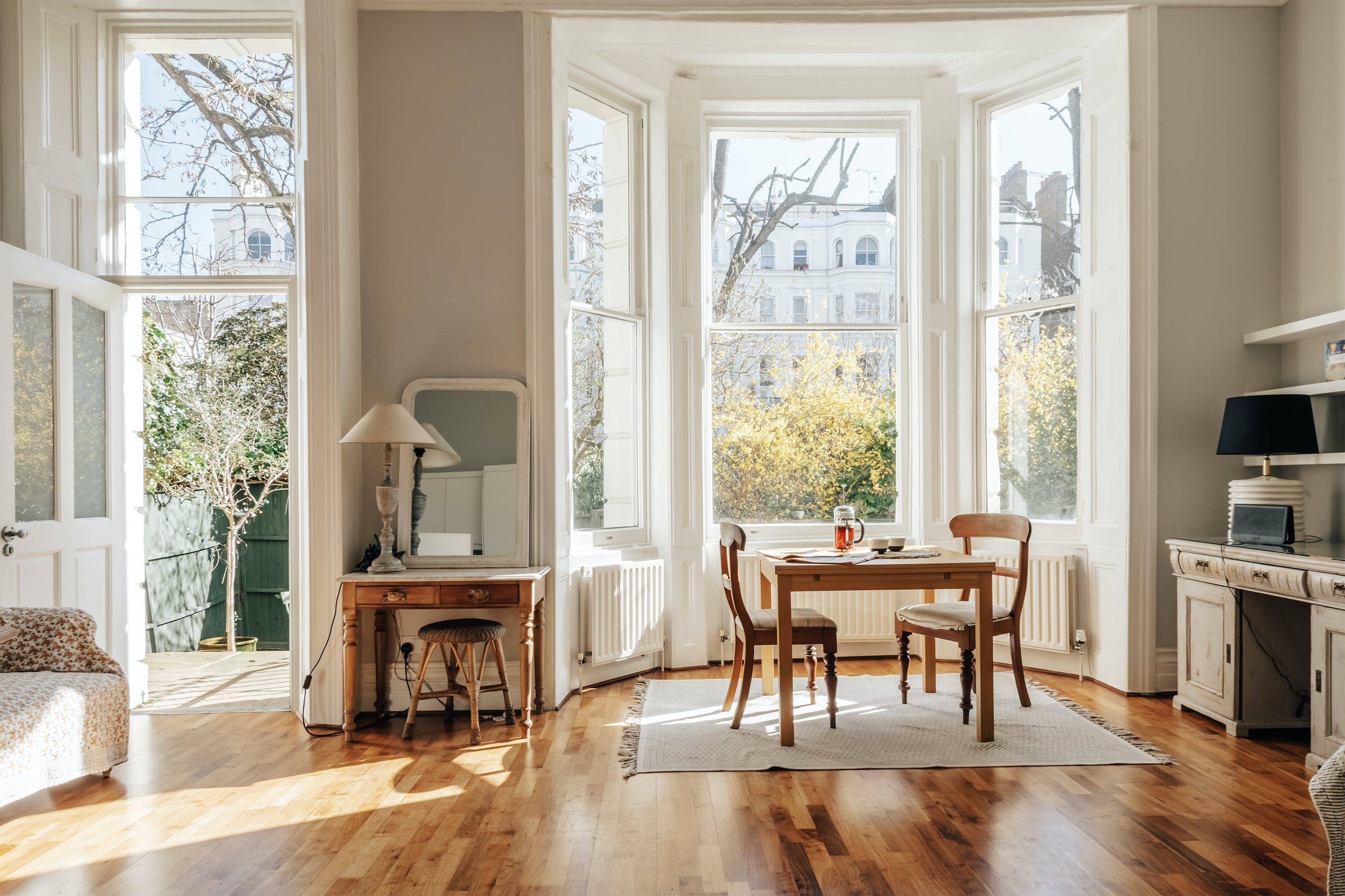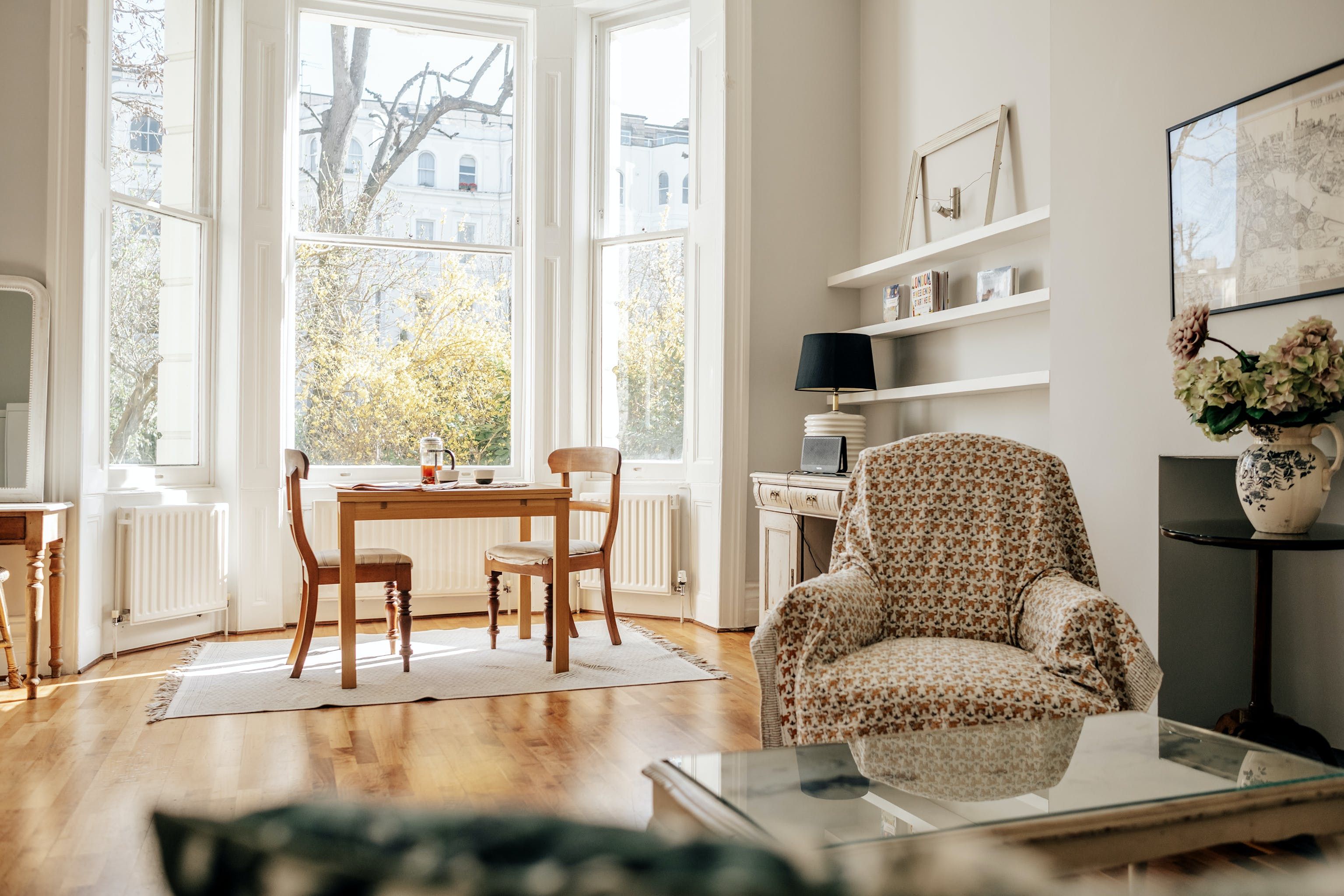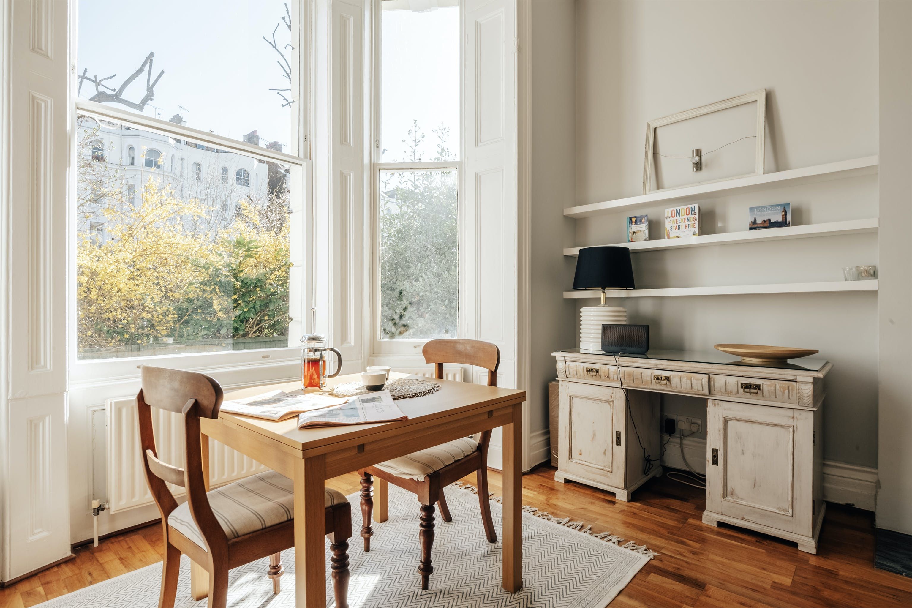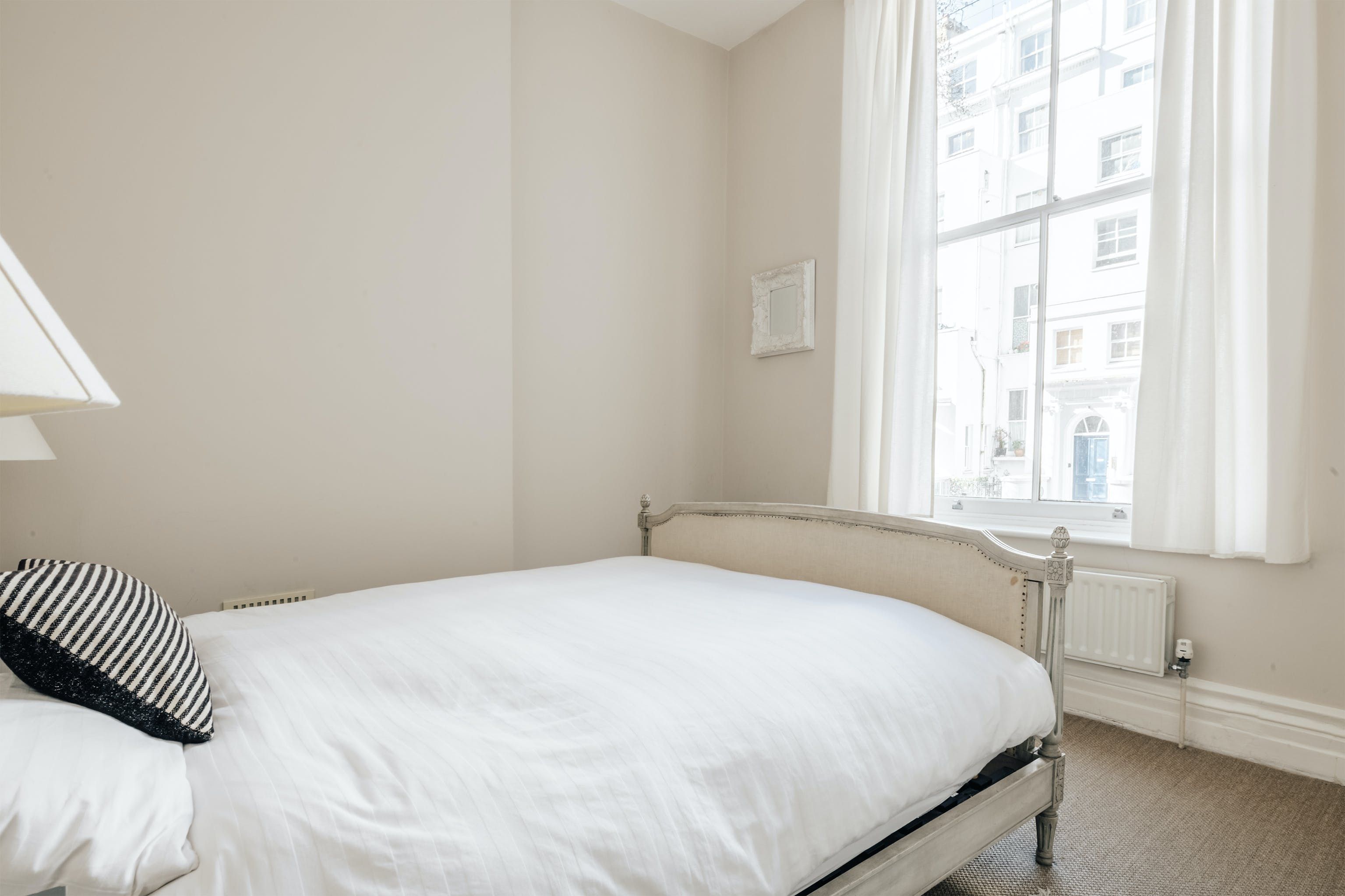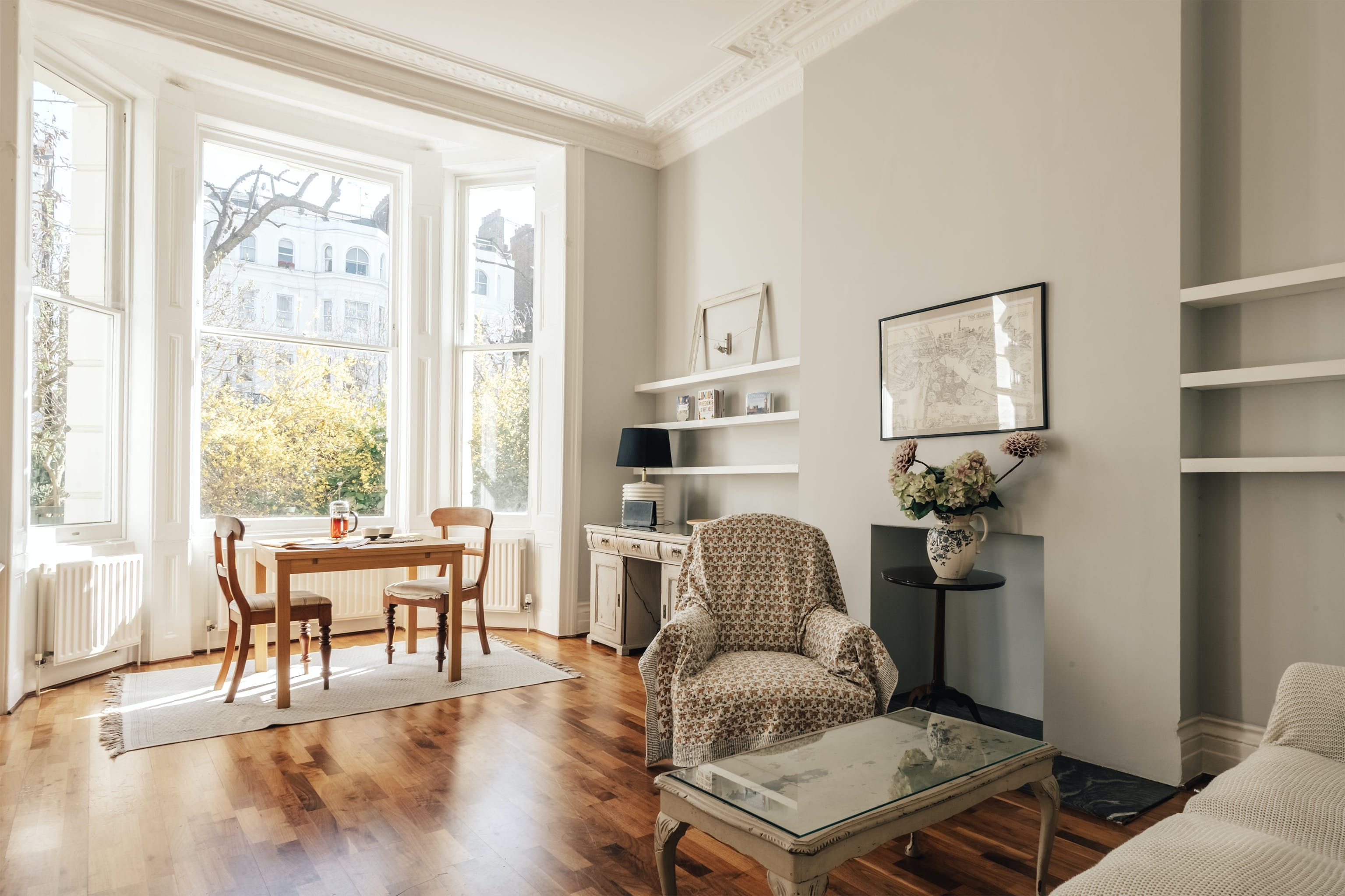 This is a classic, shabby chic Notting Hill flat. The huge bay window and sense of space in the living room make it feel incredibly relaxing and calm. It's not stuffed full of hi-tech entertainment and isn't super luxurious, but if you want a peaceful haven this is a proper gem. Perhaps the biggest highlight is the outdoor patio and gate leading onto the communal garden. Literally, nothing could be more classical Notting Hill.