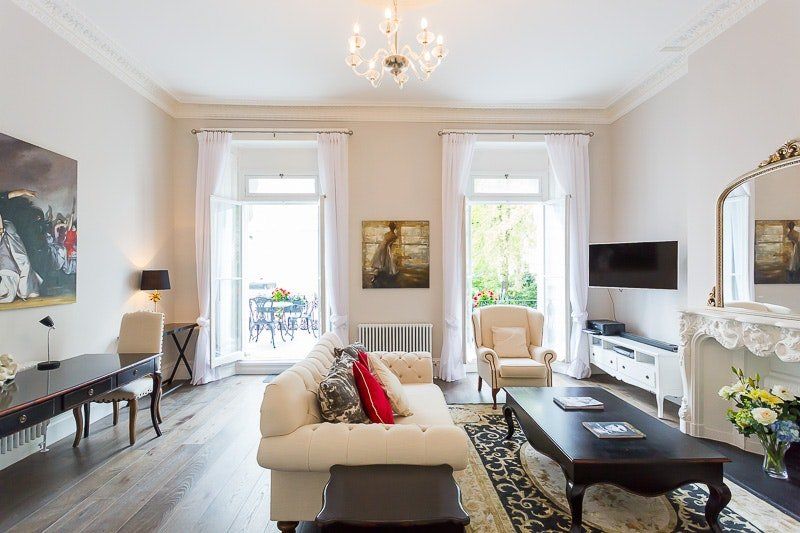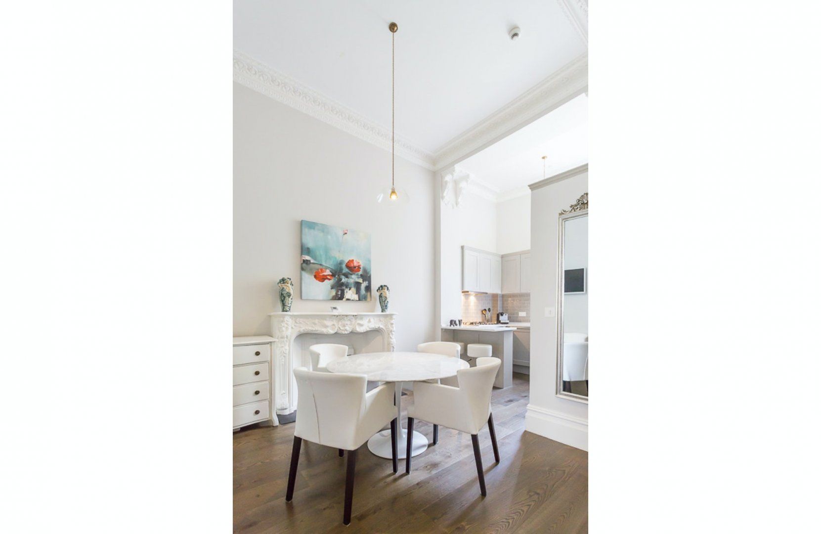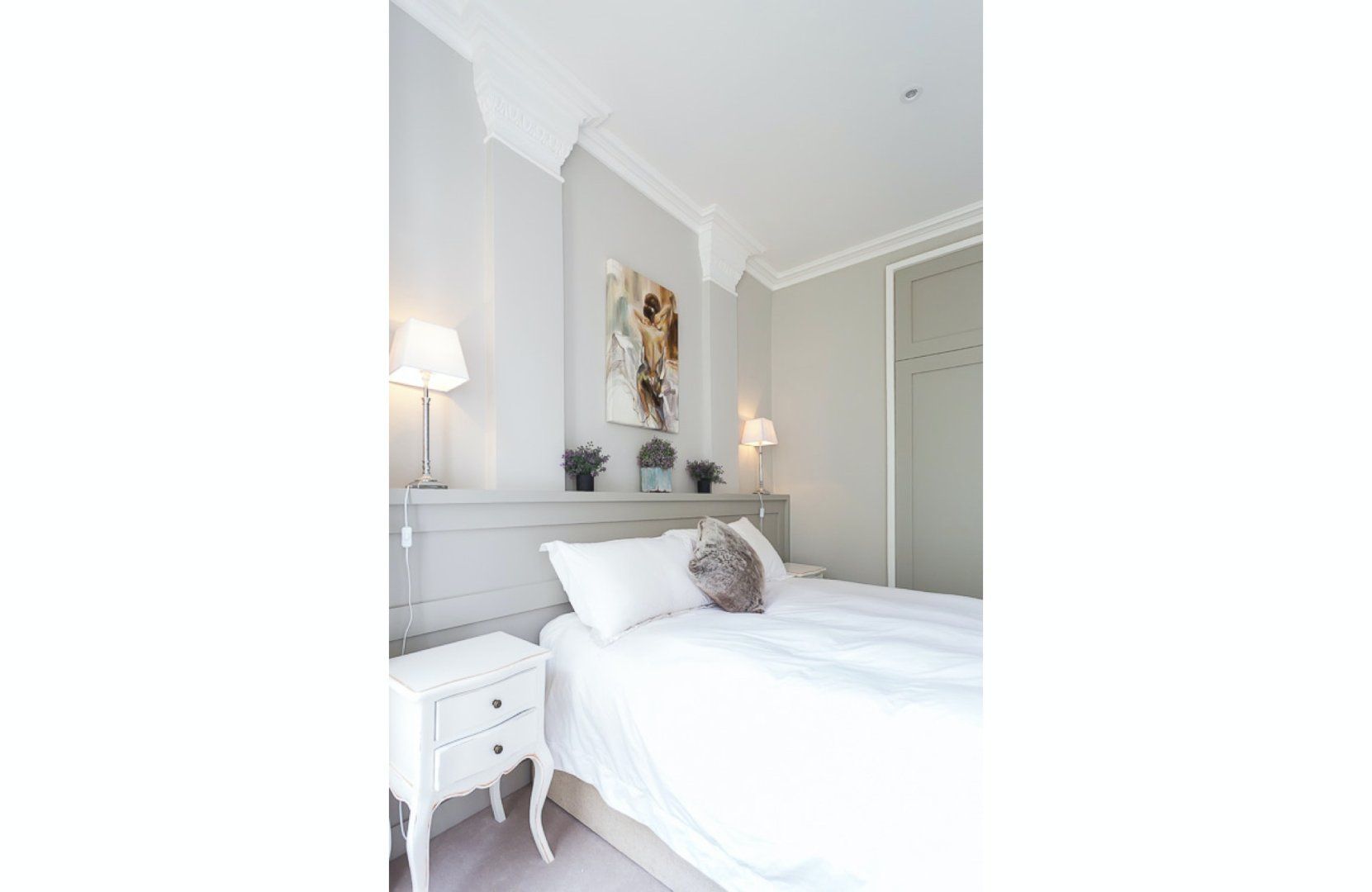 This flat is the epitome of high style and class. With a palette of grey and white muted tones throughout, the real shining stars are the incredibly beautiful and bright paintings. Luxurious furnishings and high-end appliances await as well.