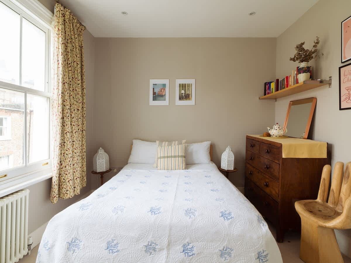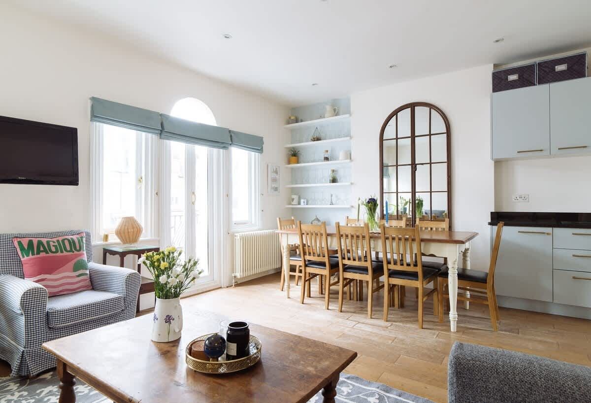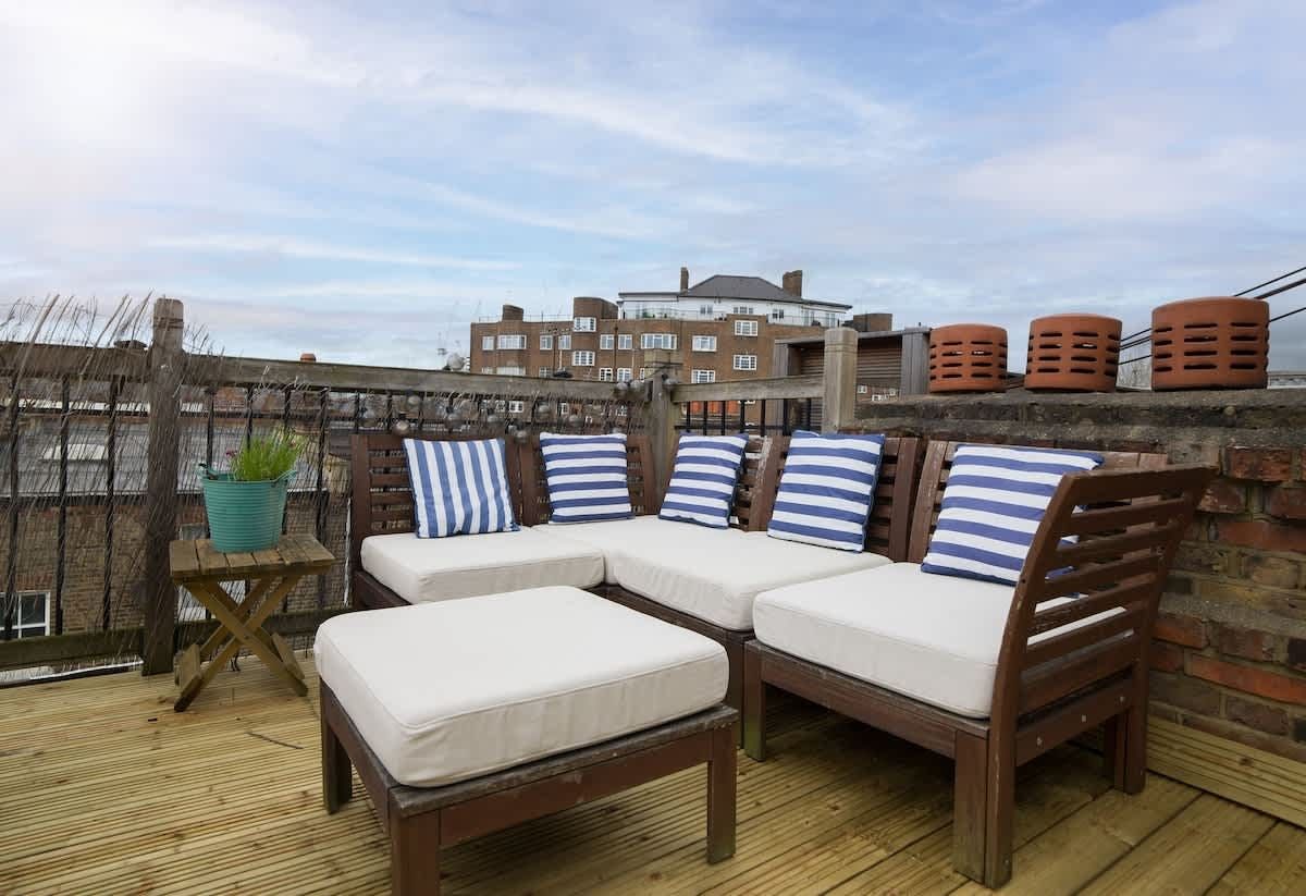 Bright and attractive, this apartment sits in Barons Court, seconds from the iconic Queens Club. There are great pubs and coffee shops nearby, and you can walk to the Tube in three minutes. The star of this home is undoubtedly the large roof terrace, where you can dine alfresco or lounge on the sofa. The apartment is spread over two floors so there’s plenty of space, though at full occupancy, two guests will sleep on a sofa bed in the living room. It's also worth pointing out that the building's low water pressure means that only one of this home's showers can be used at a time.