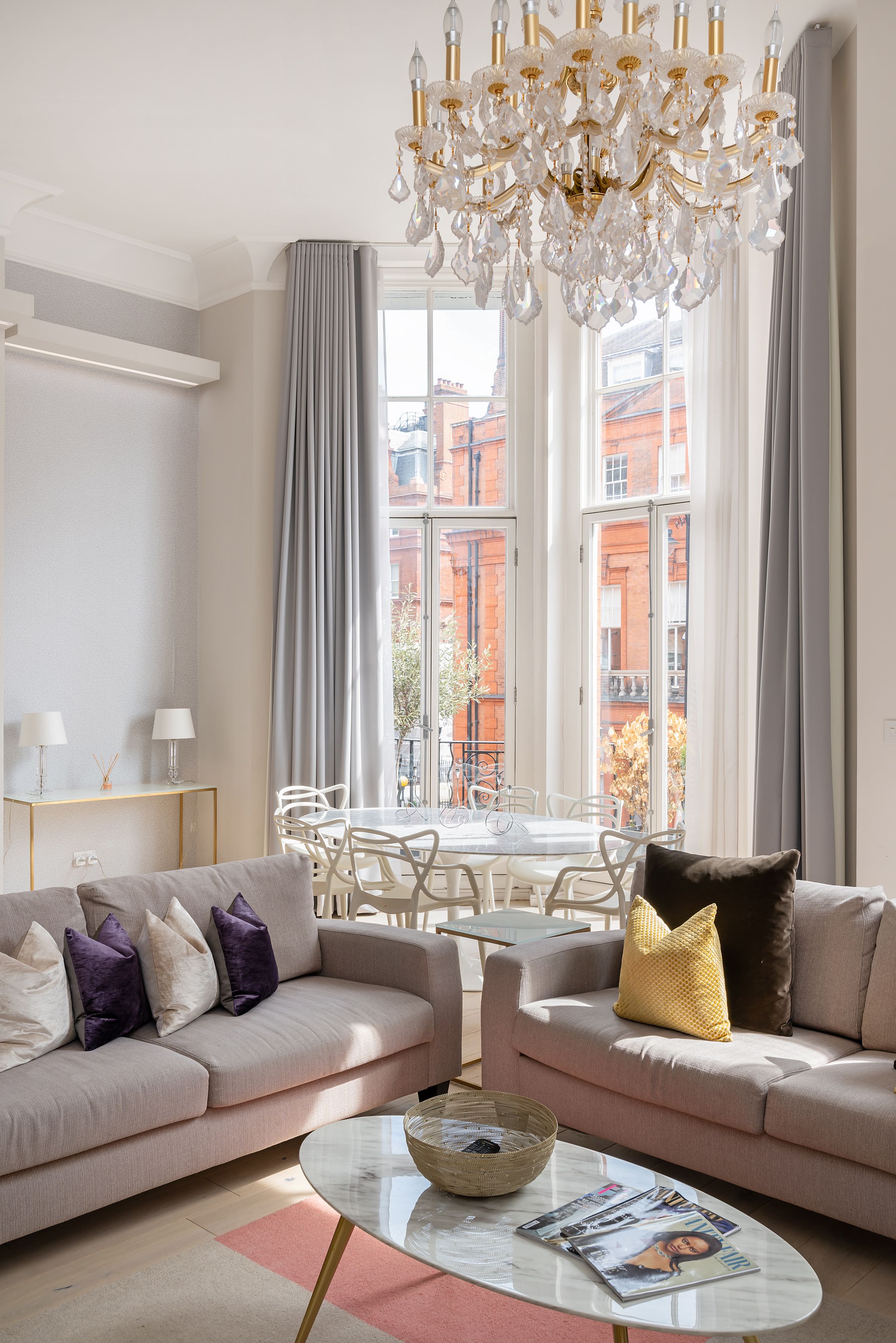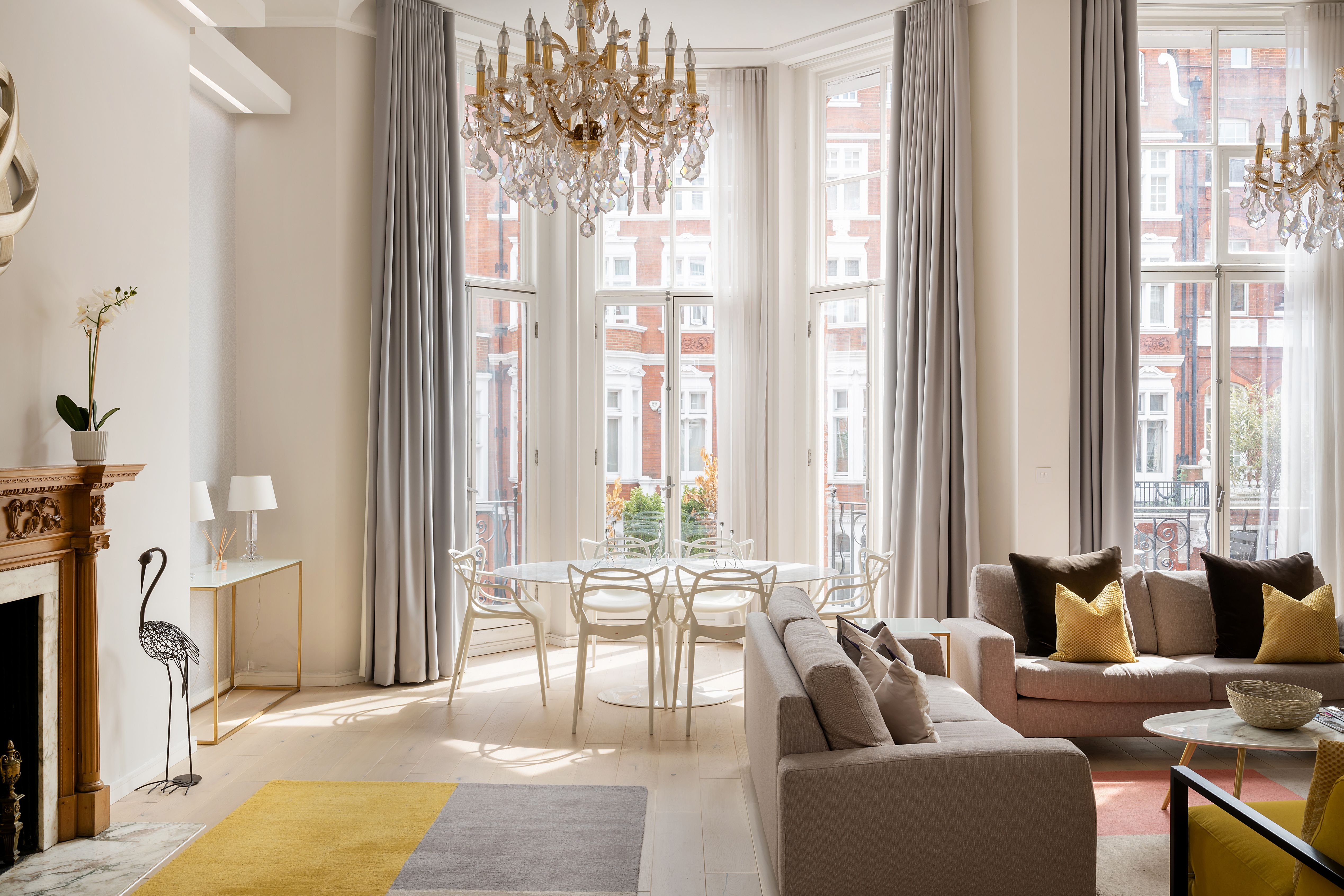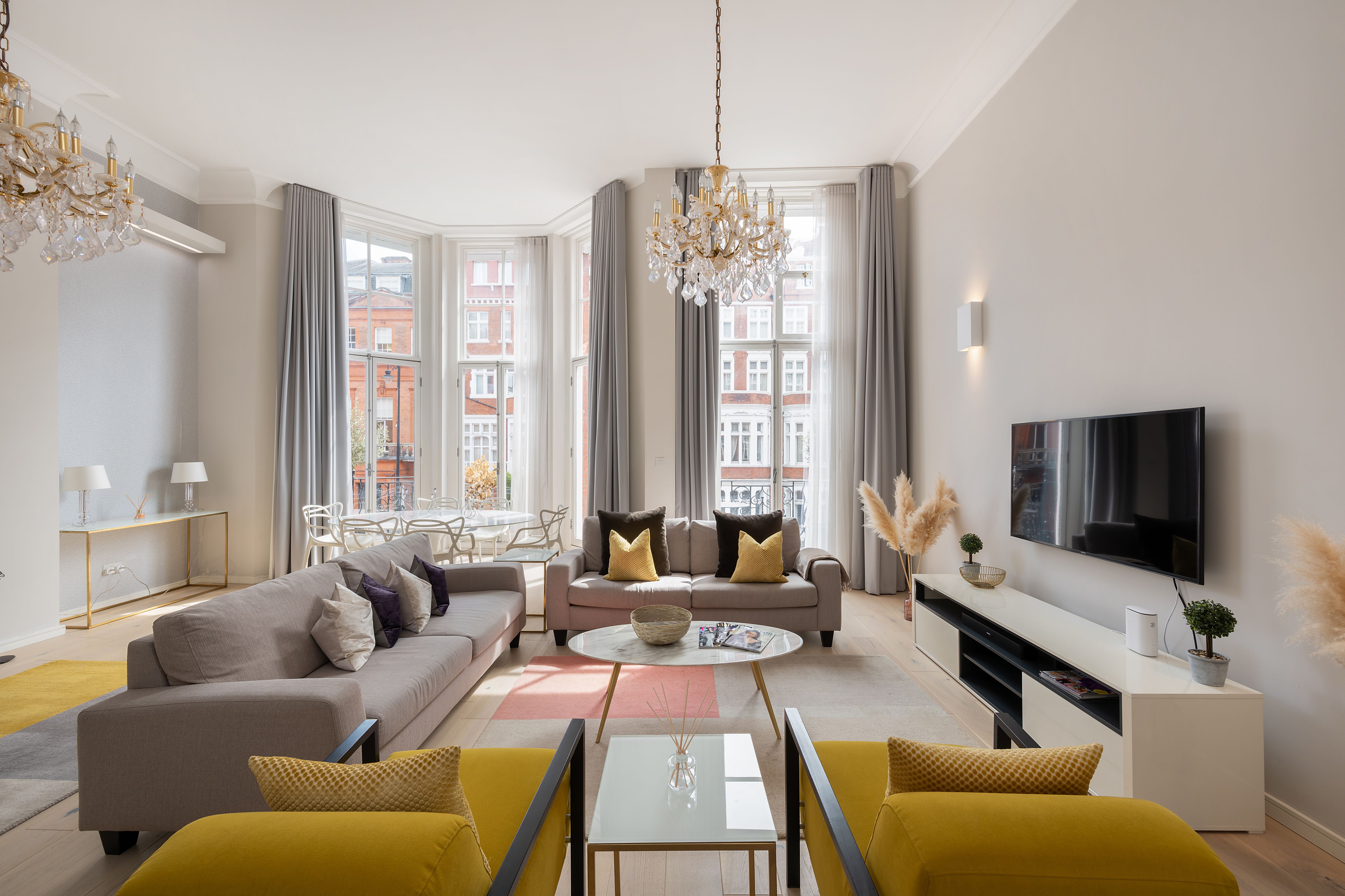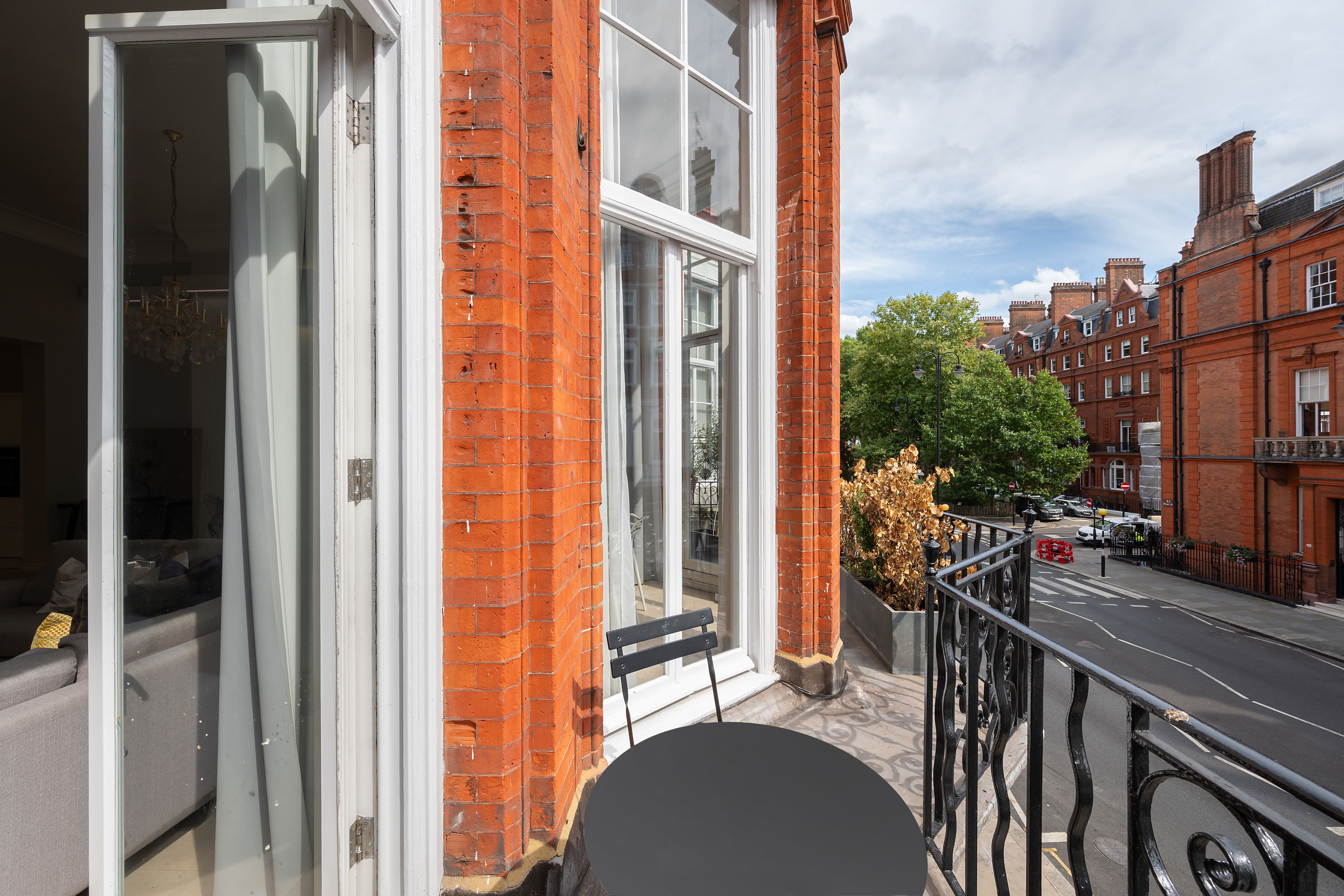 In the heart of Knightsbridge, this apartment is the epitome of elegance. Sky-high ceilings, expansive windows, sparkling crystal chandeliers – the details here perfectly embody the prestigious locale. There's room for everyone to enjoy themselves in the living area, while the two en-suite bedrooms also ensure privacy. The cherry on top is the small but sweet balcony, where you can linger with a glass of wine and admire the neighbourhood's red-brick buildings. Ready to explore? Harrods is a five-minute stroll away, Hyde Park is walkable in ten, and South Kensington's museums are just fifteen minutes on foot.