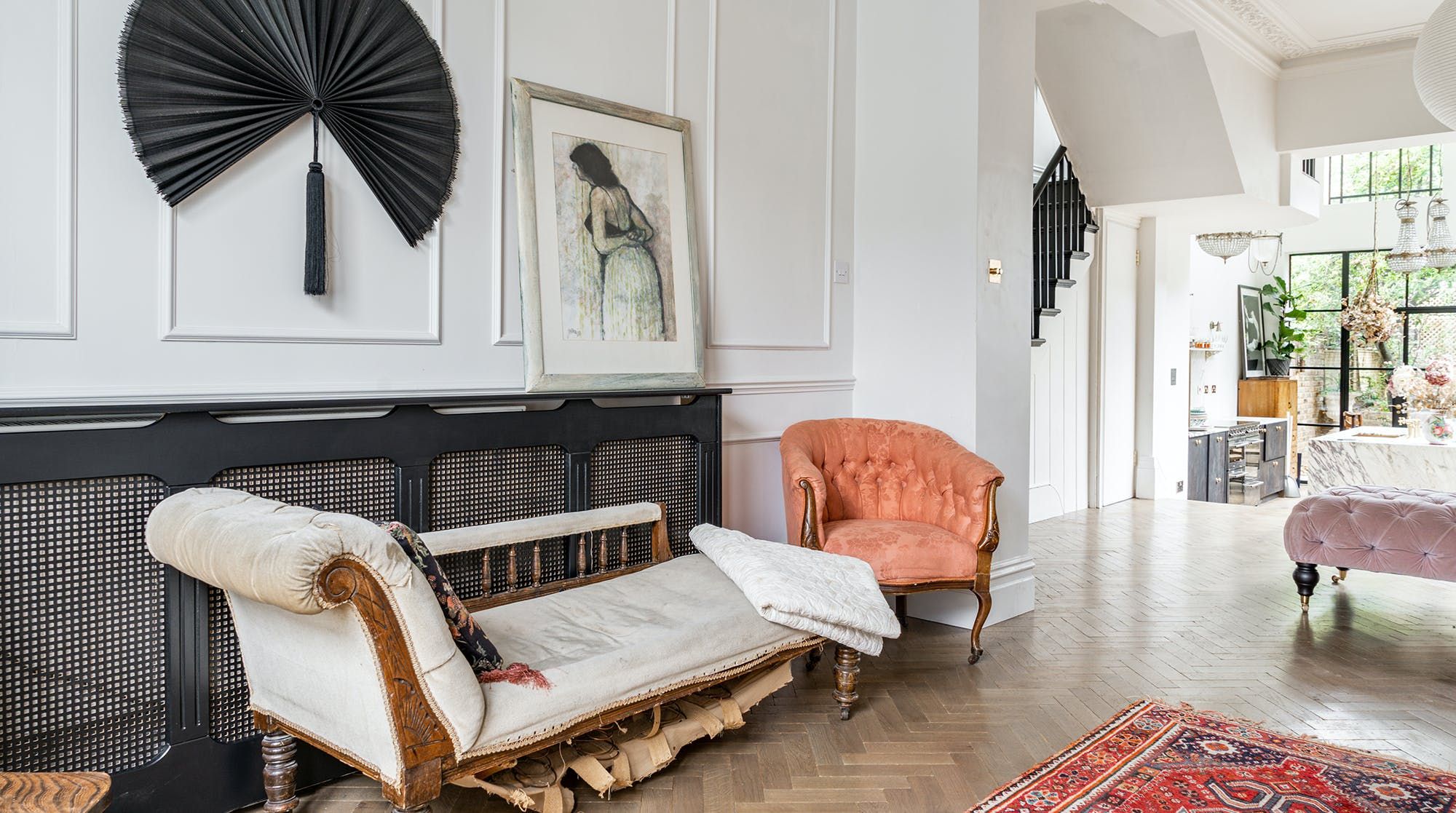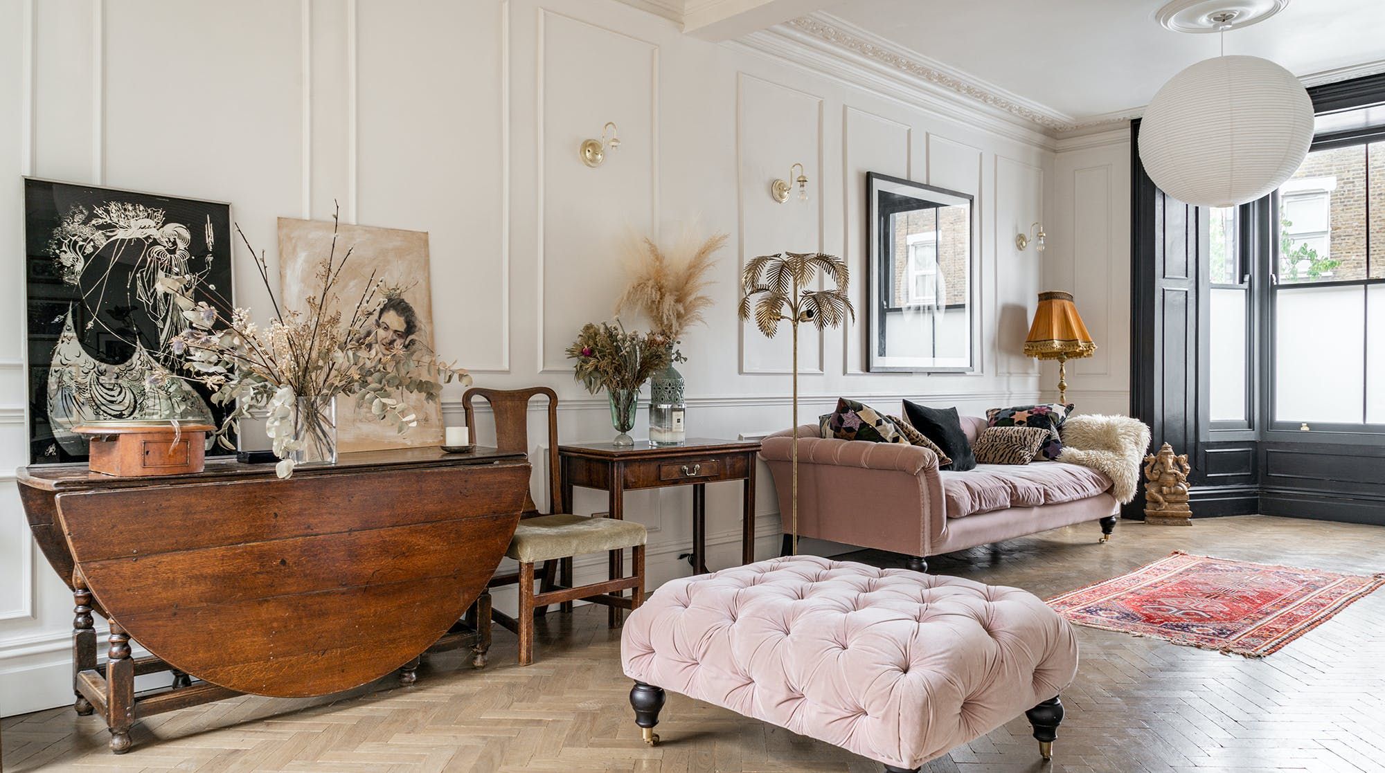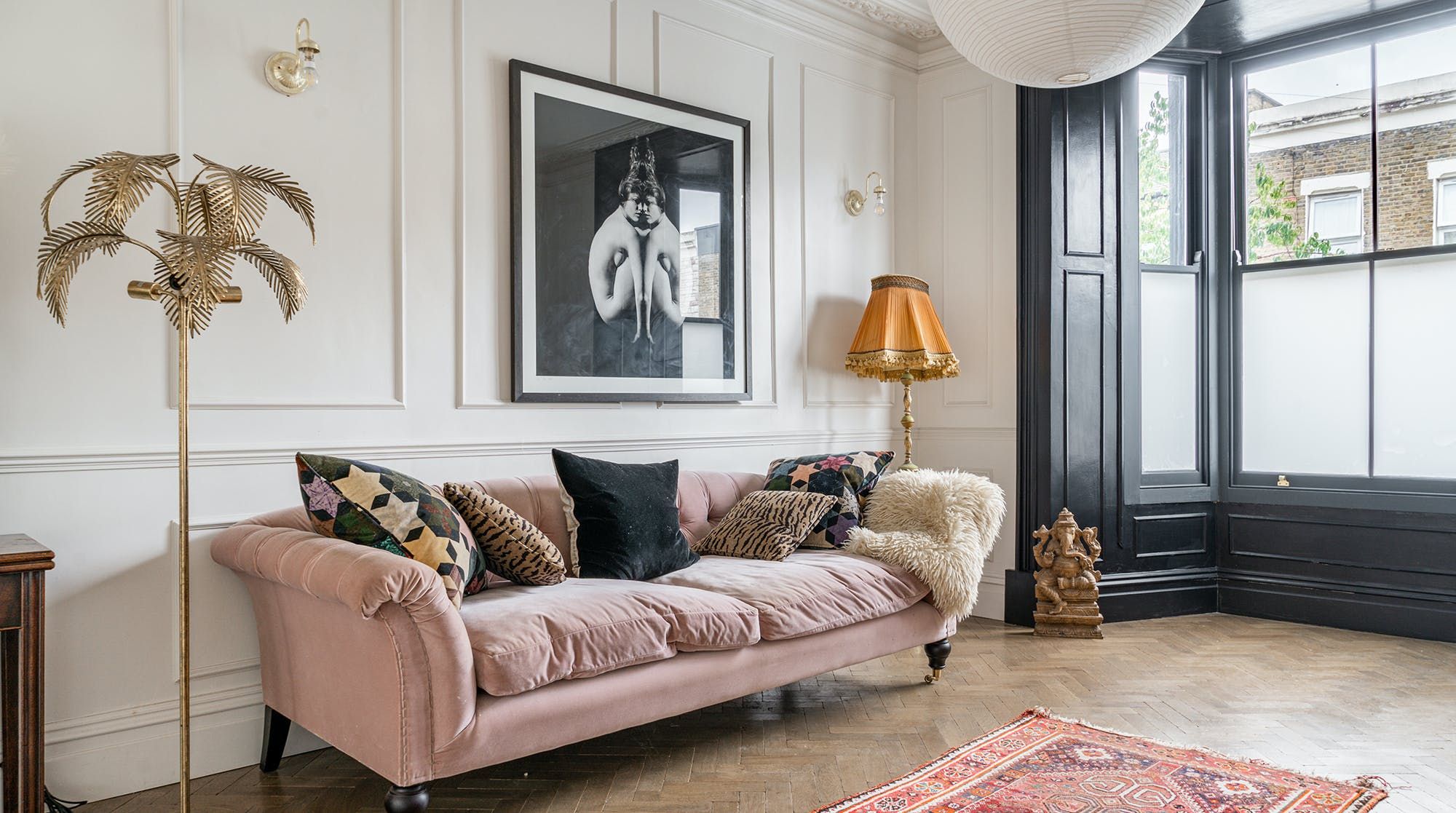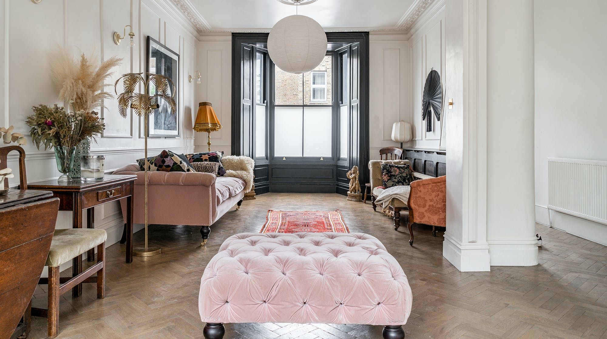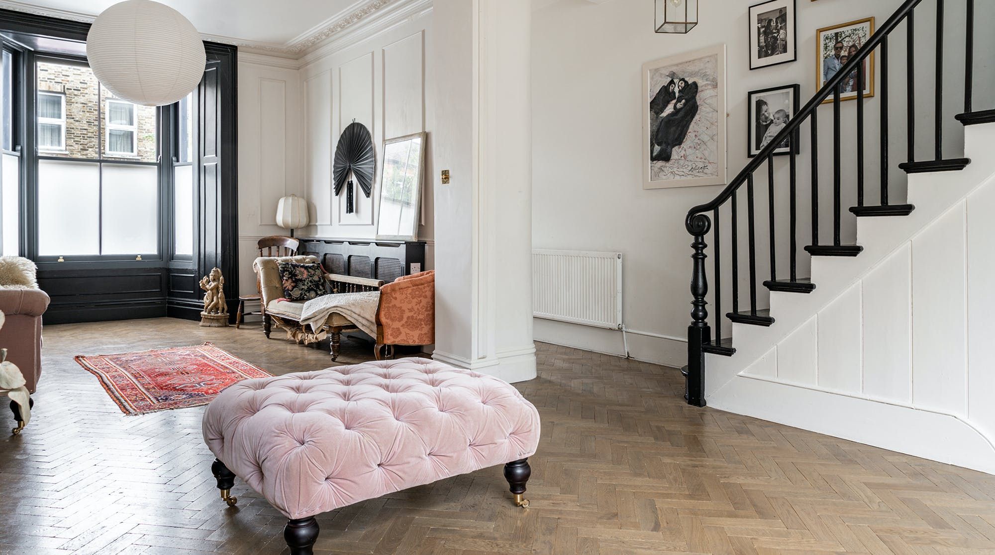 Behind a beautifully renovated townhouse facade lies an interior that is bright and beautiful in equal measures. The living room has the feel of a contemporary art gallery, with high ceilings, parquet flooring and striking pieces on the wall. Although saying that, we haven't been to a gallery with such cute pastel-pink, tufted furnishings.