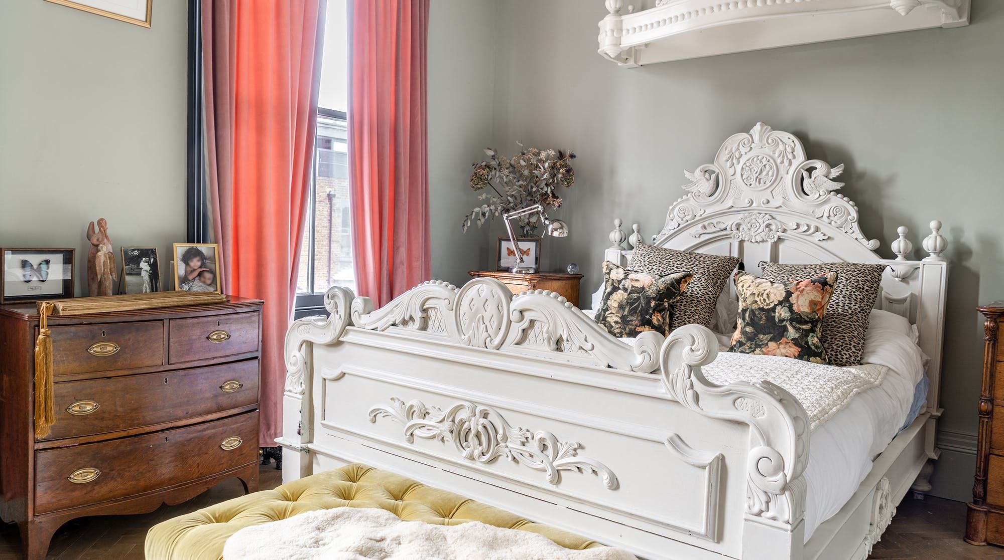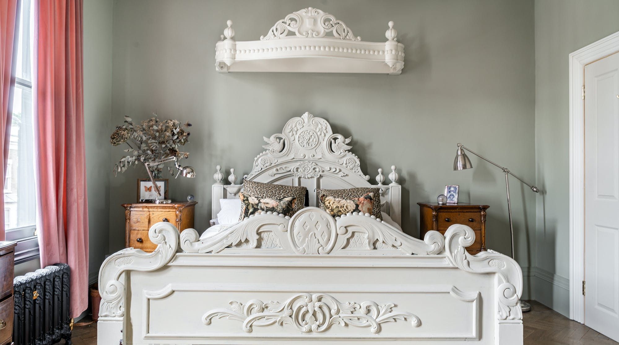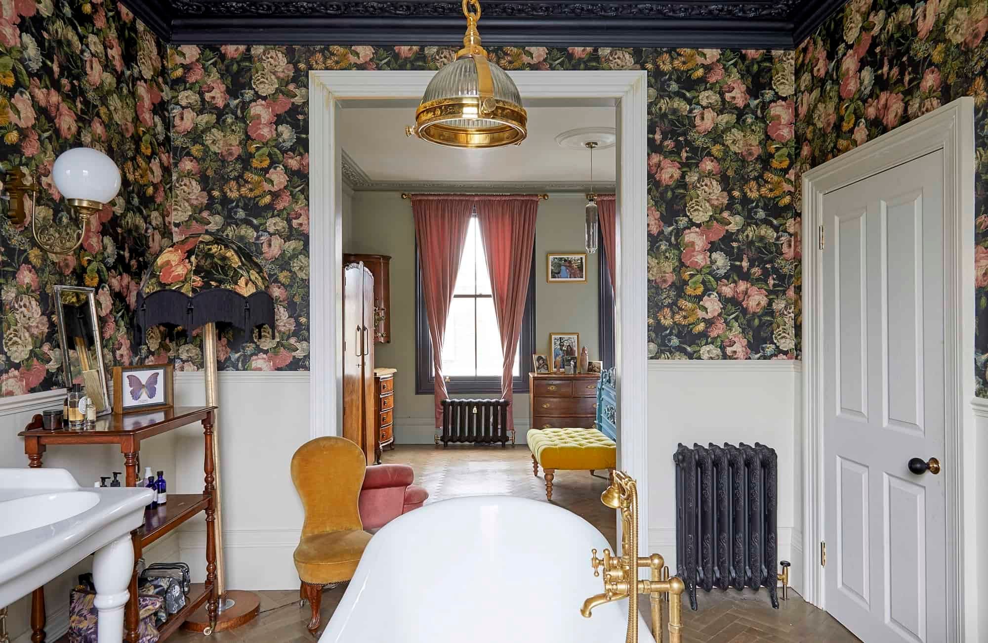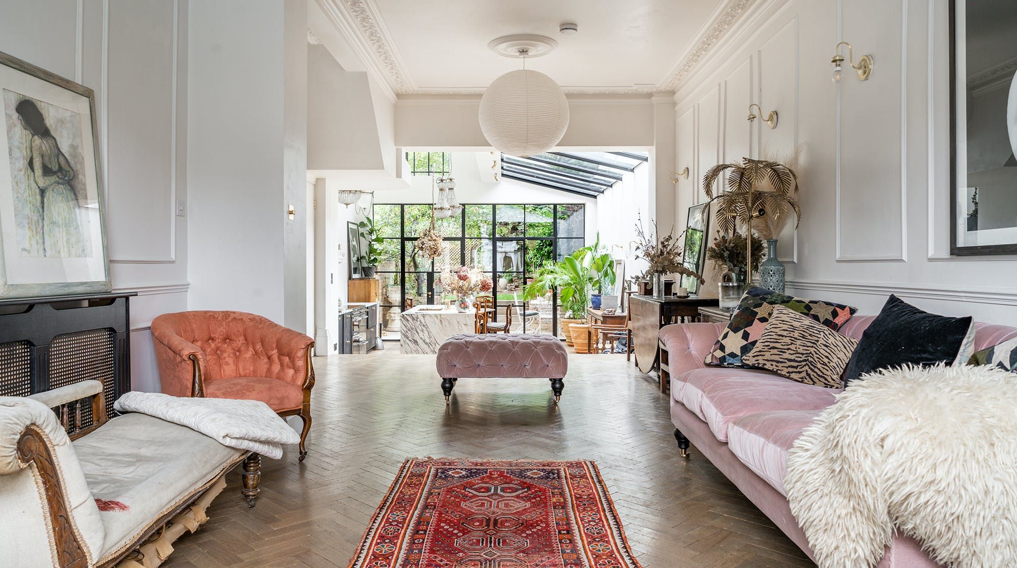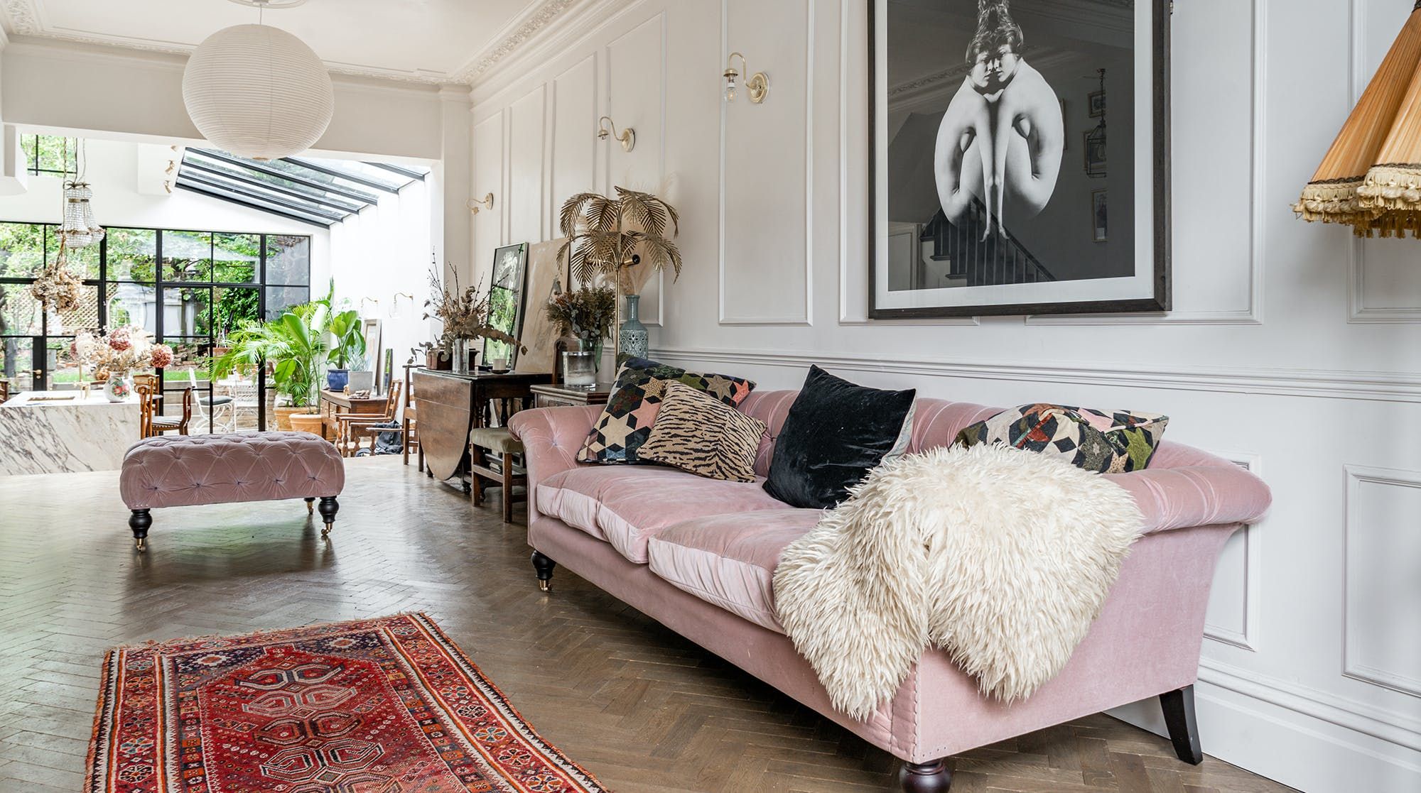 Behind a beautifully renovated townhouse facade lies an interior that is bright and beautiful in equal measures. The living room has the feel of a contemporary art gallery, with high ceilings, parquet flooring and striking pieces on the wall. Although saying that, we haven't been to a gallery with such cute pastel-pink, tufted furnishings.
