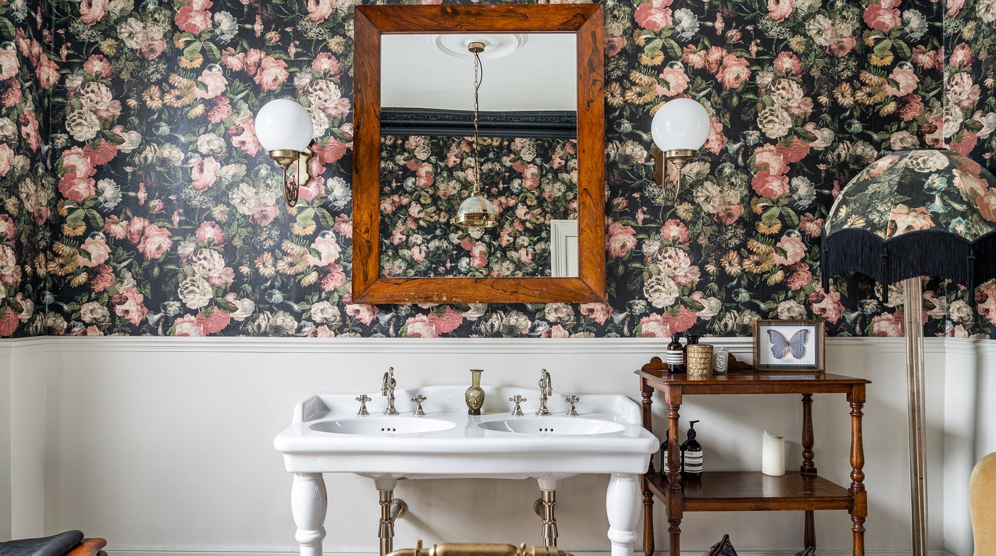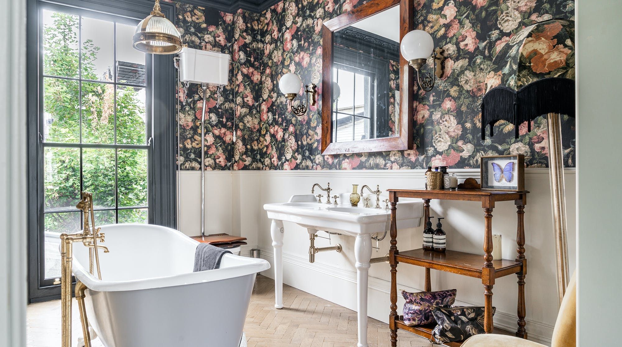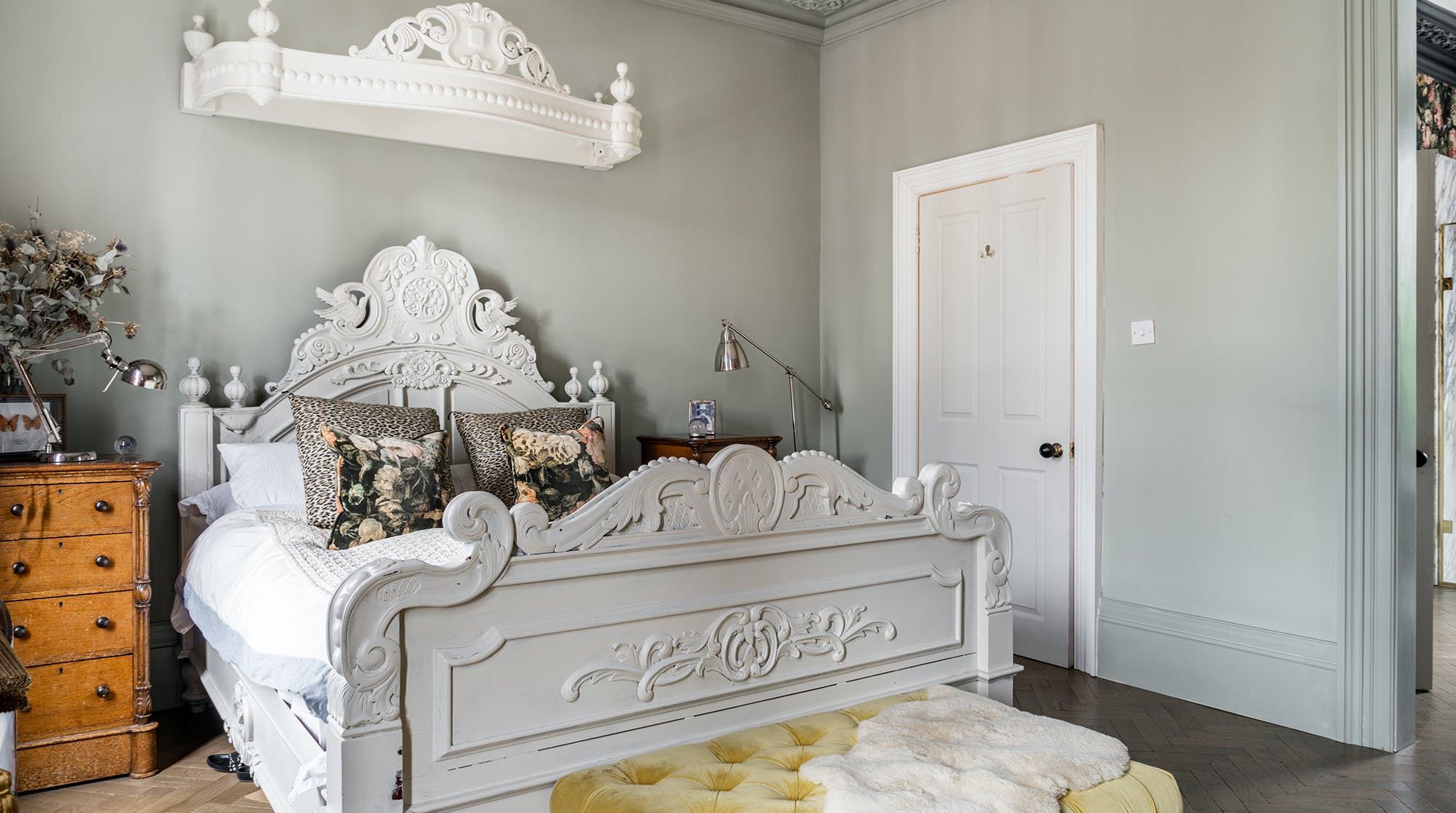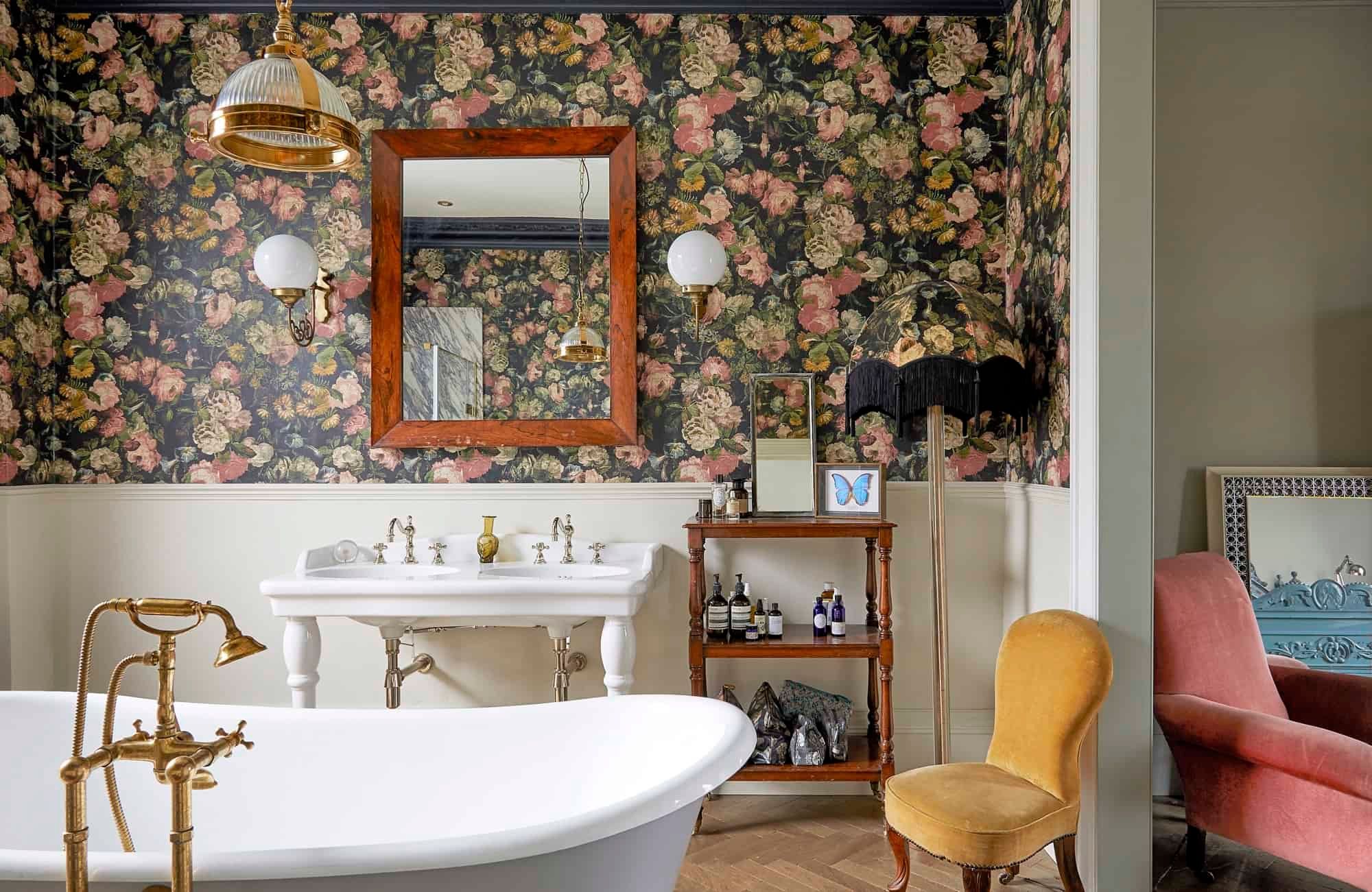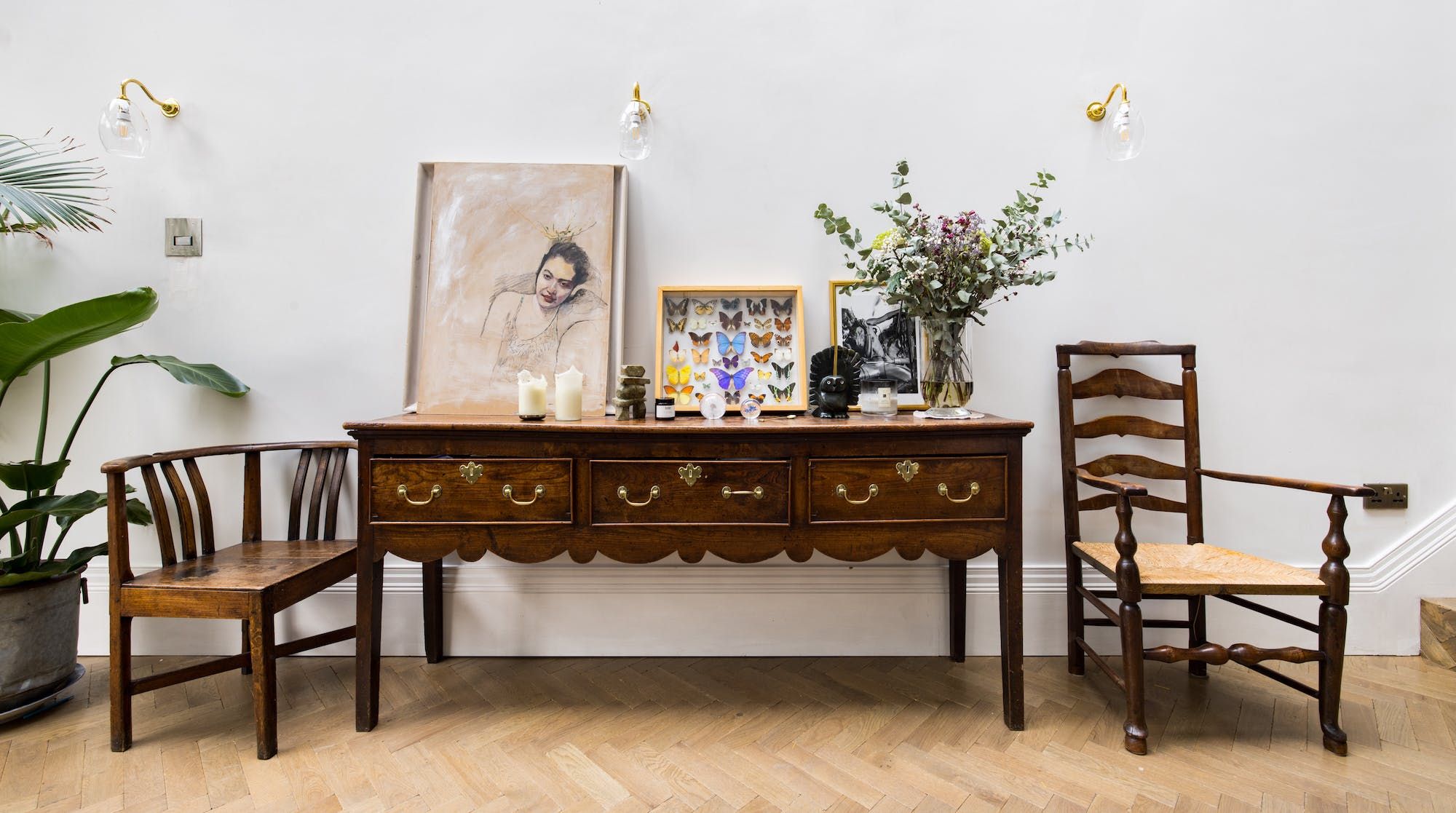 Behind a beautifully renovated townhouse facade lies an interior that is bright and beautiful in equal measures. The living room has the feel of a contemporary art gallery, with high ceilings, parquet flooring and striking pieces on the wall. Although saying that, we haven't been to a gallery with such cute pastel-pink, tufted furnishings.
