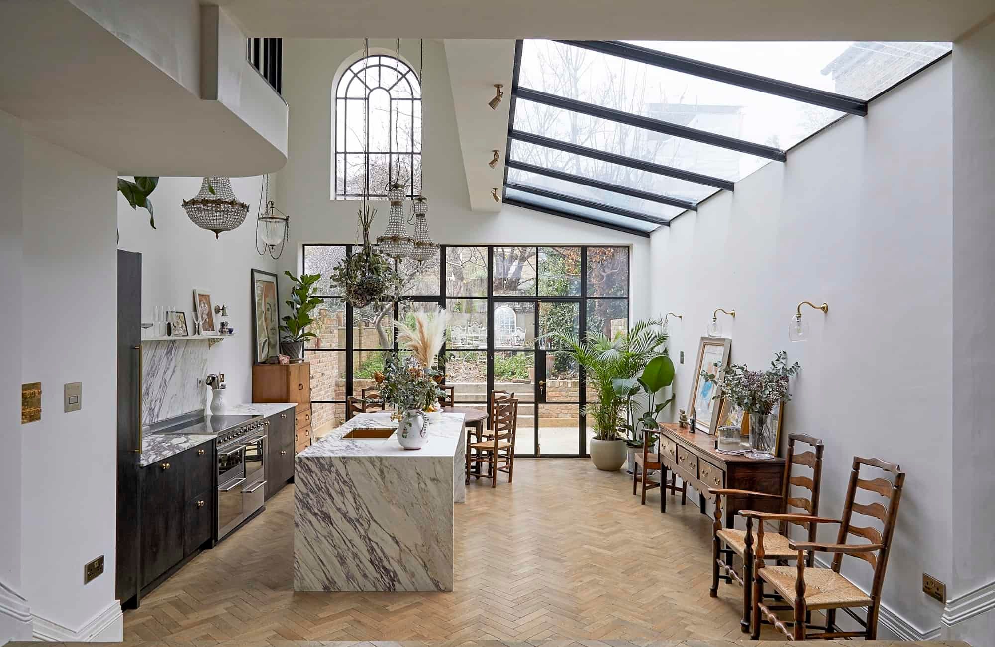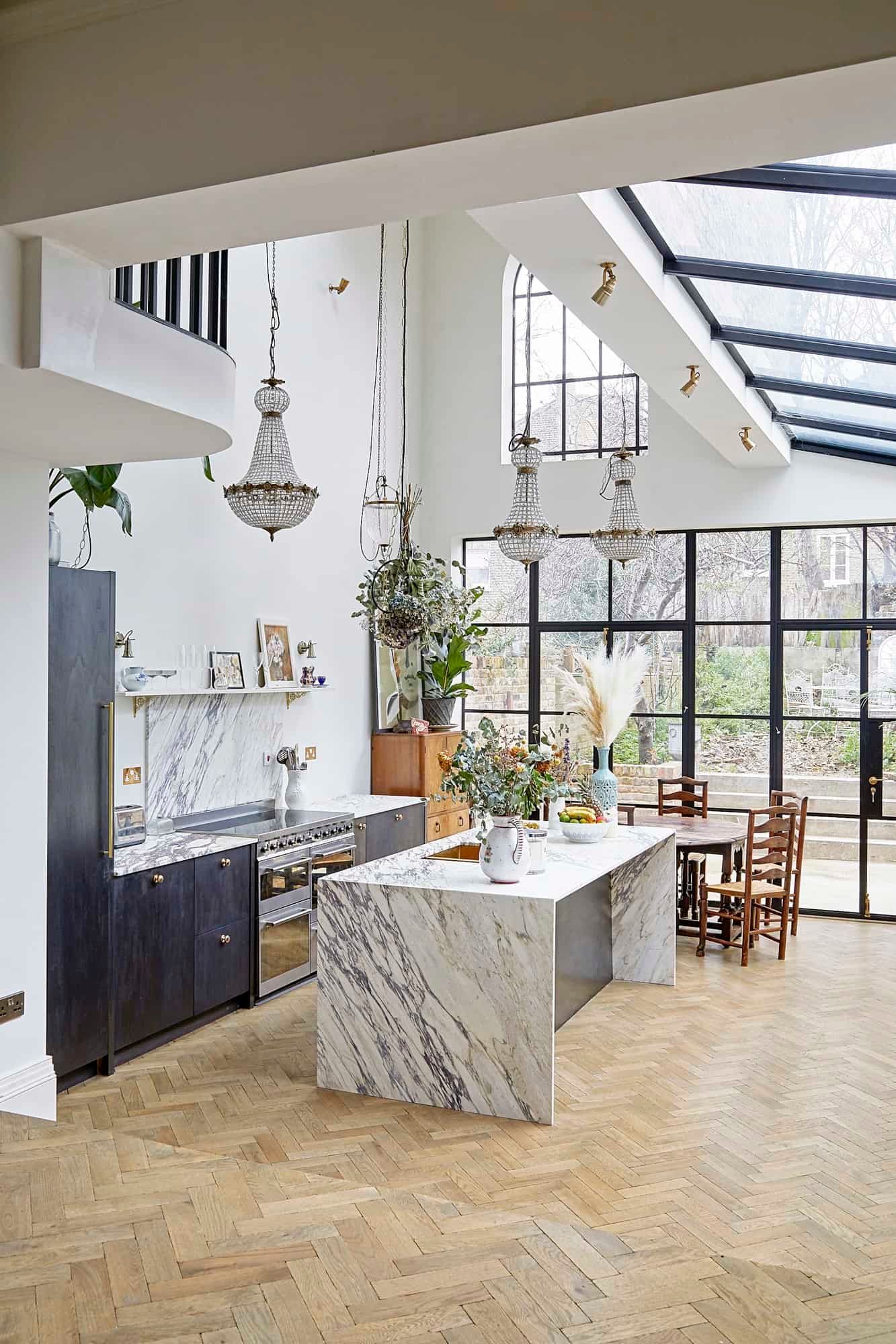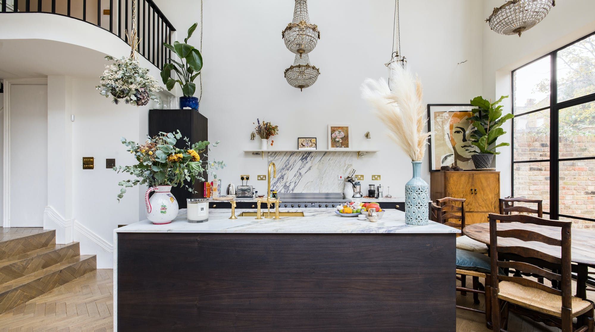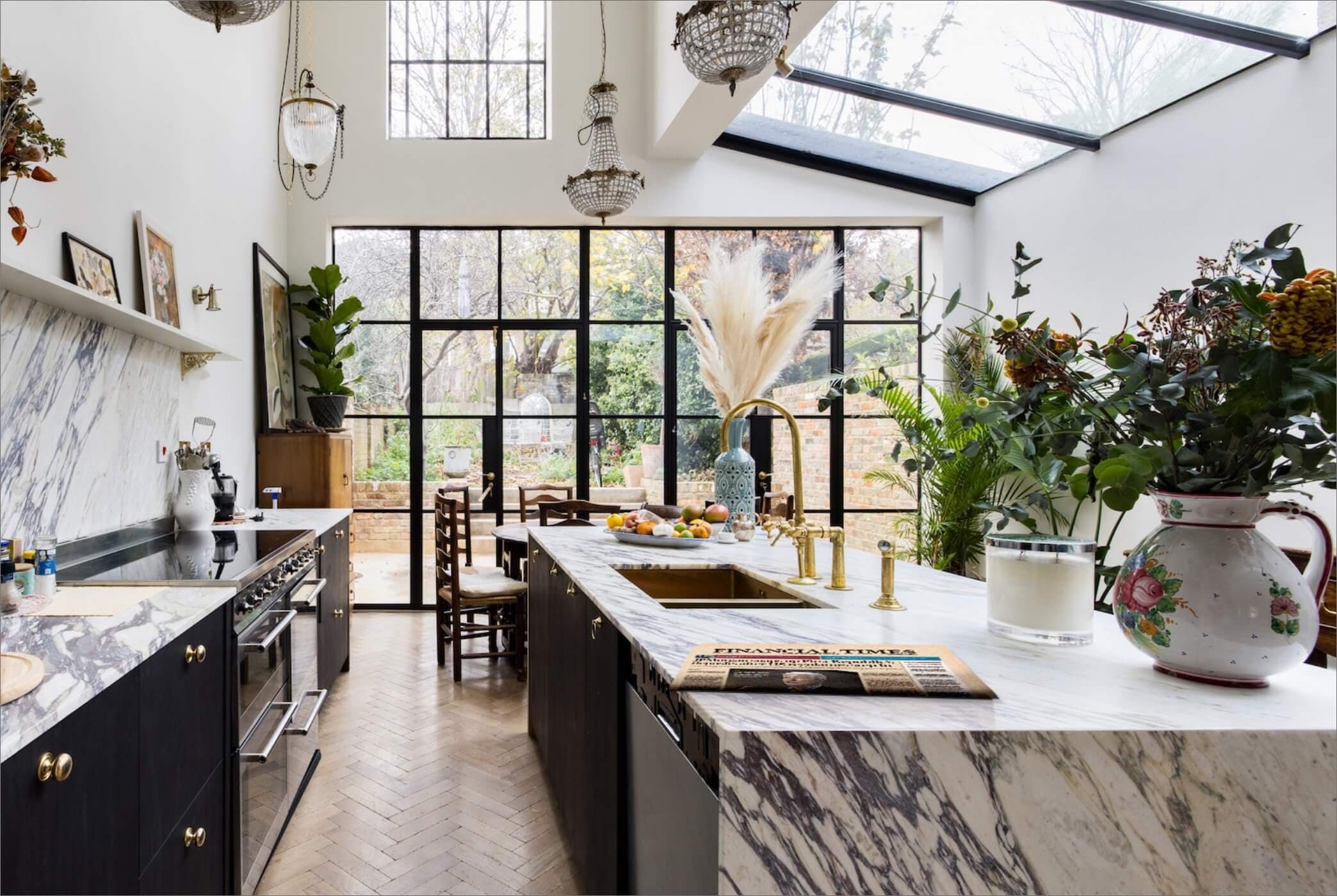 The kitchen is just as striking, thanks to the large windows, the flurry of house plants and handsome marble surfaces. So striking in fact, that we crowned it 'kitchen of the year' on Instagram. As well as letting in copious amounts of natural light, the French door also leads out to a charming garden space with some seating for warm evenings.