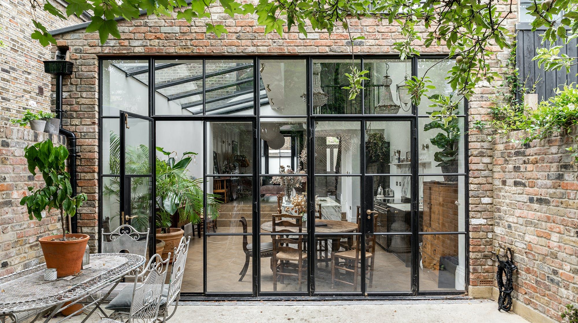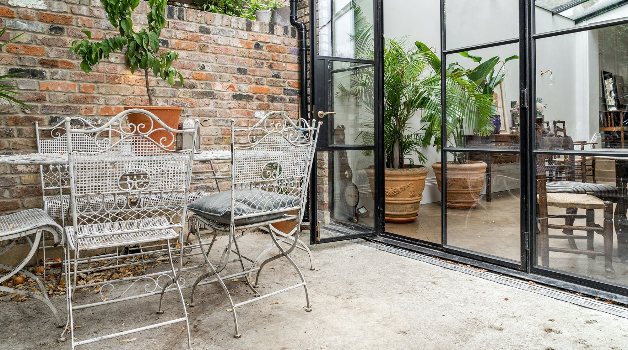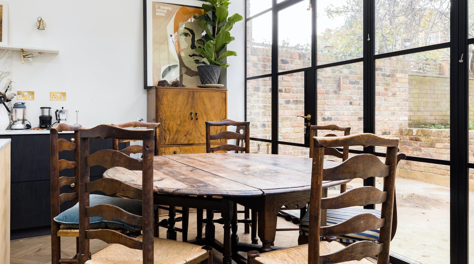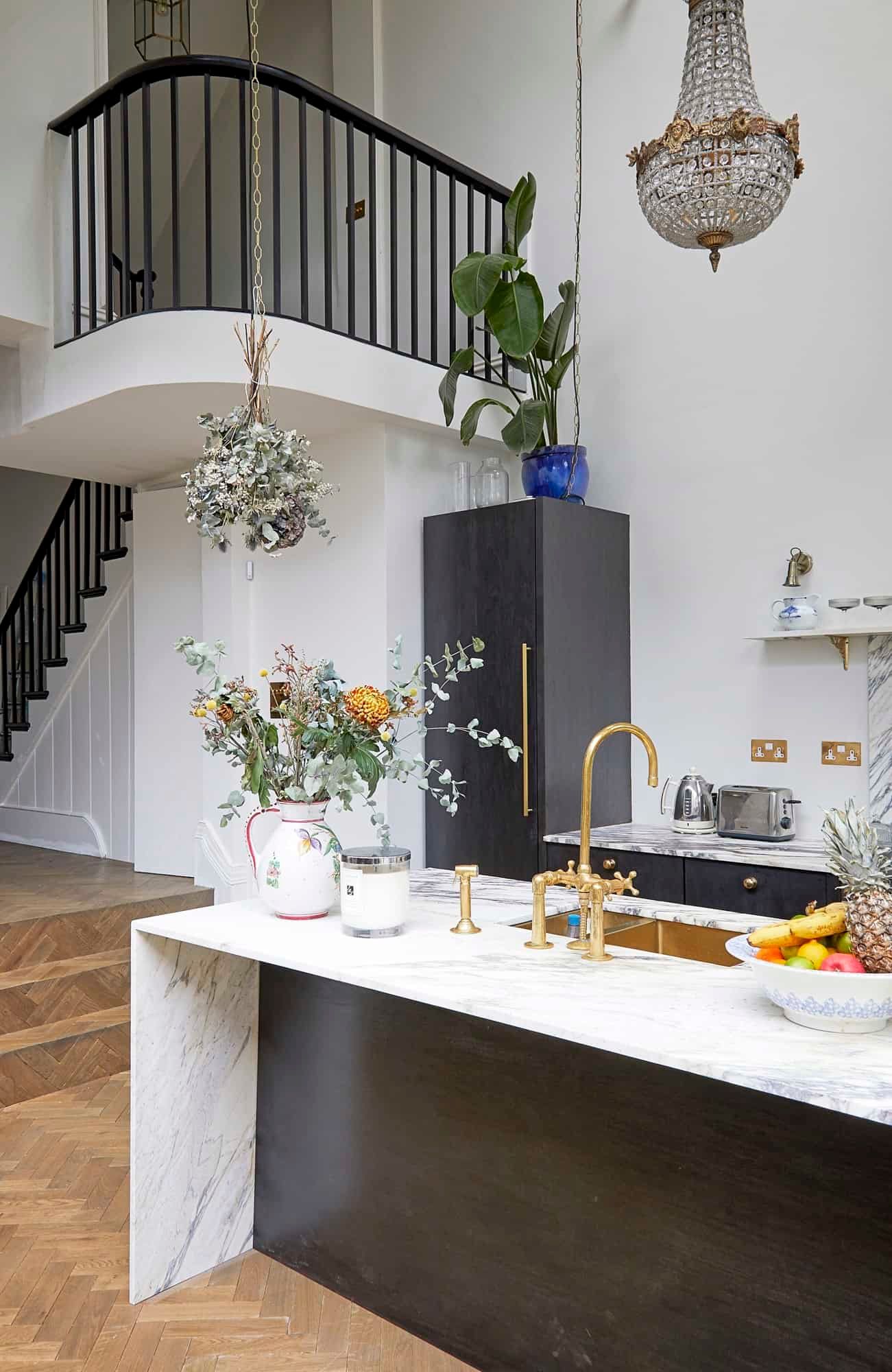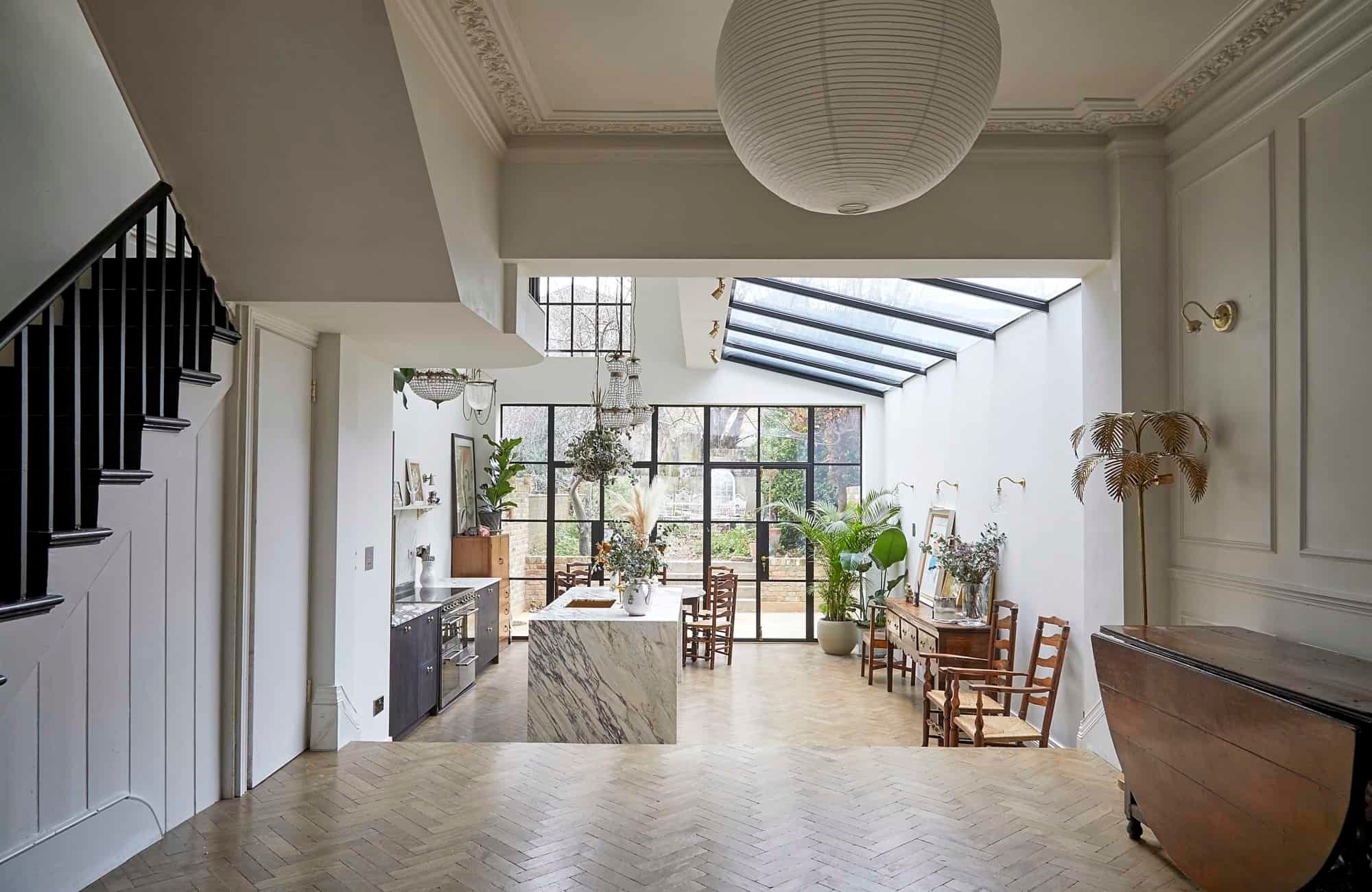 The kitchen is just as striking, thanks to the large windows, the flurry of house plants and handsome marble surfaces. So striking in fact, that we crowned it 'kitchen of the year' on Instagram. As well as letting in copious amounts of natural light, the French door also leads out to a charming garden space with some seating for warm evenings.
