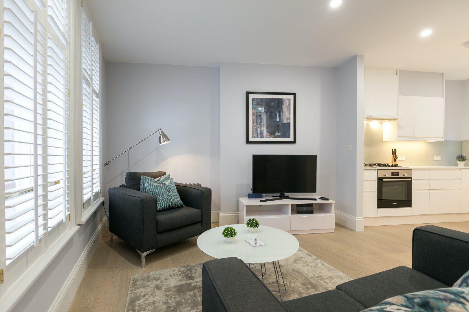 Smack bang in the middle of the bright lights of Shaftesbury Avenue, this apartment is as central as it gets but as calm as can be. The cool and composed interiors, with pastel lavender walls, a matte white kitchen and dramatic black accents create a soothing yet stylish atmosphere.