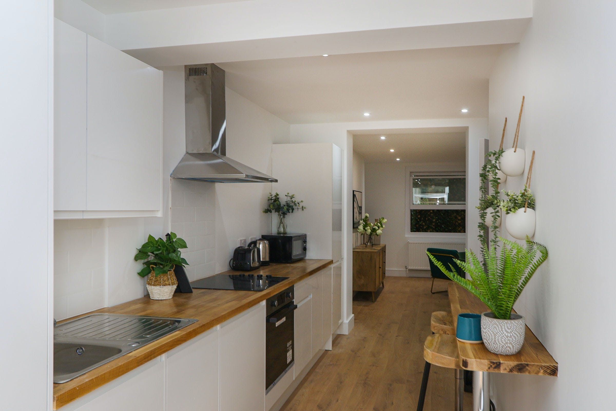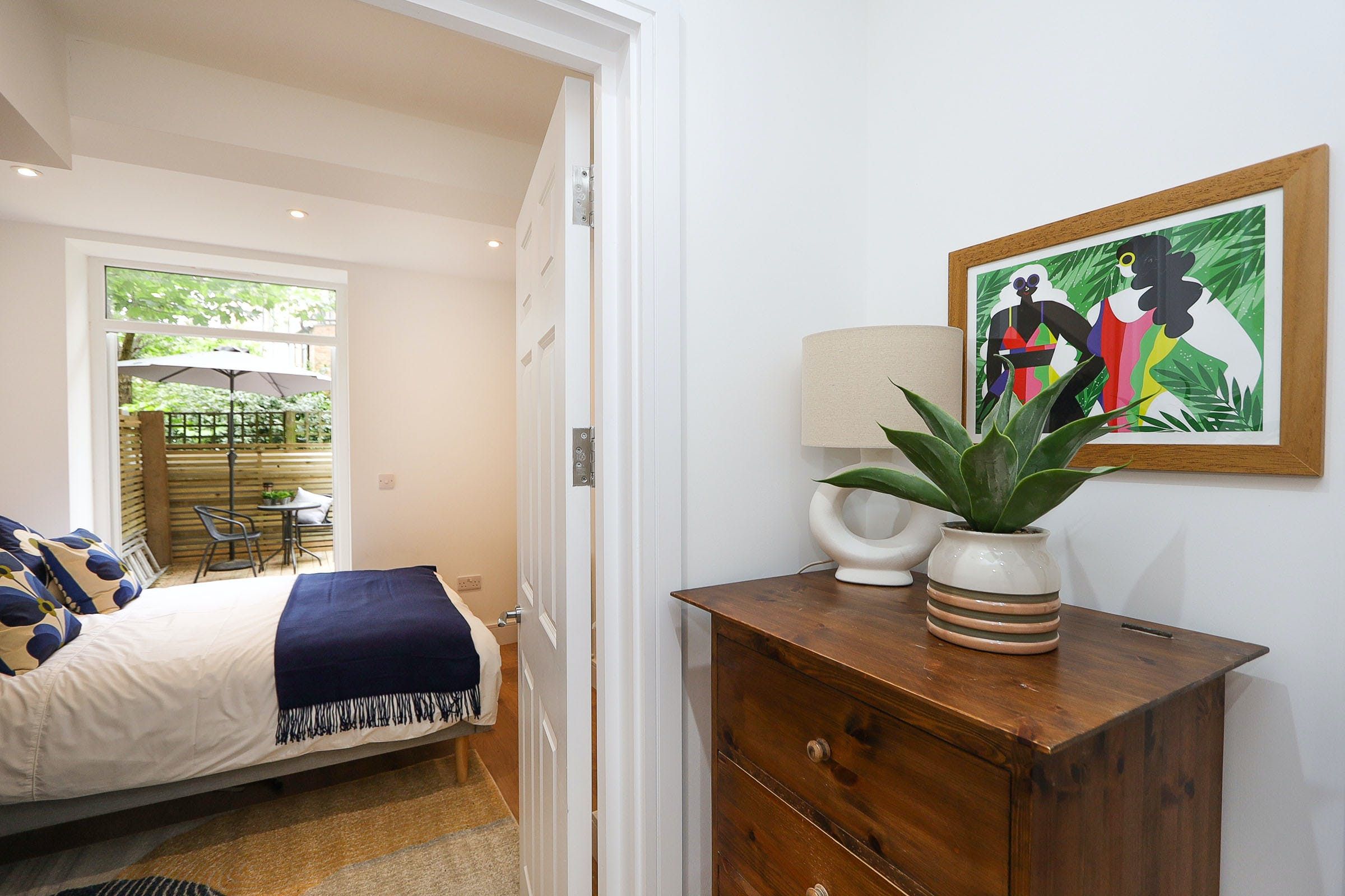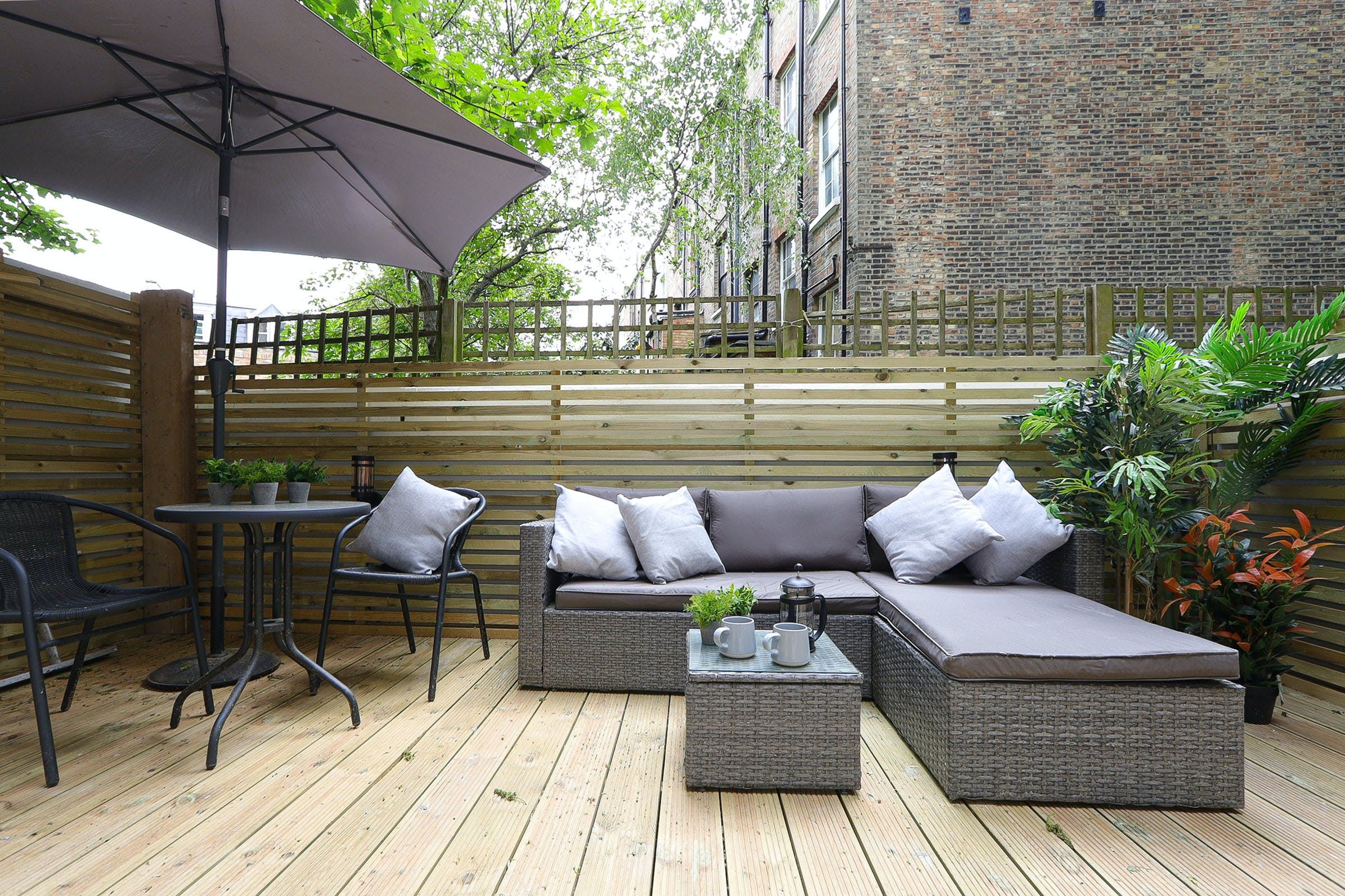In the village-like neighbourhood of Tufnell Park, there are loads of historic pubs, laid-back coffee shops and chi-chi restaurants to explore on your doorstep. Tufnell Park station is just a five-minute walk away, ready to whisk you into central London in a matter of minutes. The living room is an artfully designed spot with an open kitchen and dining area for meals at home. The real bonus is the private terrace with lounge and dining seating – ideal for coffee or drinks outside – which makes up for the basement position.
