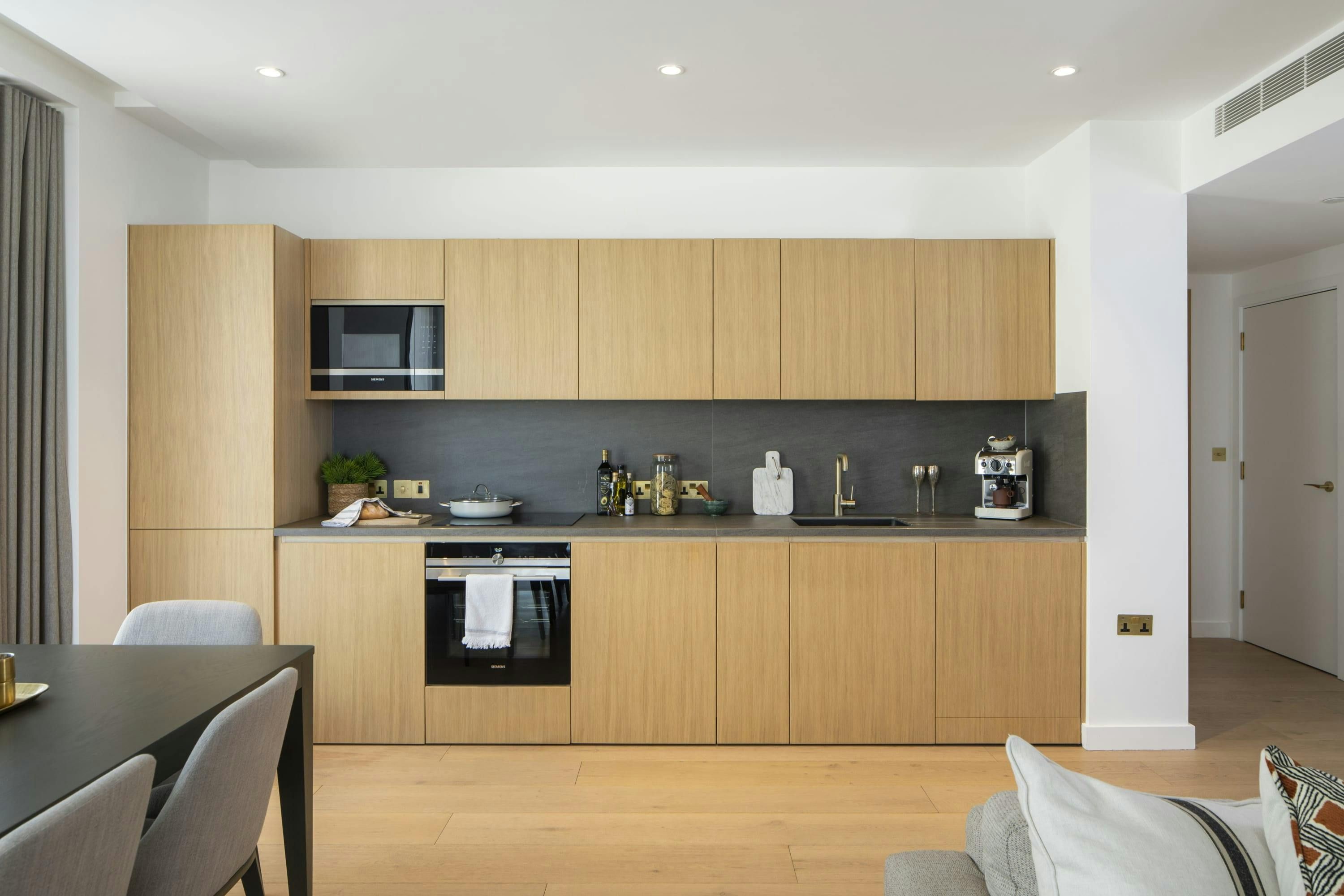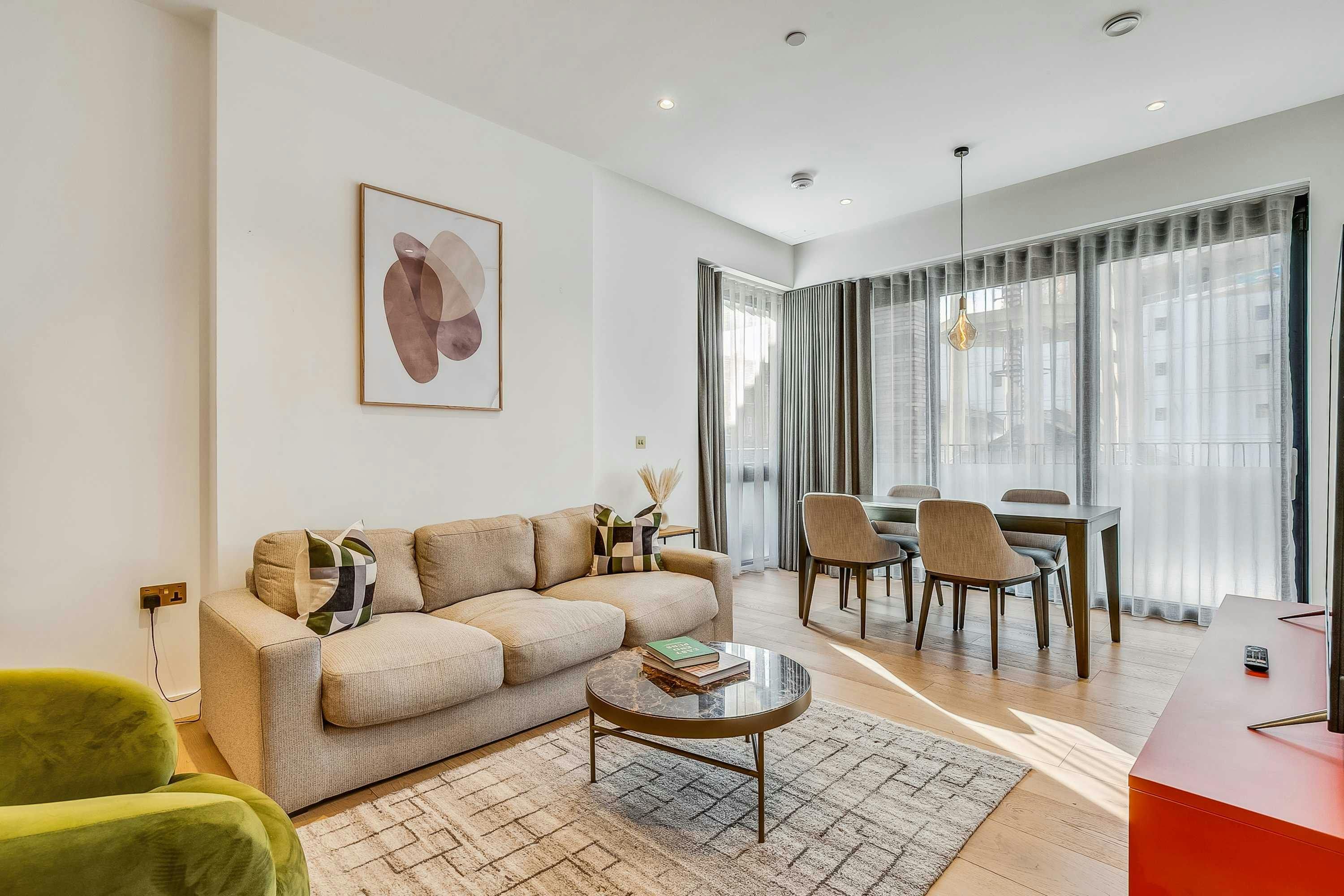 This contemporary city sanctuary is tucked in the vibrant heart of King’s Cross. You’ll be welcomed by a fresh, open-plan living room for laidback gatherings or catch up work sessions. There’s also a private balcony for warm-weather drinks and you can enjoy access to a communal gym as well as a co-working space and large outdoor terrace. It’s also extremely well-connected with King’s Cross tube station just a short walk away. Plus, you can stroll to restaurants and cafes in Coal Drops Yard and Brasserie Square.