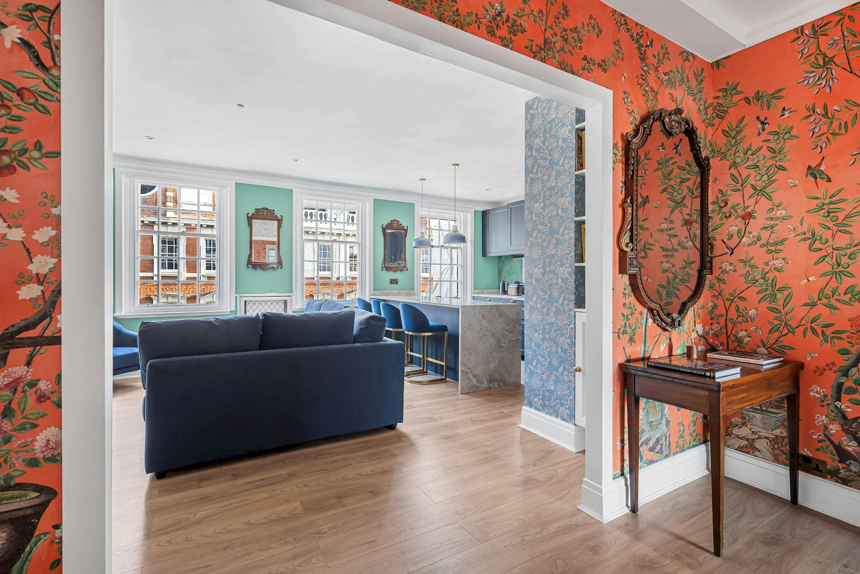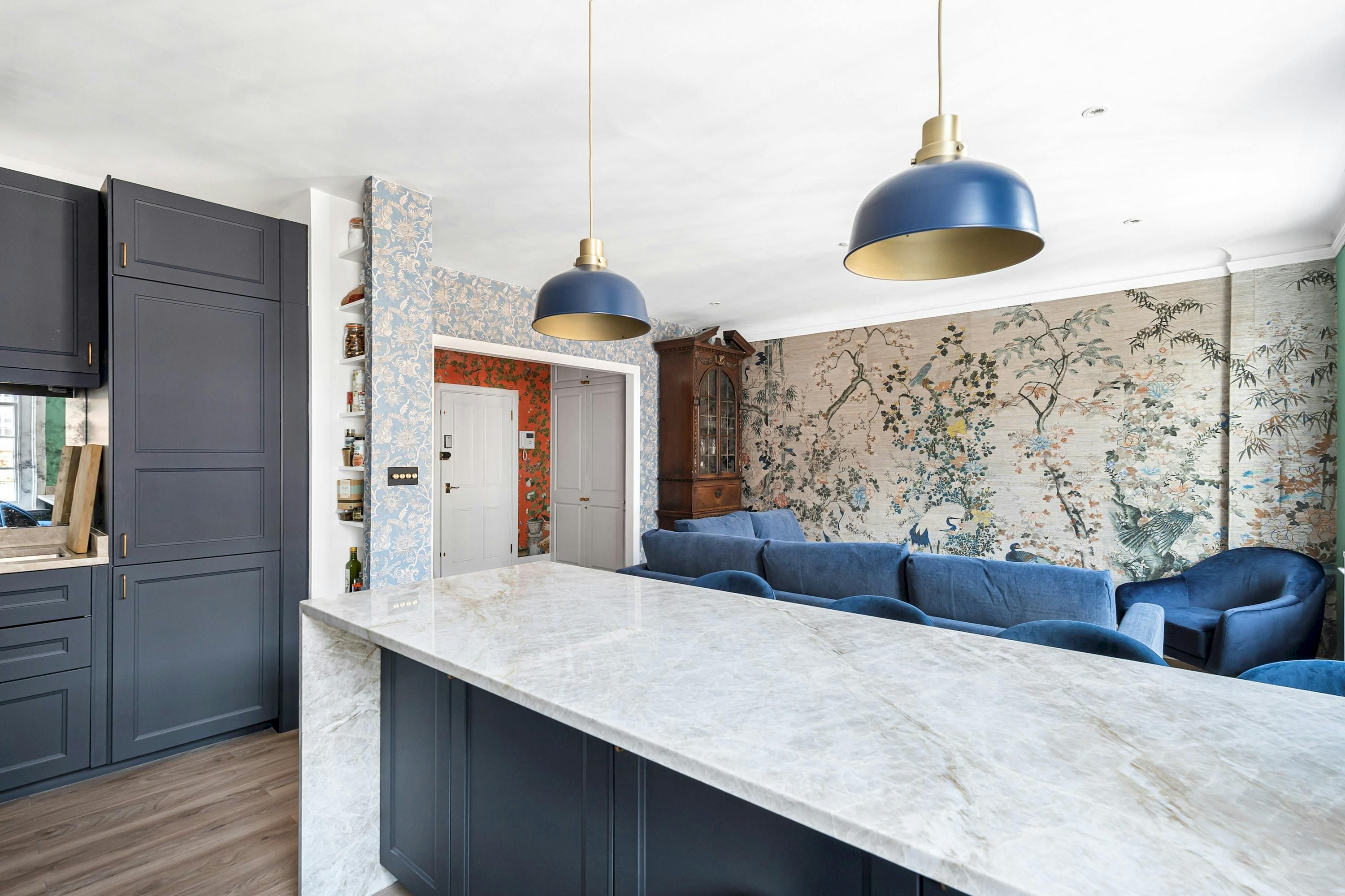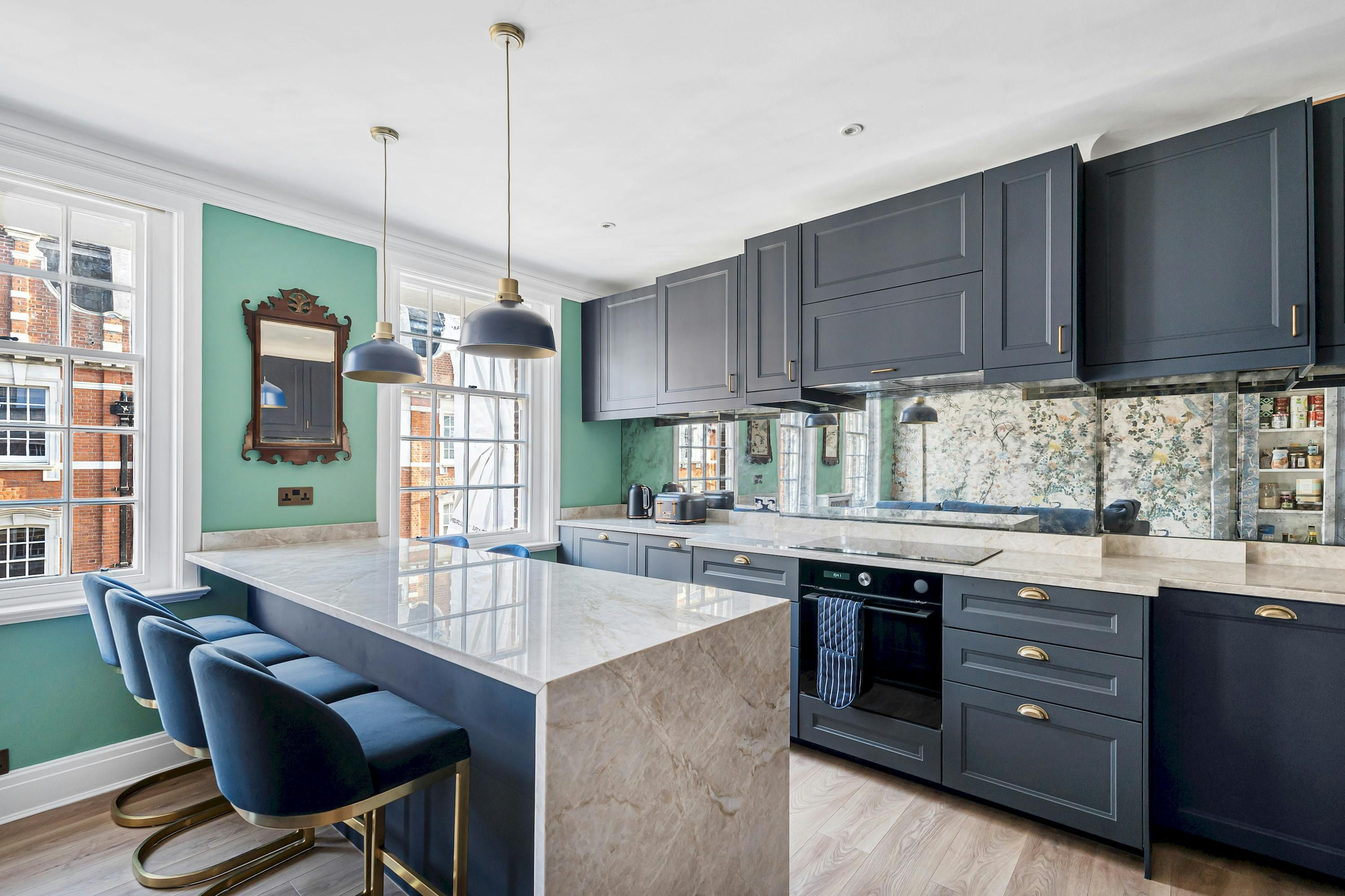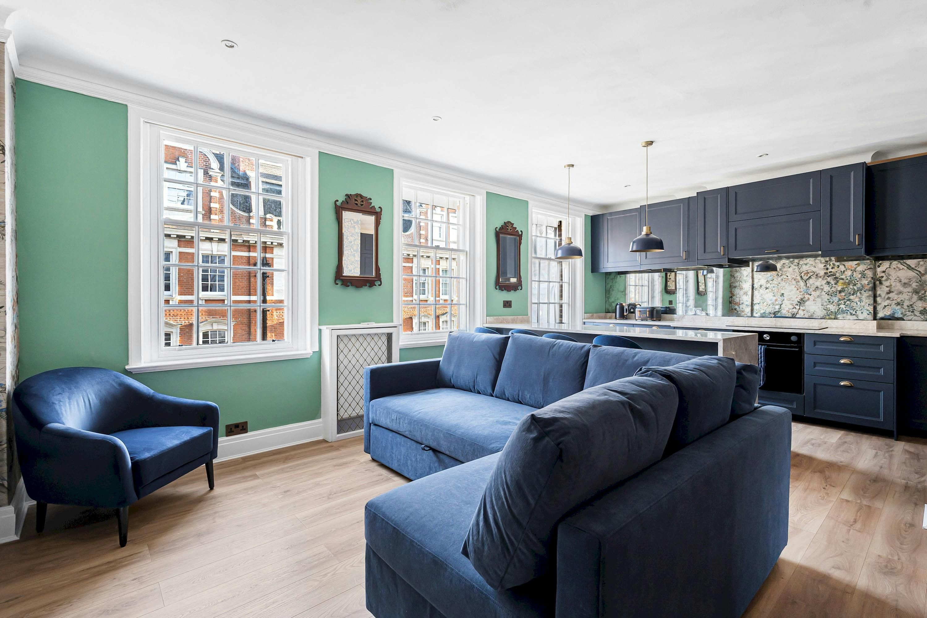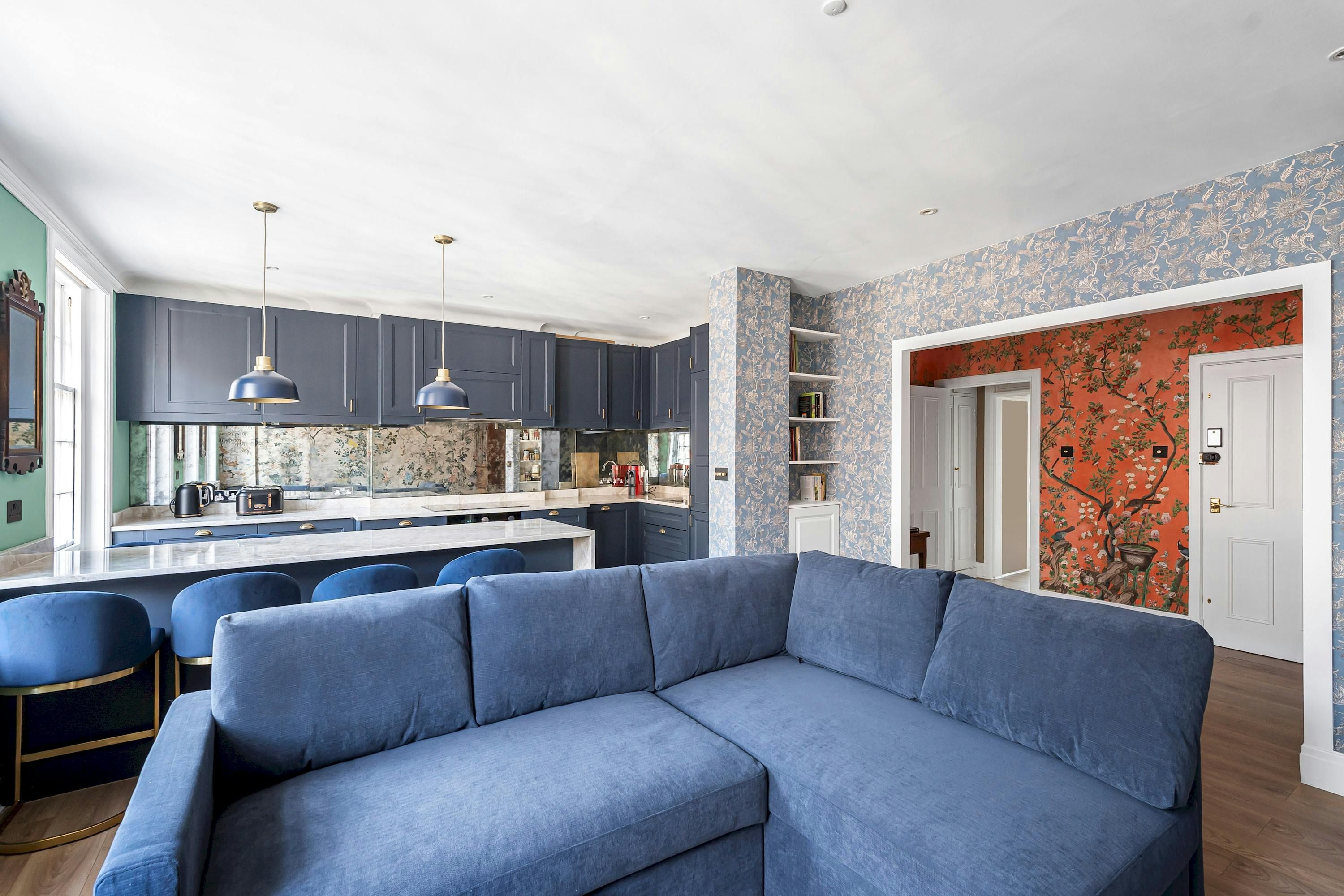 A Marylebone postcode will suit those seeking a central location close to London’s iconic cultural institutions, parks and shopping streets. This third-floor walk-up is elegant and comfortable, with a modern kitchen for whipping up meals and bar seats along the island for evening drinks. The hidden en-suite bathroom is a nice touch, too. From here, you can browse Marylebone’s boutiques, dine in Soho and visit Mayfair’s galleries, while Bond Street Underground station is a five-minute walk away for explorations further across the city.