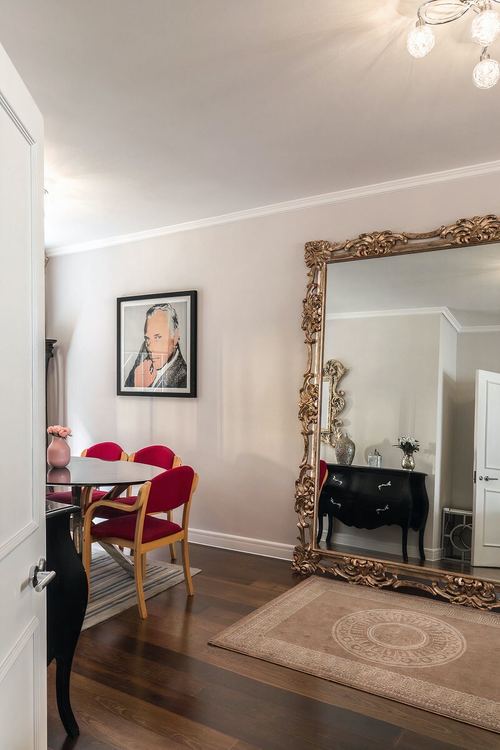 Laid out over two floors, the lower level is where you’ll find the welcoming living space with its large window and chic sofas that beckon luxurious lounging after a day of touring the city. We love the touches of grandeur here – from the wood floors to the ornately framed pictures on the walls – a vibe that’s continued into the dining room with its elaborate mirrors and chic table inviting celebratory meals.