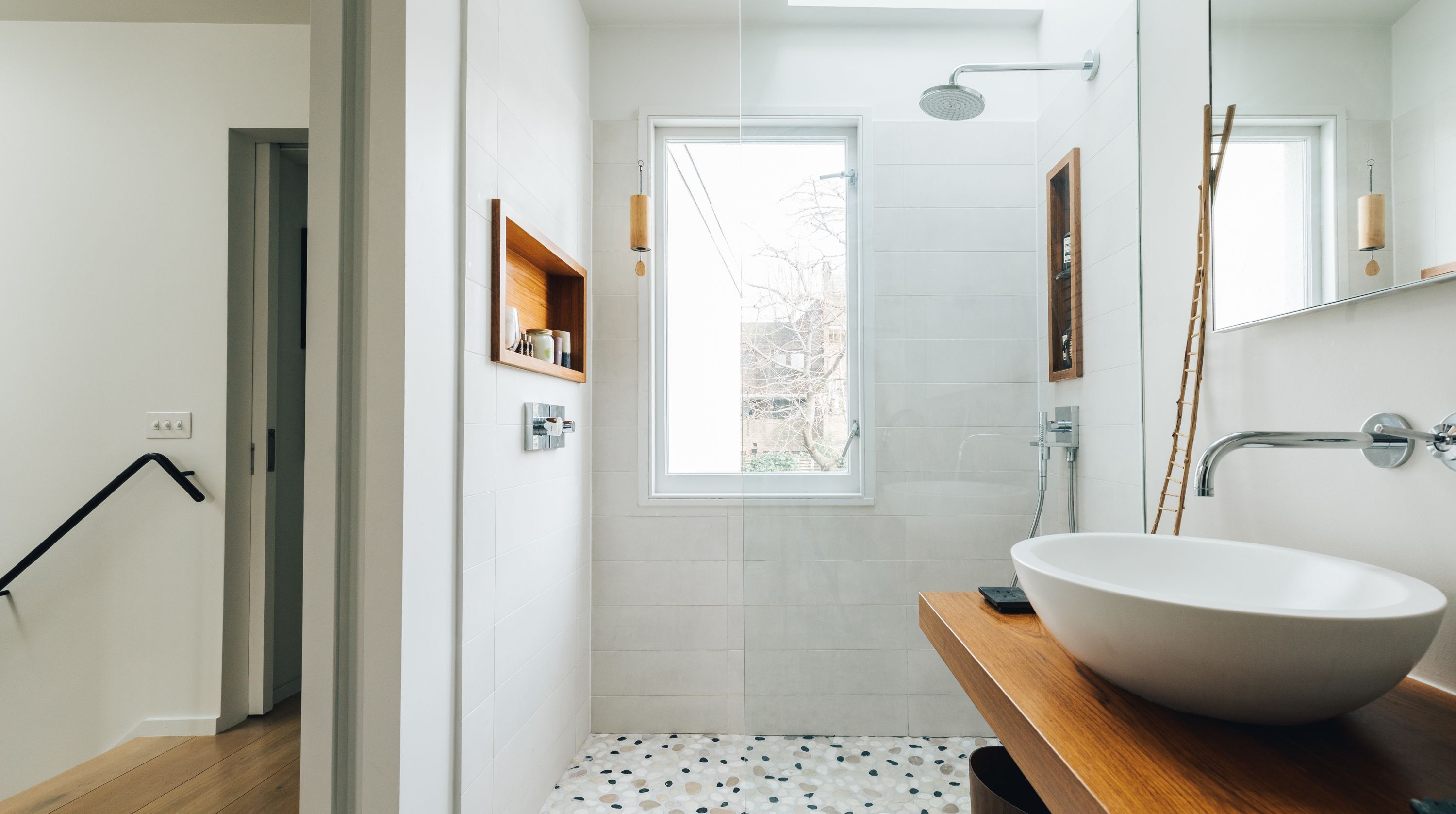 * There isn't a blind covering the bathroom window, but the steam from the shower does a pretty good job